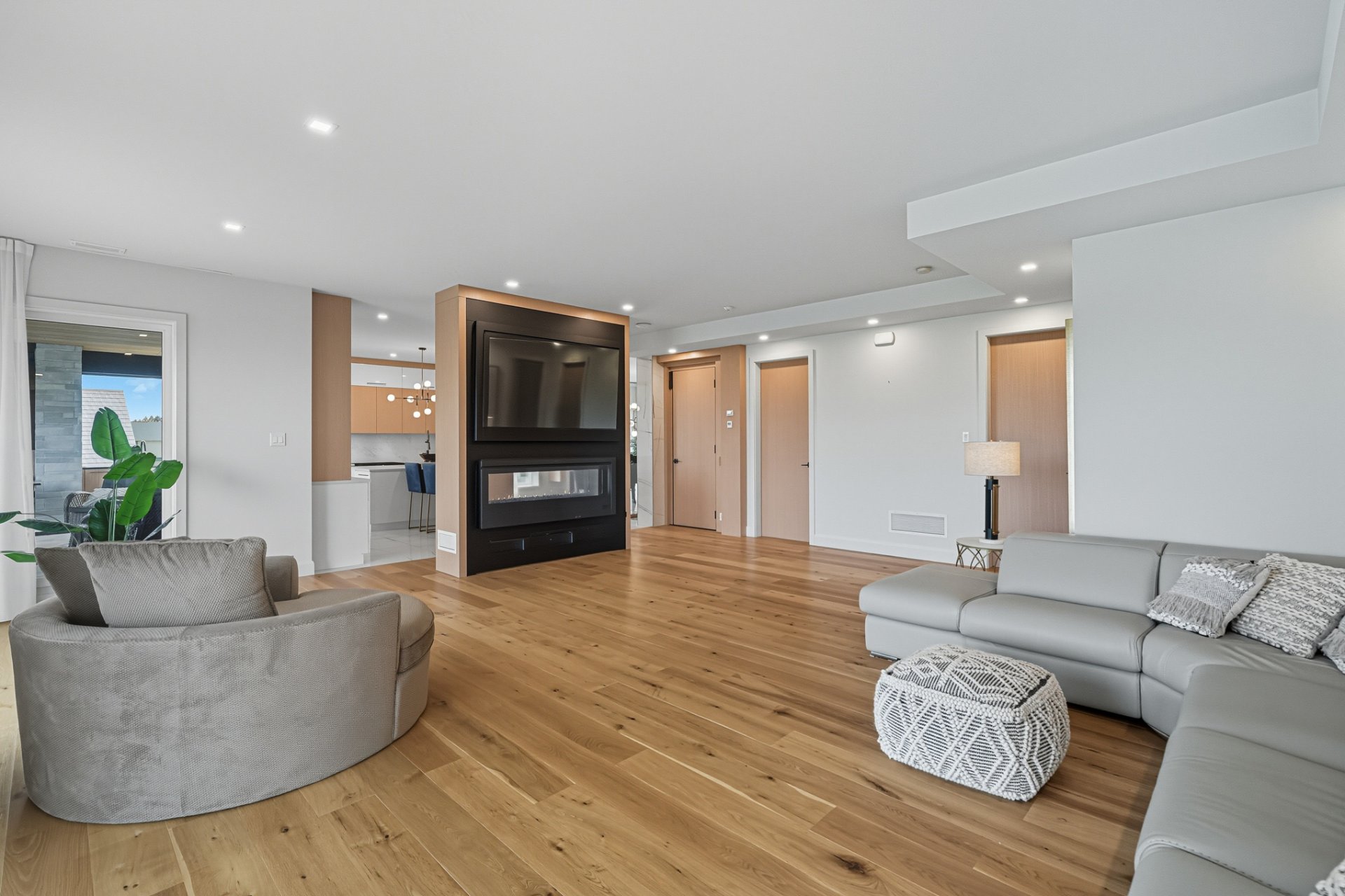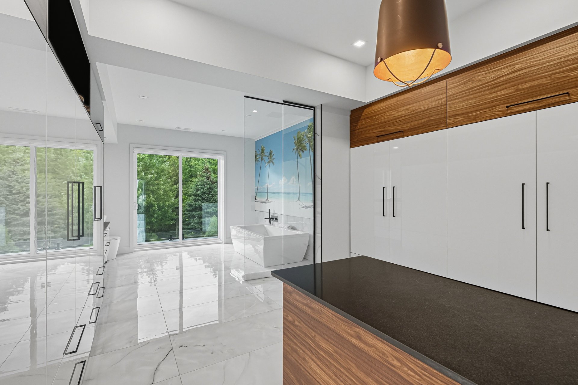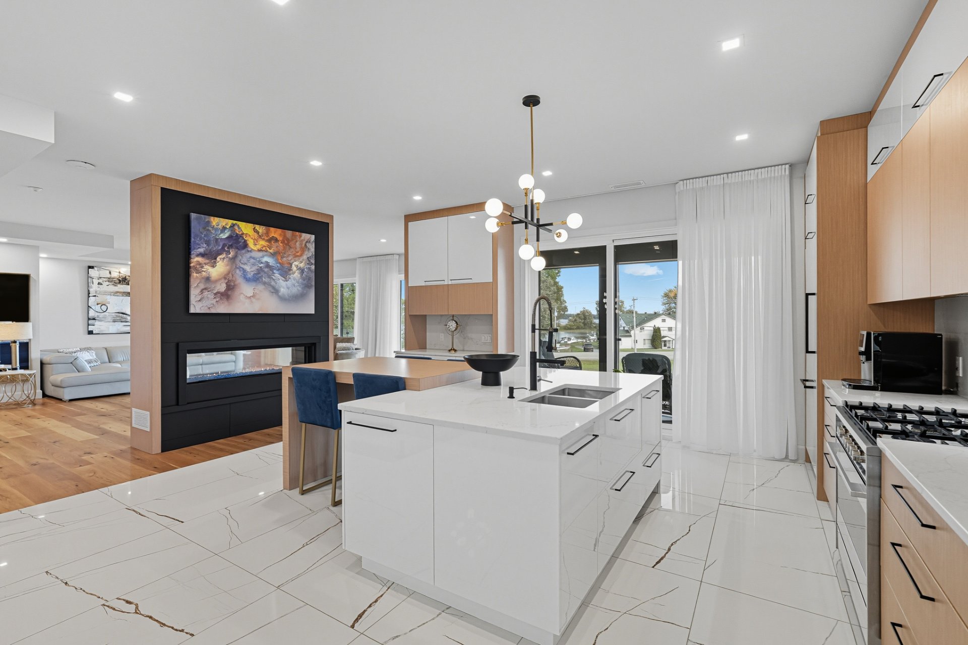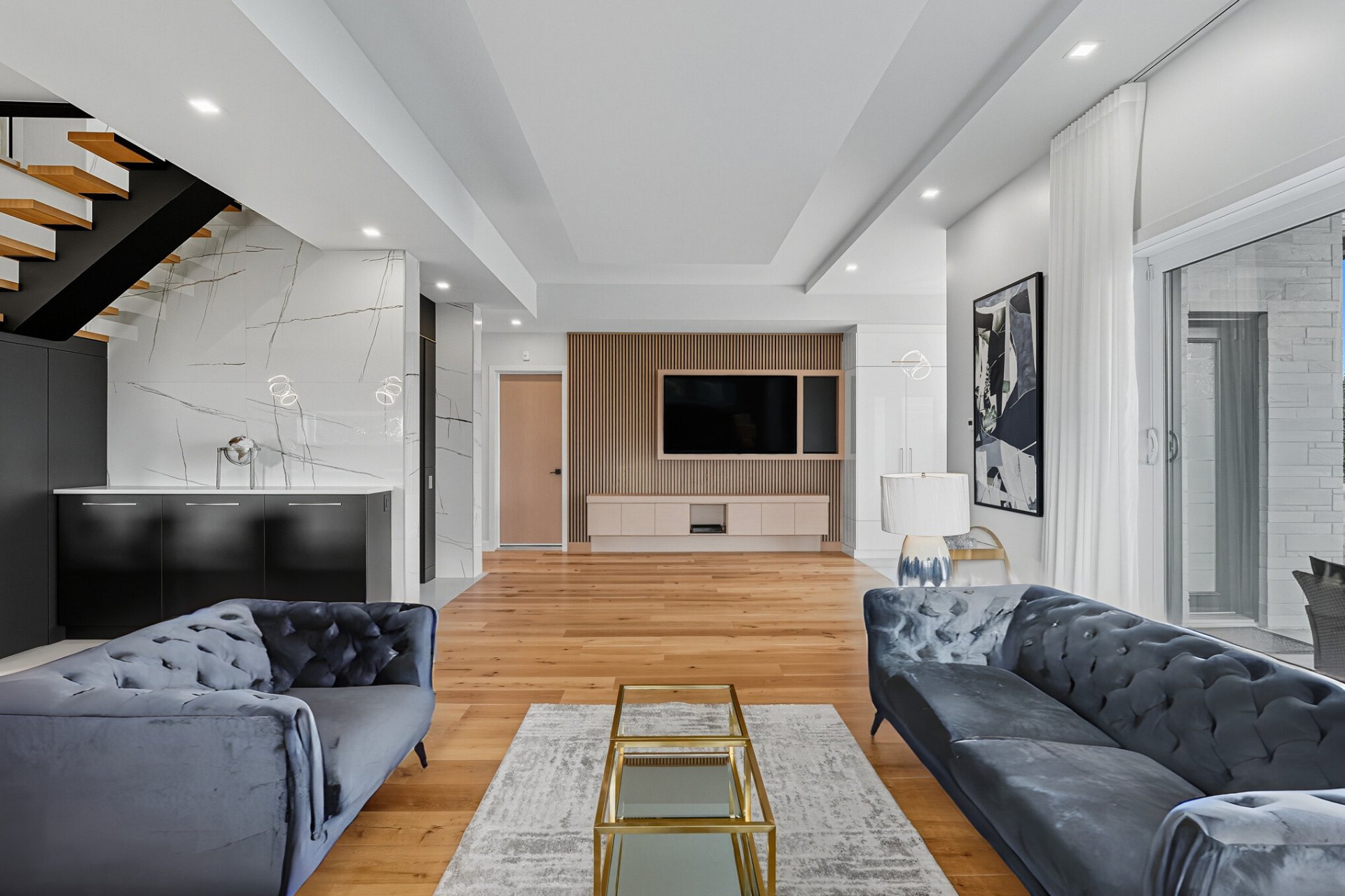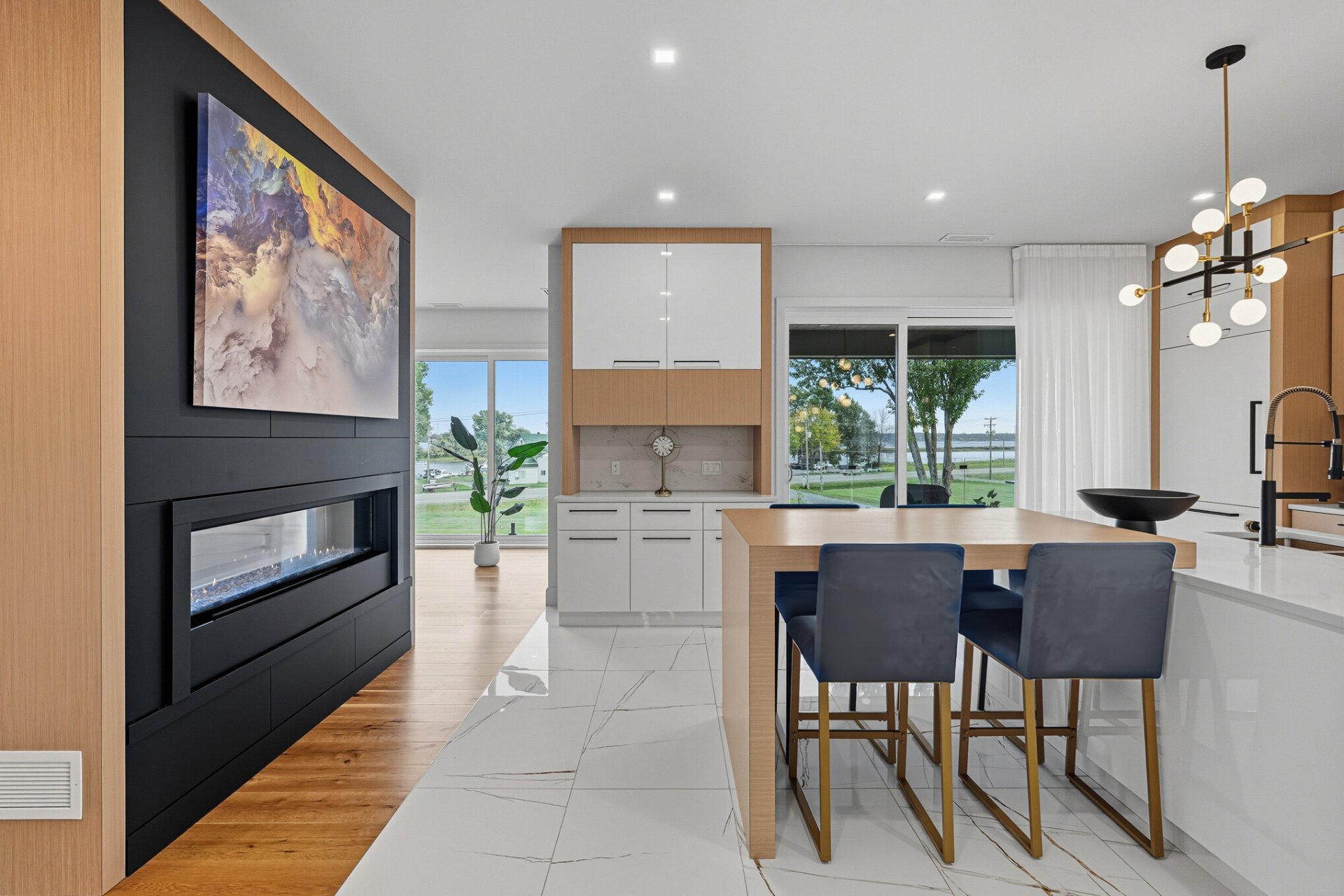 The main floor offers an open living area bathed in natural light thanks to the IMPRESSIVE WINDOWS. The built-in bar becomes the heart of the welcome -- perfect for hosting or enjoying a quiet moment. Light wood cabinetry, custom details and GRANITE surfaces add a touch of sophistication. The space flows seamlessly from the bar to the living area, creating a warm and functional environment, also ideal for WORK-FROM-HOME. All FLOORS are HEATED for absolute comfort, and the laundry room is located on this level for practical daily organization. The oversized GARAGE, with a door opening directly onto the backyard, makes it easy to store equipment or large tools -- and can even be transformed into an ATELIER as needed.