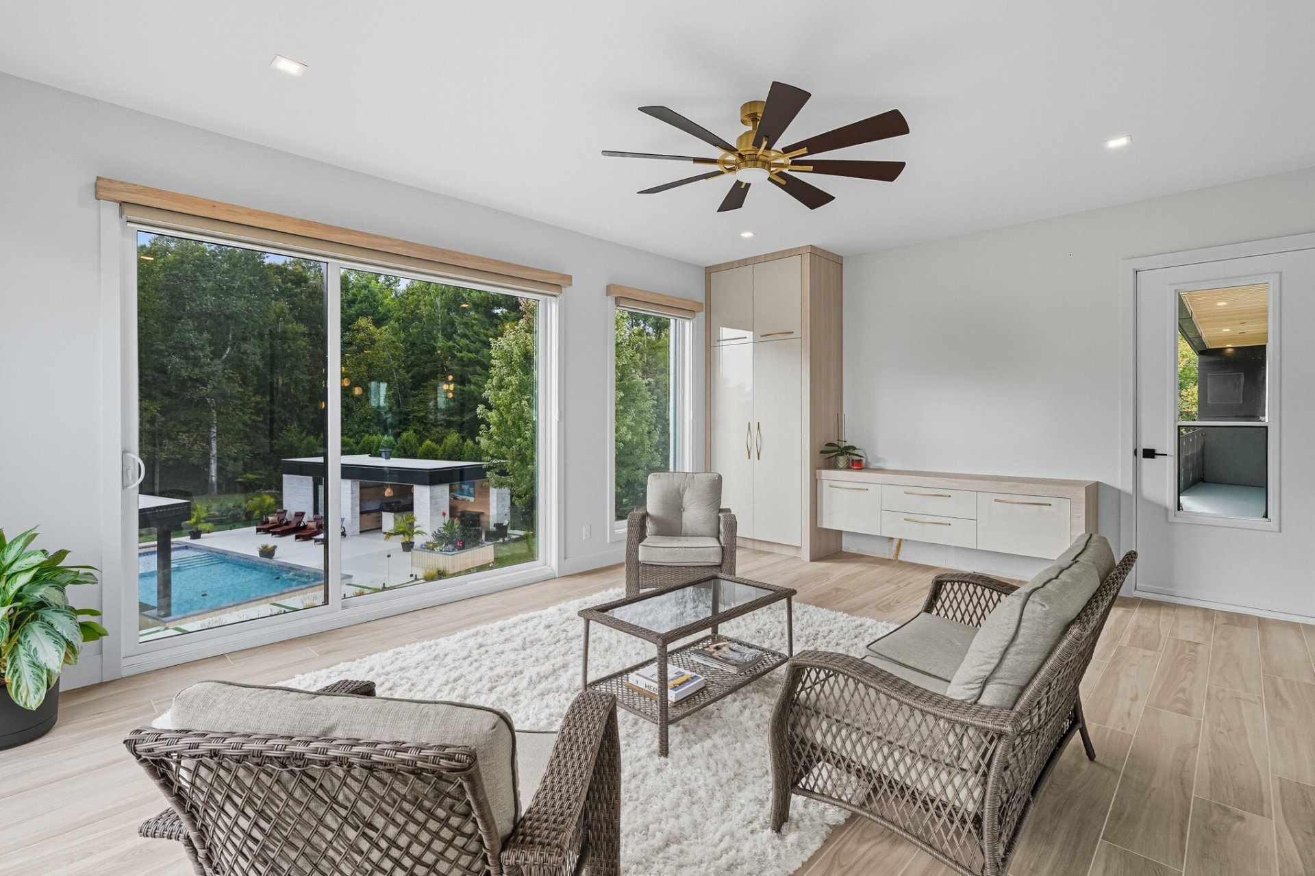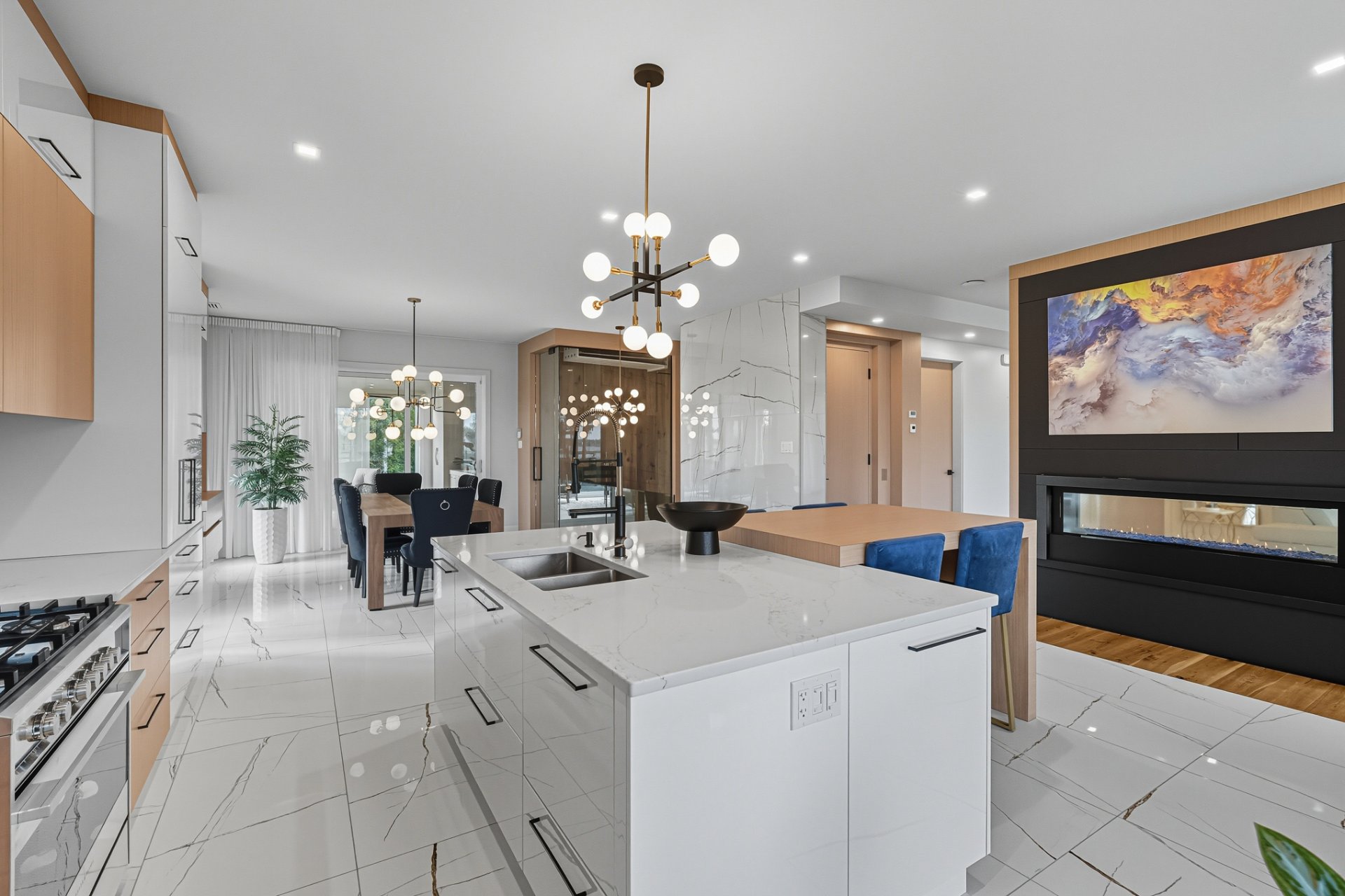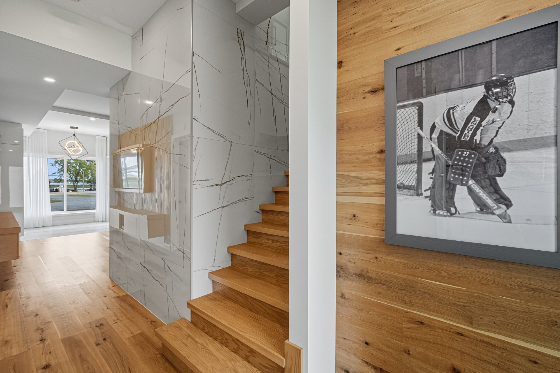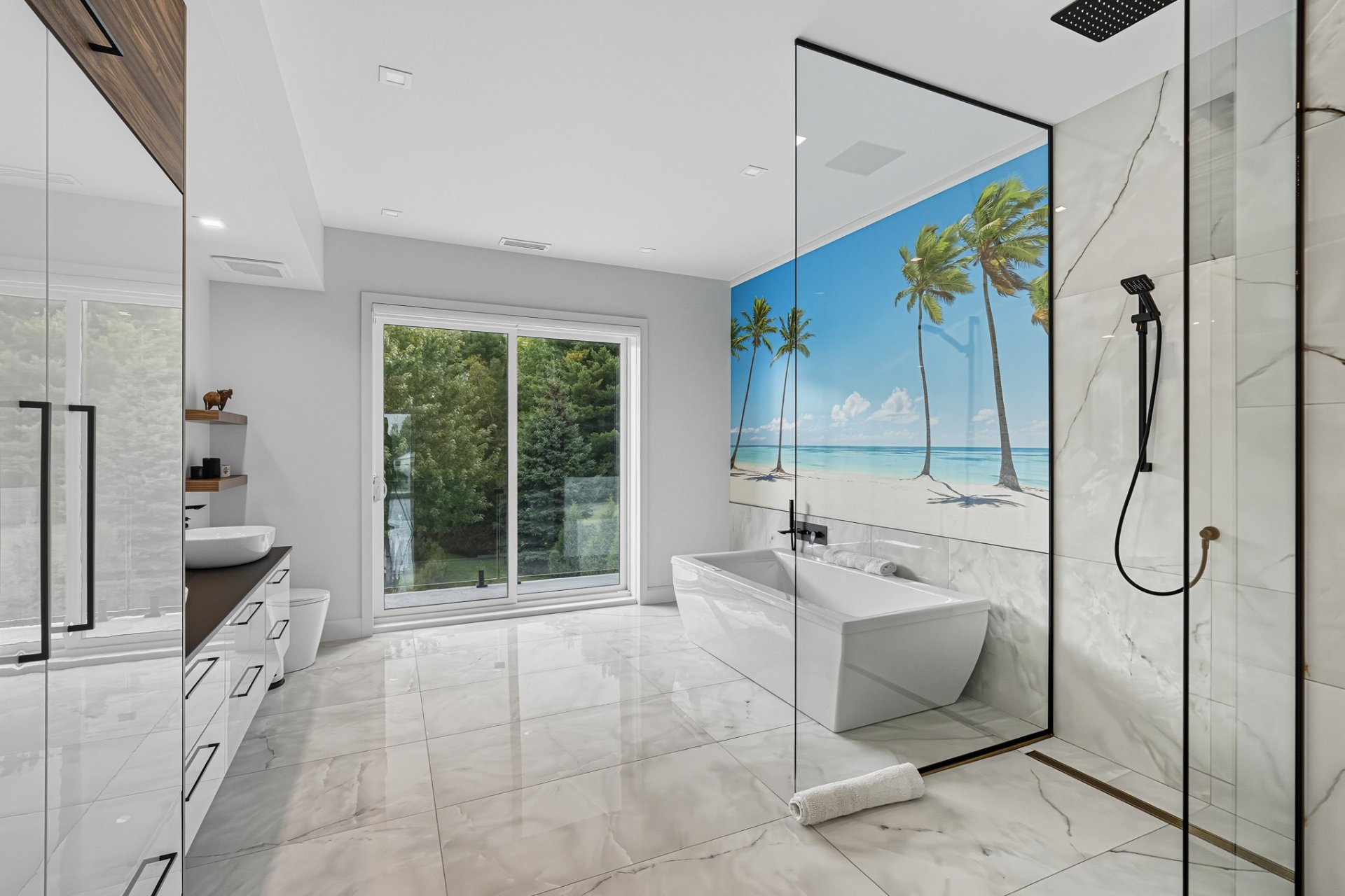 The main floor offers an open living area bathed in natural light thanks to the IMPRESSIVE WINDOWS. The built-in bar becomes the heart of the welcome -- perfect for hosting or enjoying a quiet moment. Light wood cabinetry, custom details and GRANITE surfaces add a touch of sophistication. The space flows seamlessly from the bar to the living area, creating a warm and functional environment, also ideal for WORK-FROM-HOME. All FLOORS are HEATED for absolute comfort, and the laundry room is located on this level for practical daily organization. The oversized GARAGE, with a door opening directly onto the backyard, makes it easy to store equipment or large tools -- and can even be transformed into an ATELIER as needed.