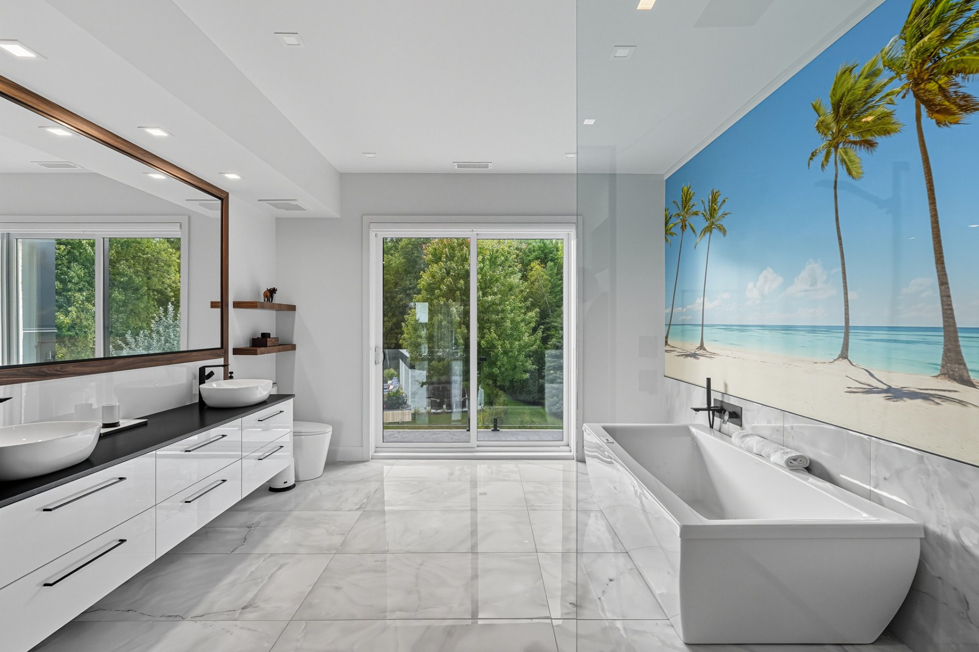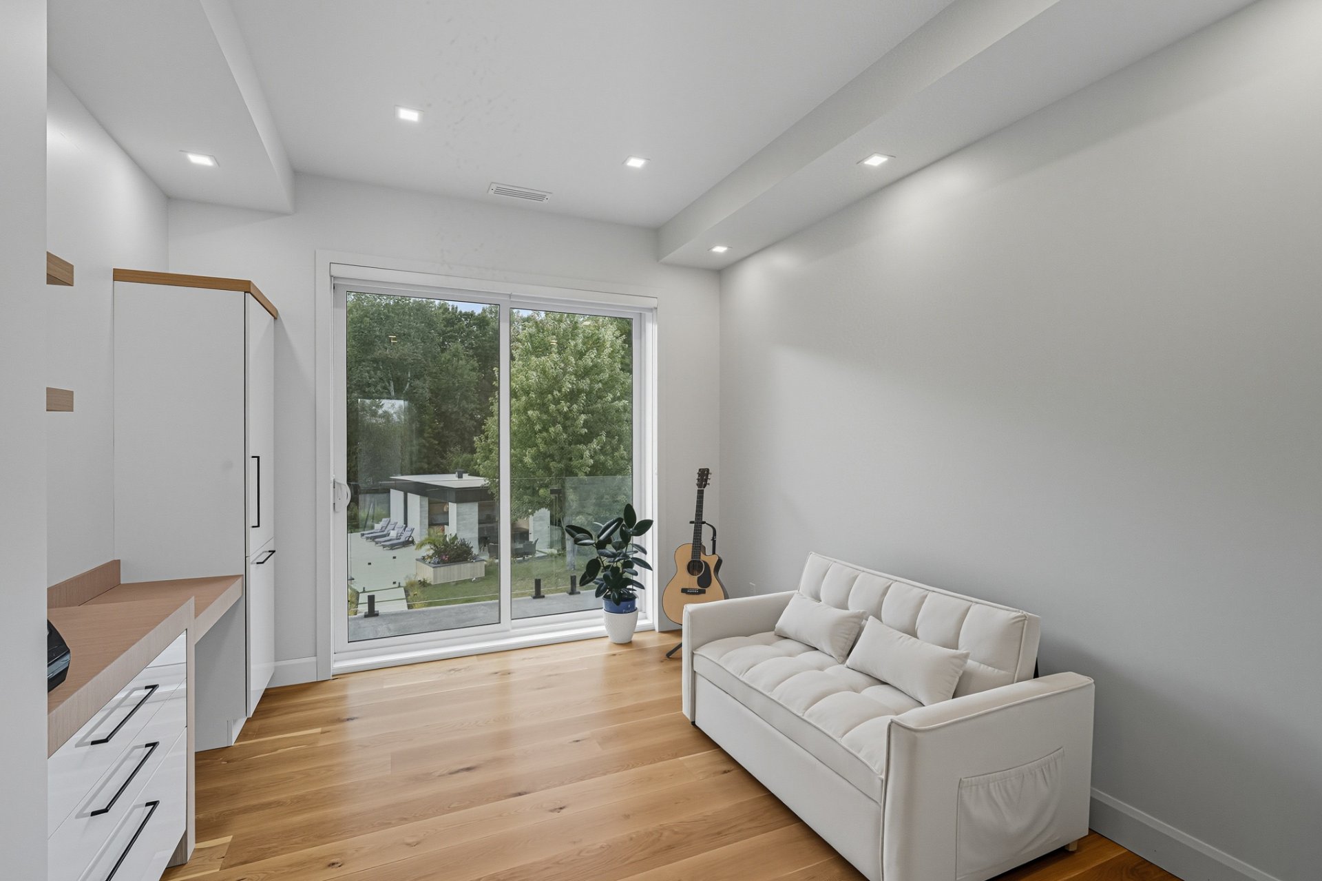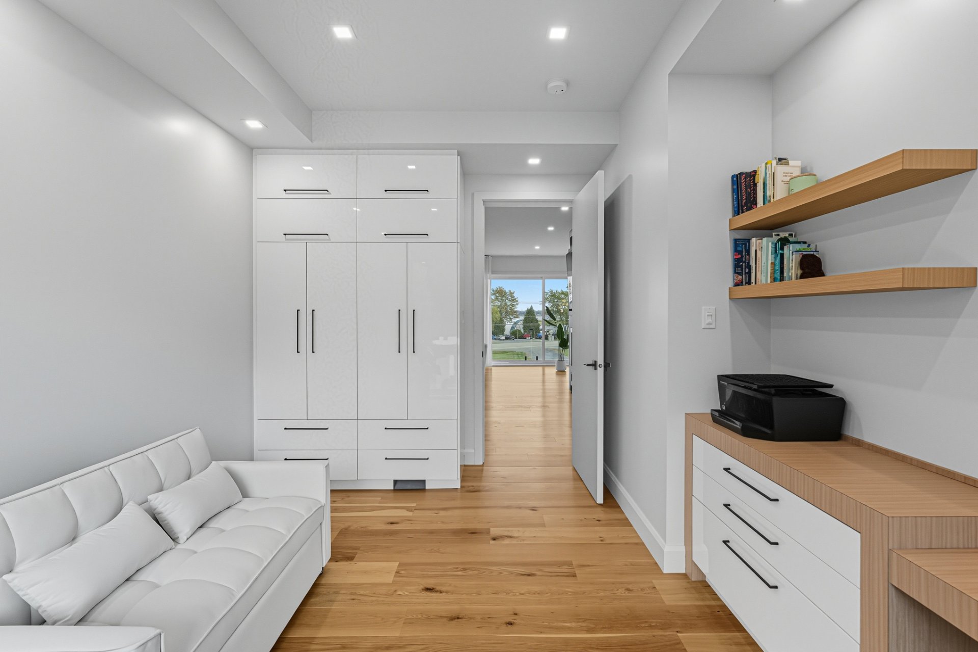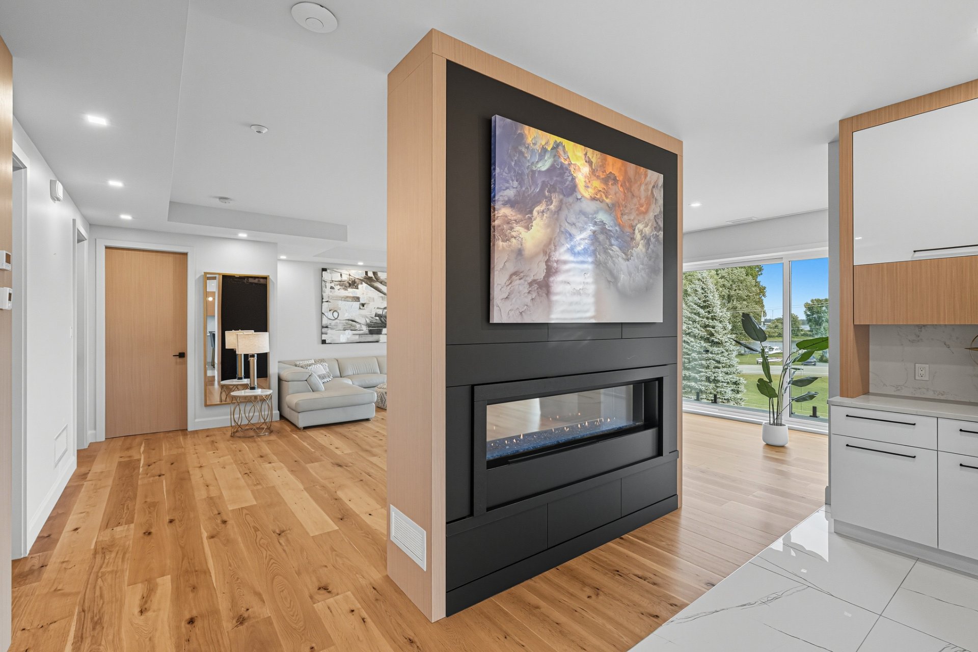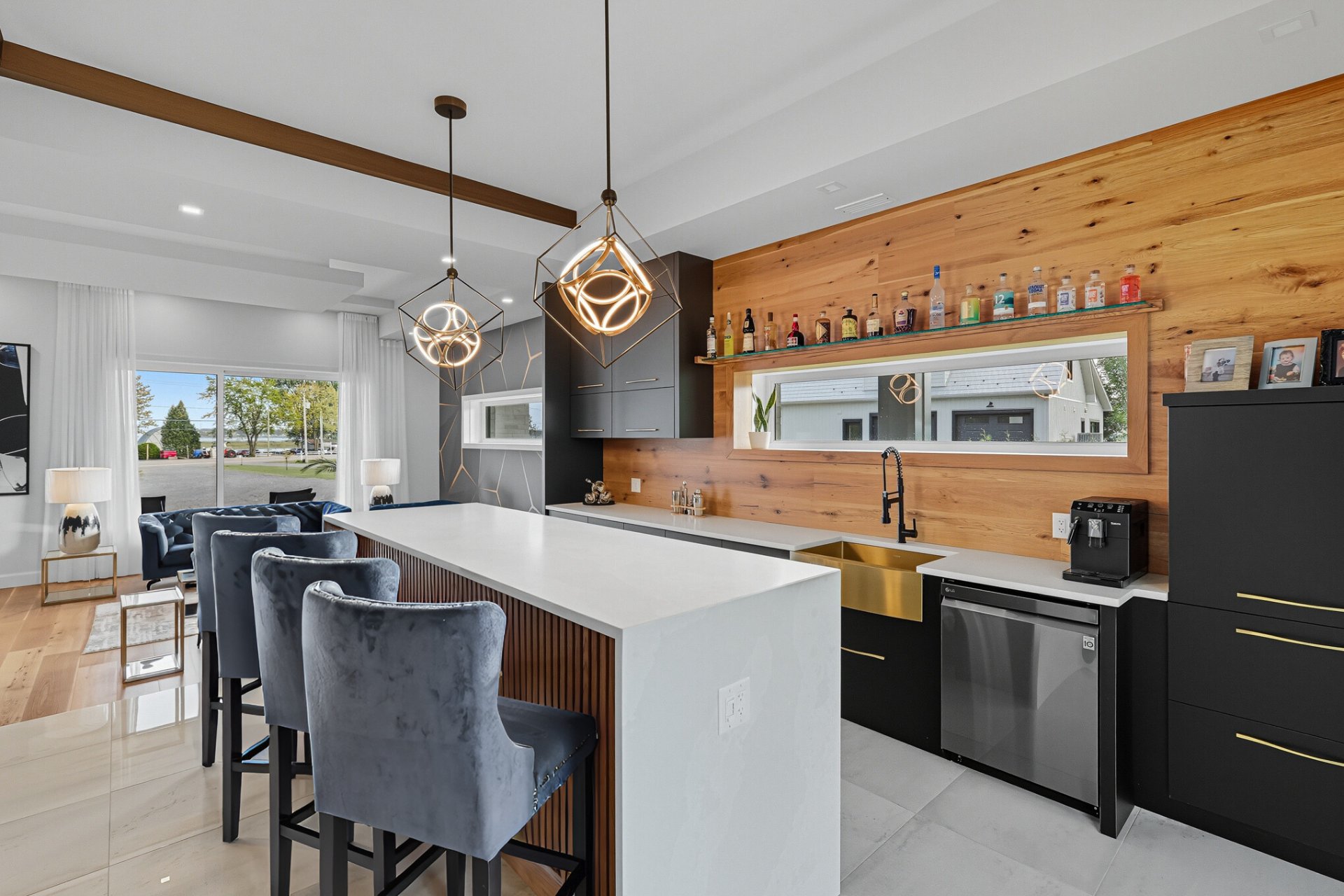 The main floor offers an open living area bathed in natural light thanks to the IMPRESSIVE WINDOWS. The built-in bar becomes the heart of the welcome -- perfect for hosting or enjoying a quiet moment. Light wood cabinetry, custom details and GRANITE surfaces add a touch of sophistication. The space flows seamlessly from the bar to the living area, creating a warm and functional environment, also ideal for WORK-FROM-HOME. All FLOORS are HEATED for absolute comfort, and the laundry room is located on this level for practical daily organization. The oversized GARAGE, with a door opening directly onto the backyard, makes it easy to store equipment or large tools -- and can even be transformed into an ATELIER as needed.