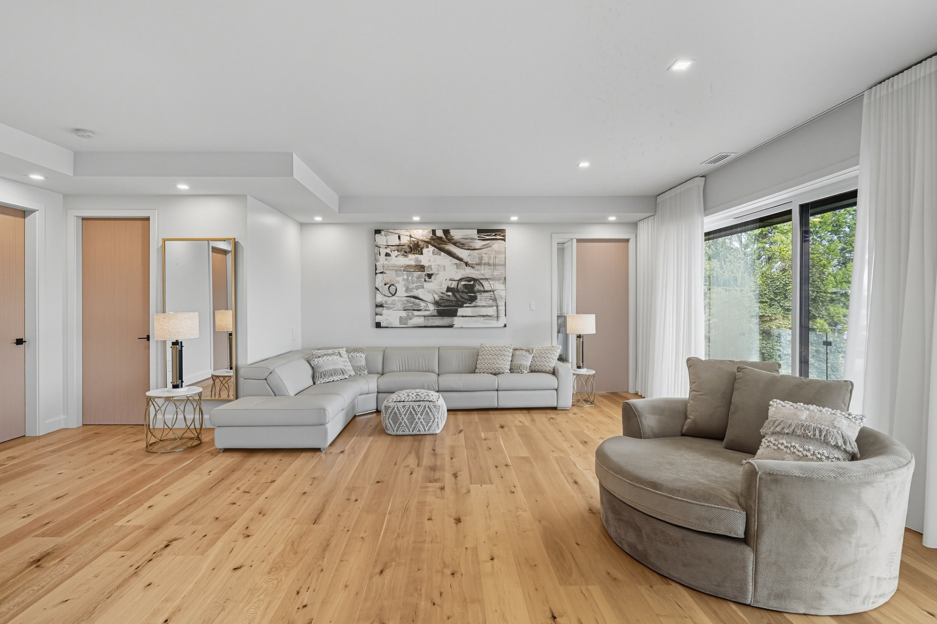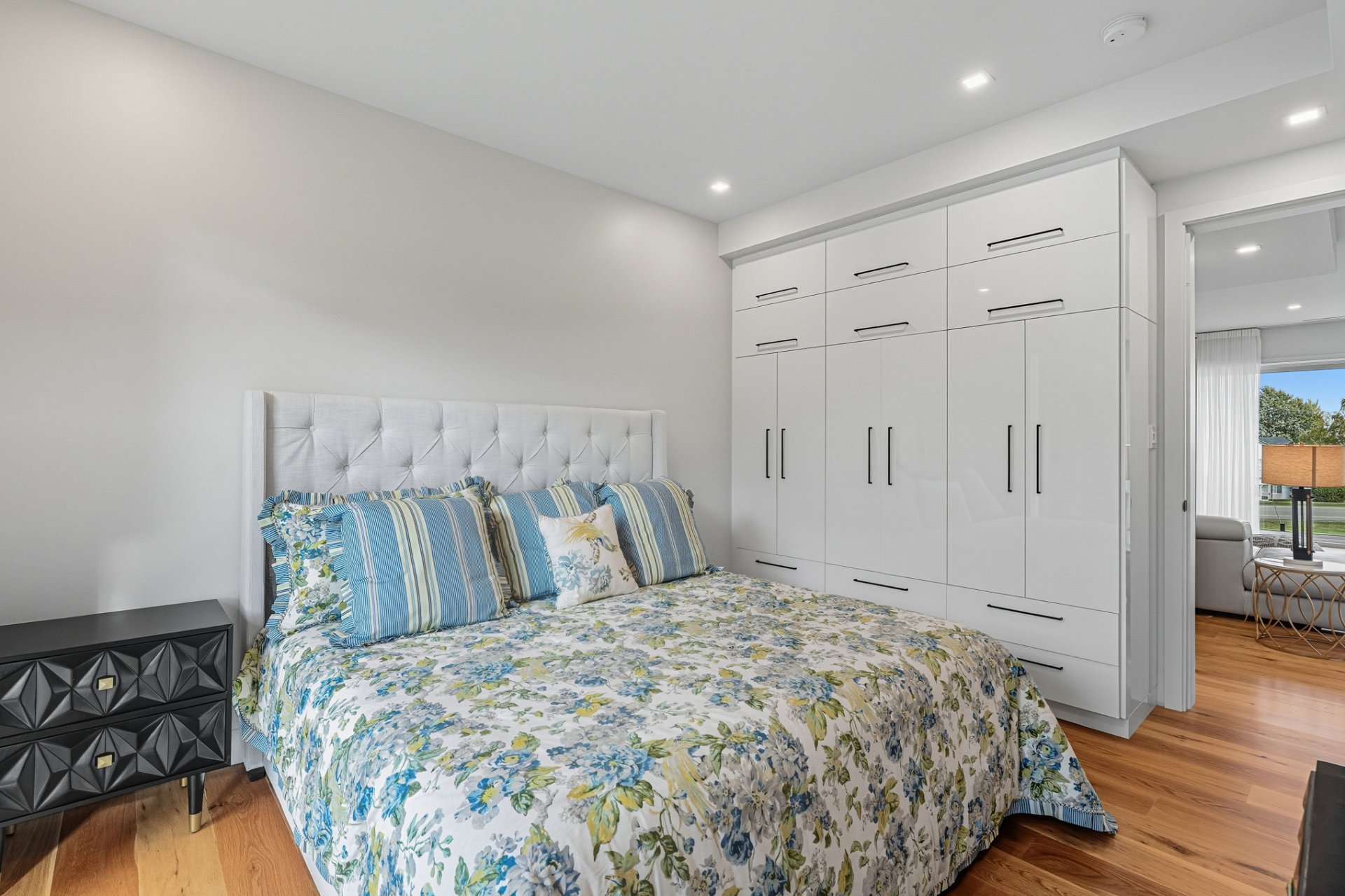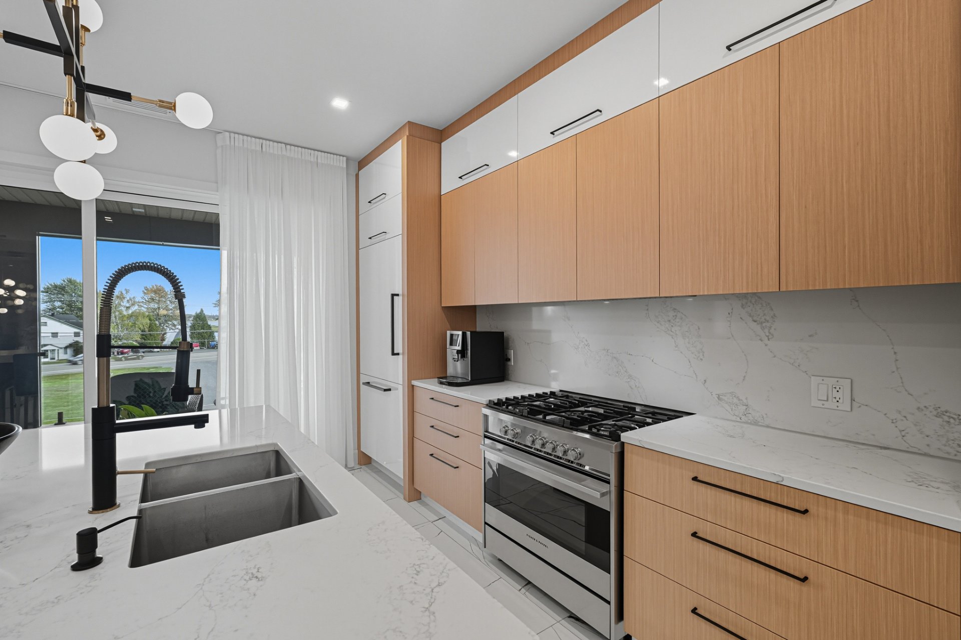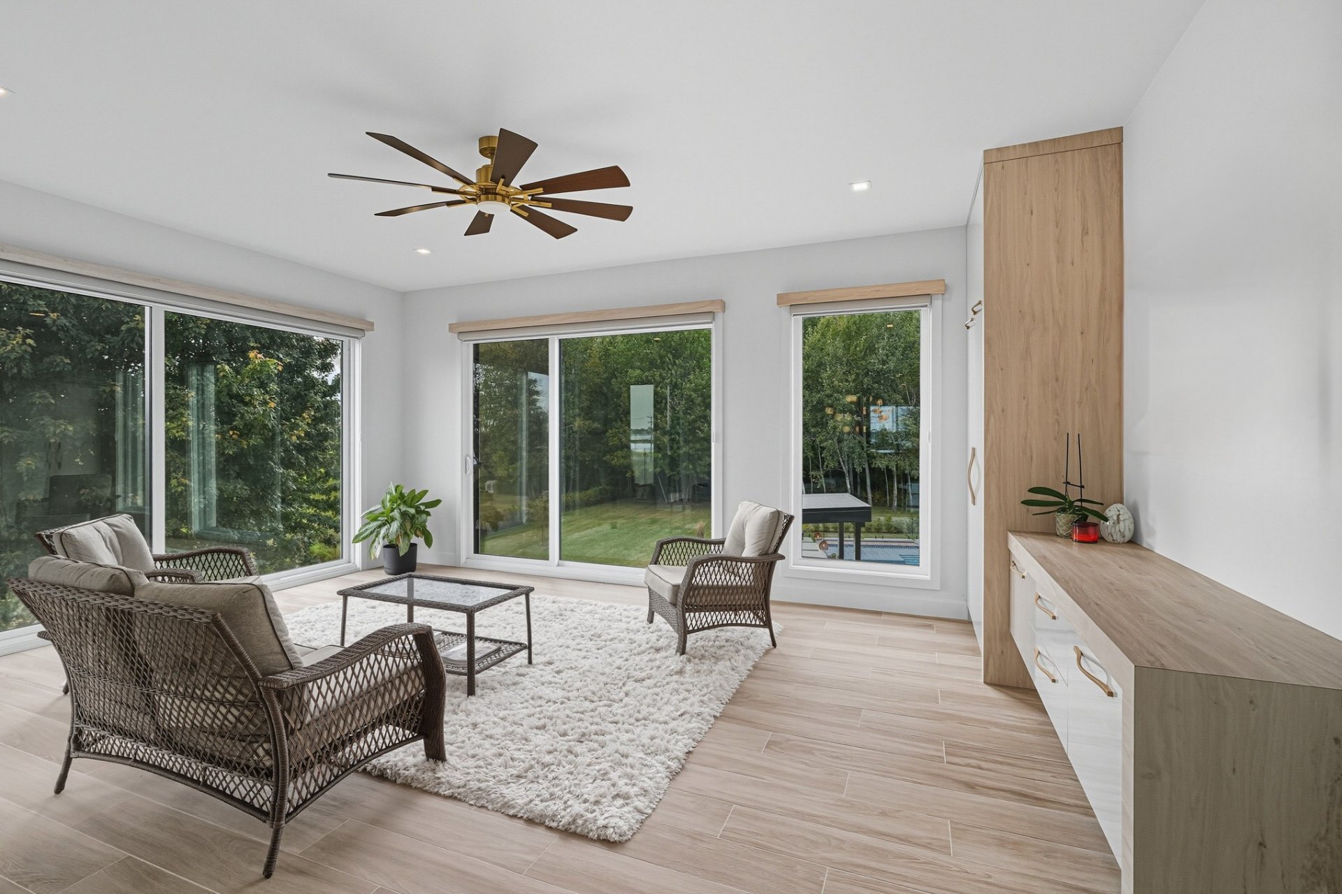 The main floor offers an open living area bathed in natural light thanks to the IMPRESSIVE WINDOWS. The built-in bar becomes the heart of the welcome -- perfect for hosting or enjoying a quiet moment. Light wood cabinetry, custom details and GRANITE surfaces add a touch of sophistication. The space flows seamlessly from the bar to the living area, creating a warm and functional environment, also ideal for WORK-FROM-HOME. All FLOORS are HEATED for absolute comfort, and the laundry room is located on this level for practical daily organization. The oversized GARAGE, with a door opening directly onto the backyard, makes it easy to store equipment or large tools -- and can even be transformed into an ATELIER as needed.