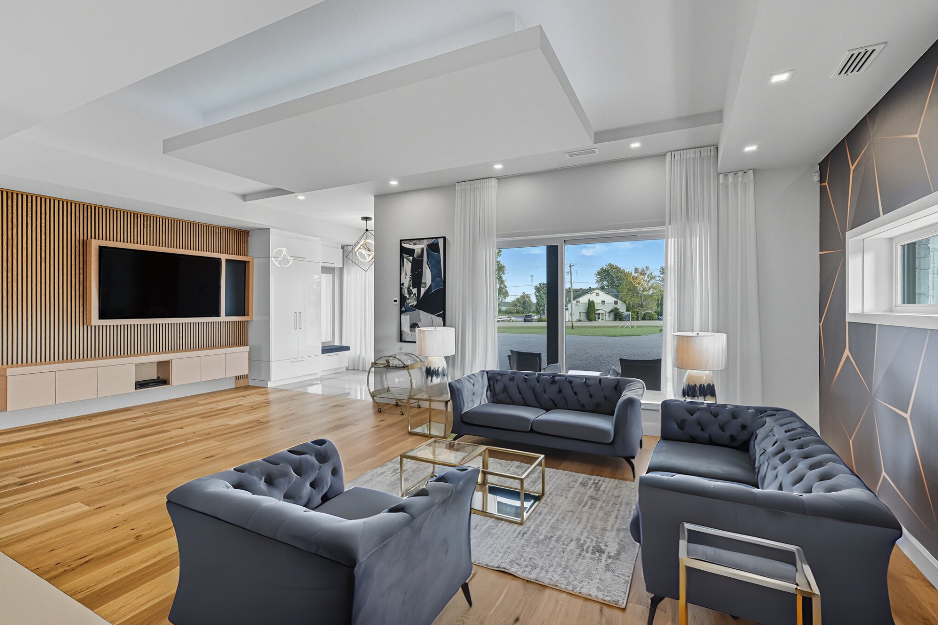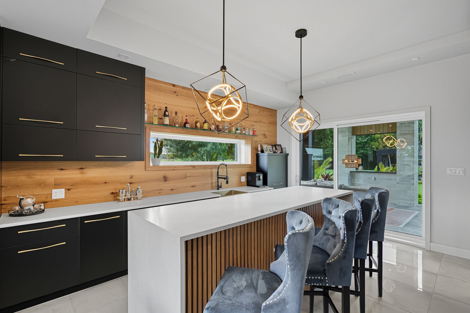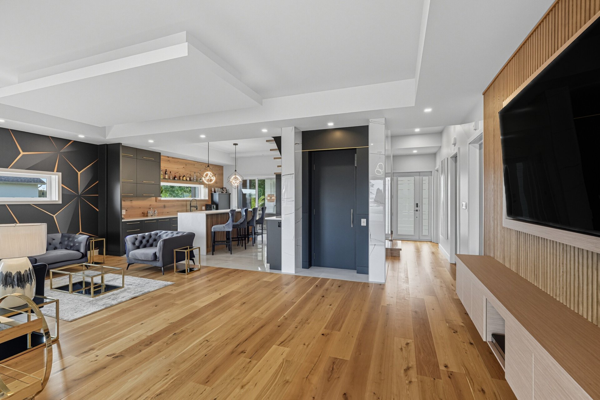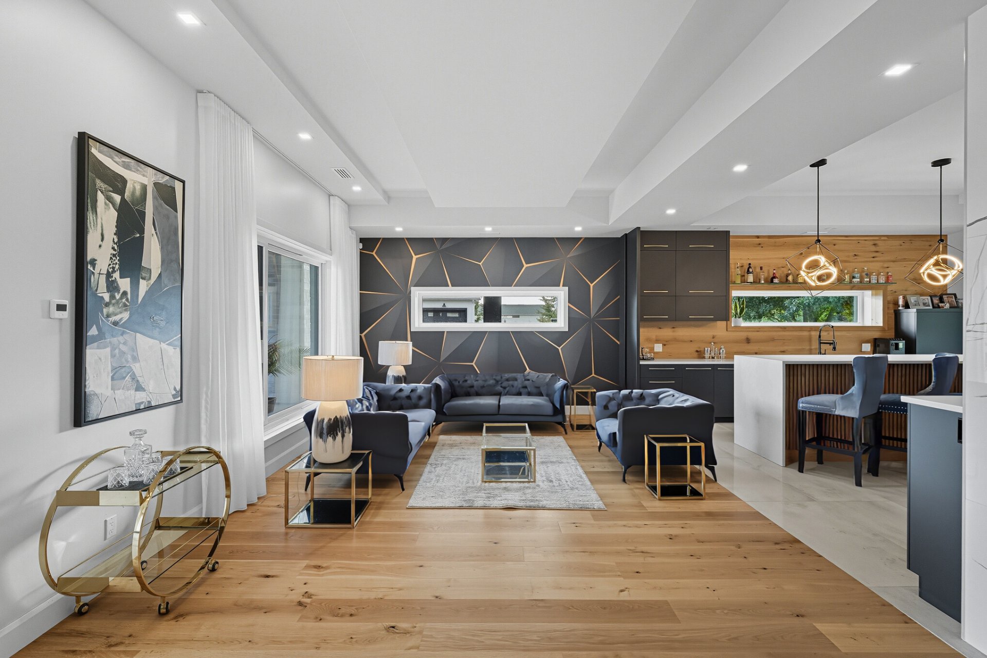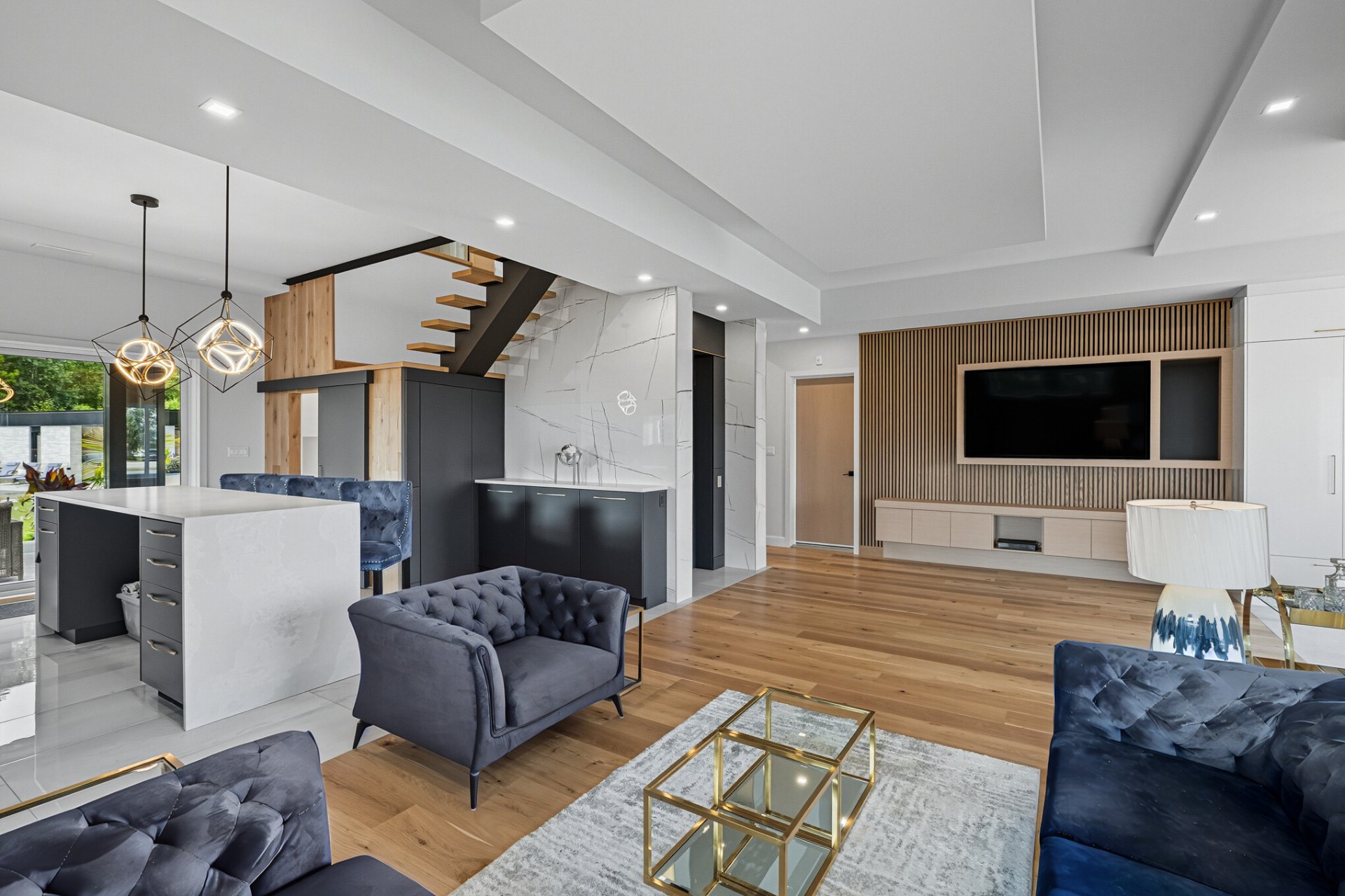 The main floor offers an open living area bathed in natural light thanks to the IMPRESSIVE WINDOWS. The built-in bar becomes the heart of the welcome -- perfect for hosting or enjoying a quiet moment. Light wood cabinetry, custom details and GRANITE surfaces add a touch of sophistication. The space flows seamlessly from the bar to the living area, creating a warm and functional environment, also ideal for WORK-FROM-HOME. All FLOORS are HEATED for absolute comfort, and the laundry room is located on this level for practical daily organization. The oversized GARAGE, with a door opening directly onto the backyard, makes it easy to store equipment or large tools -- and can even be transformed into an ATELIER as needed.
