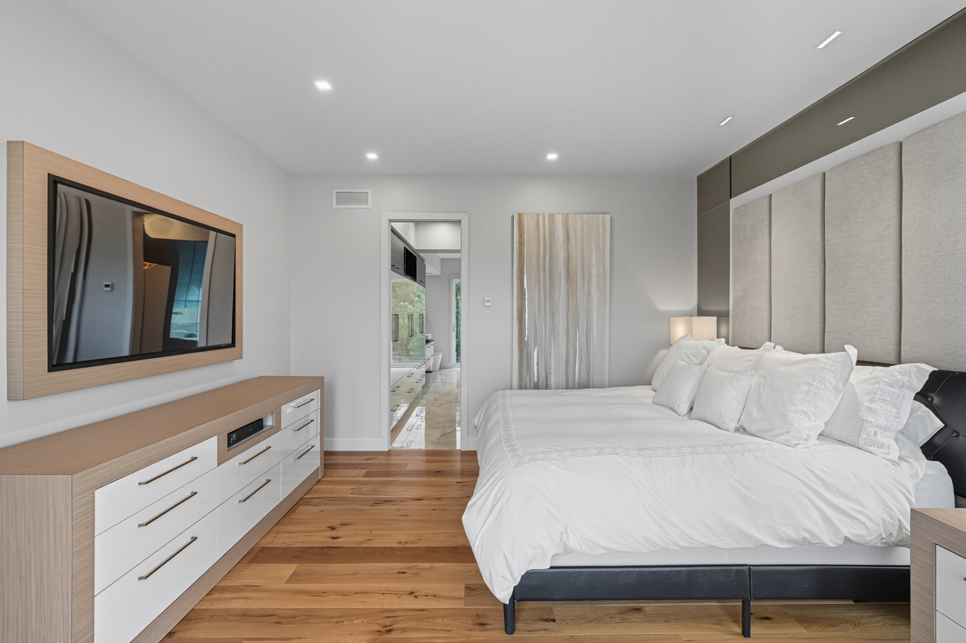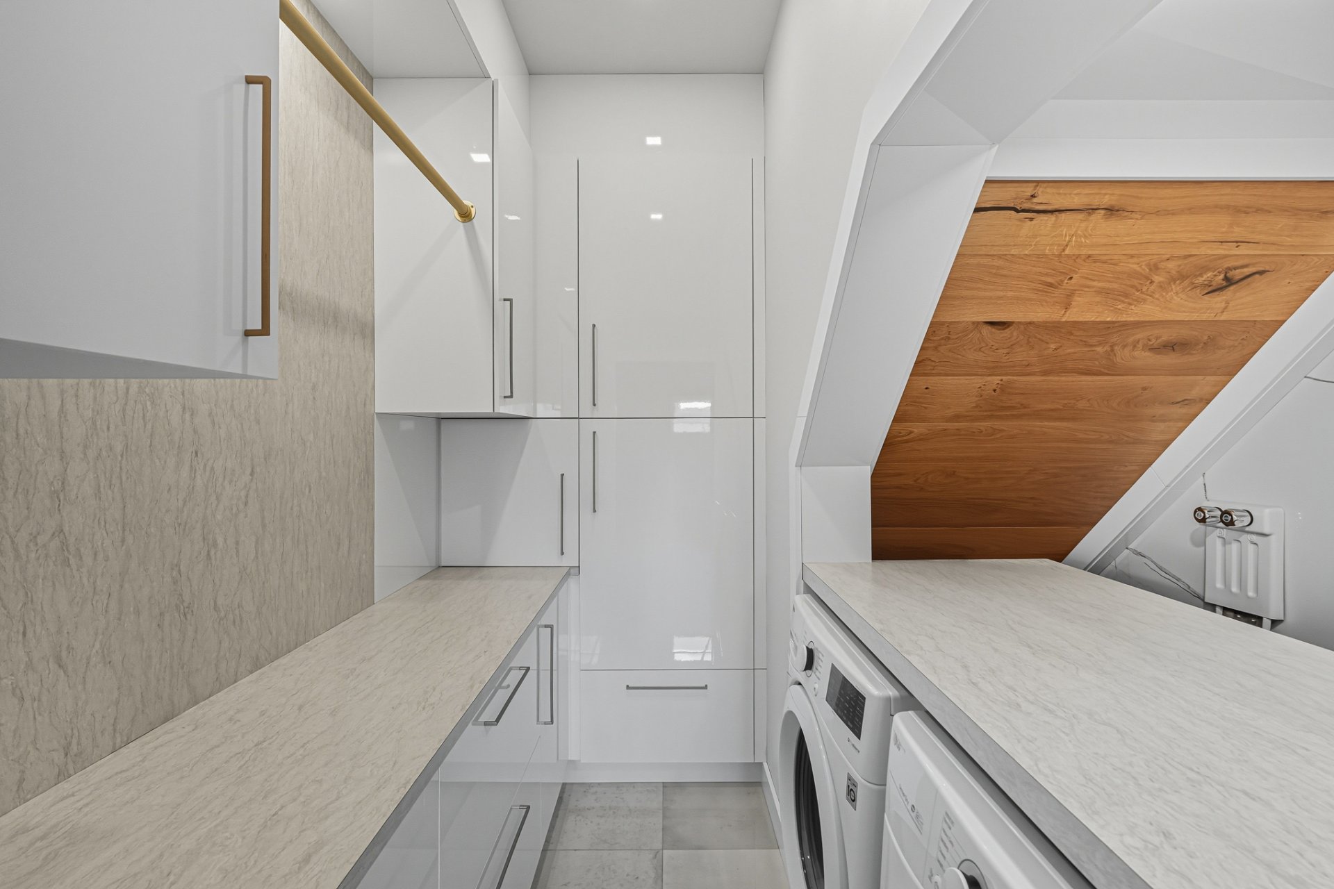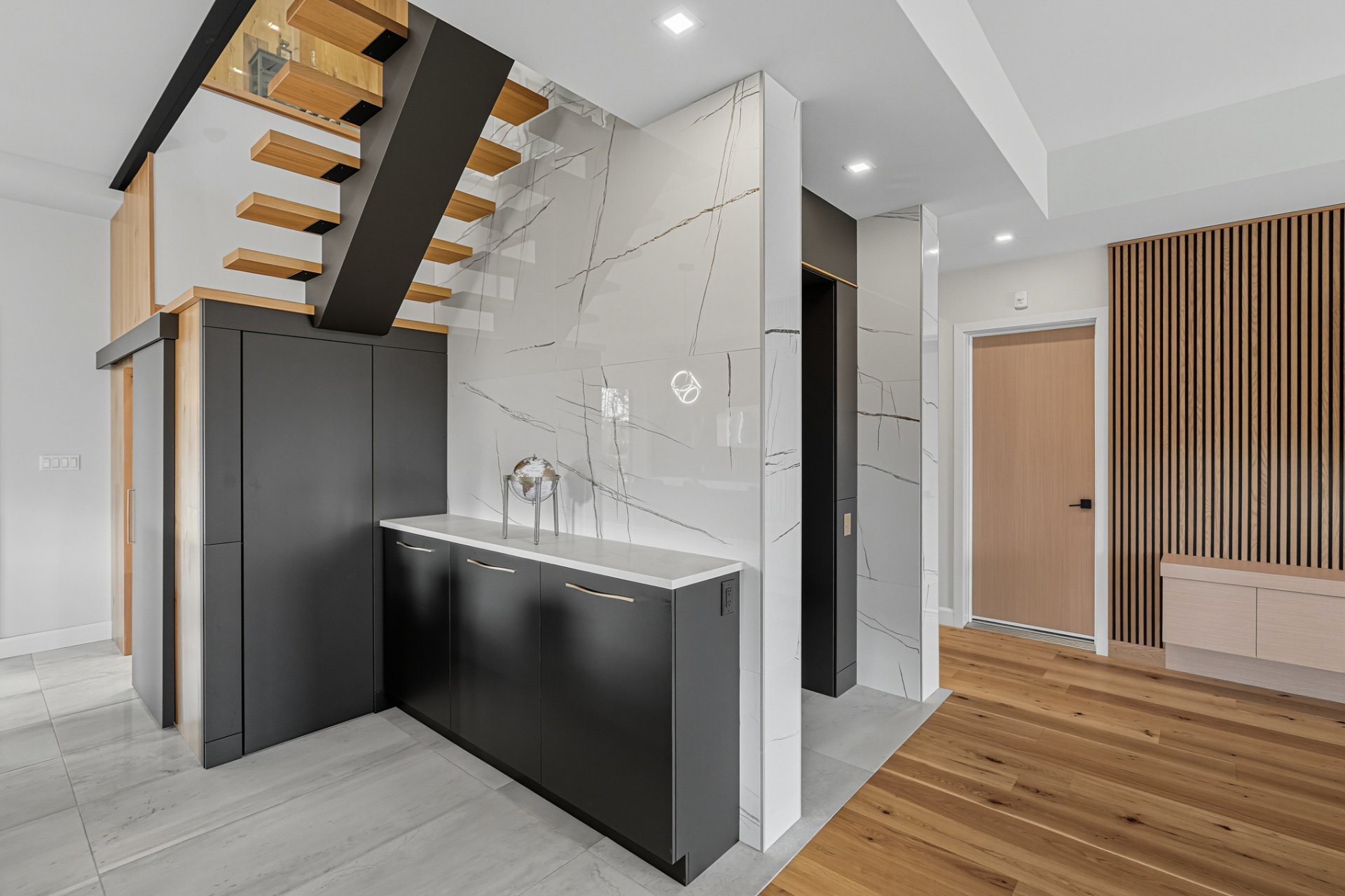 Reached by the elevator, the upper level reveals an impressive living space where LIGHT takes center stage. The kitchen, lounge and dining area unfold in a refined atmosphere, highlighted by a GLASS WINE CELLAR. Three spacious bedrooms complete this floor. The primary suite is a true haven: large walk-in closet and private bathroom with Italian shower and freestanding tub. The two additional bedrooms include BUILT-IN custom furniture -- perfect for an organized and harmonious lifestyle.