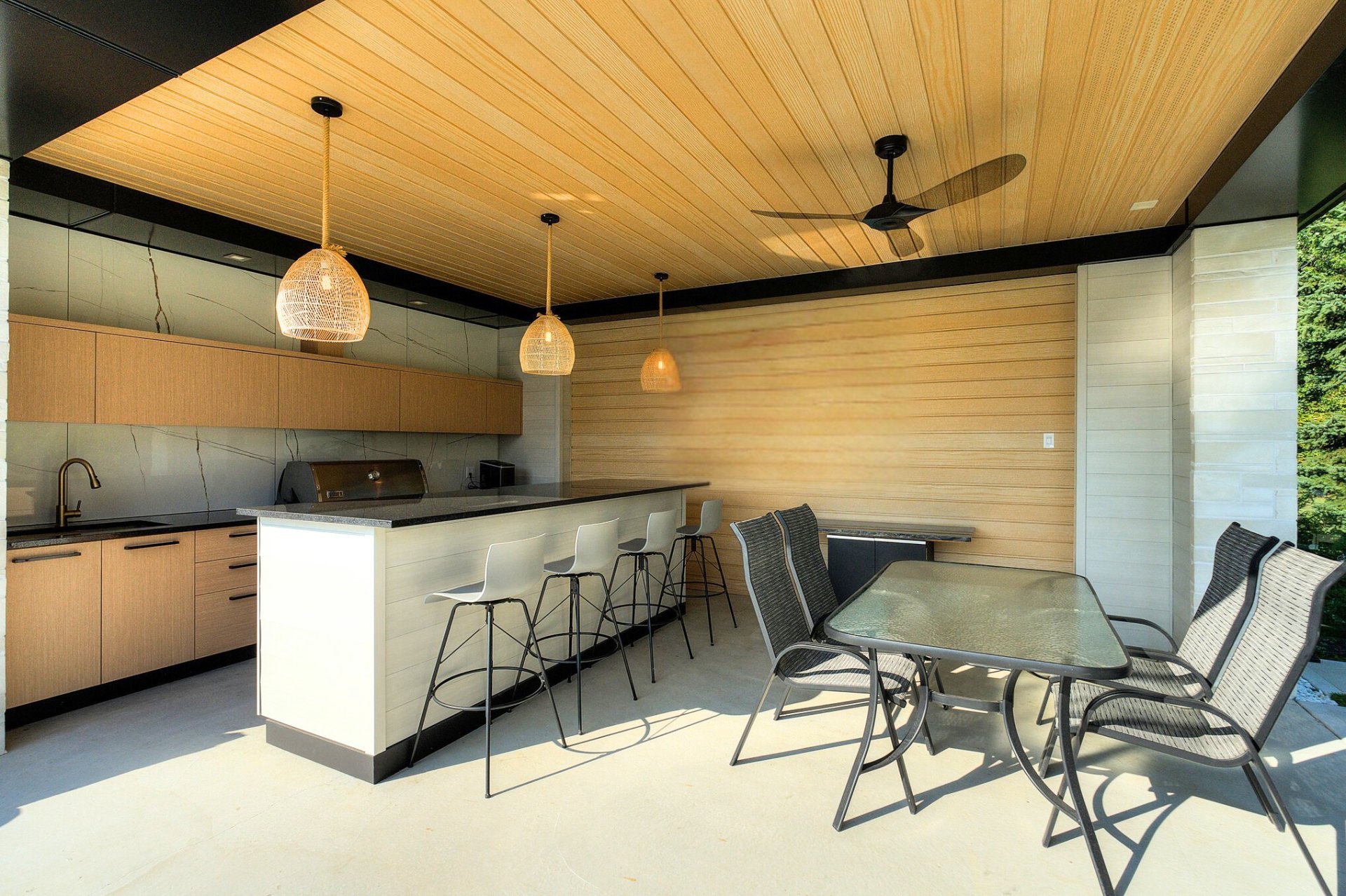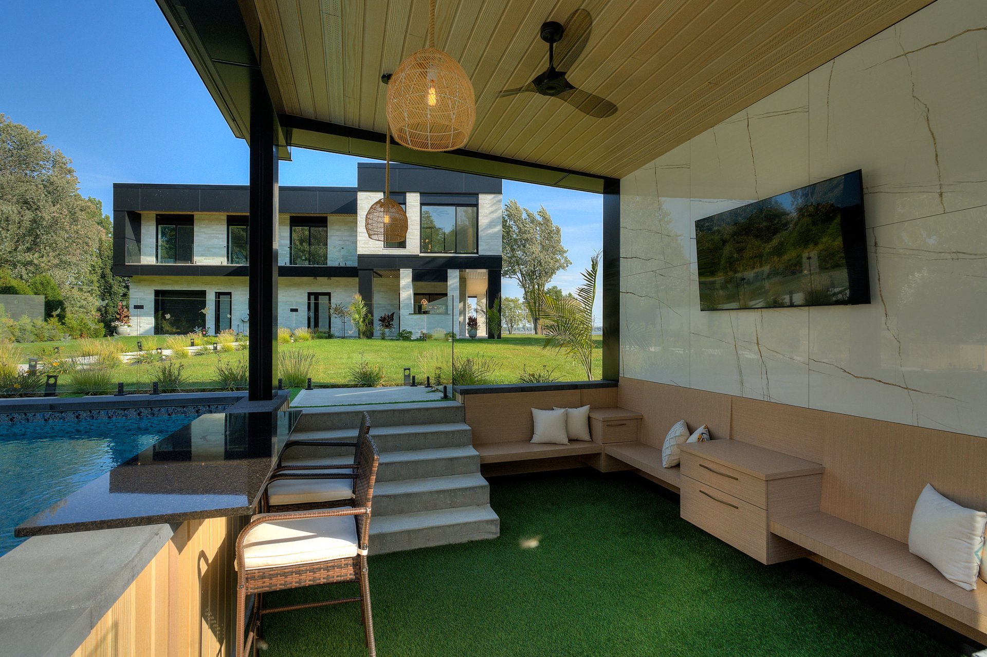 Outside, a private oasis awaits. The pool is surrounded by a generous terrace, ideal for enjoying the sun or hosting family and friends. The COVERED PAVILION offers a relaxing space with a WATERFALL feature, creating a soothing resort-style atmosphere.