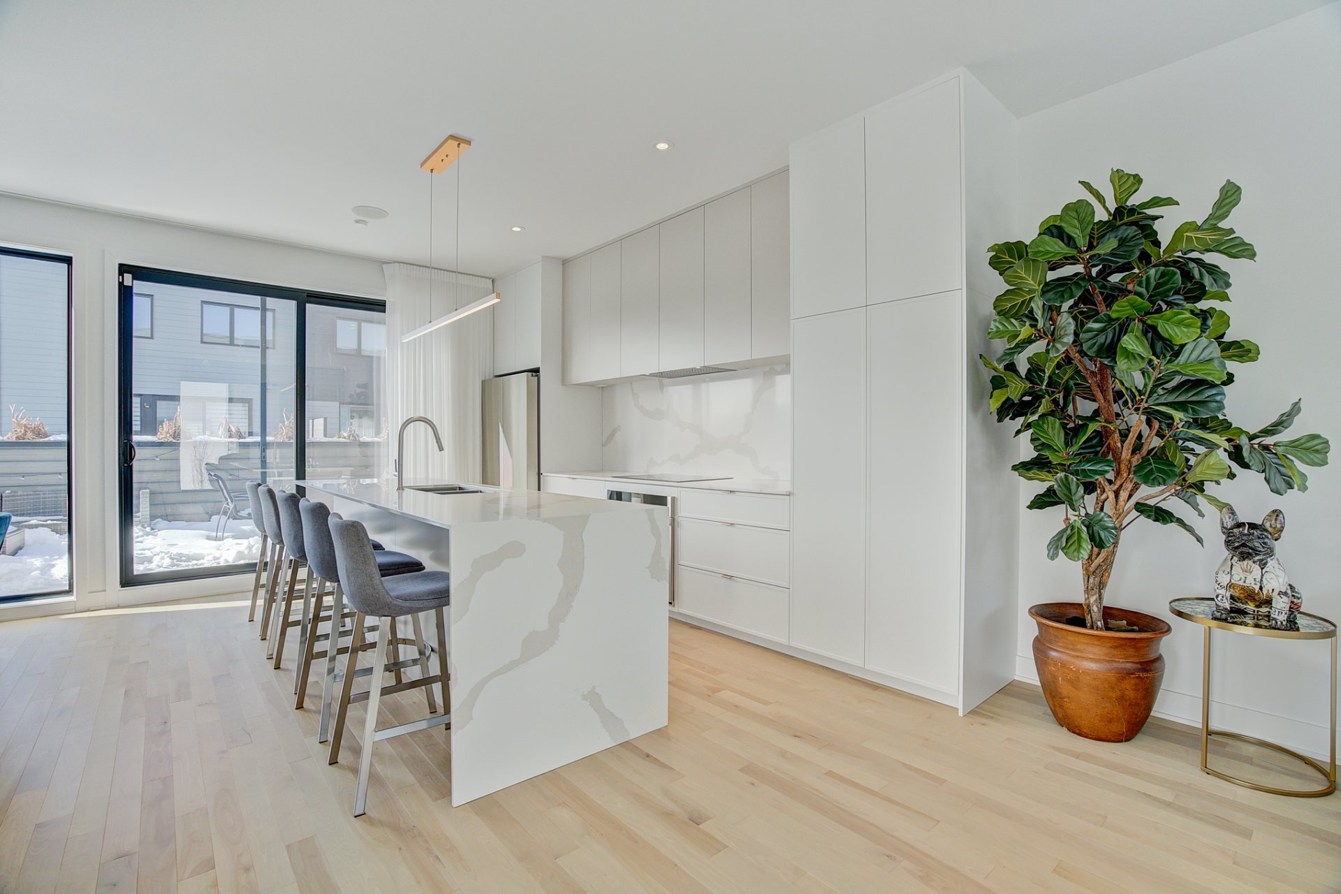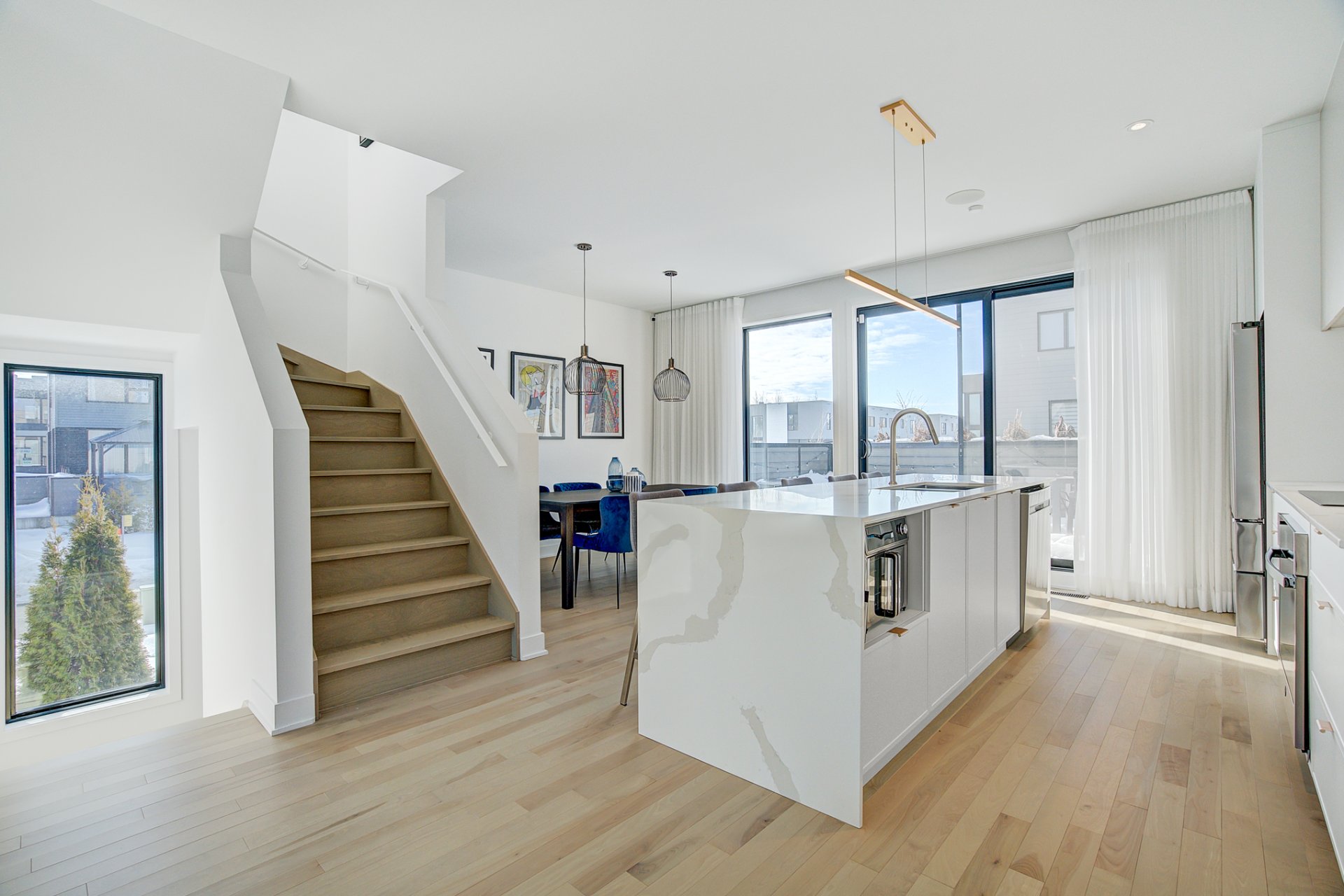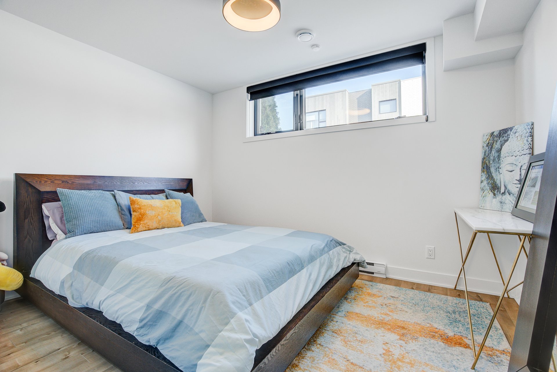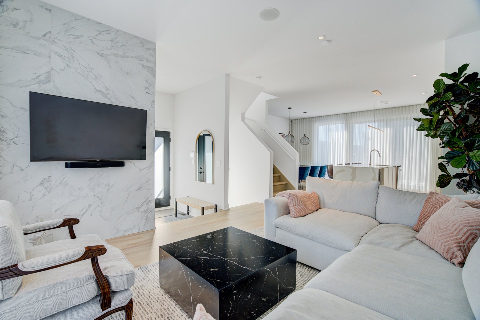 Charming south-facing corner home with a private entrance, offering a generous living area of 1,851 square feet spread over three levels (basement, ground floor, and upper level). This residence features three bedrooms, including two on the main level and one in the basement, as well as two full bathrooms and a powder room. It offers 9-foot ceilings on the ground floor and 10-foot ceilings in the entrance hall. The private double garage is ready for the installation of an electric vehicle charging station. Enjoy beautiful summer days on the 20-by-13-foot terrace, equipped with electricity and a spa connection.