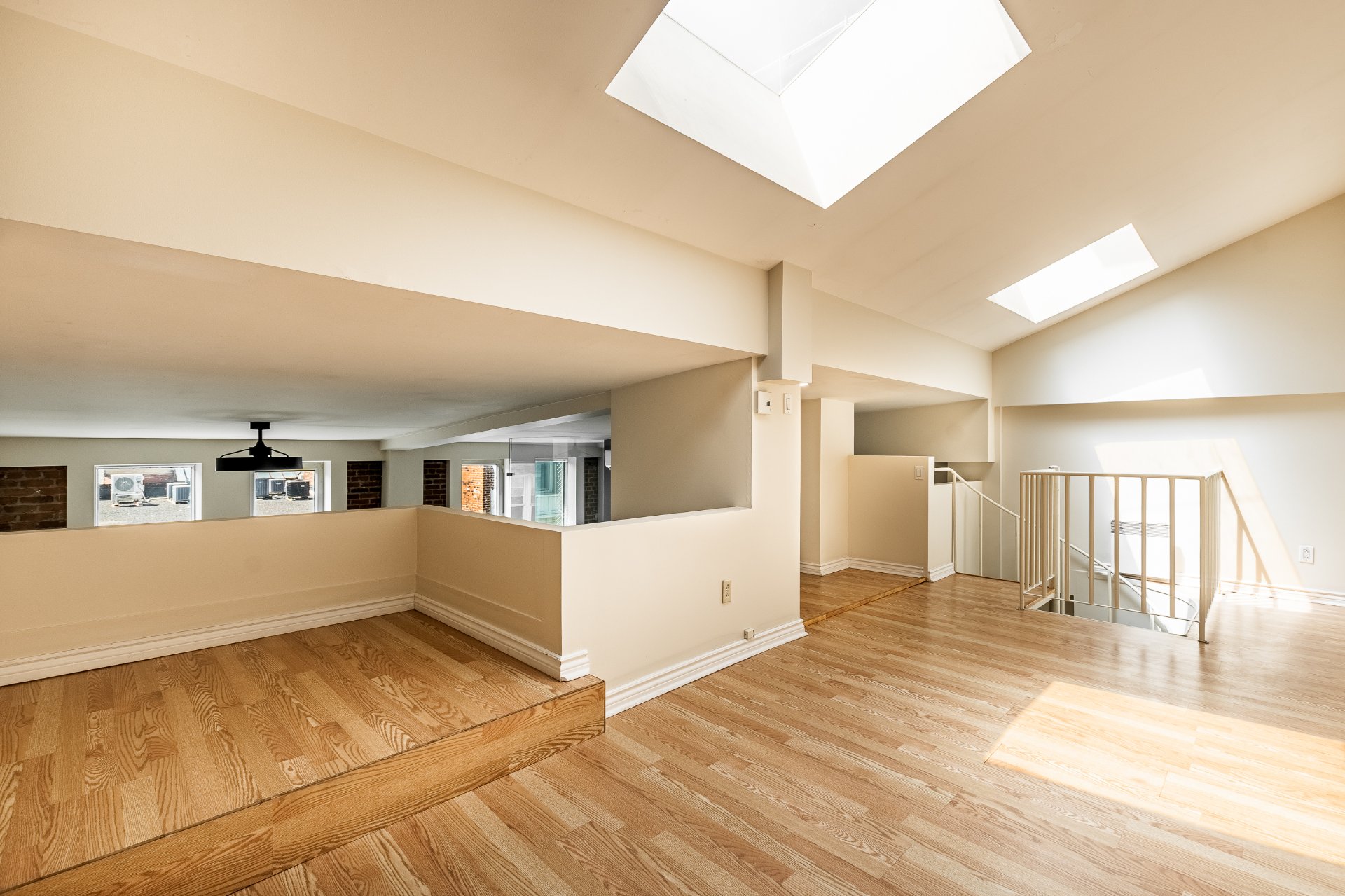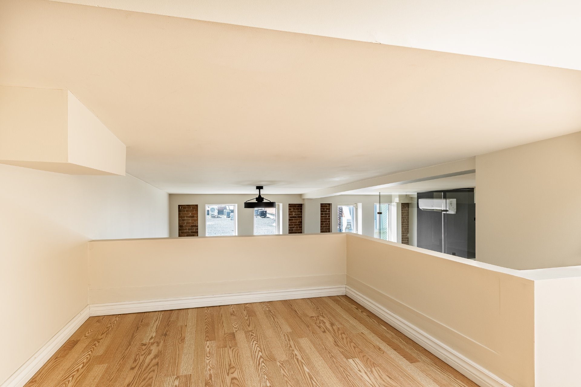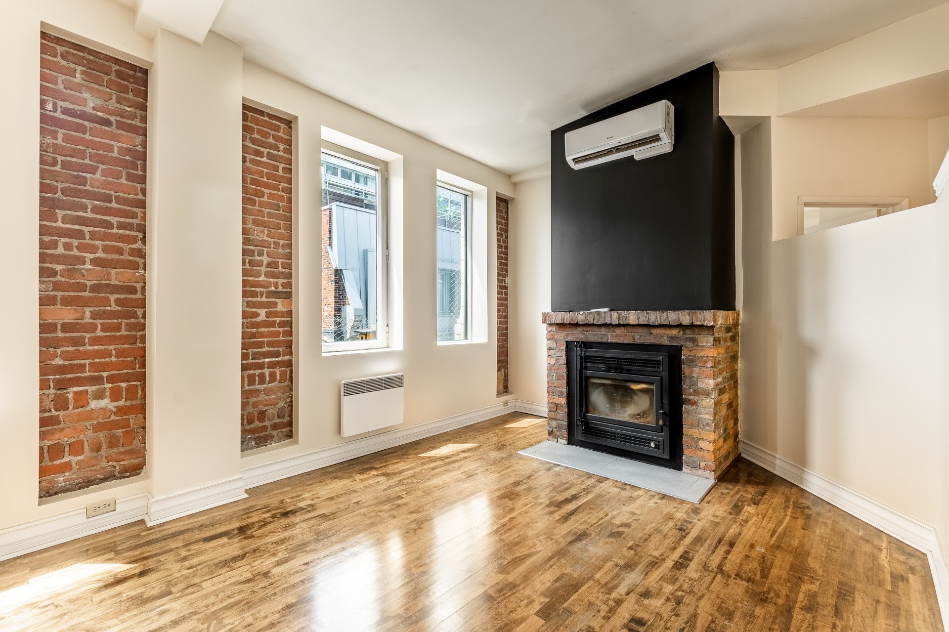 CORN EXCHANGE PROJECT | Charming condo on two levels located in the heart of Old Montreal nestled in a historic building. Beautiful open living space with high ceilings and very large windows allowing for natural light, thanks to the unique location of this unit, nestled between two buildings!. Exposed brick walls and wood fireplace in the living room, spiral staircase leading to second levels. One bedroom and one large mezzanine, one with a view of the city and a full bathroom.