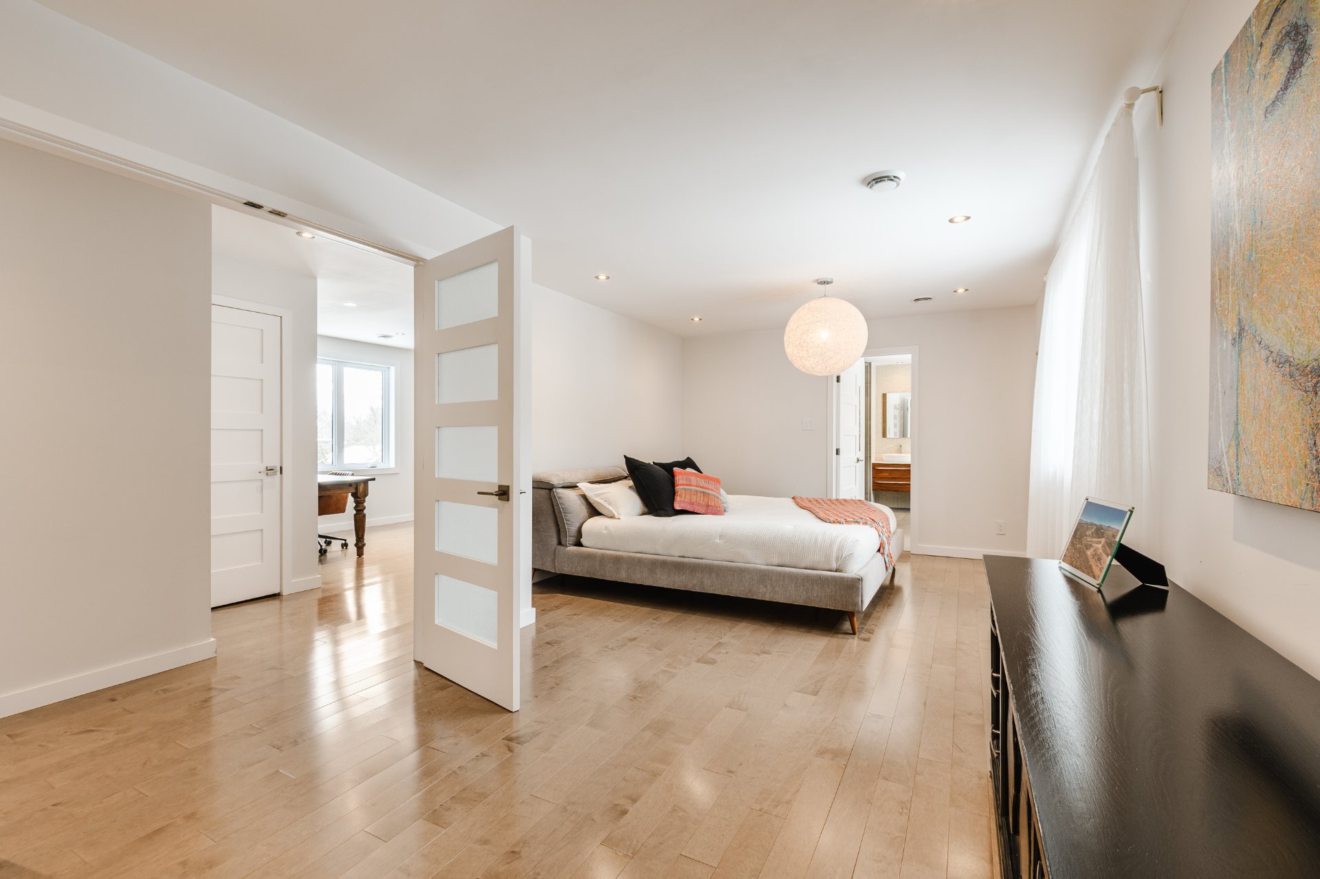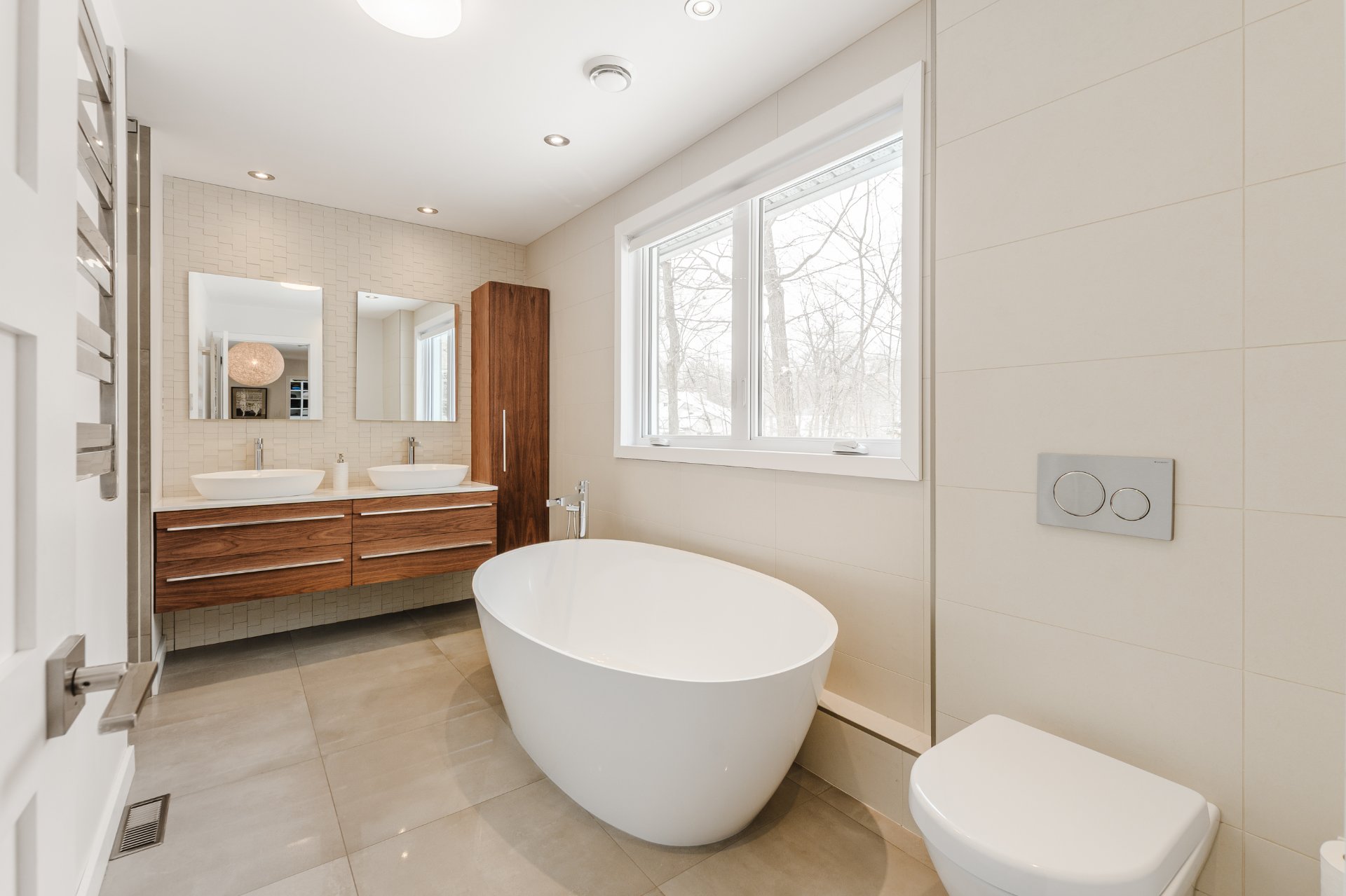 + Three generously sized bedrooms. Primary suite with large walk-in closet and luxurious ensuite featuring freestanding tub, double vanity with Riobel faucets, wall-mounted Geberit toilet, rain shower with Cabano hardware, heated floors and towel warmer.