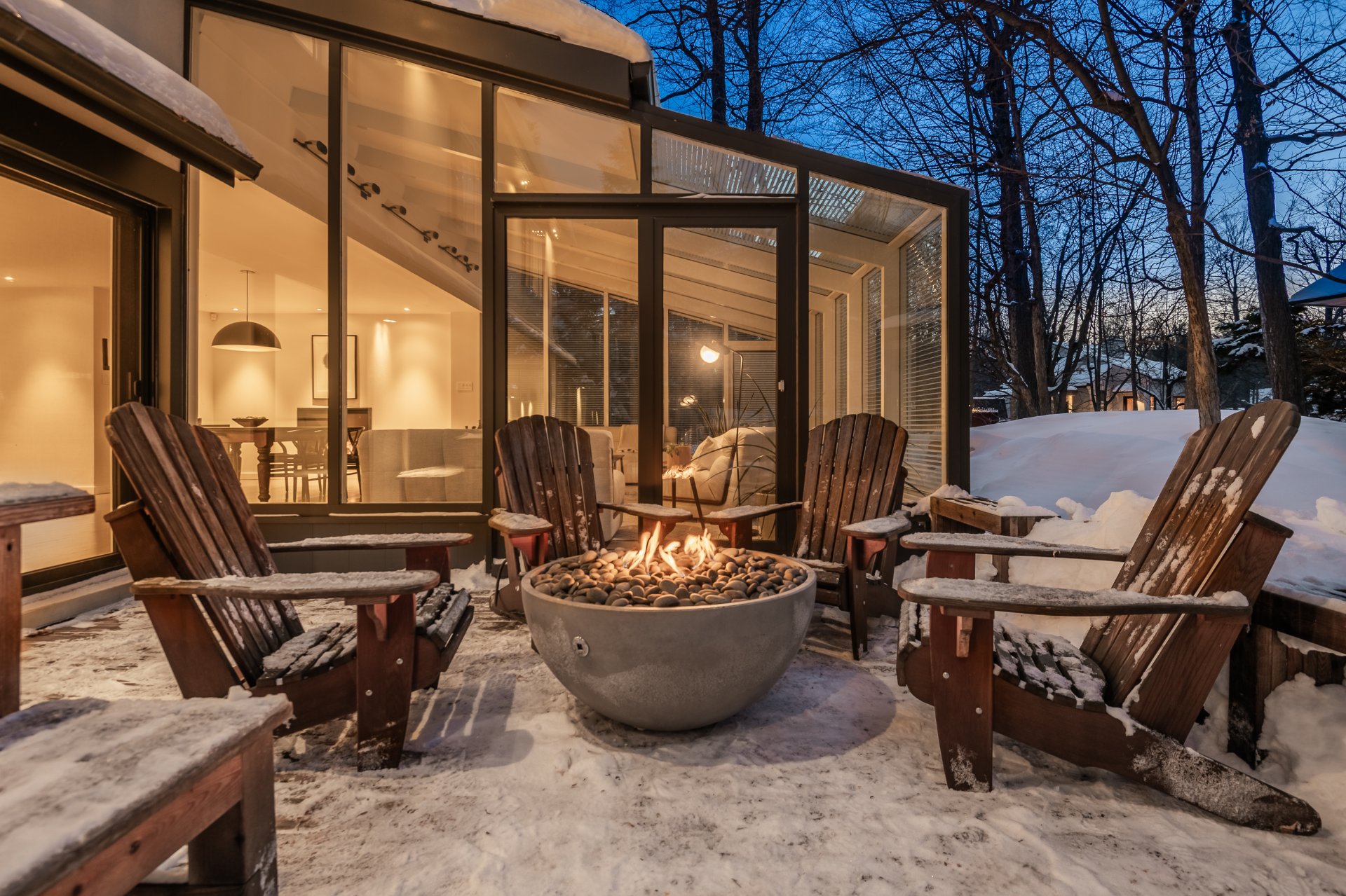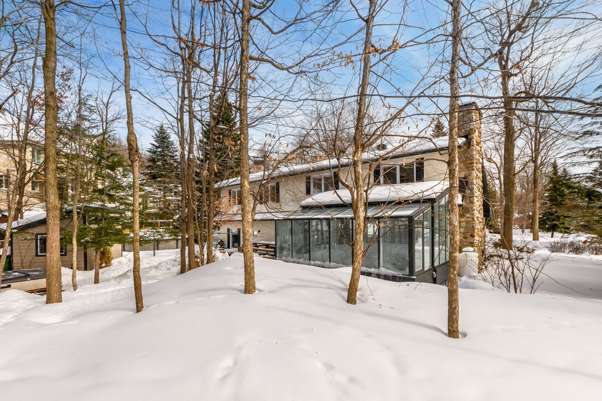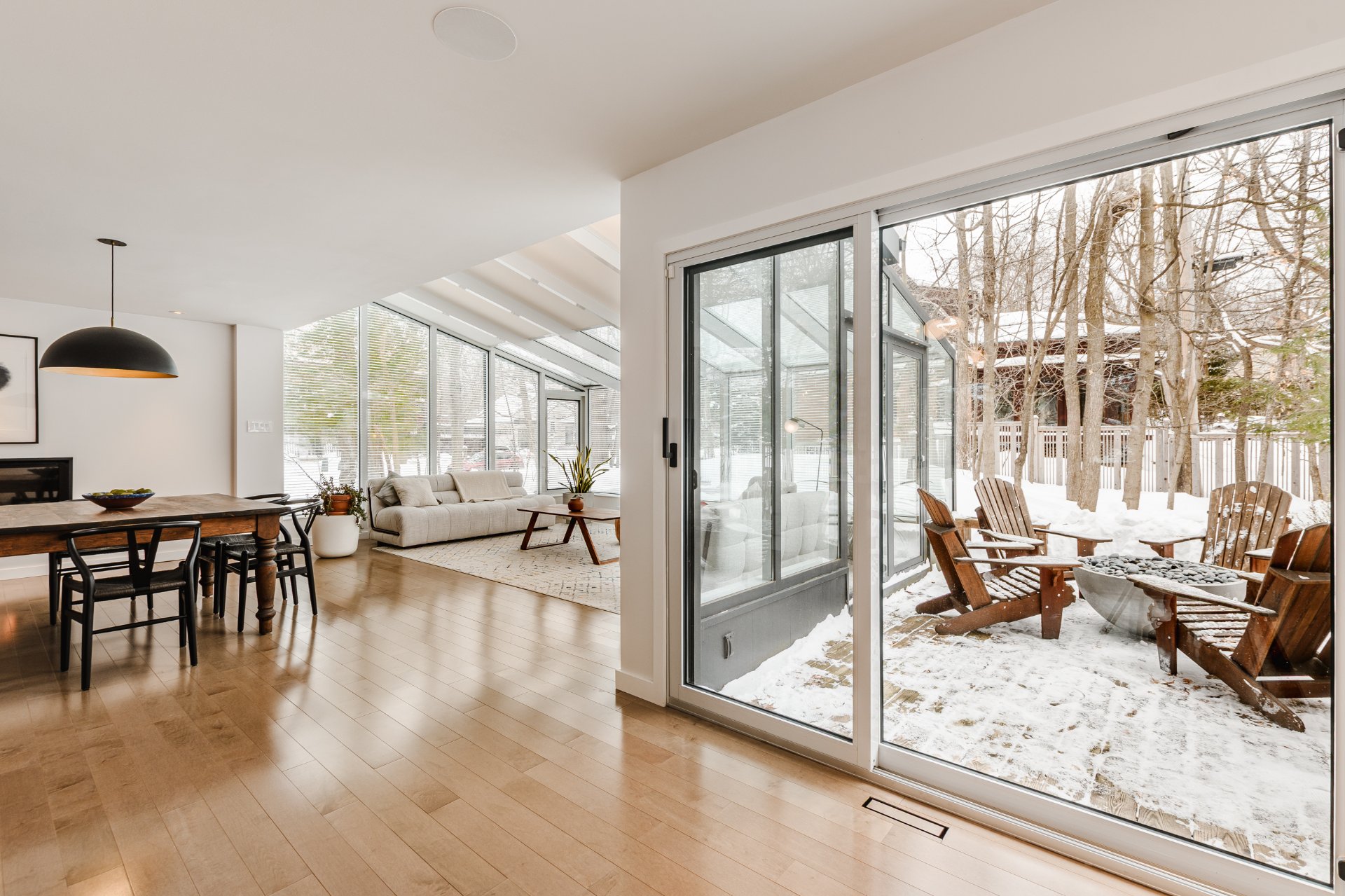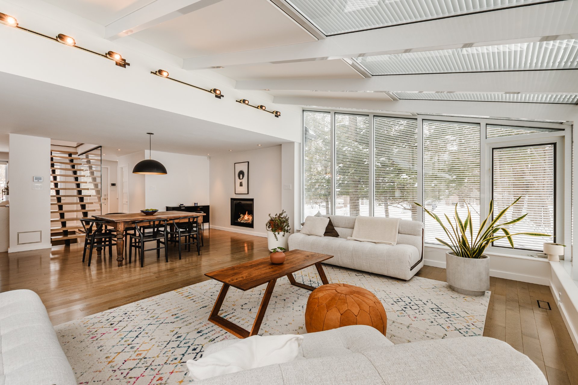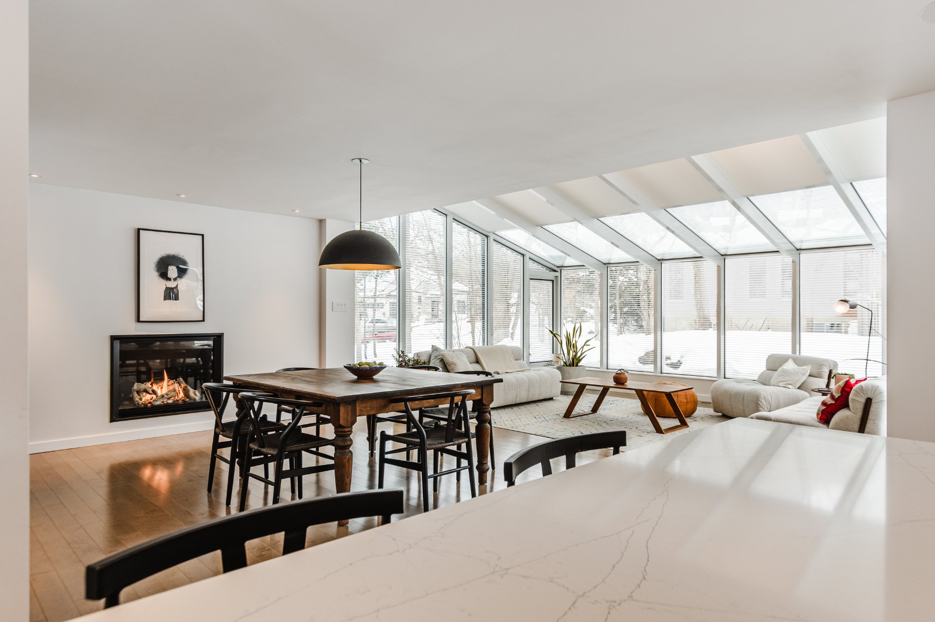 + Elegant dining room with gas fireplace. Living room set within a fully windowed solarium offering 360-degree views with integrated blinds. Large 7-foot patio door leading to the rear terrace.