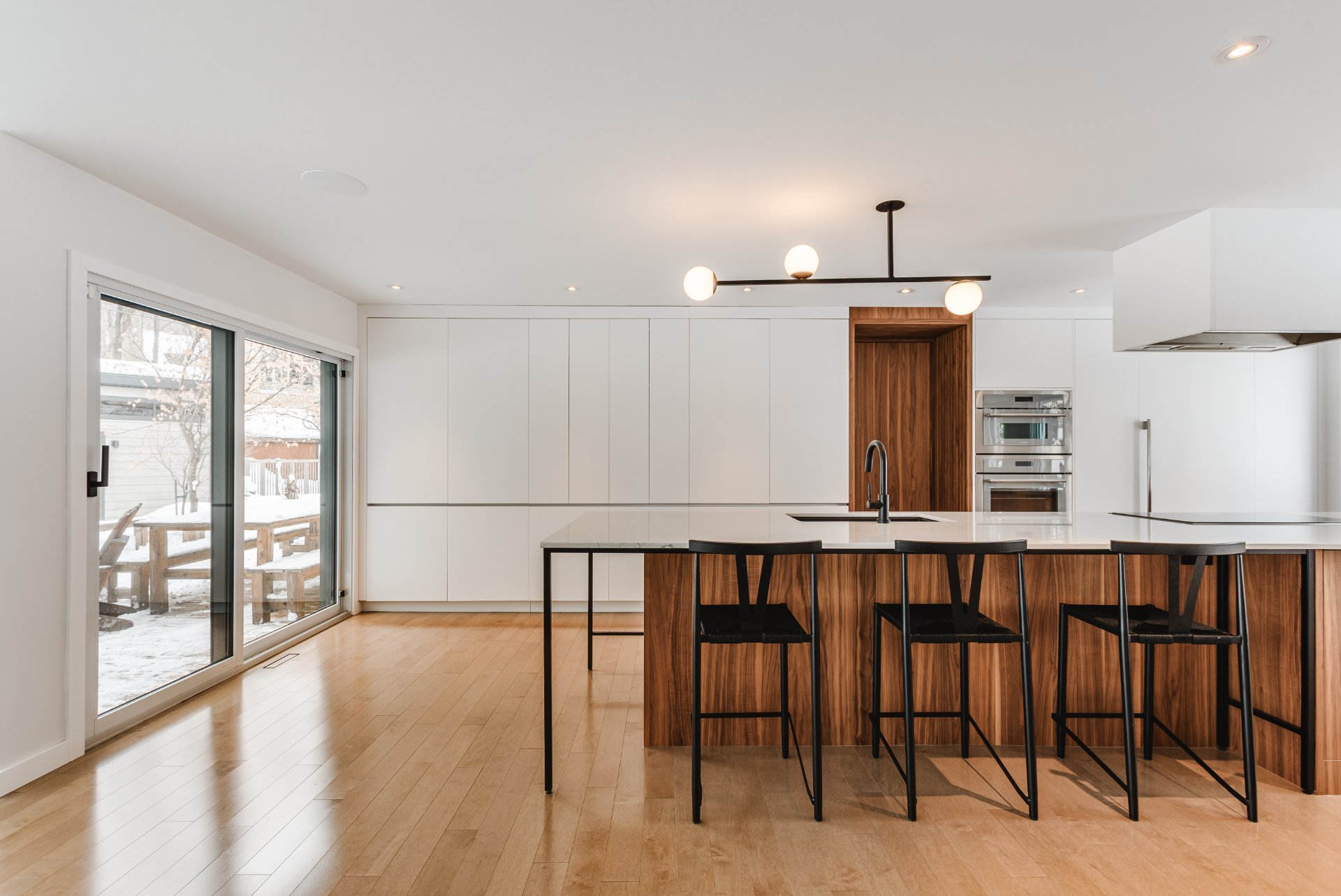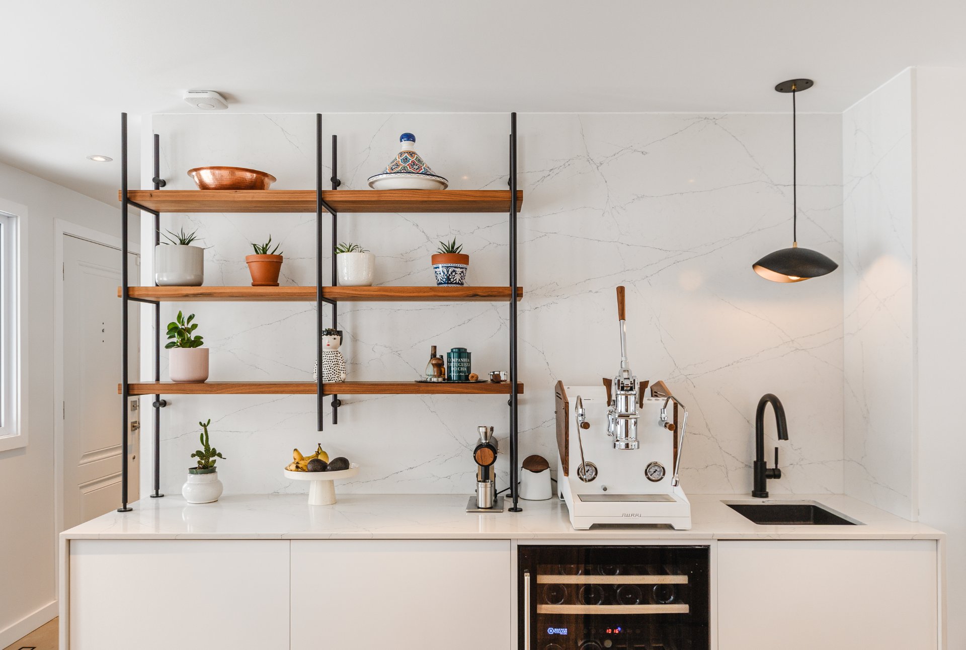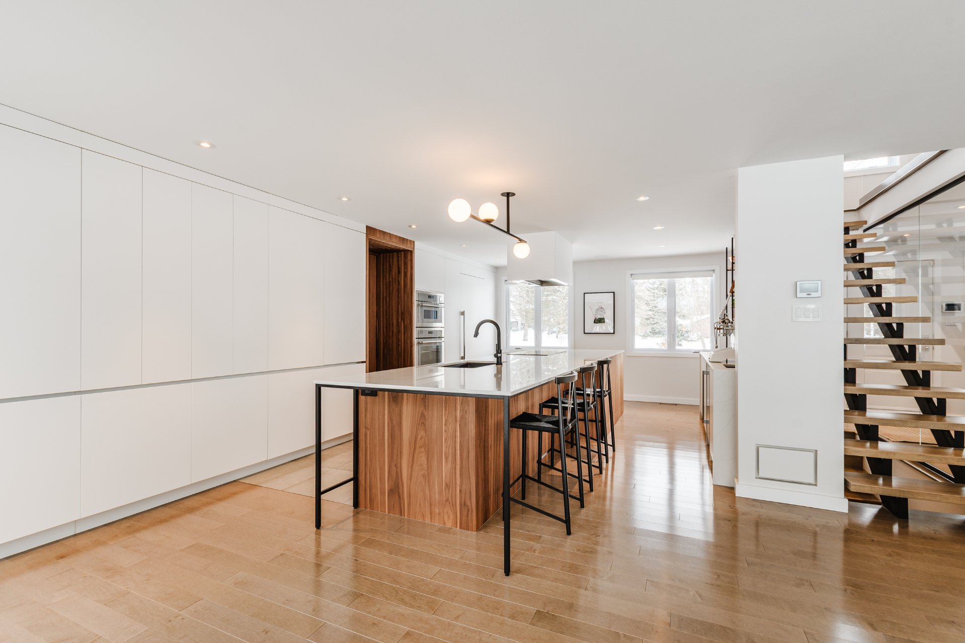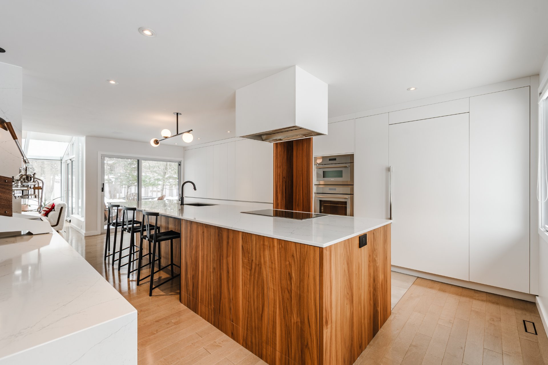 + Kitchen by Cuisines Steam, designed as a true chef's kitchen. Spectacular 15-foot island with seating, quartz countertops and backsplash, two smart sinks, integrated coffee station, full wall of custom cabinetry with pantry and Magnum Cellars wine storage. Heated floors and built-in speakers. Direct access to the garage through a concealed wood door seamlessly integrated into the cabinetry.