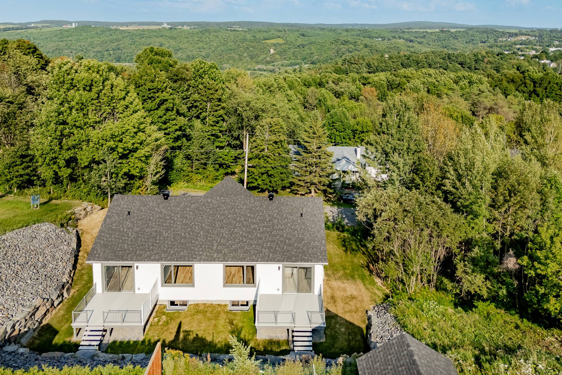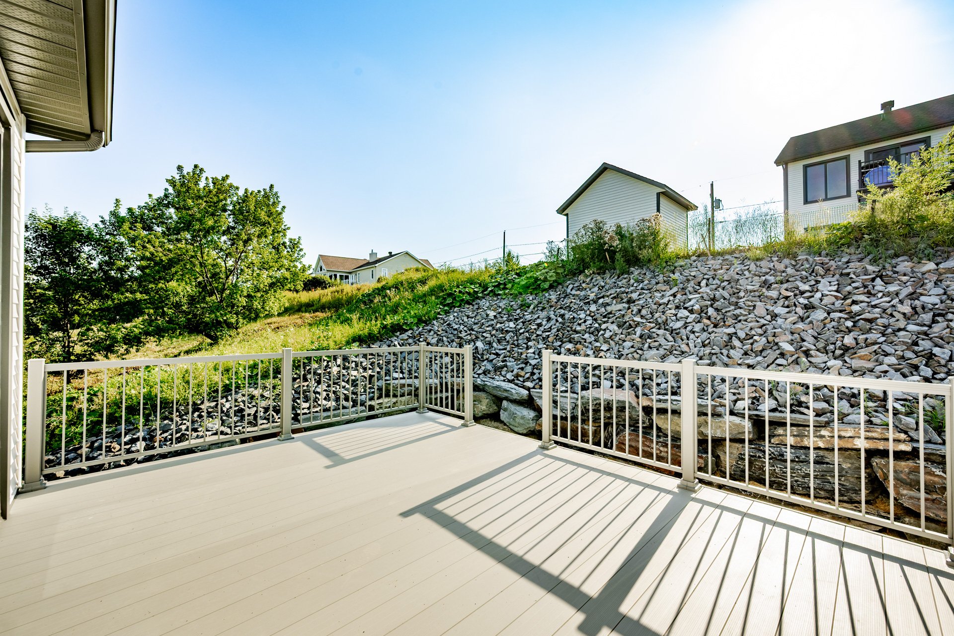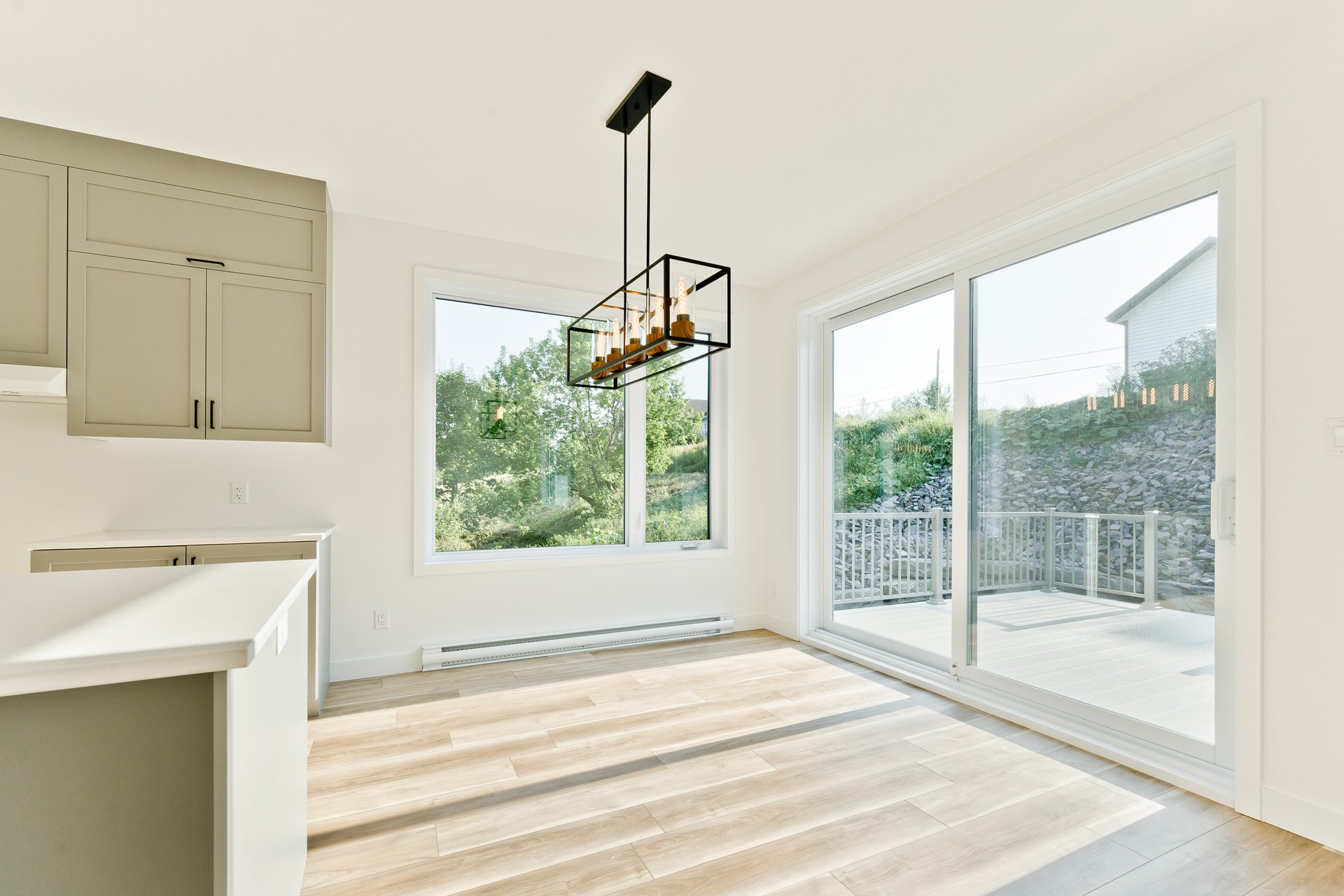Step inside through the main entrance, where a practical walk-in closet provides the perfect space to store coats and shoes. Head upstairs to discover a spacious open-concept living area filled with natural light thanks to expansive windows that create a warm and inviting atmosphere. The kitchen, truly the heart of the home, impresses with its contemporary design, refined finishes, and a large walk-in pantry--ideal for keeping all your ingredients and kitchen essentials within easy reach. The dining area opens onto a large rear patio with privacy wall, inviting you to extend your gatherings with family and friends in a pleasant outdoor setting. The bright and spacious living room is perfectly suited for both relaxation and entertaining, offering clear views of the outdoors and breathtaking sunsets. On this level, you'll also find the master bedroom with a generous walk-in closet for optimal storage and the first full bathroom. Comfort is ensured year-round with a wall-mounted heat pump.