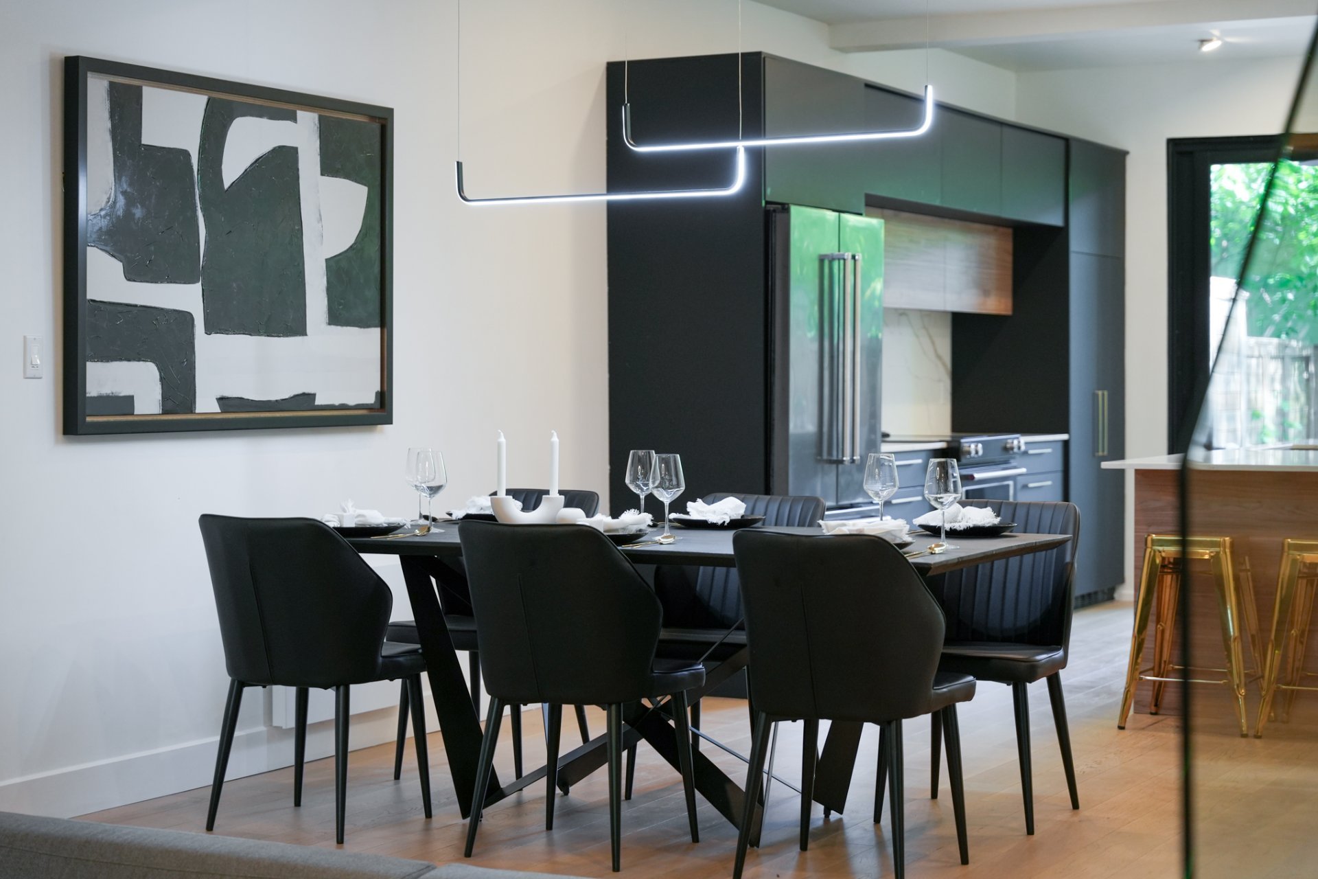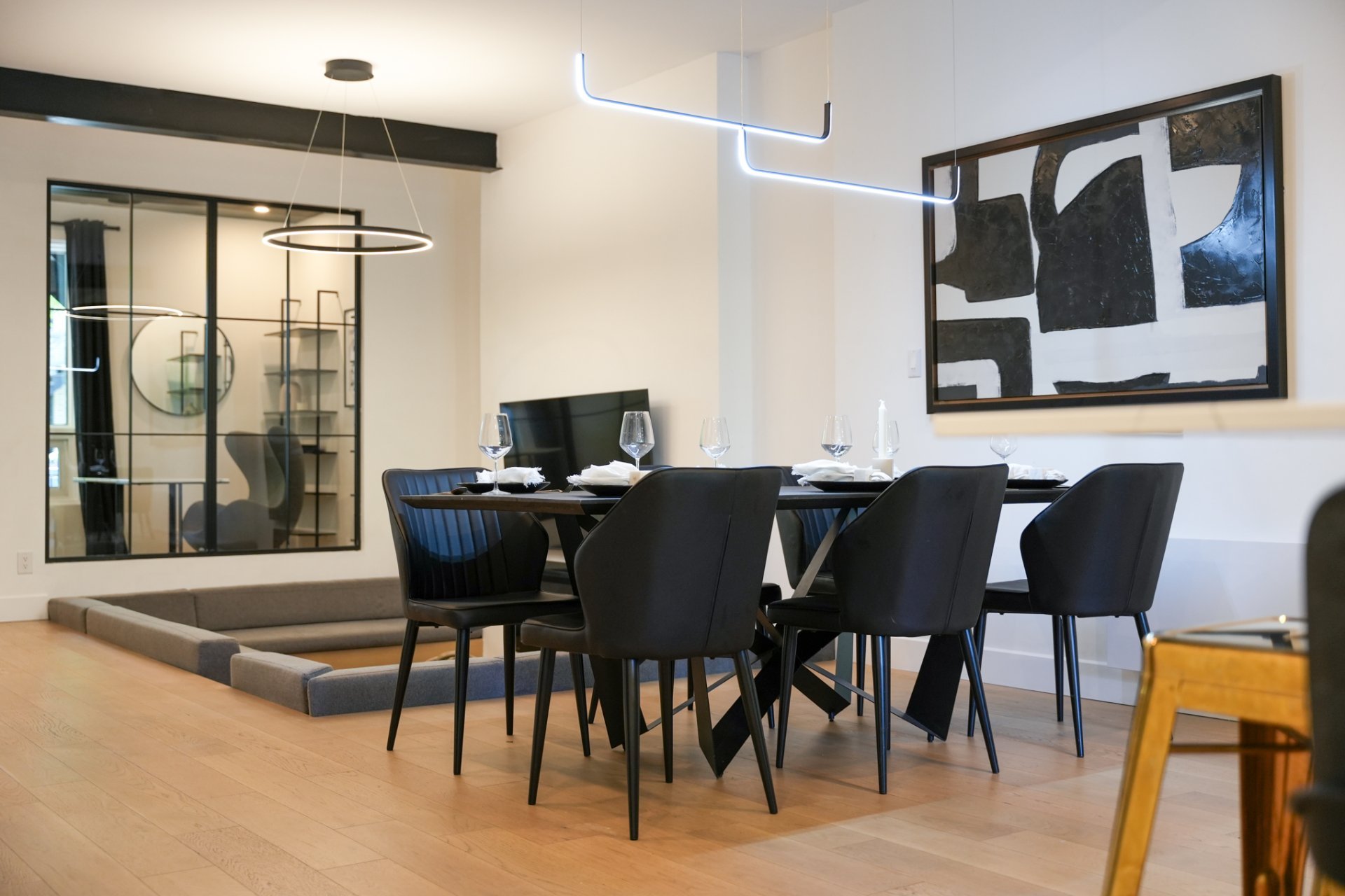 Designed for modern living, the main floor impresses with its expansive living area, soaring 11-foot ceilings, and a central office space that subtly divides the open layout without interrupting flow. The chef's kitchen and spacious dining area are ideal for entertaining. Large patio doors open seamlessly onto the backyard, extending the living space outdoors.