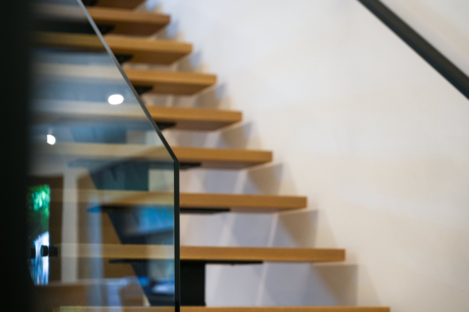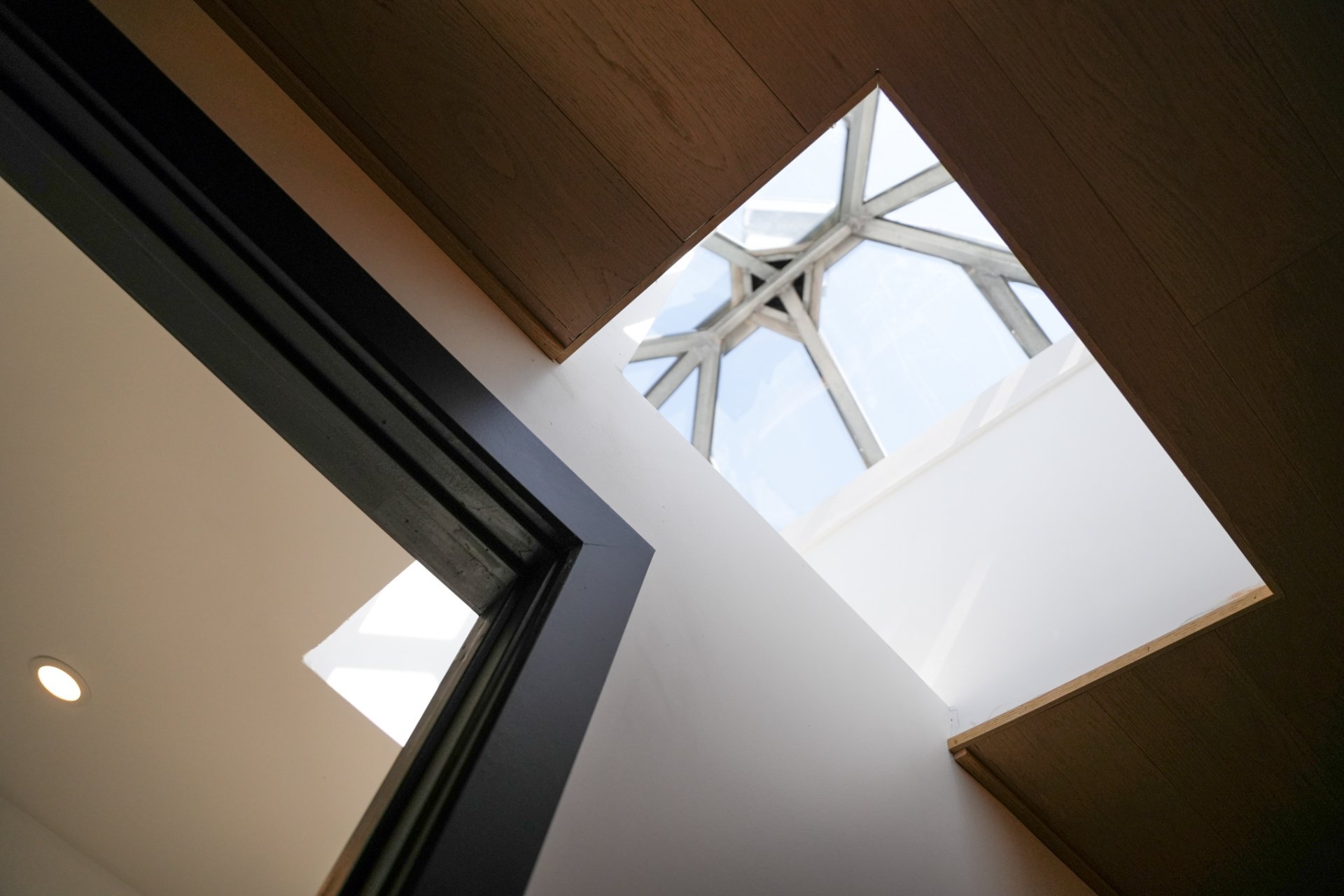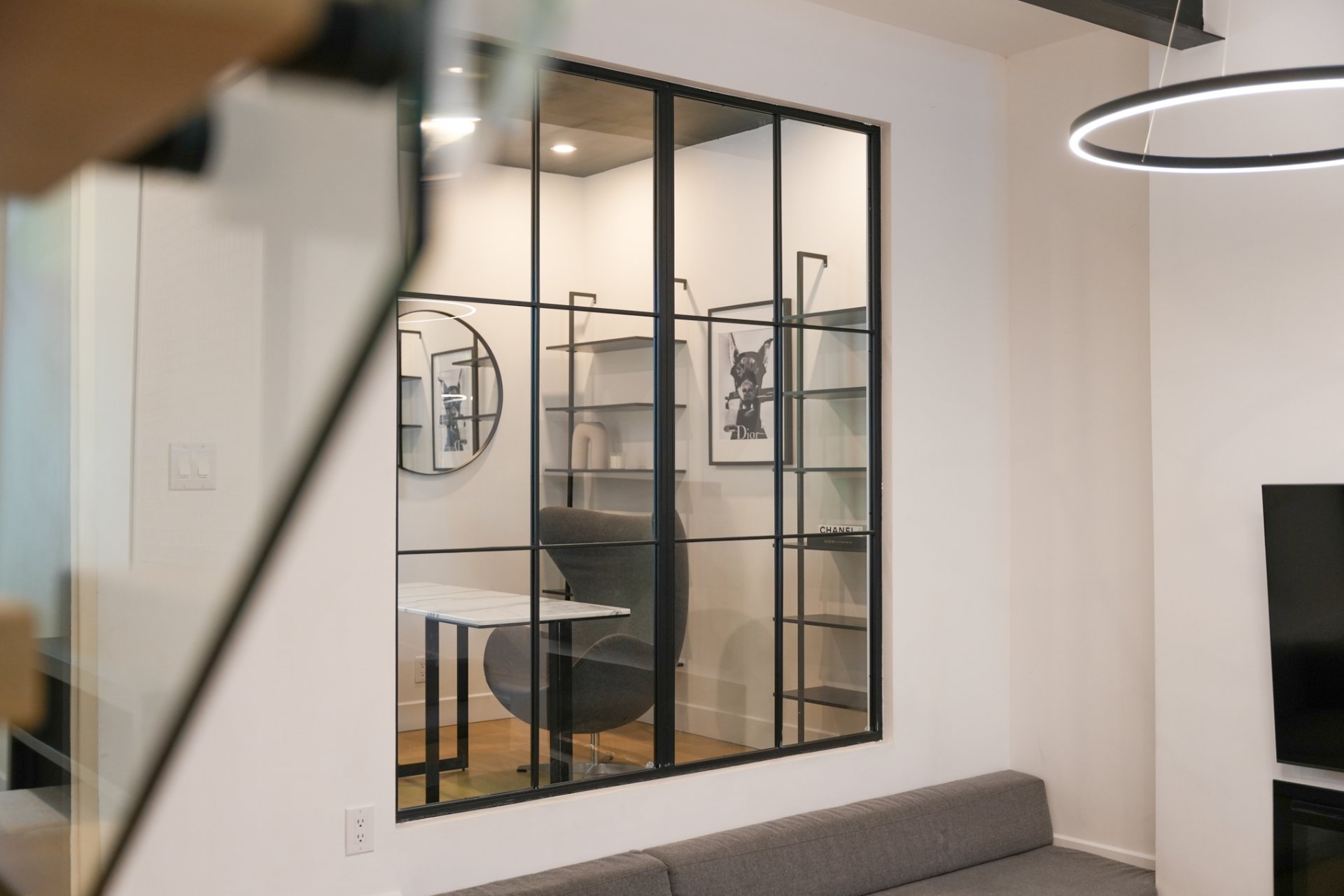 A striking glass staircase leads to the second floor, where a central skylight floods the space with natural light. A versatile home office sits at the heart of this level, separating the sleeping quarters. Through beautiful French doors, the primary suite offers a walk-in closet, private ensuite bathroom, and direct access to a private balcony. Two additional bedrooms, one with its own balcony, and a convenient laundry room complete the floor.