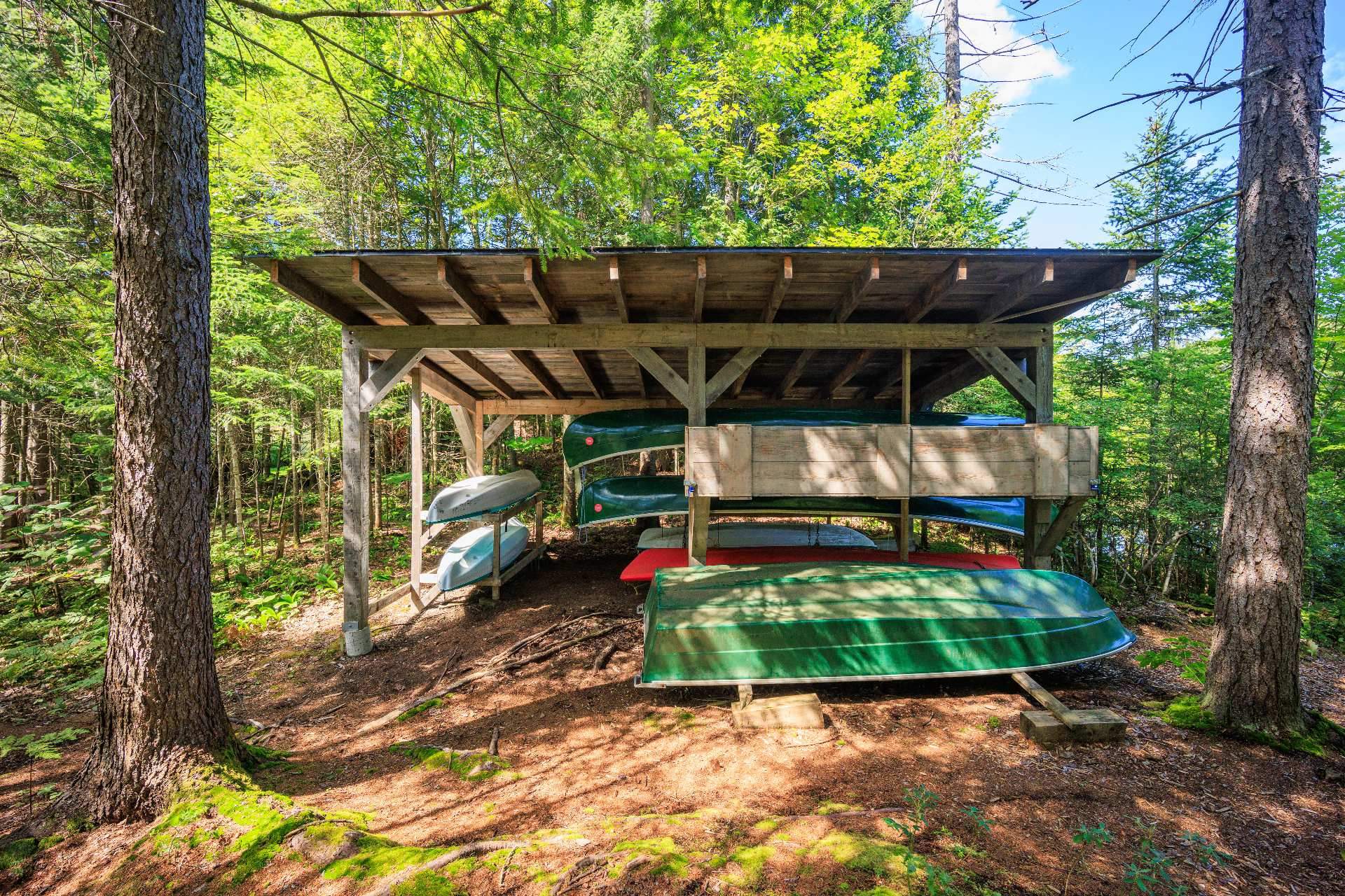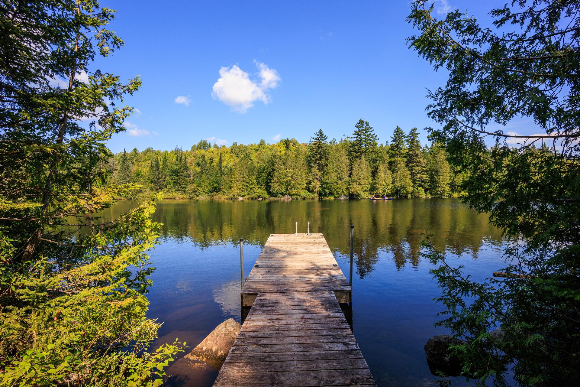 Set on a lot of over 5 acres, the house offers direct access to hiking trails, Lake Notre-Dame, and the recreational boats of the estate.