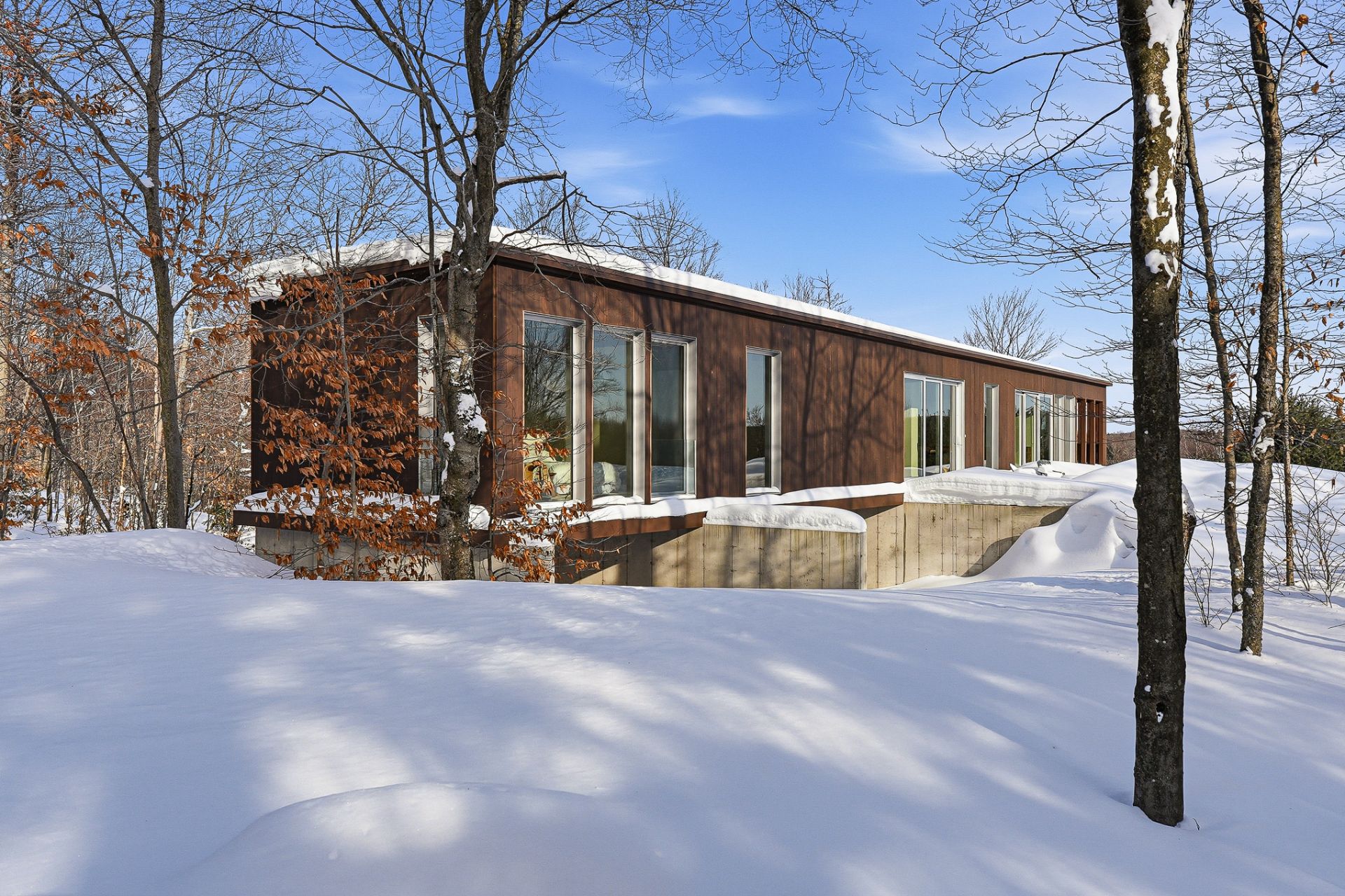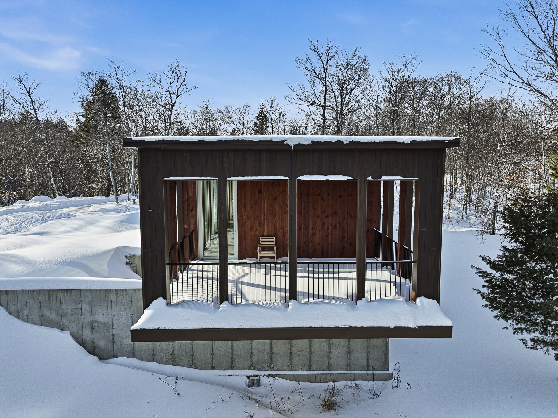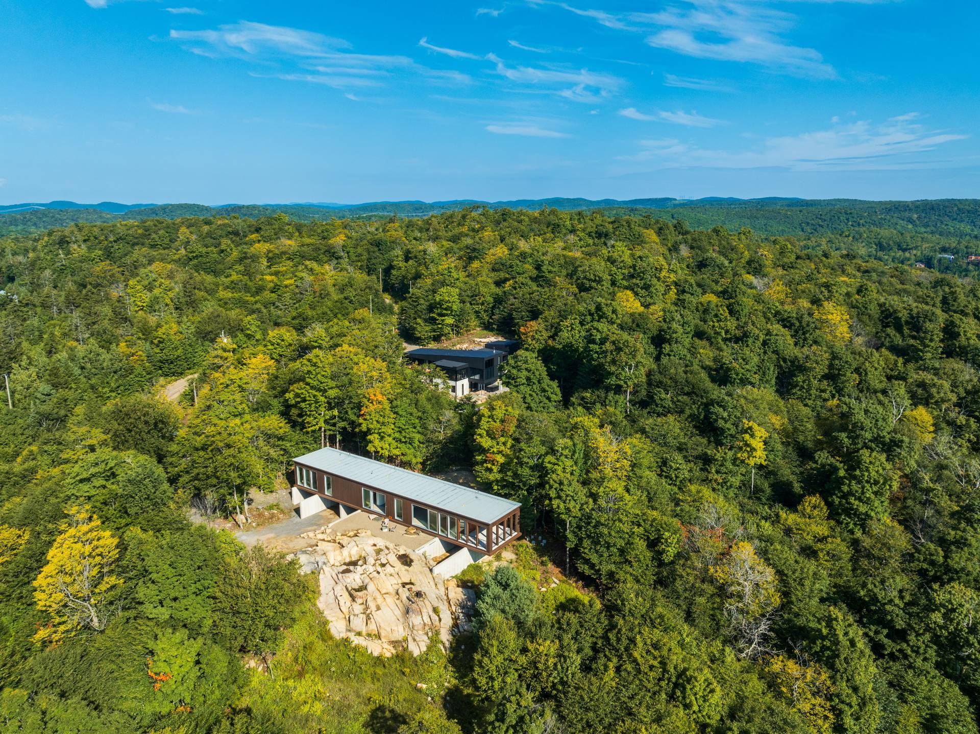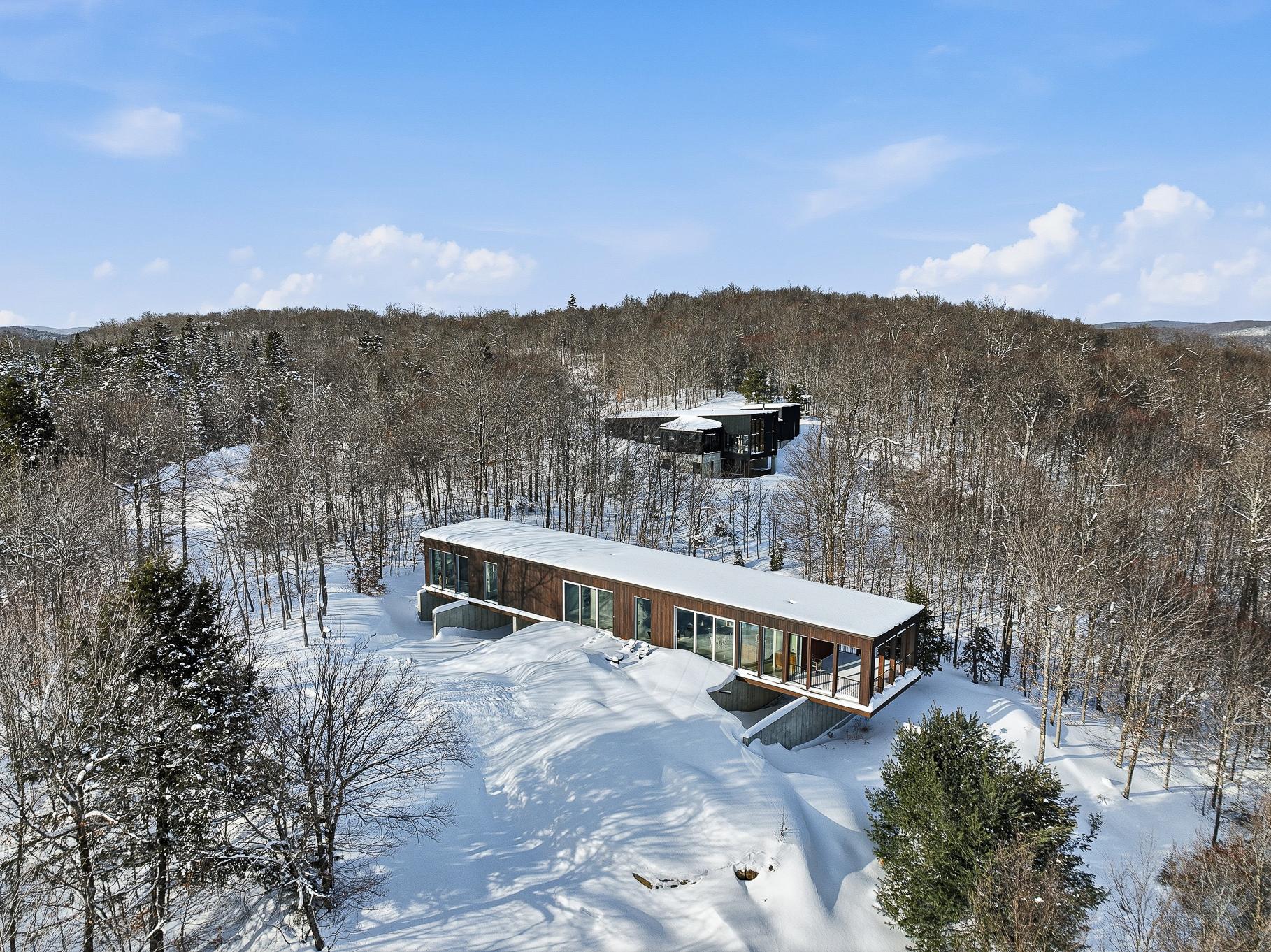 An exceptional architectural project designed by Alain Carle (Atelier Carle). Nestled on a rocky outcrop, this unique residence offers an unobstructed panoramic view of the surrounding landscape. Ideal as a second home, the property is available unfurnished, with the option to choose a fully furnished and equipped version. High-end appliances are included. Set on a lot of over 5 acres, the house offers direct access to hiking trails, Lake Notre-Dame, and the recreational boats of the estate.