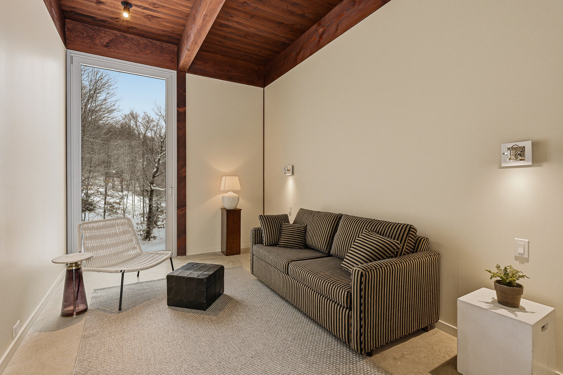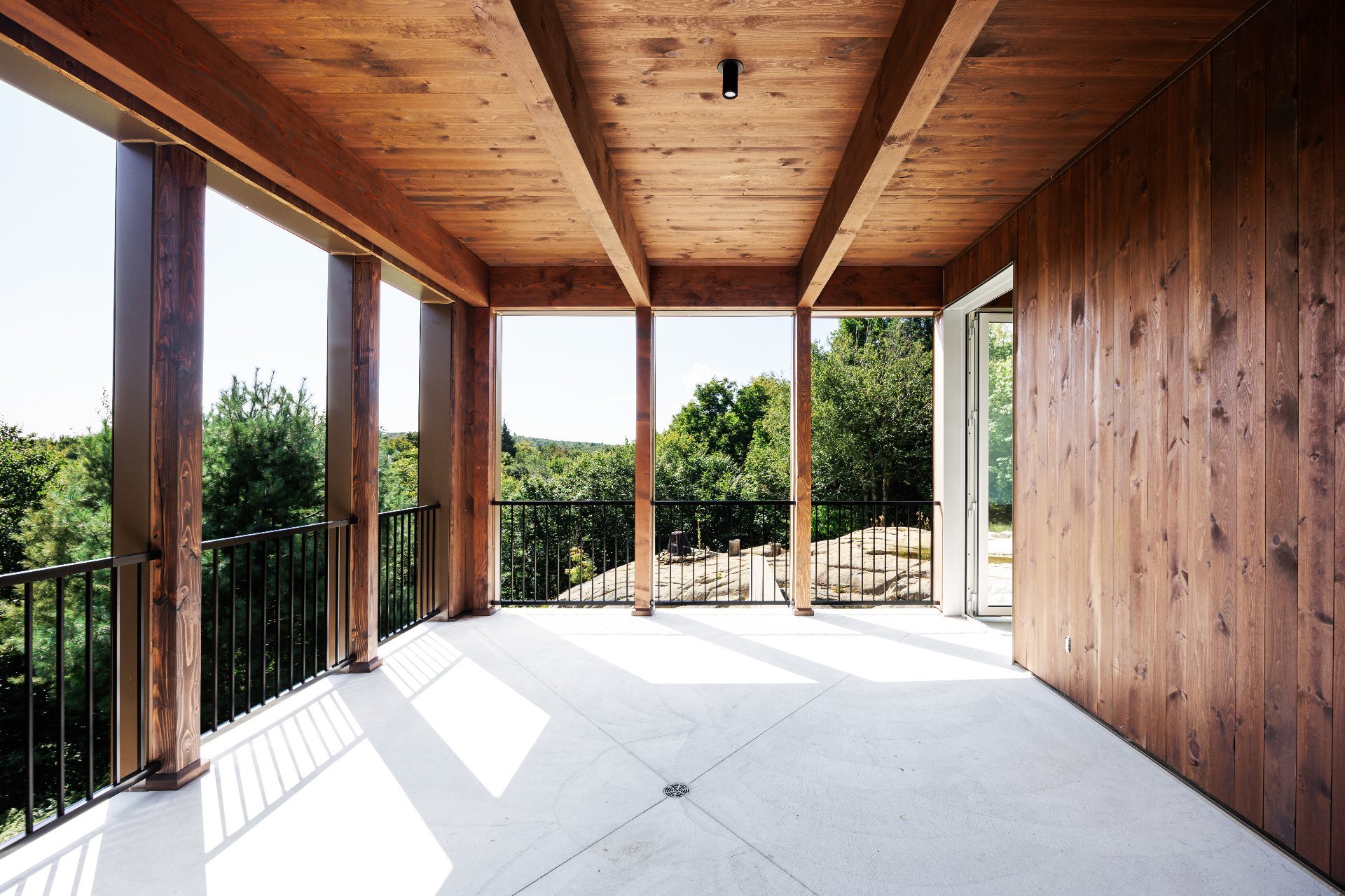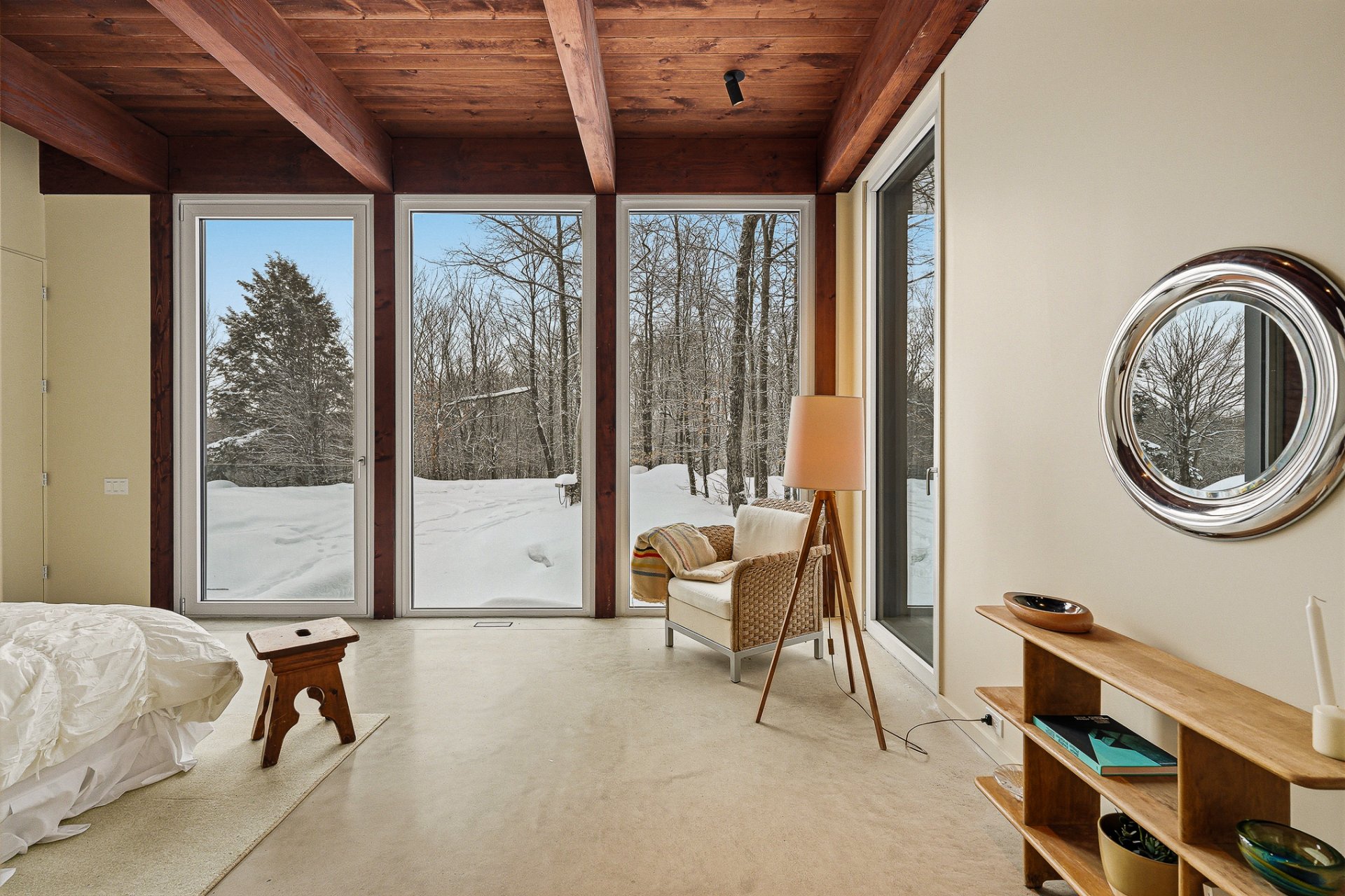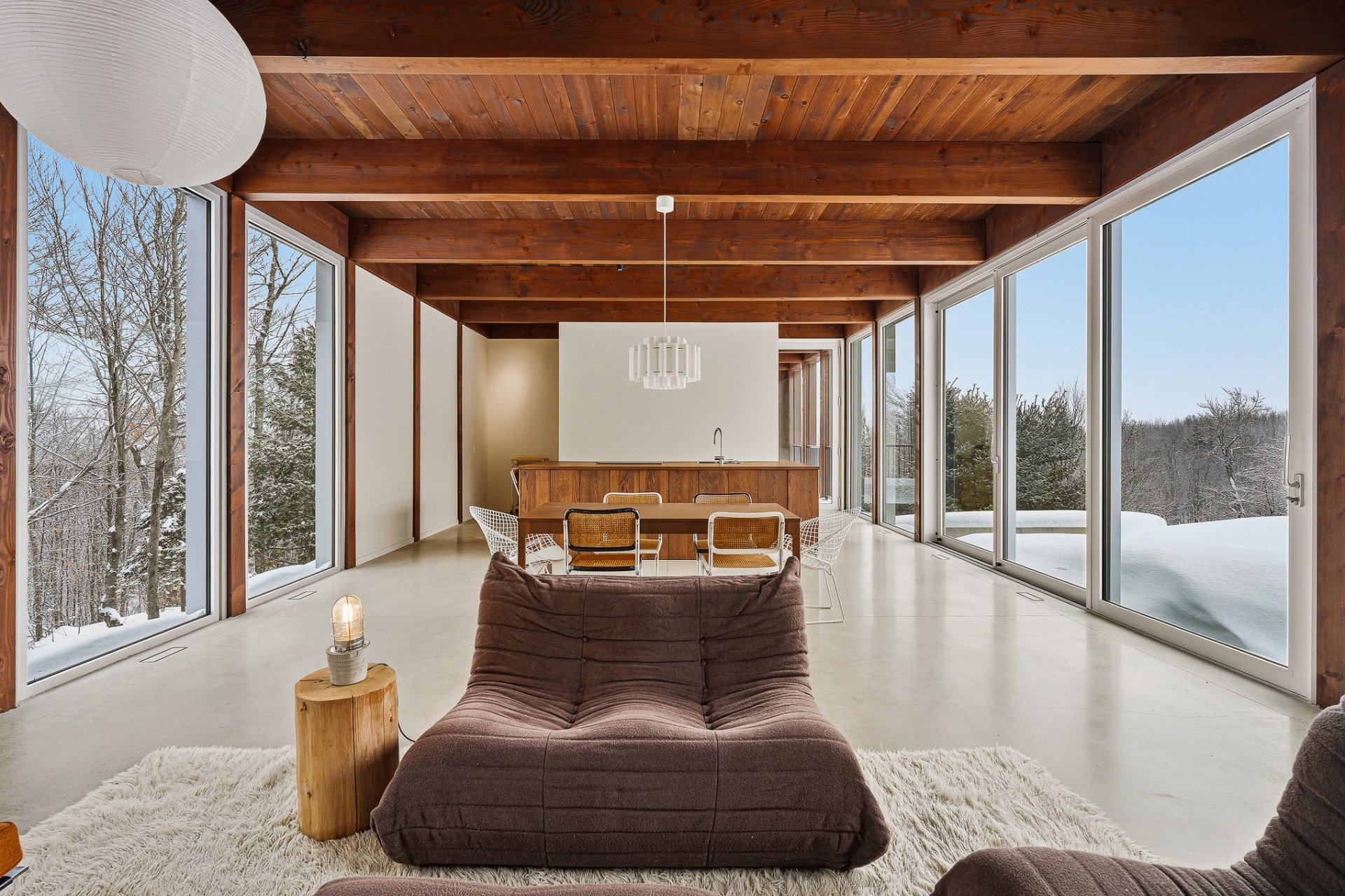 An exceptional architectural project designed by Alain Carle (Atelier Carle). Nestled on a rocky outcrop, this unique residence offers an unobstructed panoramic view of the surrounding landscape. Ideal as a second home, the property is available unfurnished, with the option to choose a fully furnished and equipped version. High-end appliances are included. Set on a lot of over 5 acres, the house offers direct access to hiking trails, Lake Notre-Dame, and the recreational boats of the estate.