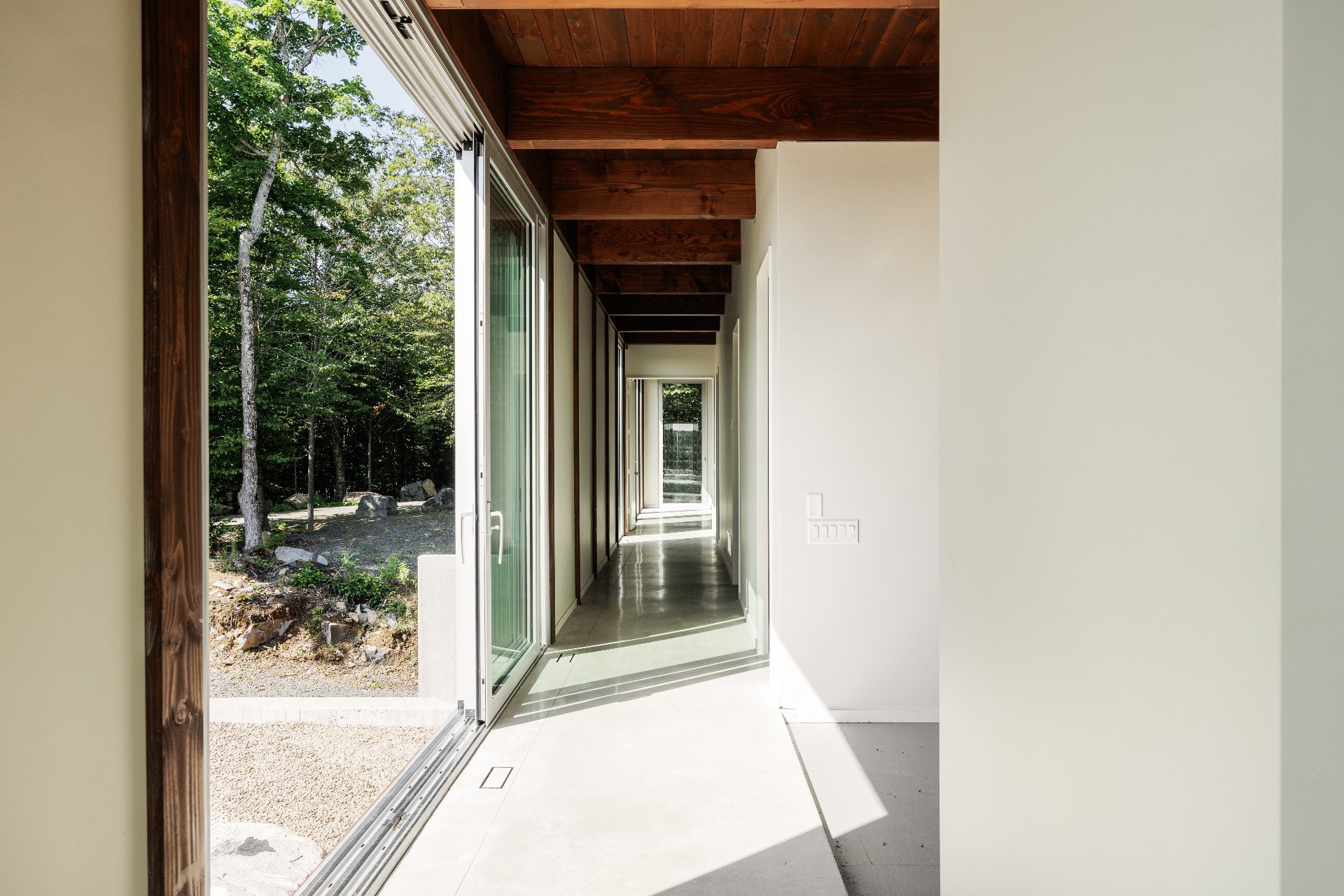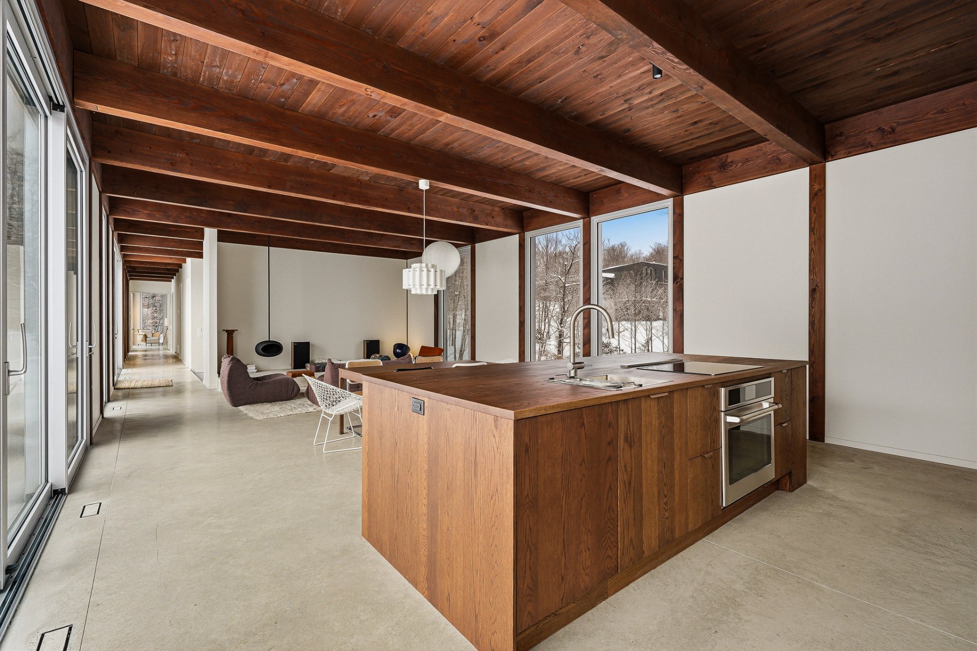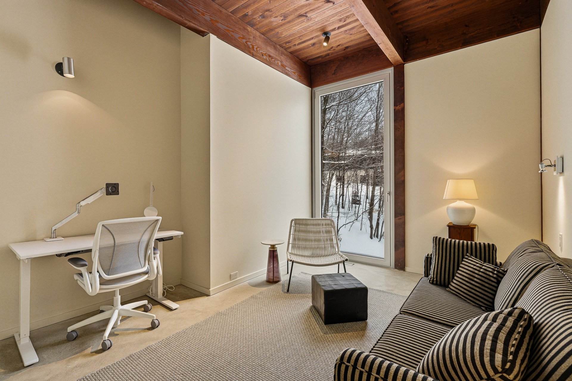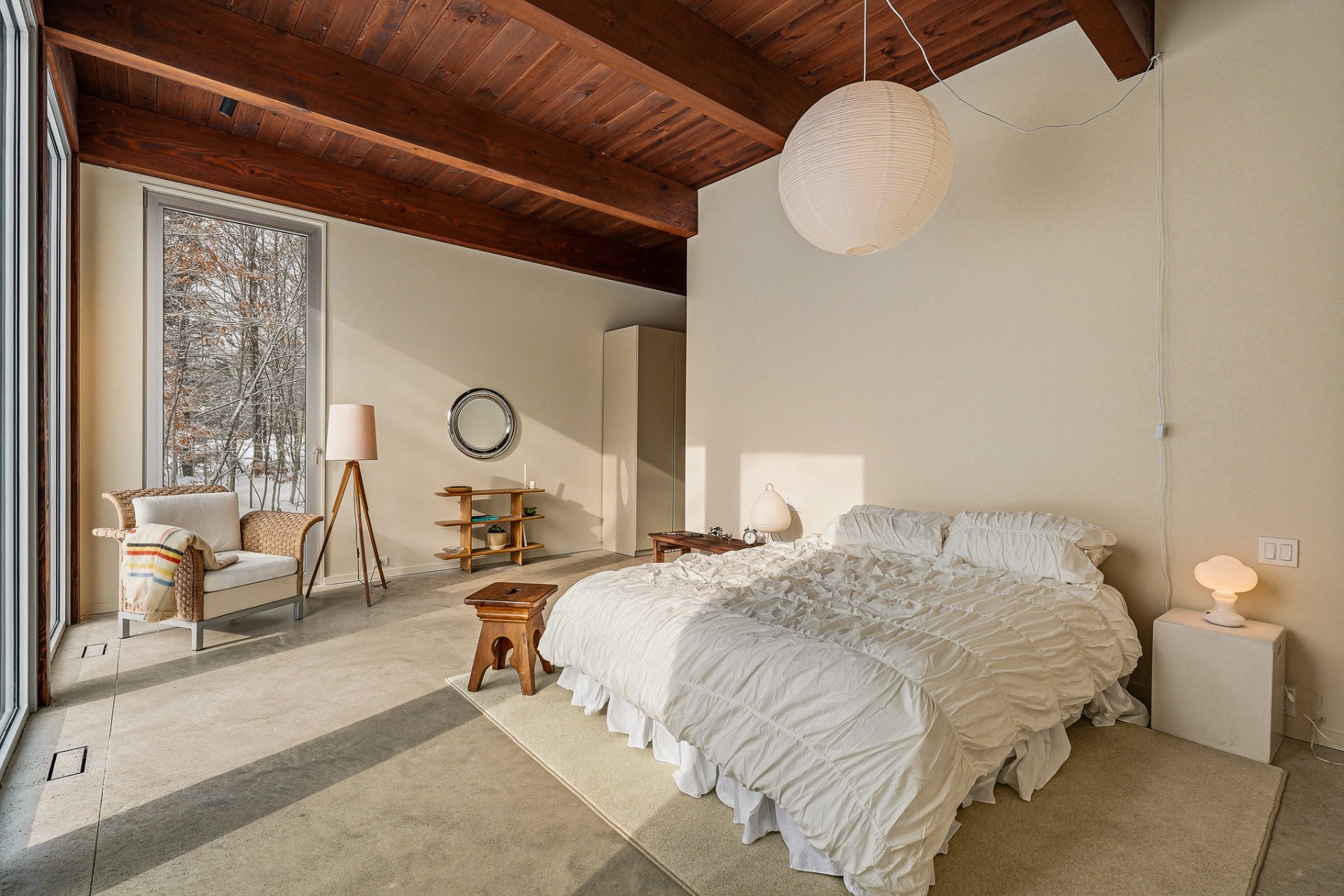 An exceptional architectural project designed by Alain Carle (Atelier Carle). Nestled on a rocky outcrop, this unique residence offers an unobstructed panoramic view of the surrounding landscape. Ideal as a second home, the property is available unfurnished, with the option to choose a fully furnished and equipped version. High-end appliances are included. Set on a lot of over 5 acres, the house offers direct access to hiking trails, Lake Notre-Dame, and the recreational boats of the estate.