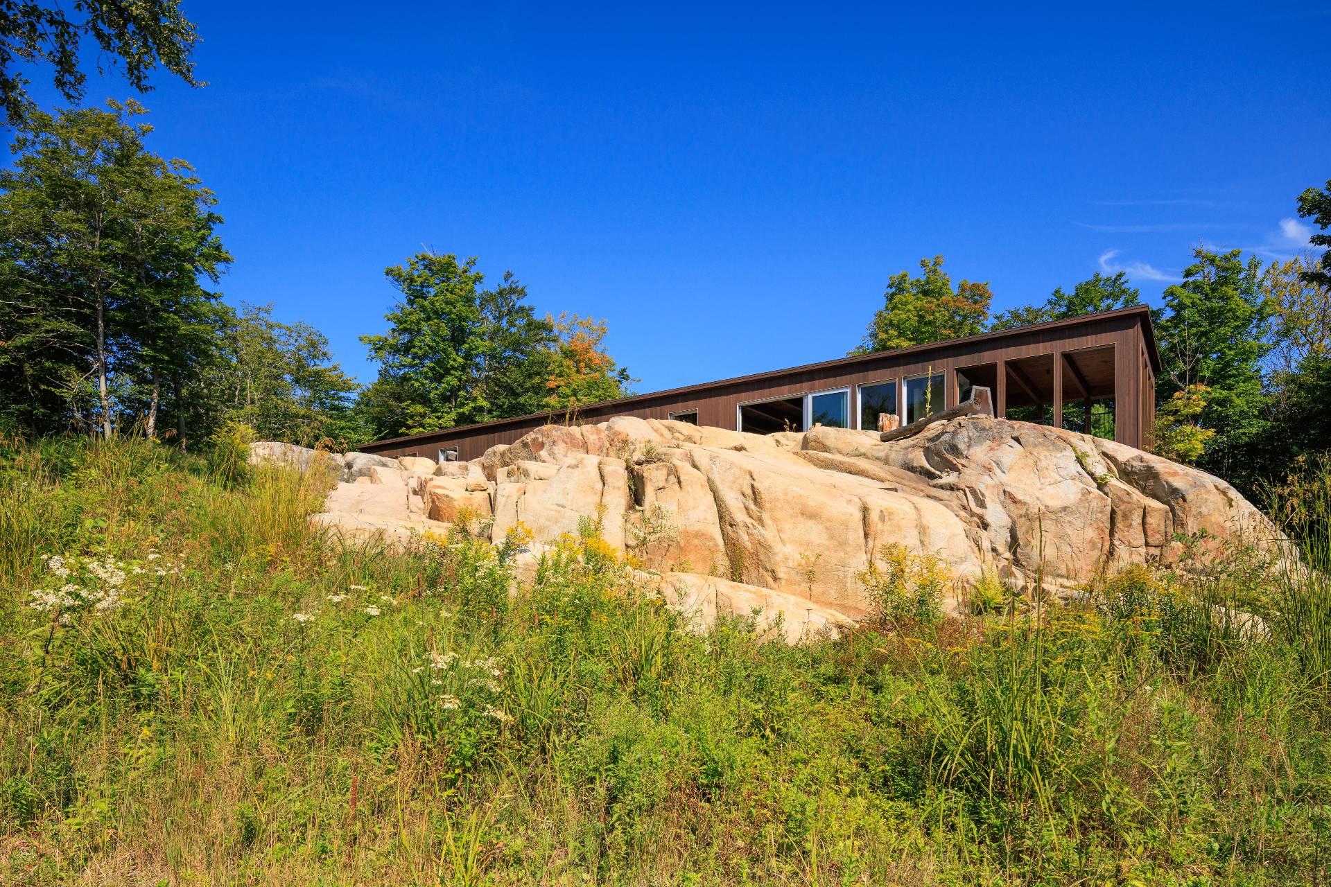An exceptional architectural project designed by Alain Carle (Atelier Carle). Nestled on a rocky outcrop, this unique residence offers an unobstructed panoramic view of the surrounding landscape.
