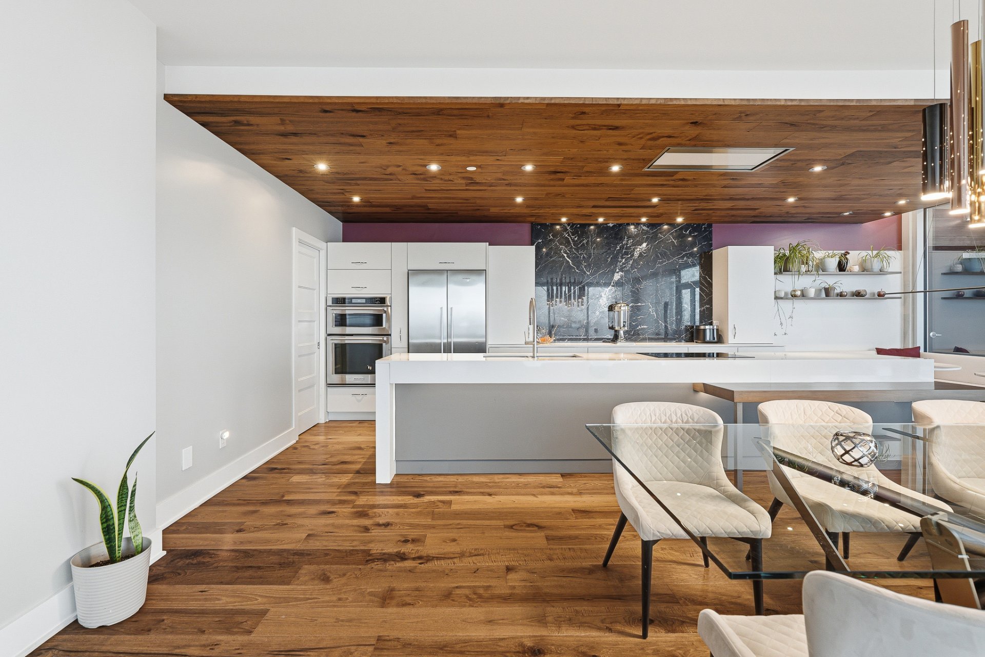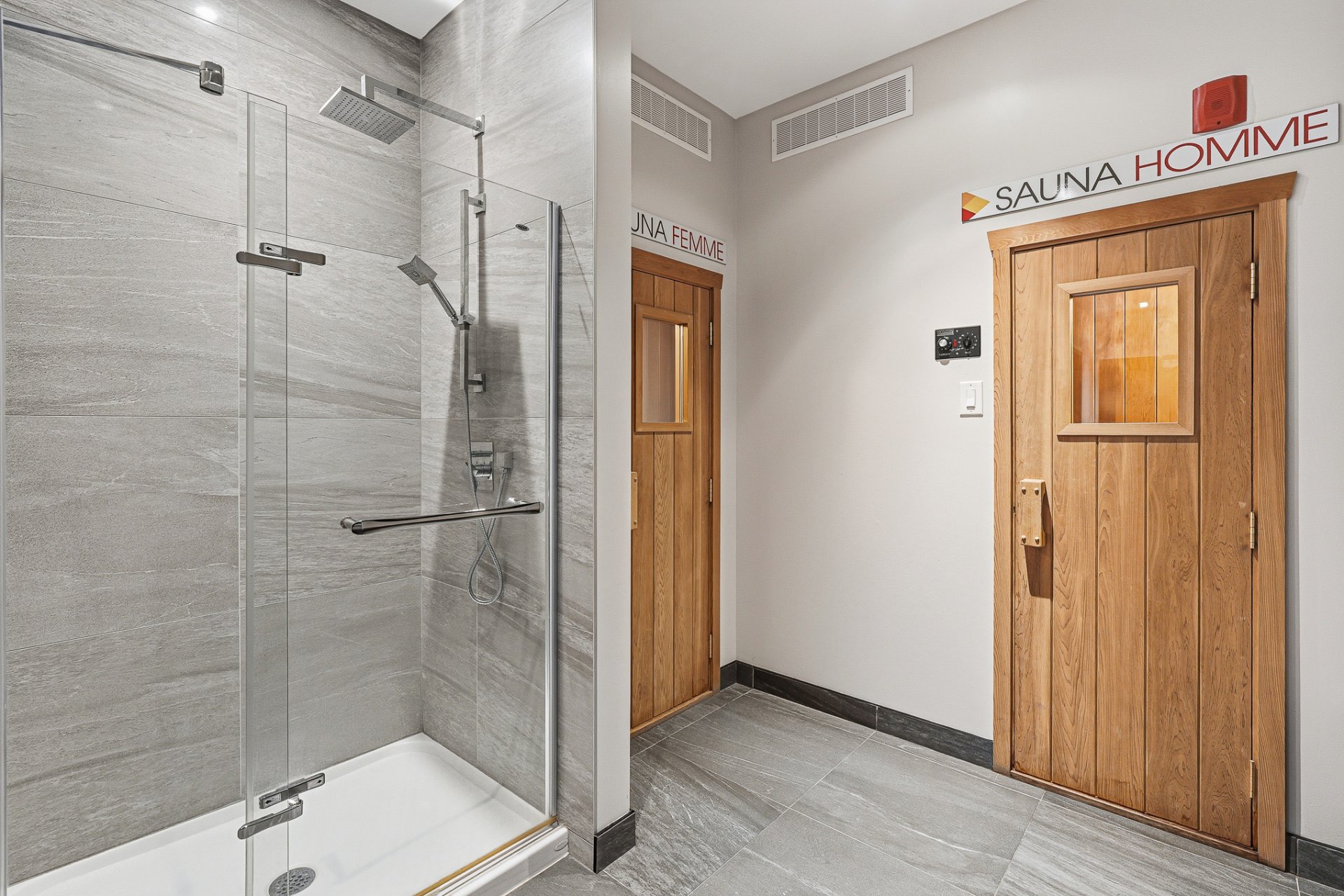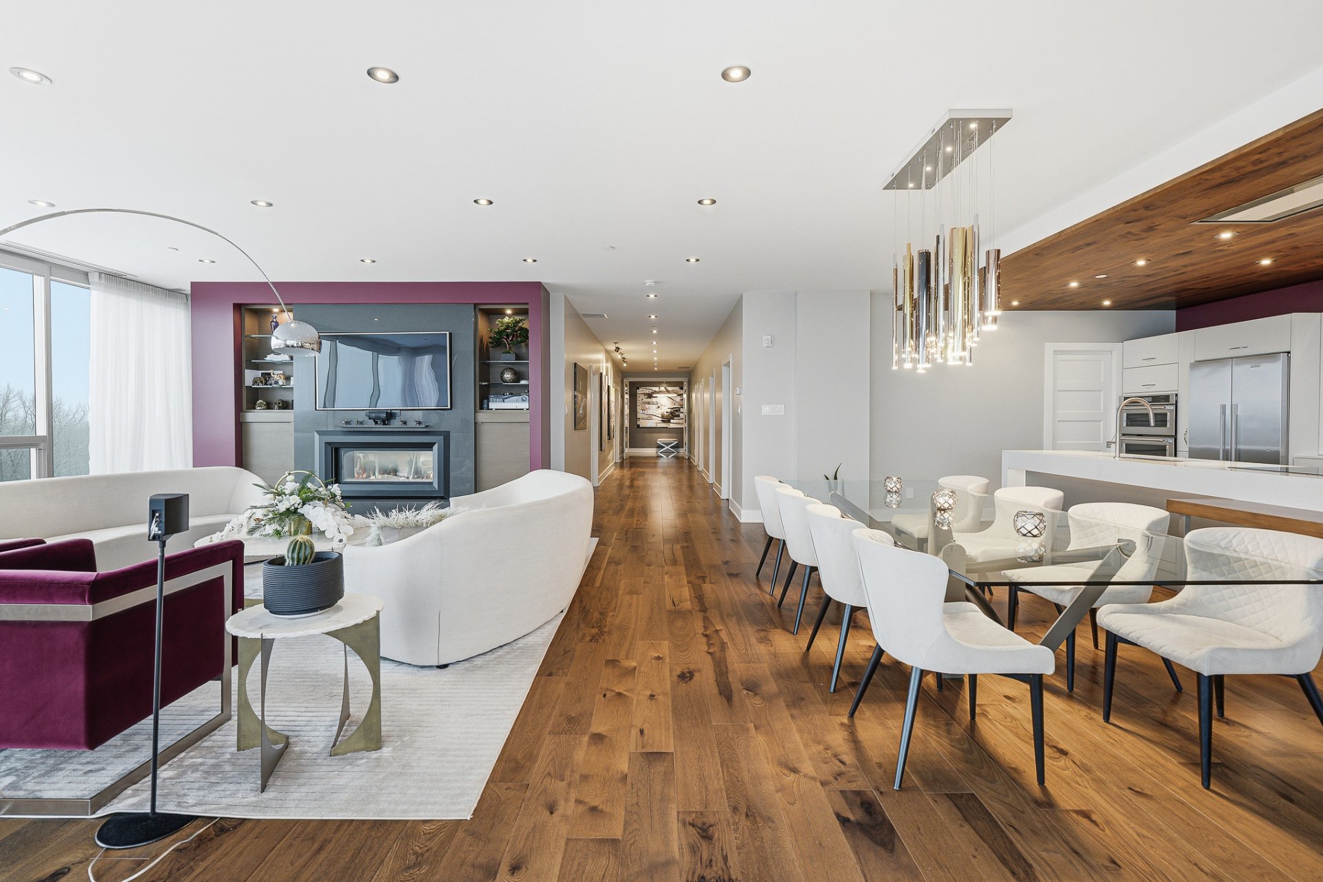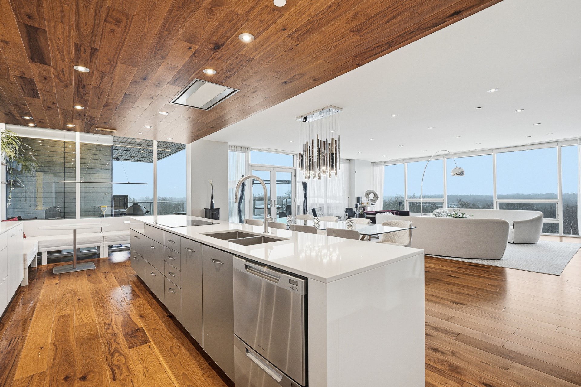 With over 2,700 sq. ft. of living space, the unit features a large entrance hall leading to an open-concept living area where floor-to-ceiling windows provide unobstructed views all the way to Montréal. Natural light floods the space thanks to the unit's southeast orientation, positioned just above the treetops.