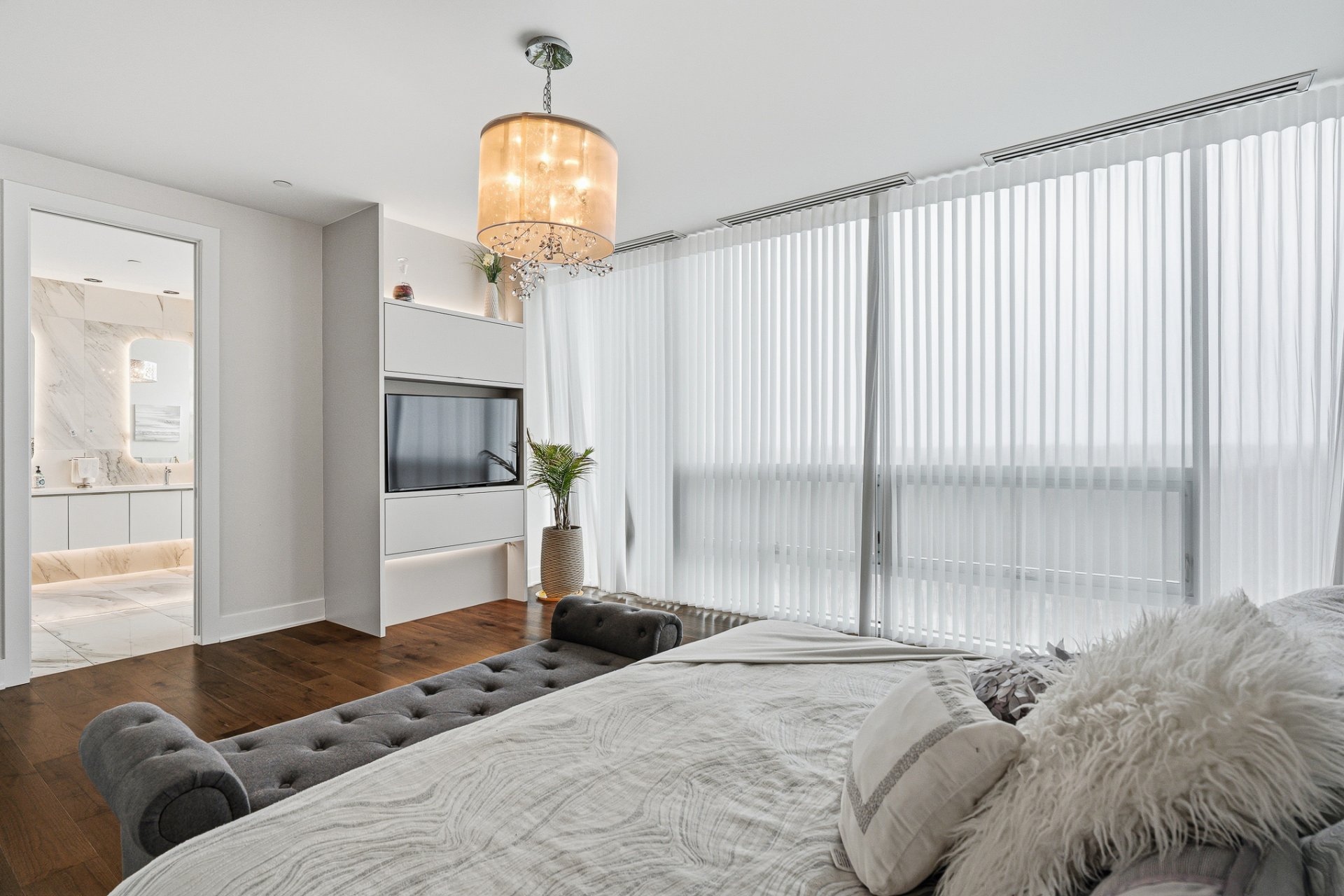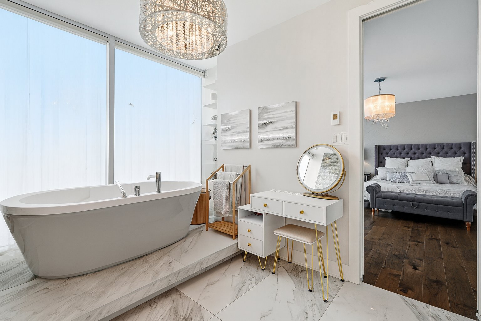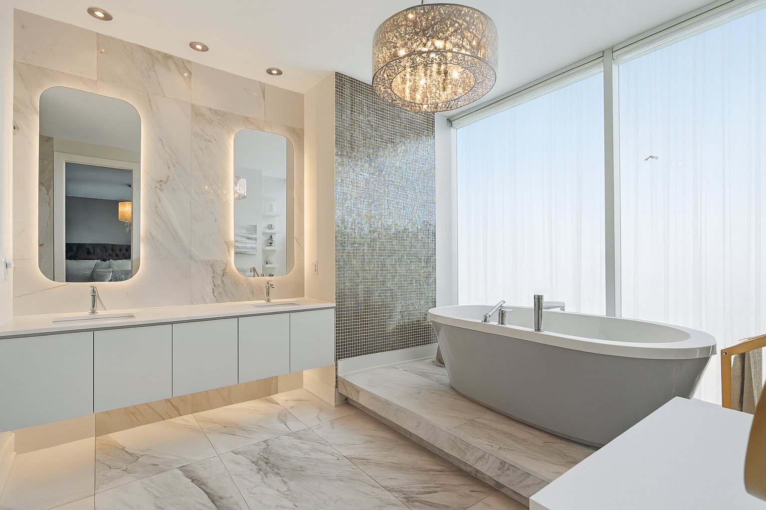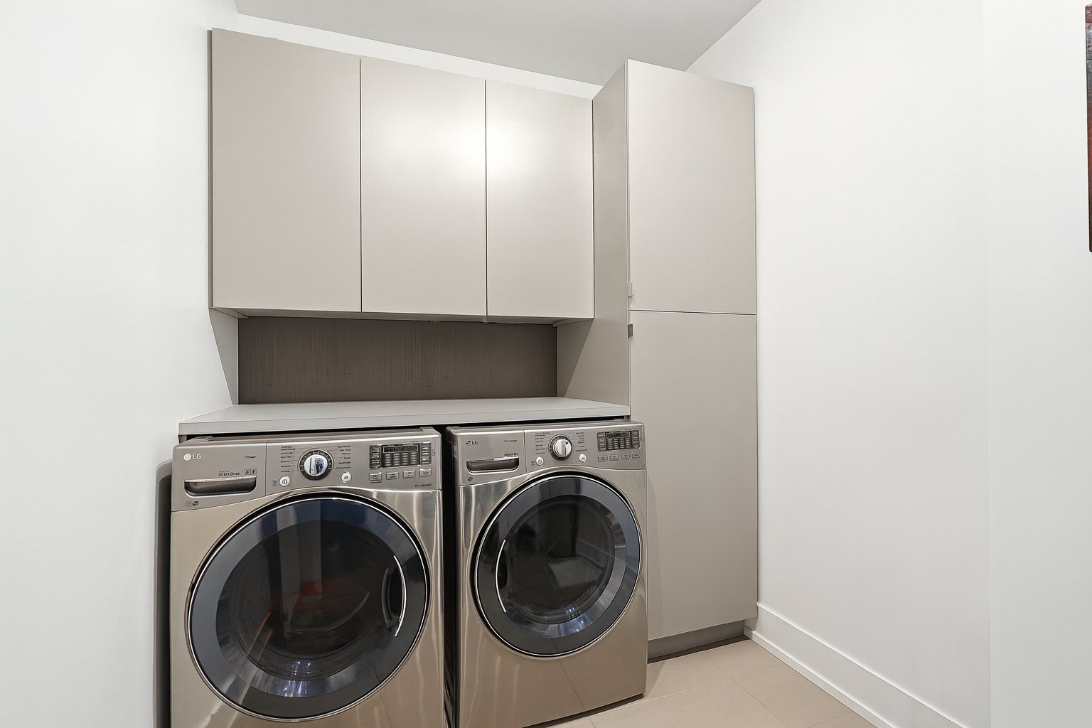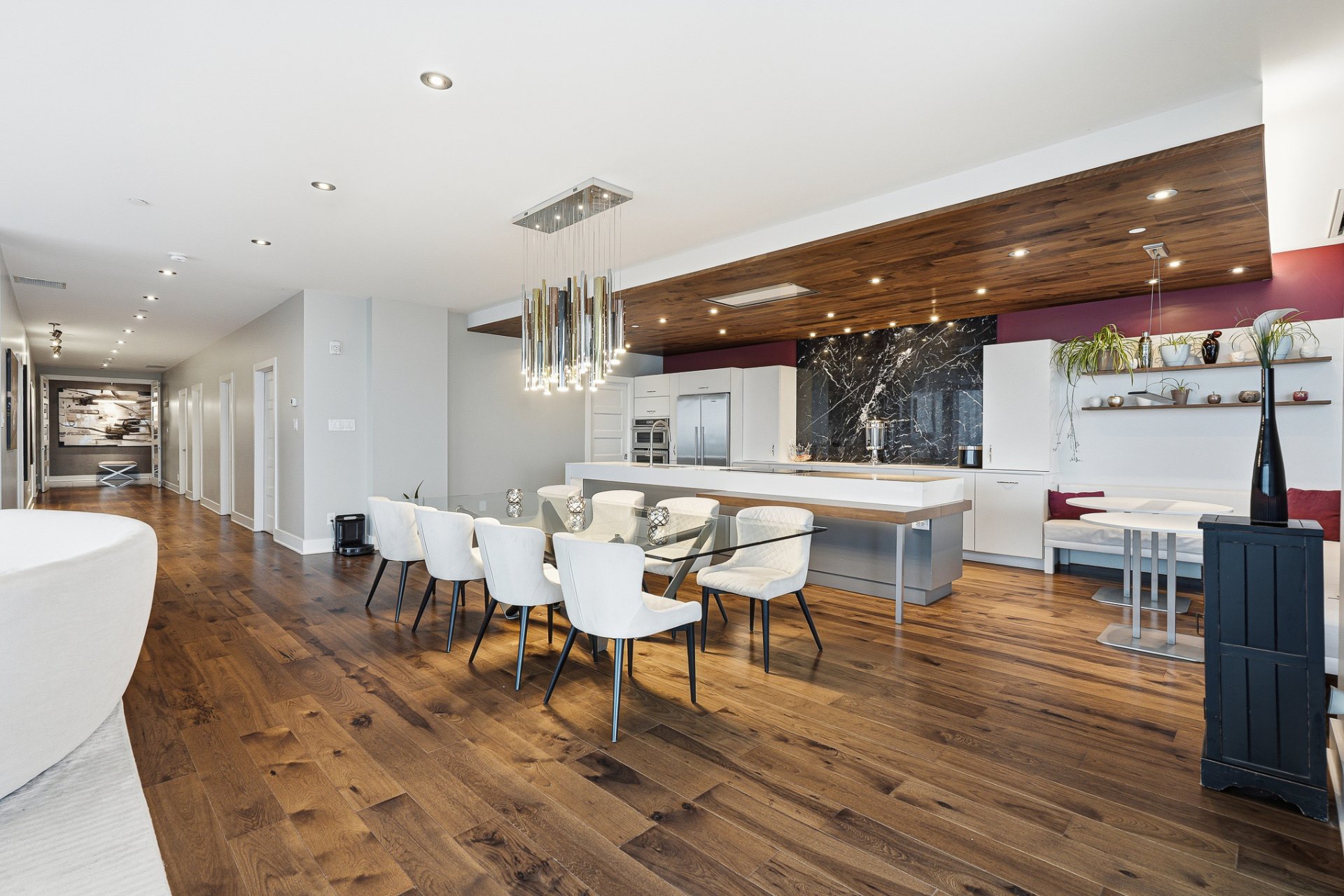 With over 2,700 sq. ft. of living space, the unit features a large entrance hall leading to an open-concept living area where floor-to-ceiling windows provide unobstructed views all the way to Montréal. Natural light floods the space thanks to the unit's southeast orientation, positioned just above the treetops.