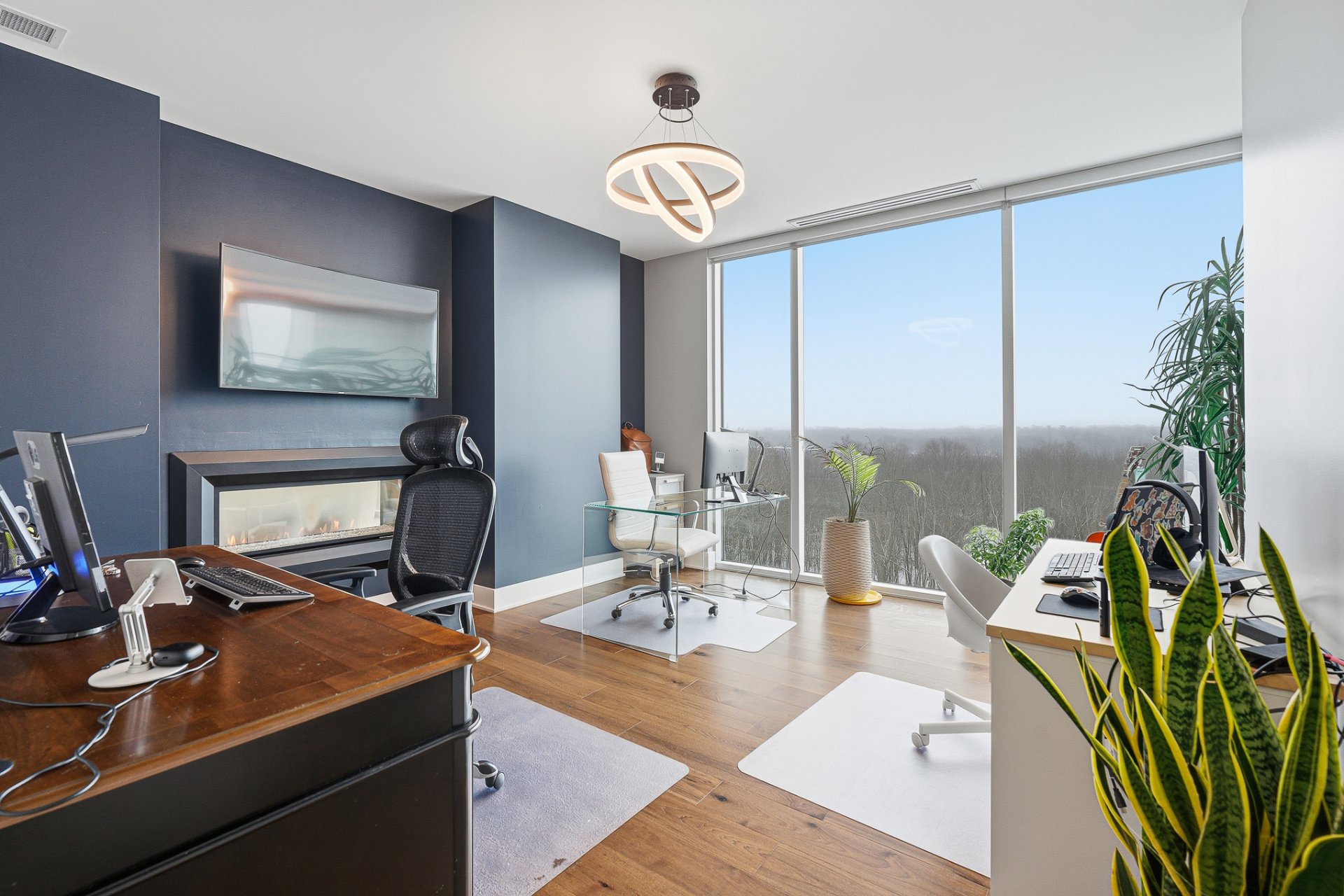 The primary suite offers a full glass façade overlooking the forest, a walk-in closet, and an ensuite bathroom with heated floors, separate shower, double vanity, and a feature soaking tub. The unit also includes two additional bedrooms, a second full bathroom, a closed office, and an independent laundry room.