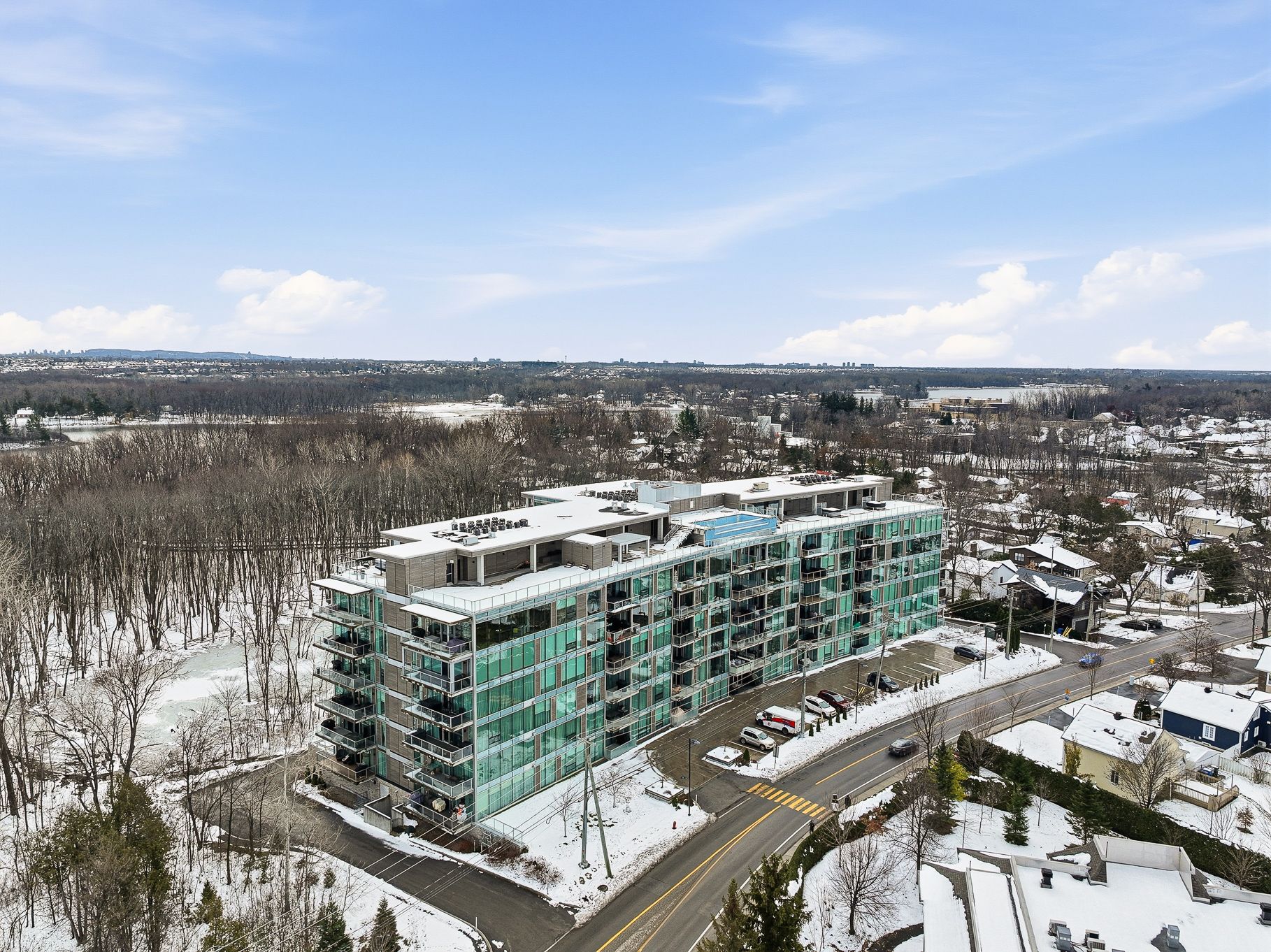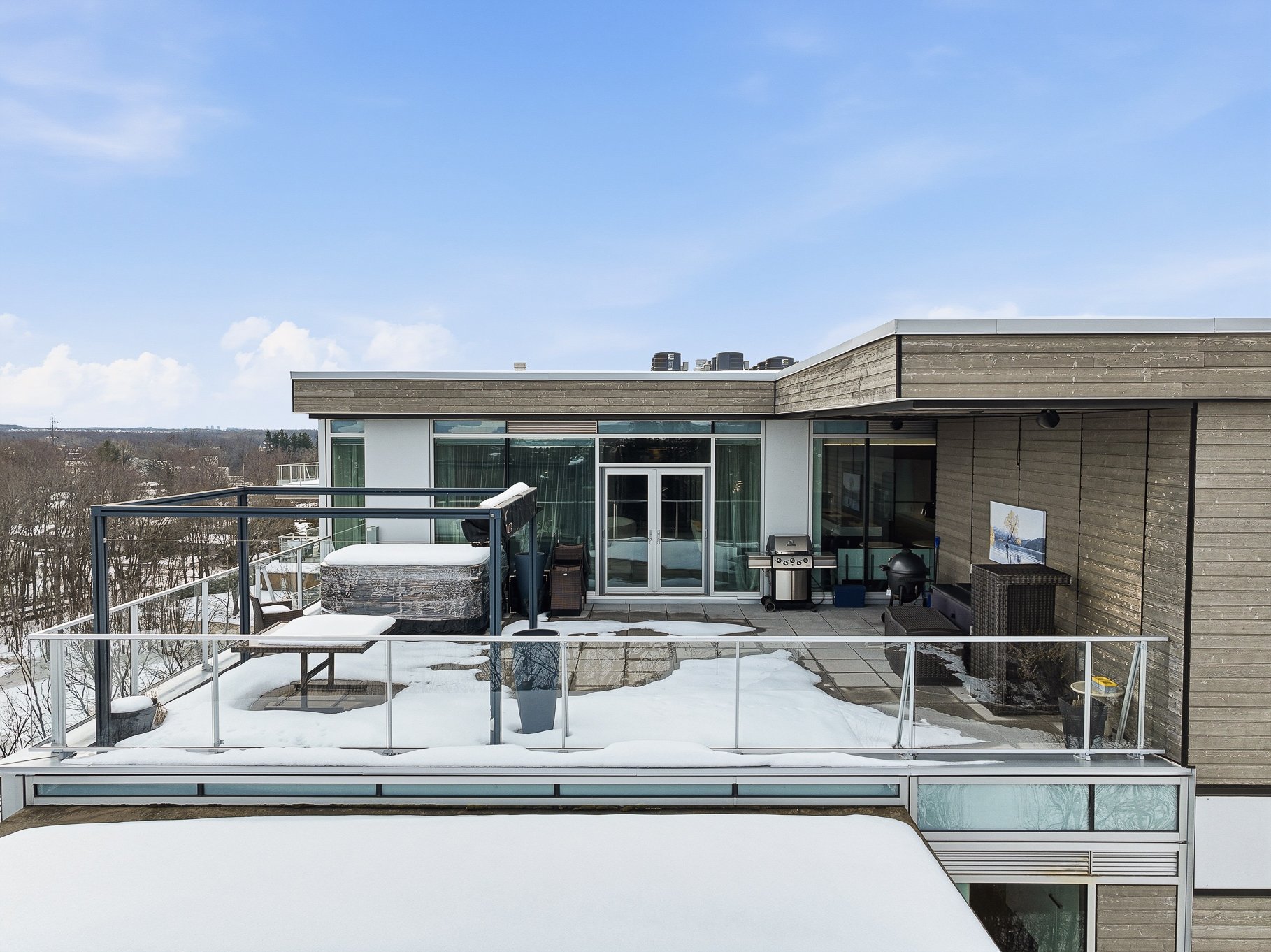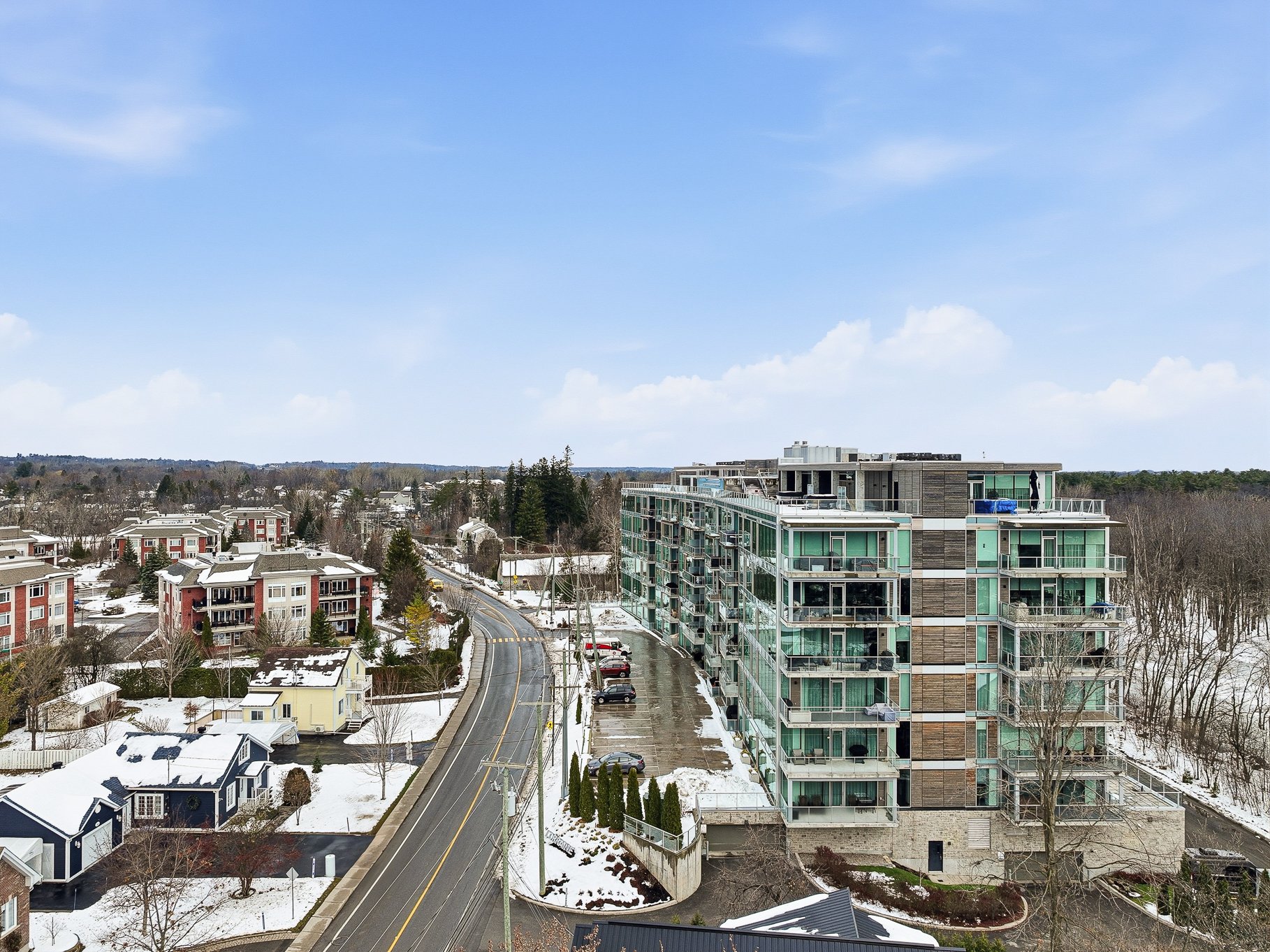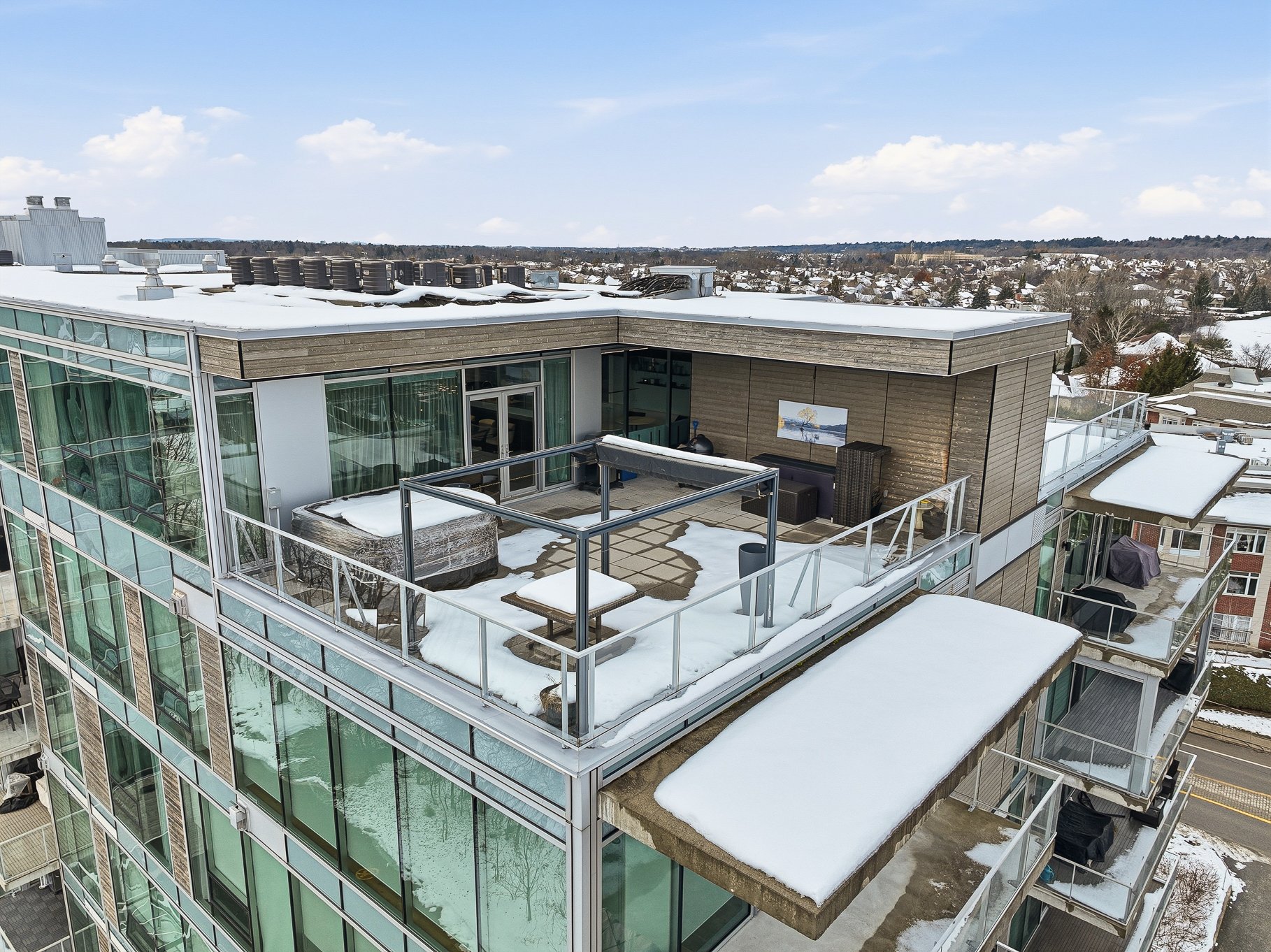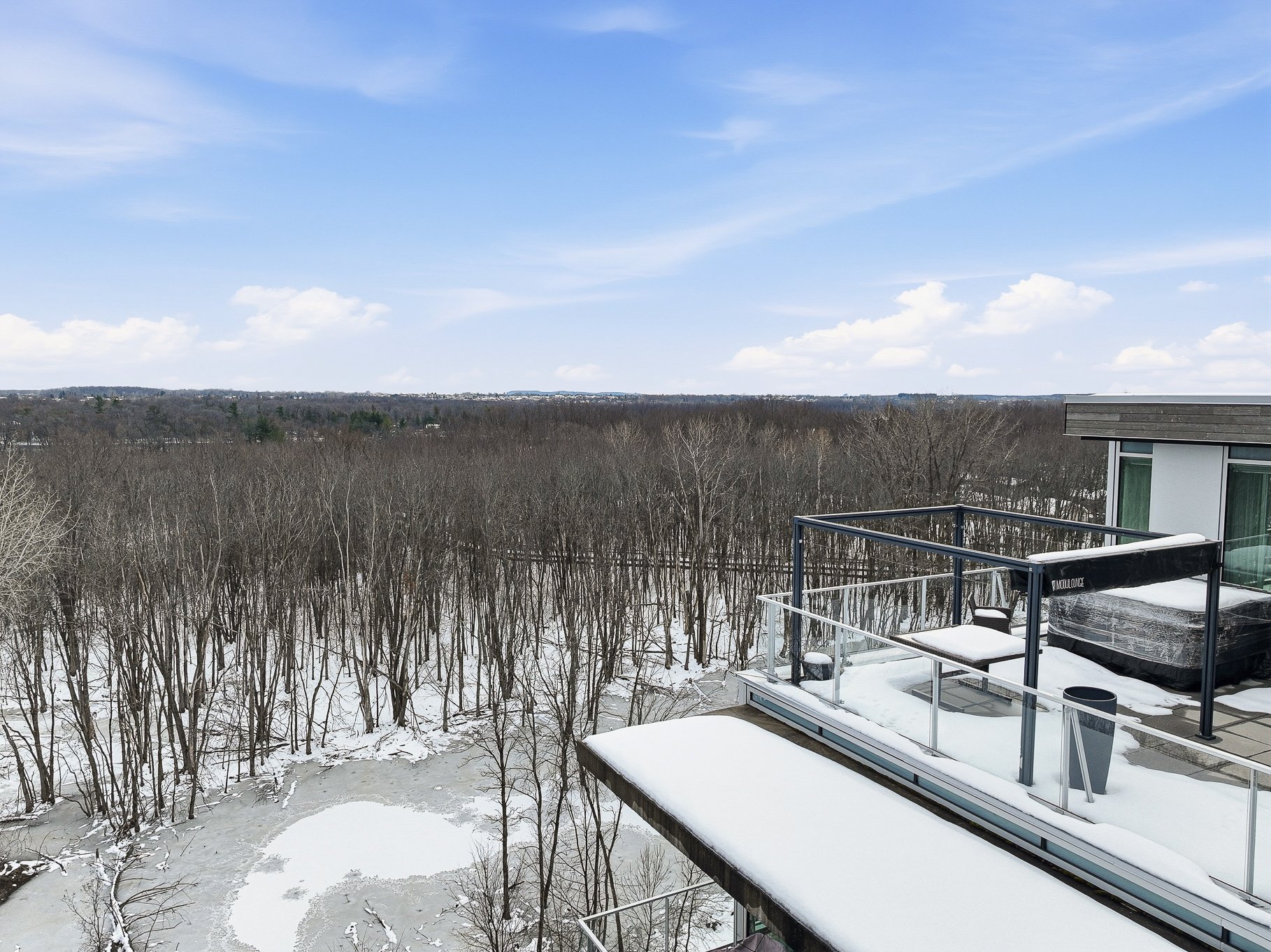 Located in the prestigious M Lorraine project, this penthouse of over 2 700 sq. ft. offers a grand entrance hall, an open-concept living area flooded with natural light, and unobstructed views reaching all the way to Montréal. Featuring a double-sided gas fireplace, a kitchen with a large island and back kitchen, and a primary suite with walk-in closet and ensuite bathroom. Two additional bedrooms, office space, and a laundry room complete the layout. A private 780 sq. ft. terrace with spa elevates the outdoor experience. Full common amenities and 4 indoor garages and 2 lockers. Close to services, the golf course, and major road access.