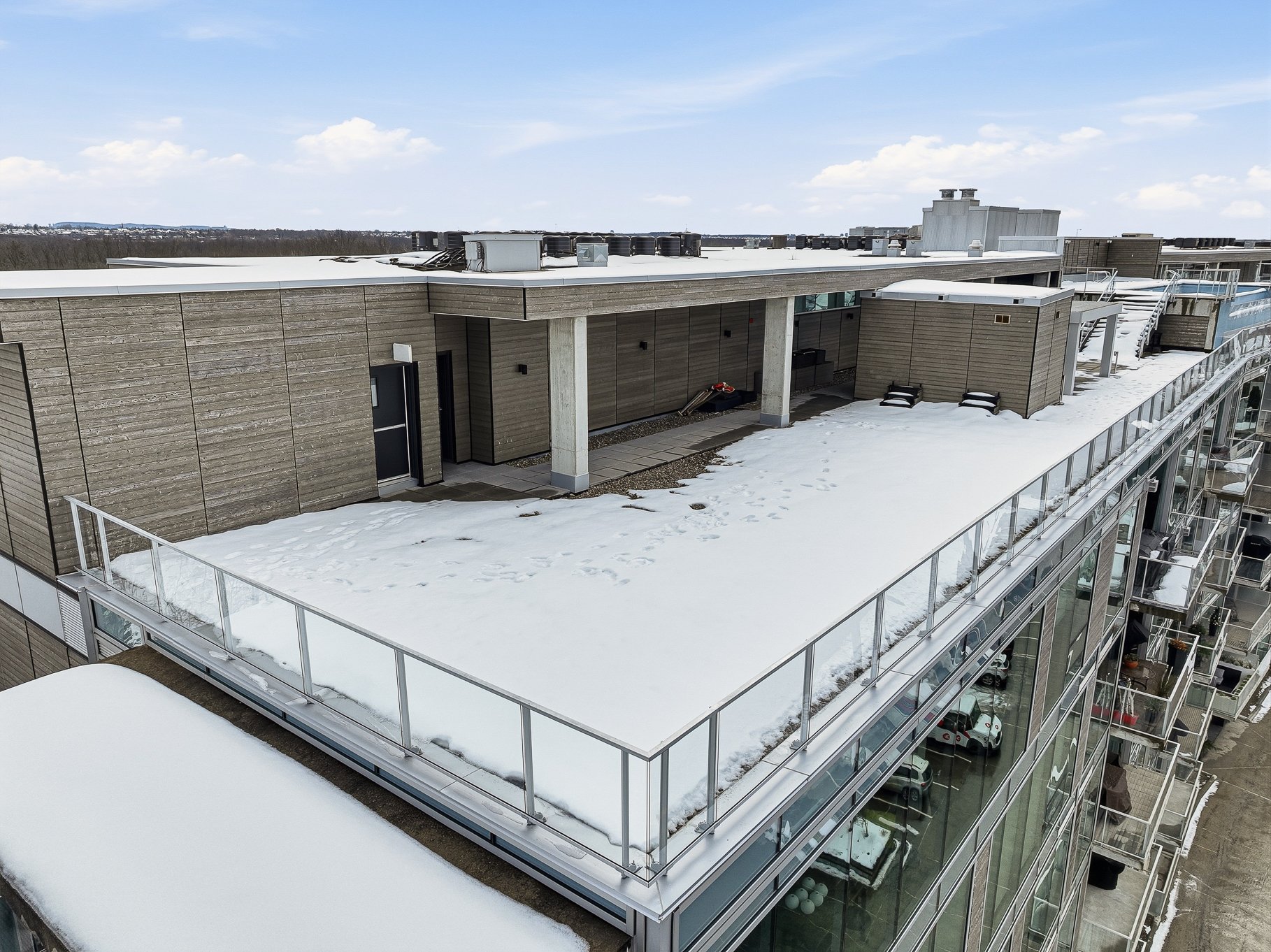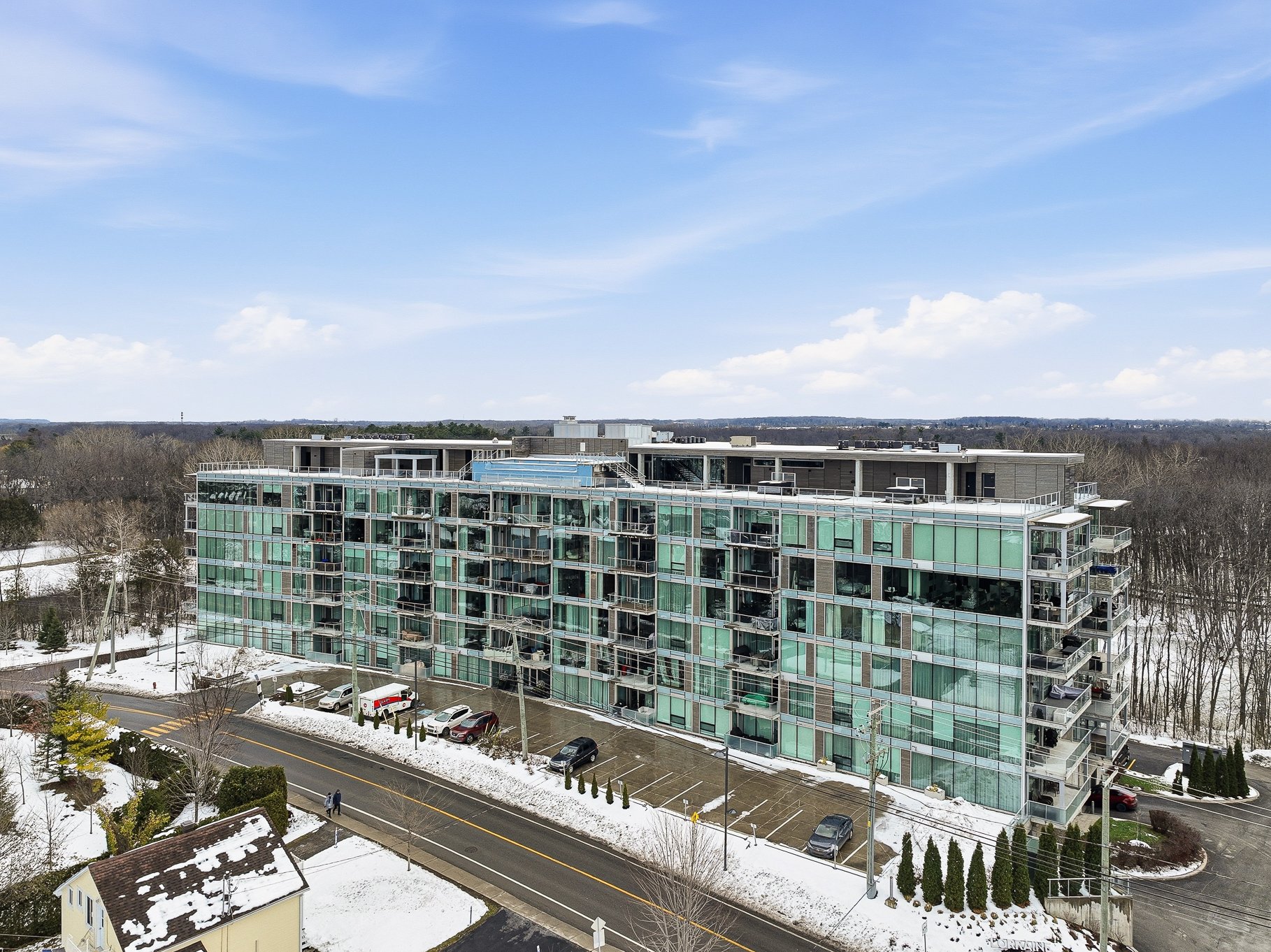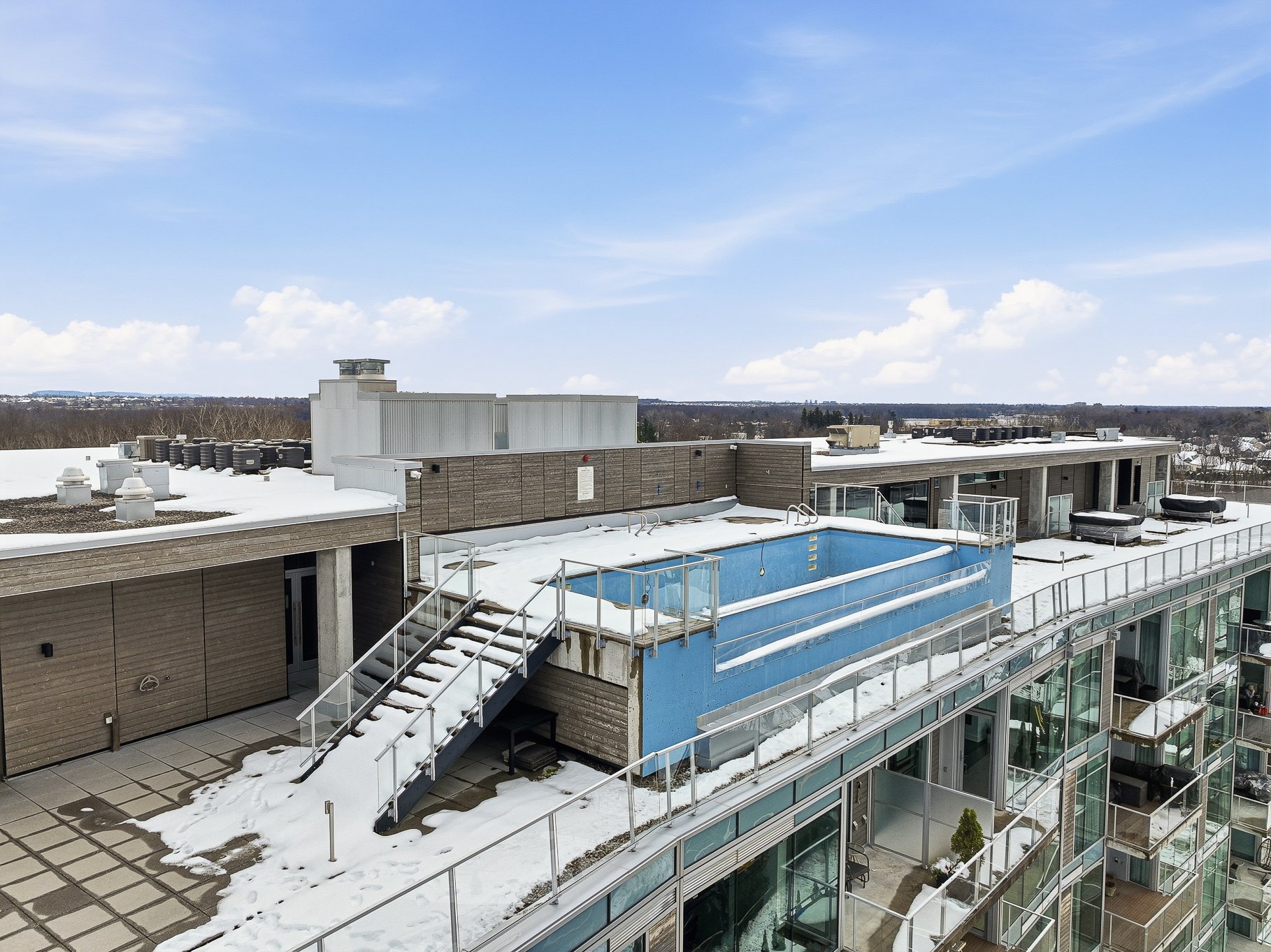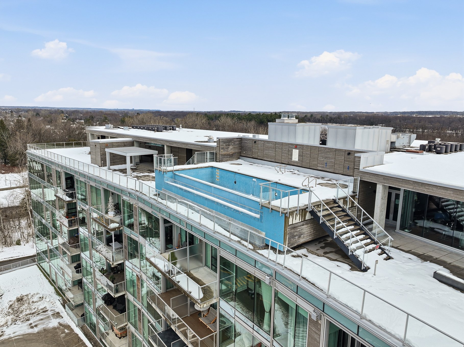 Located in the prestigious M Lorraine project, this penthouse of over 2 700 sq. ft. offers a grand entrance hall, an open-concept living area flooded with natural light, and unobstructed views reaching all the way to Montréal. Featuring a double-sided gas fireplace, a kitchen with a large island and back kitchen, and a primary suite with walk-in closet and ensuite bathroom. Two additional bedrooms, office space, and a laundry room complete the layout. A private 780 sq. ft. terrace with spa elevates the outdoor experience. Full common amenities and 4 indoor garages and 2 lockers. Close to services, the golf course, and major road access.