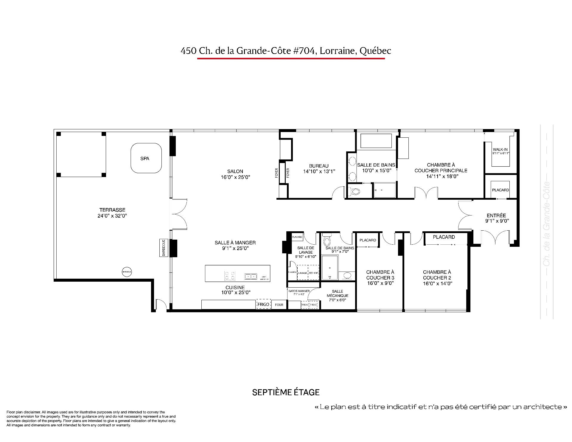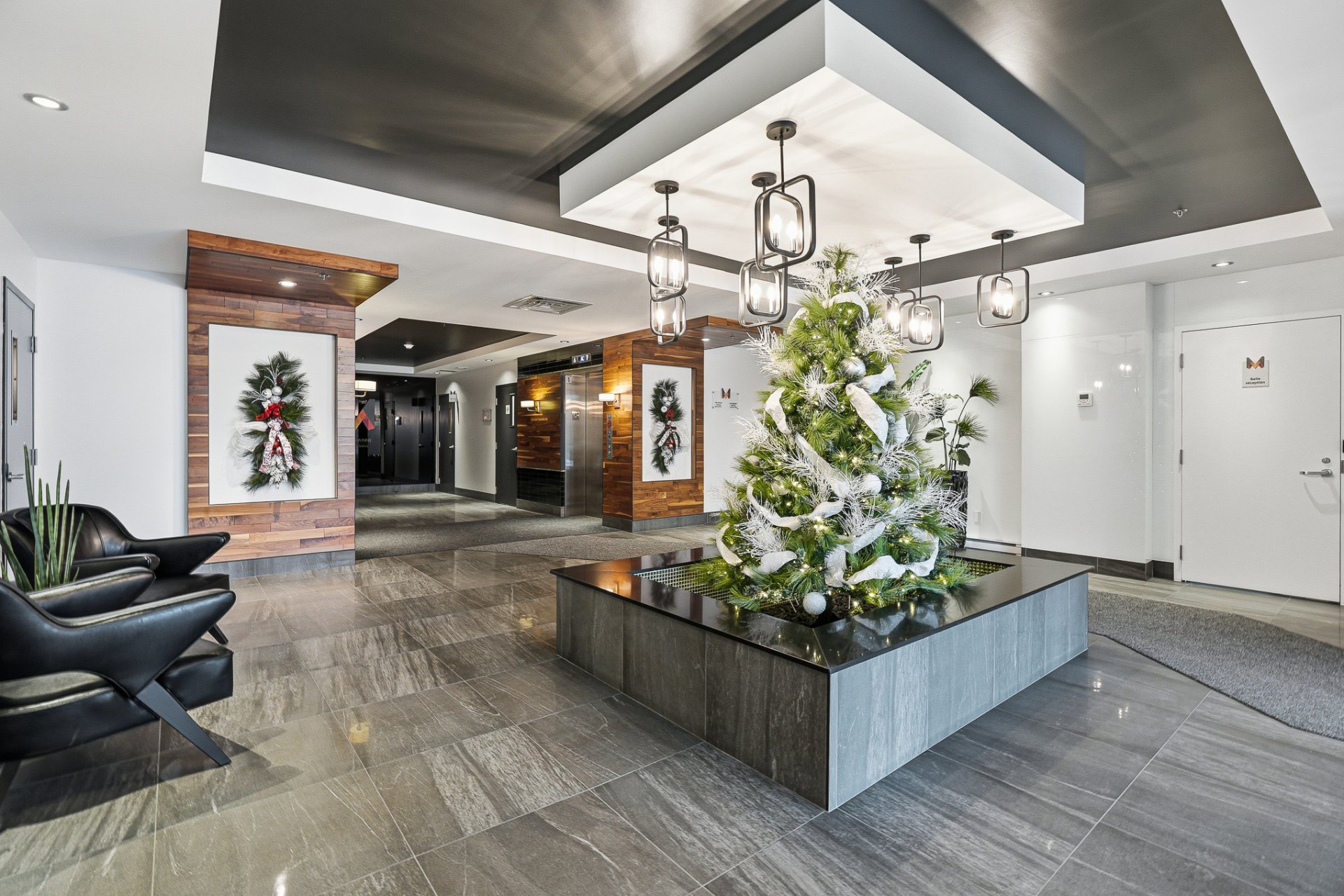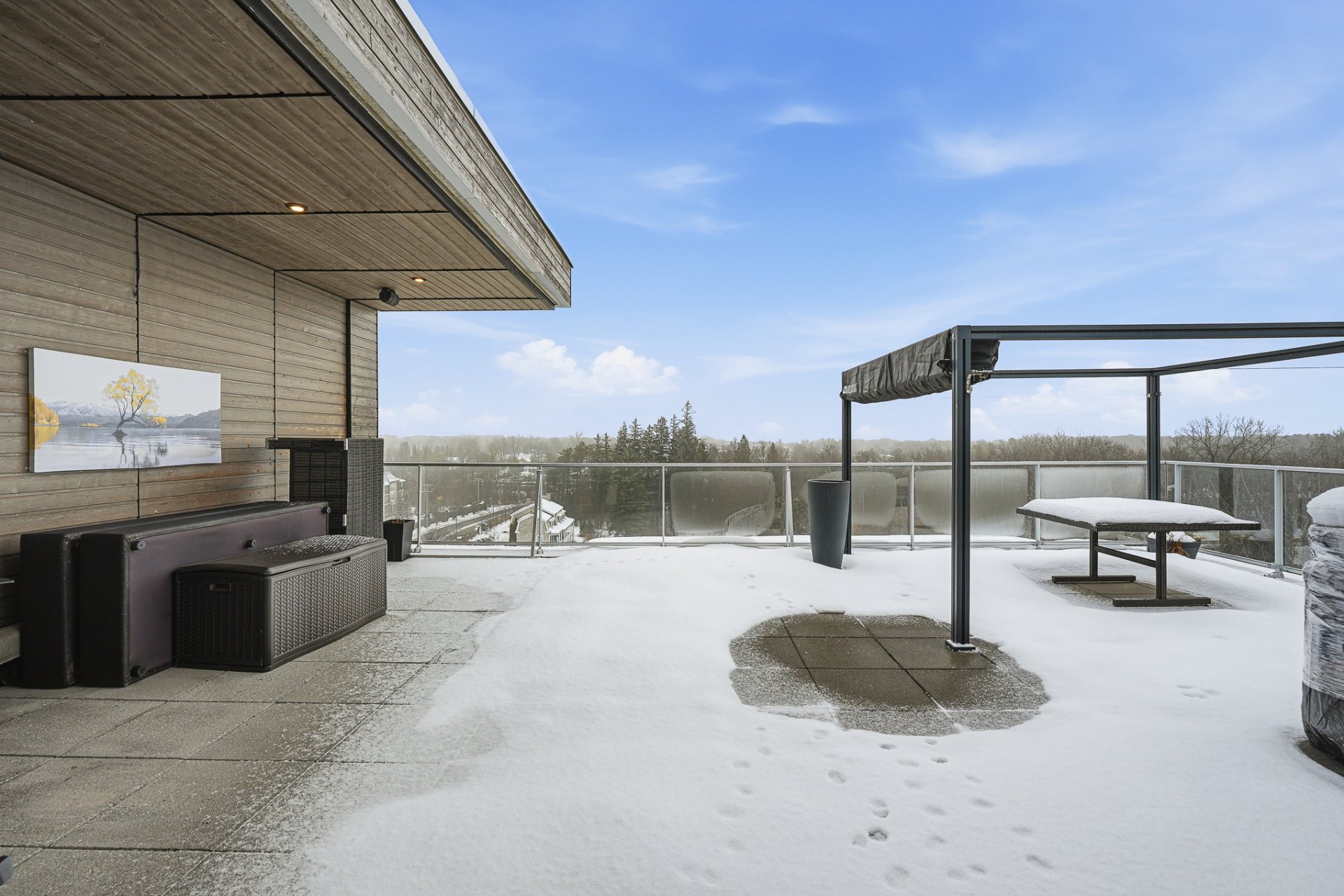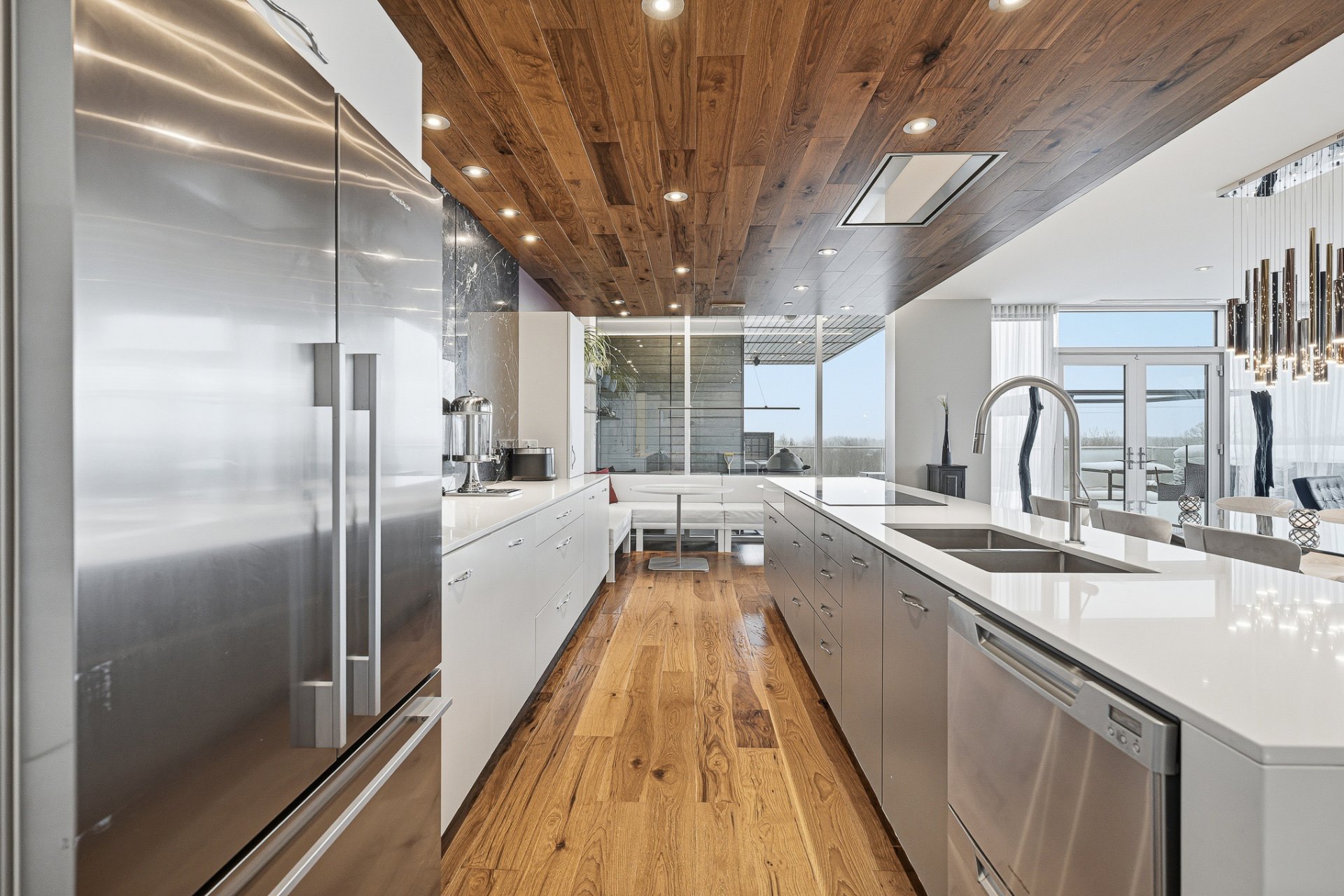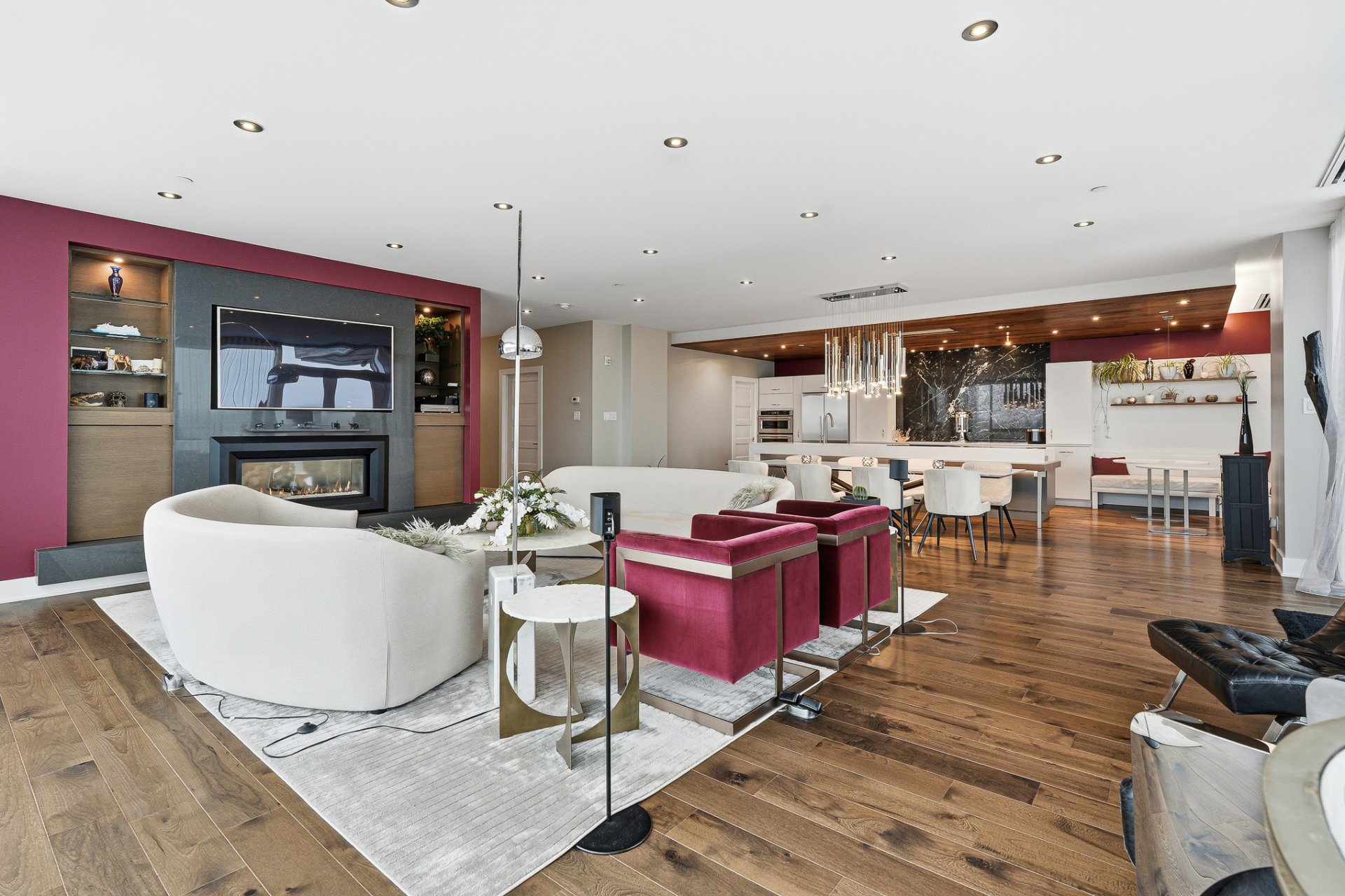 Located in the prestigious M Lorraine project, this penthouse of over 2 700 sq. ft. offers a grand entrance hall, an open-concept living area flooded with natural light, and unobstructed views reaching all the way to Montréal. Featuring a double-sided gas fireplace, a kitchen with a large island and back kitchen, and a primary suite with walk-in closet and ensuite bathroom. Two additional bedrooms, office space, and a laundry room complete the layout. A private 780 sq. ft. terrace with spa elevates the outdoor experience. Full common amenities and 4 indoor garages and 2 lockers. Close to services, the golf course, and major road access.