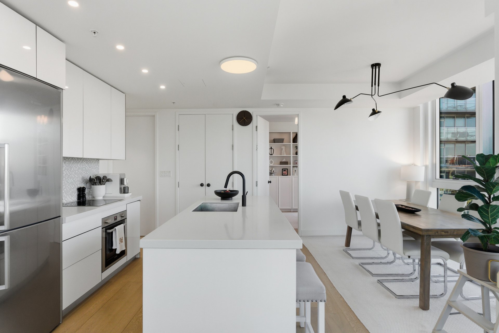 - Partially furnished, including refrigerator, stove, built-in oven, washer and dryer, all Bosch brand, all smart electric blinds. Queen bed and mattress. Shelves in the entryway and office. Glass dining table currently used as a desk. Two stools at the island. Pendant lights in the living room and dining room. Storage drawers in the bathroom. Central heating, central air conditioning, and hot water.