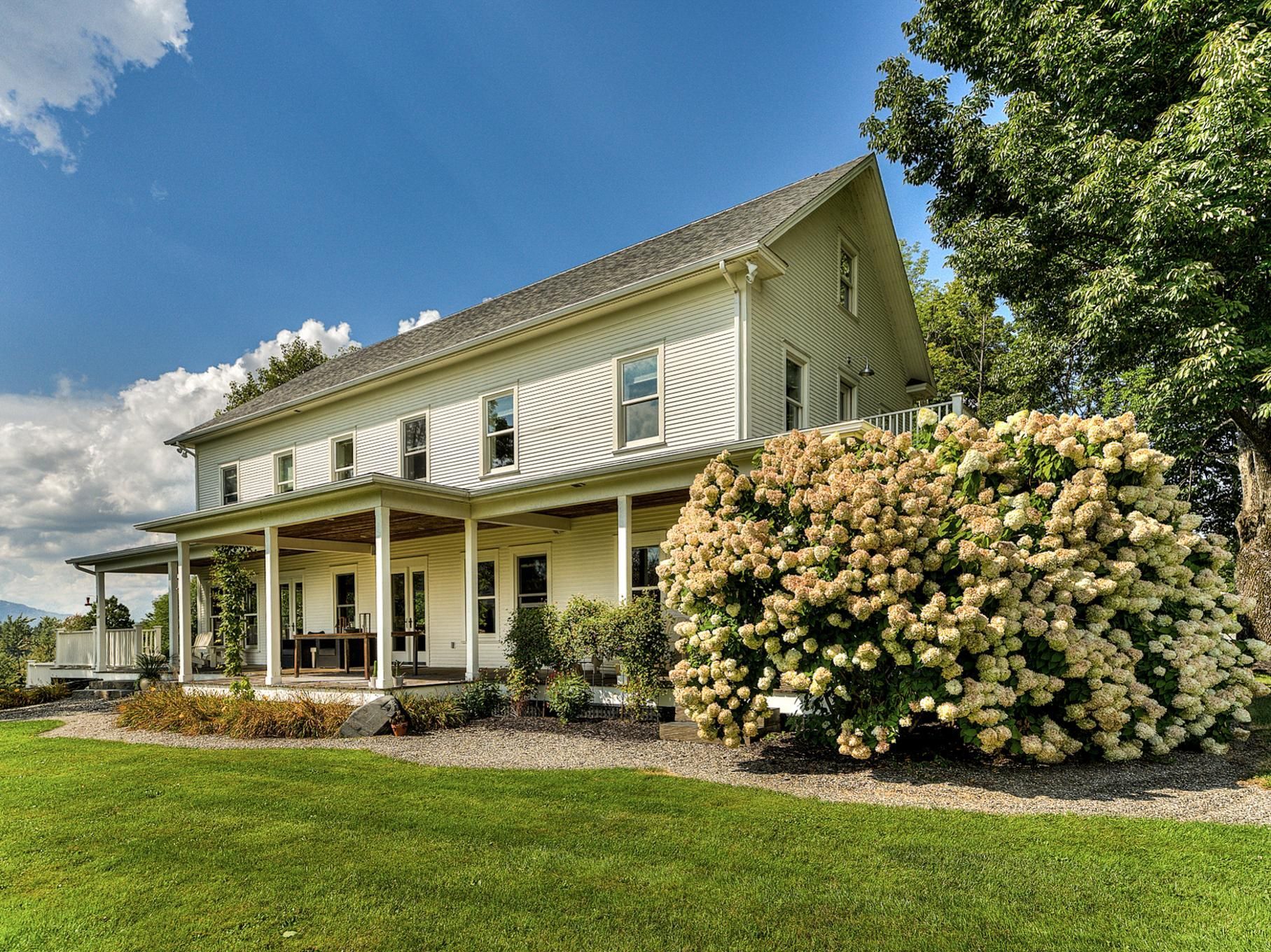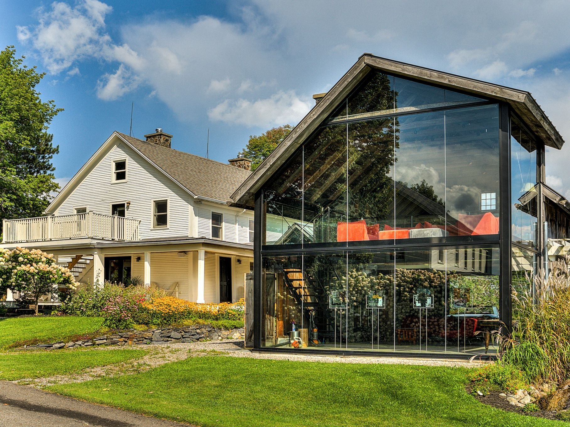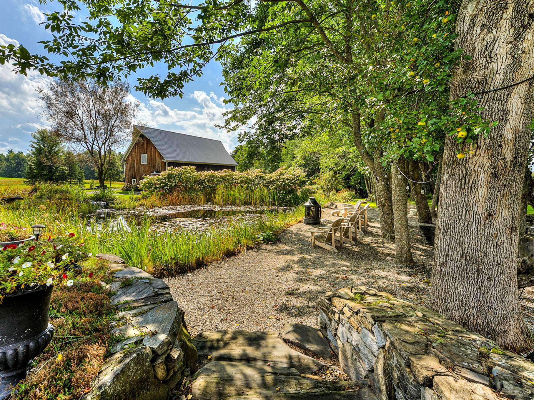 Nestled in the heart of the Eastern Townships, this exquisite property is designed to blend 1800's local historical culture with modern architecture. The expansive 80 acre property with stunning mountain views to the south and west, features 2 houses, a glass carriage house, a barn and multiple sheds for storage.