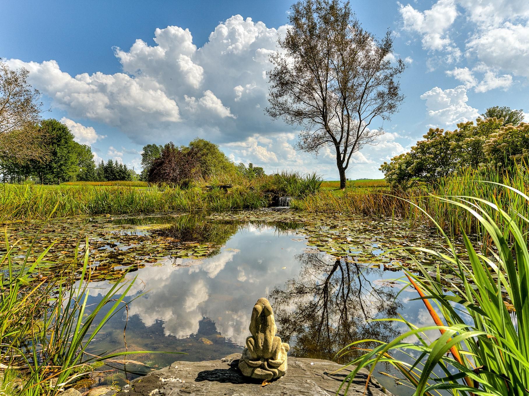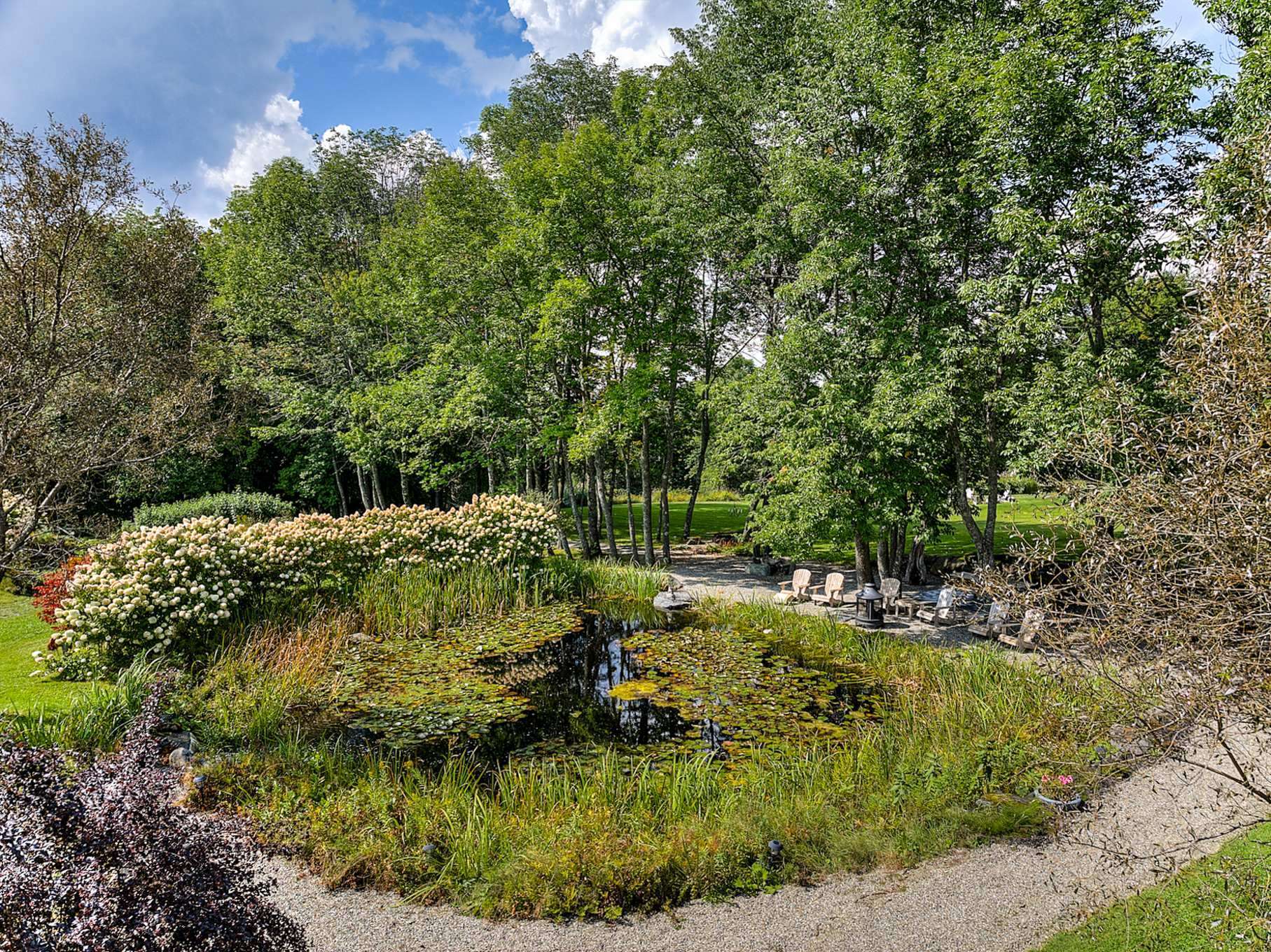 The property features landscaped gardens, a large pond with waterfall, 2 smaller water features, raised vegetable beds and about 4 km of wooded trails for walking or winter snowshoeing.
