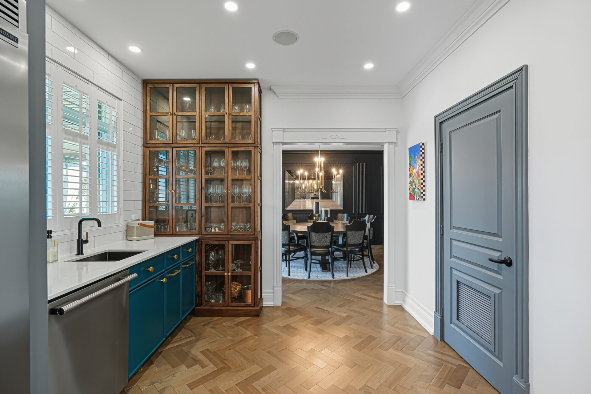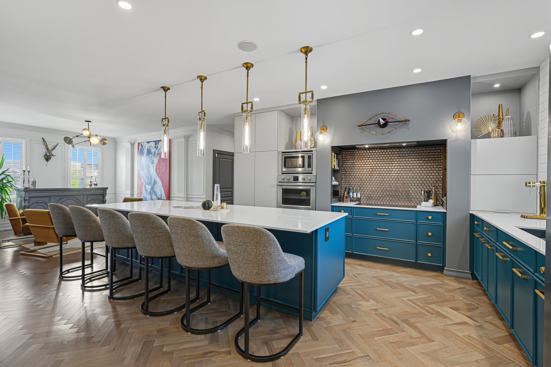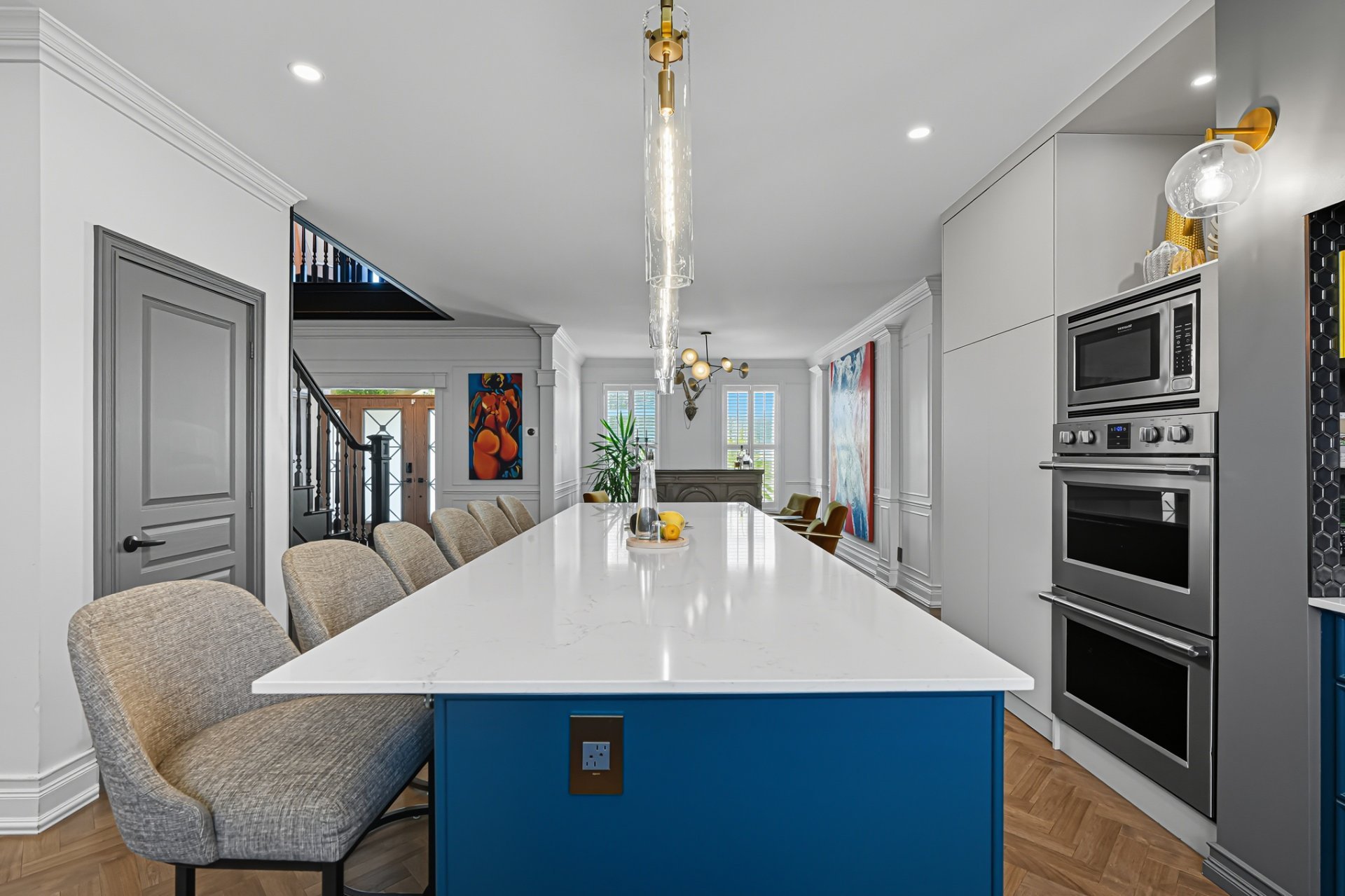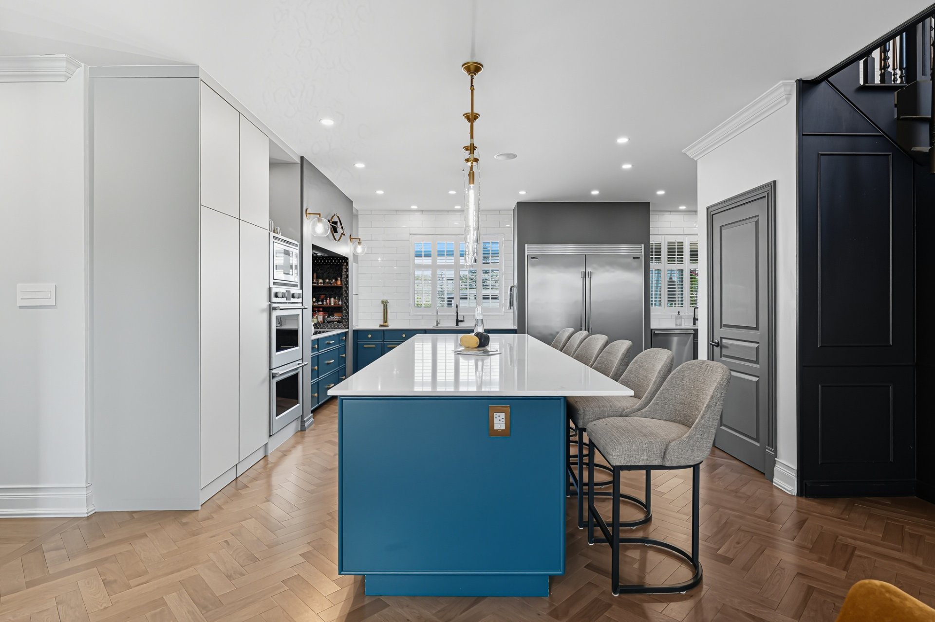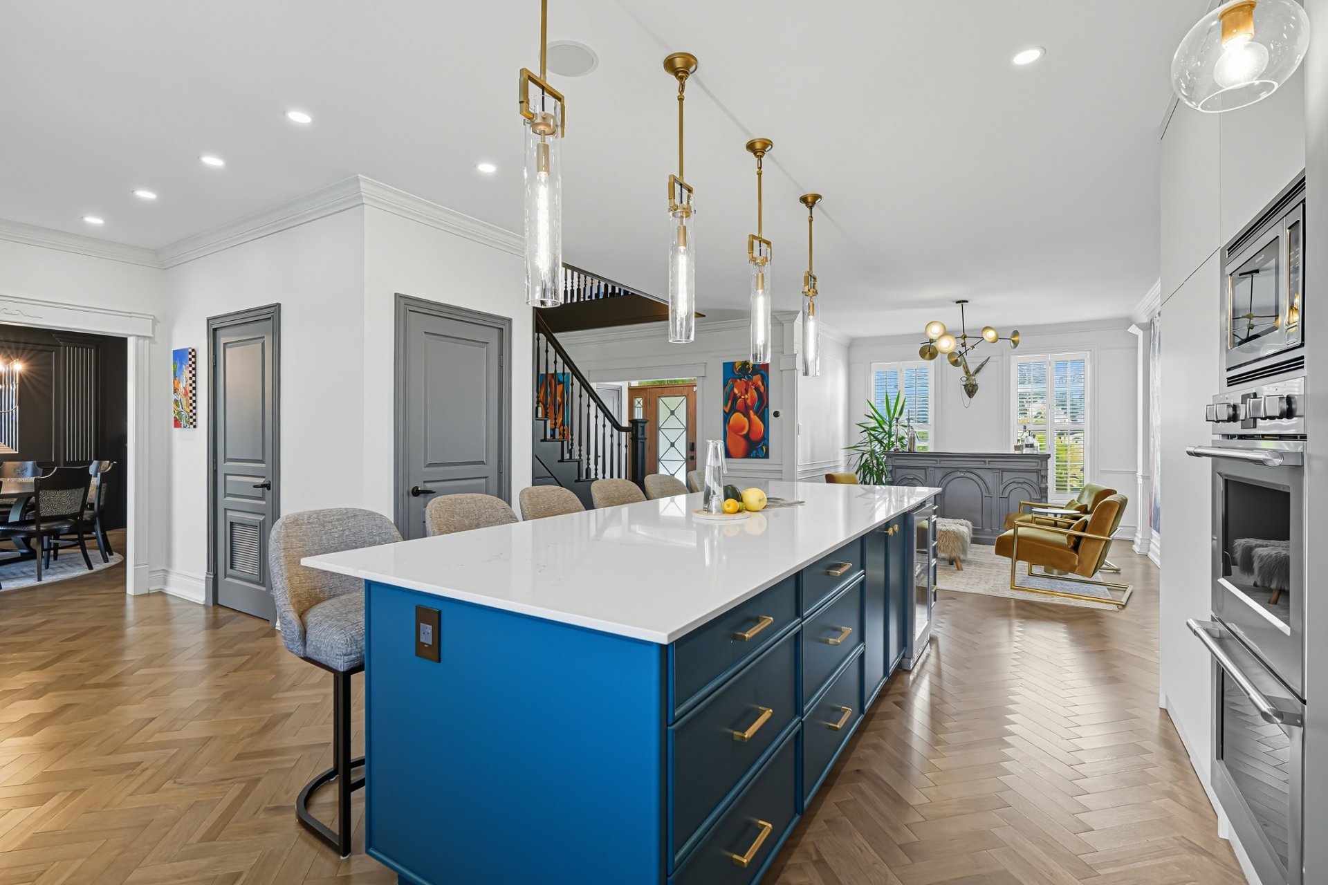 The main living area impresses with its brightness, generous proportions, and seamless flow between rooms. The kitchen, truly the heart of the home, stands out with its massive central island, deep blue cabinetry accented with gold, and integrated high-end appliances. Both functional and striking, it is the perfect space for entertaining or family gatherings. Adjacent to it, the elegant dining room and inviting living room each offer their own atmosphere--ideal for relaxation and social moments. High ceilings, detailed wall mouldings, and noble materials emphasize the home's luxurious character.