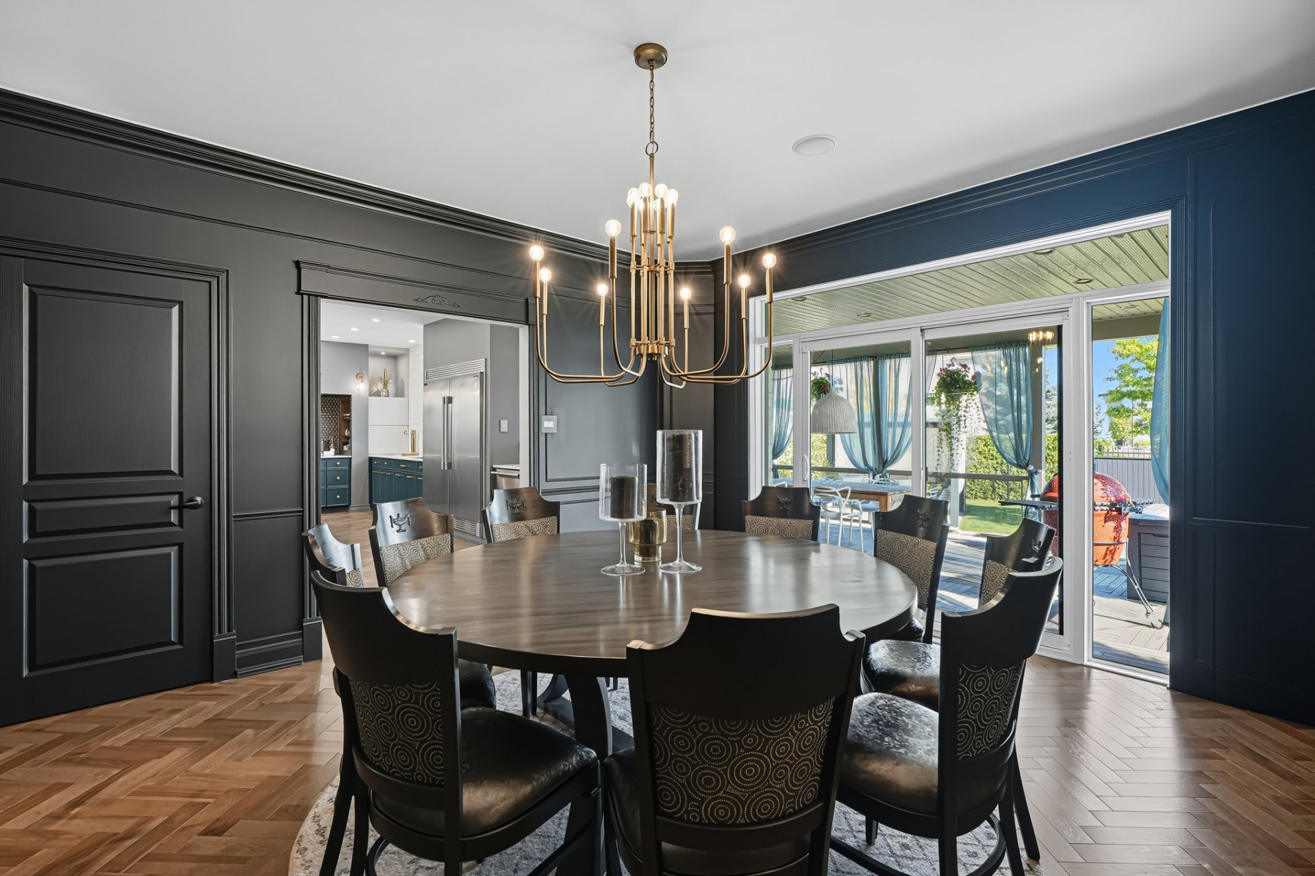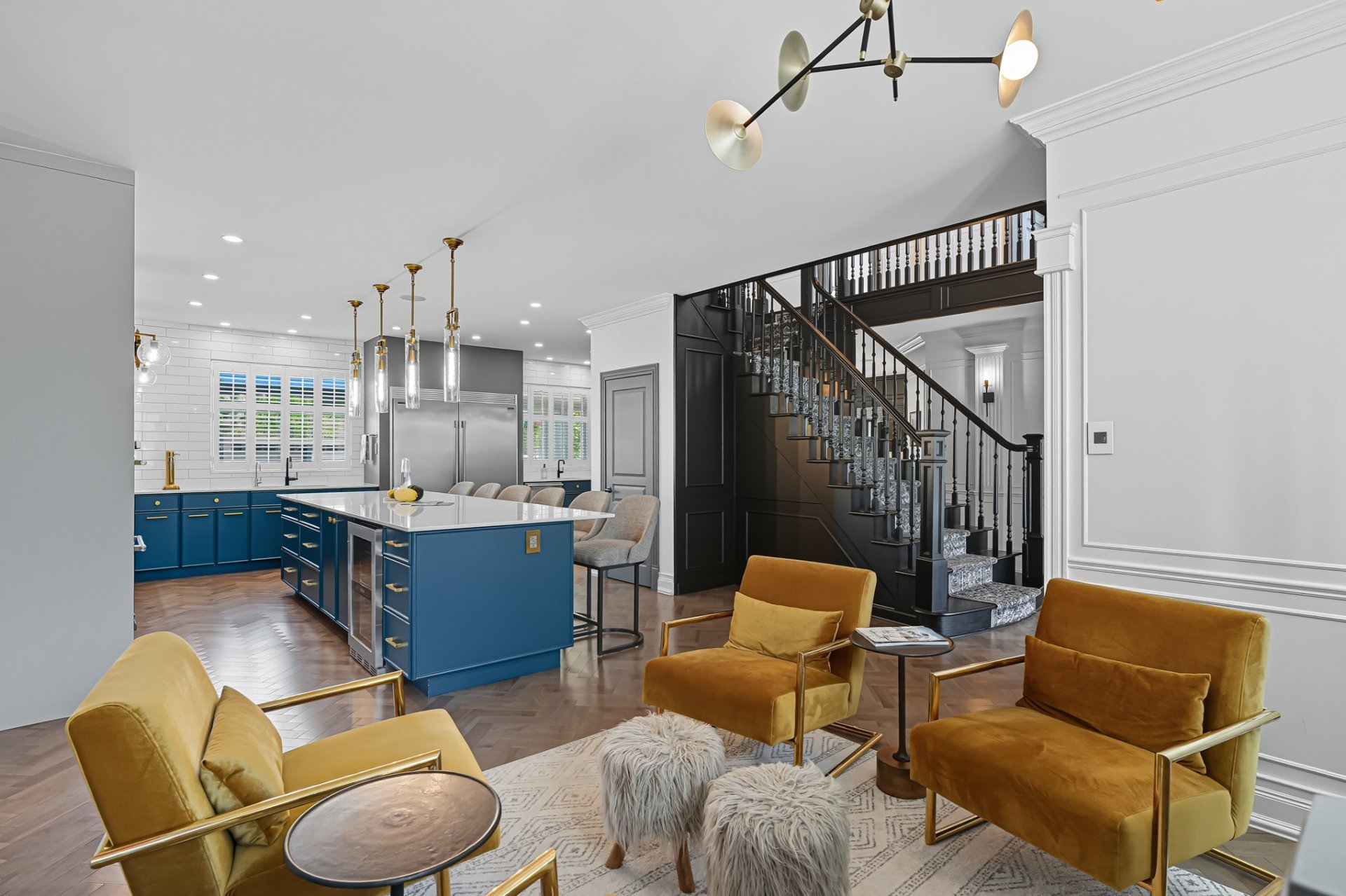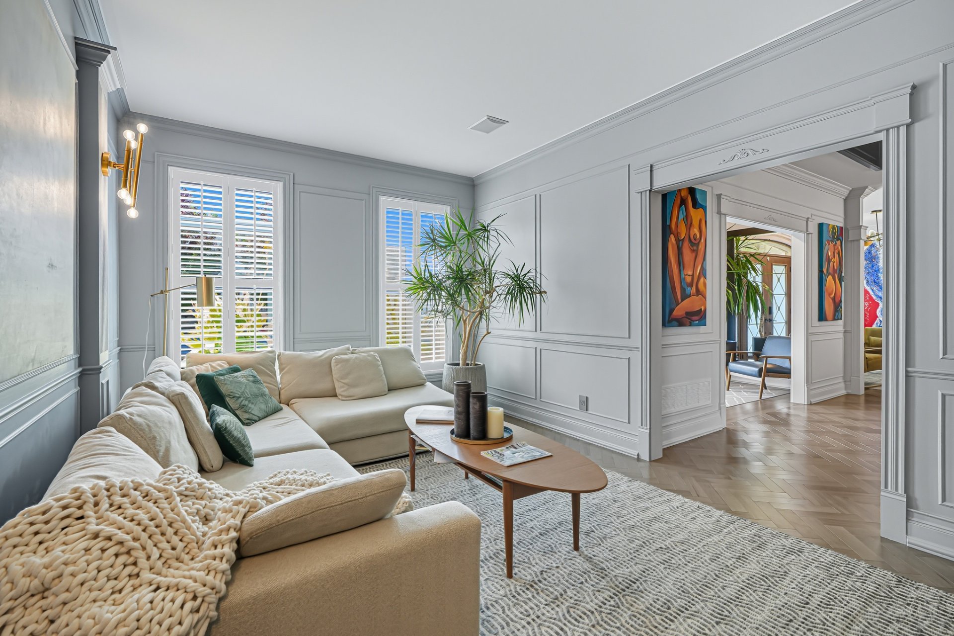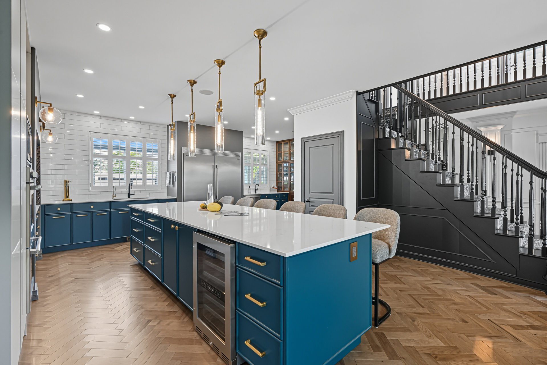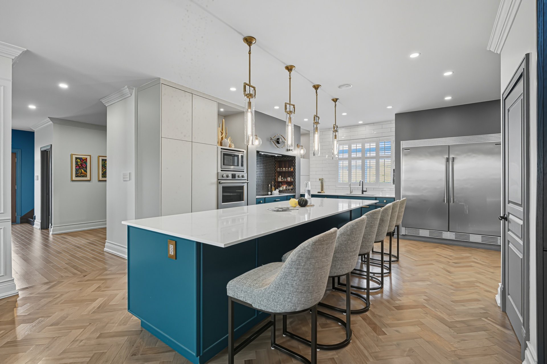 The main living area impresses with its brightness, generous proportions, and seamless flow between rooms. The kitchen, truly the heart of the home, stands out with its massive central island, deep blue cabinetry accented with gold, and integrated high-end appliances. Both functional and striking, it is the perfect space for entertaining or family gatherings. Adjacent to it, the elegant dining room and inviting living room each offer their own atmosphere--ideal for relaxation and social moments. High ceilings, detailed wall mouldings, and noble materials emphasize the home's luxurious character.