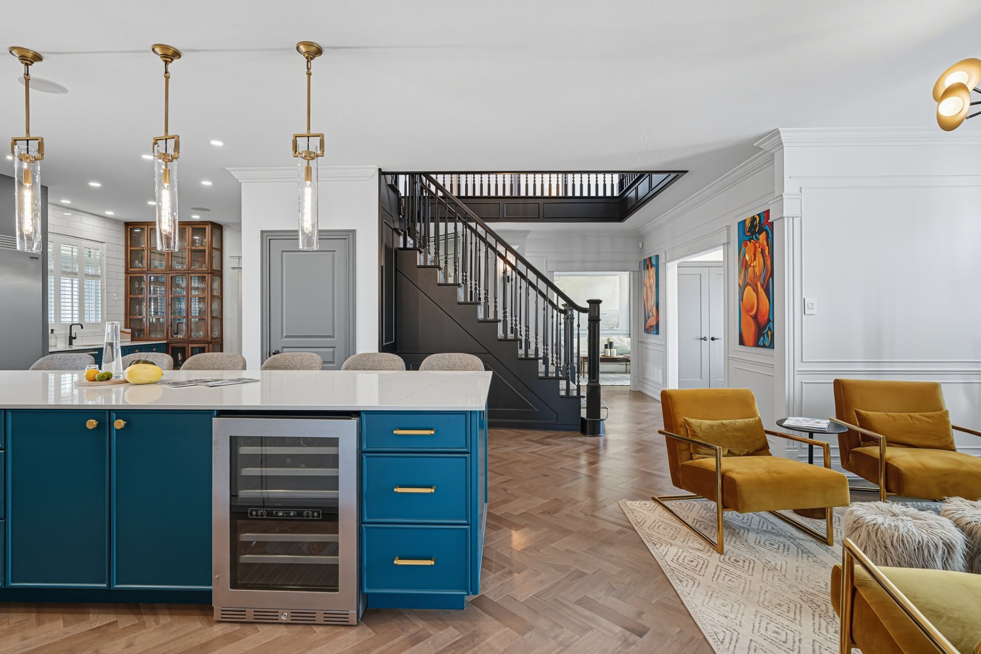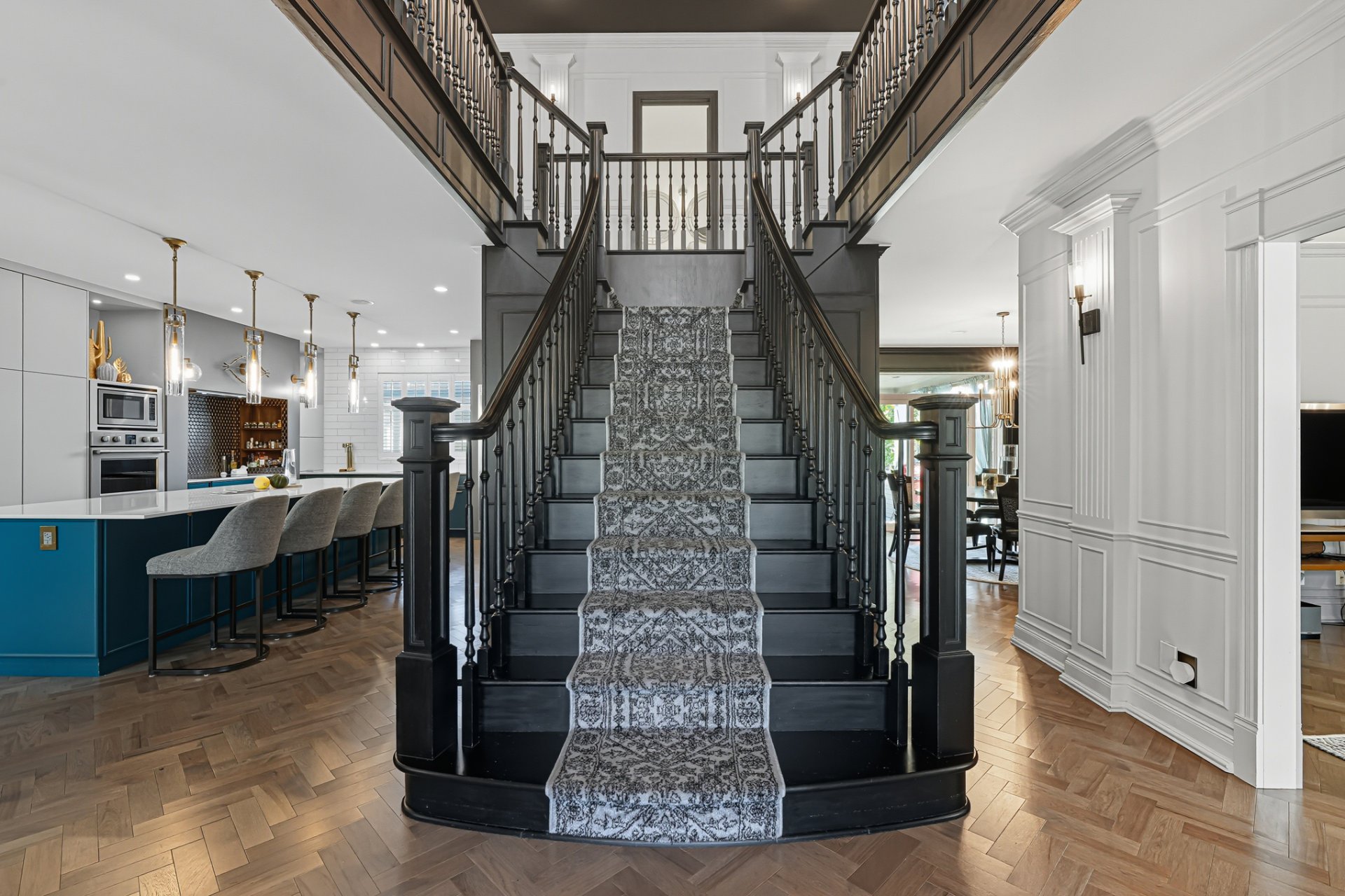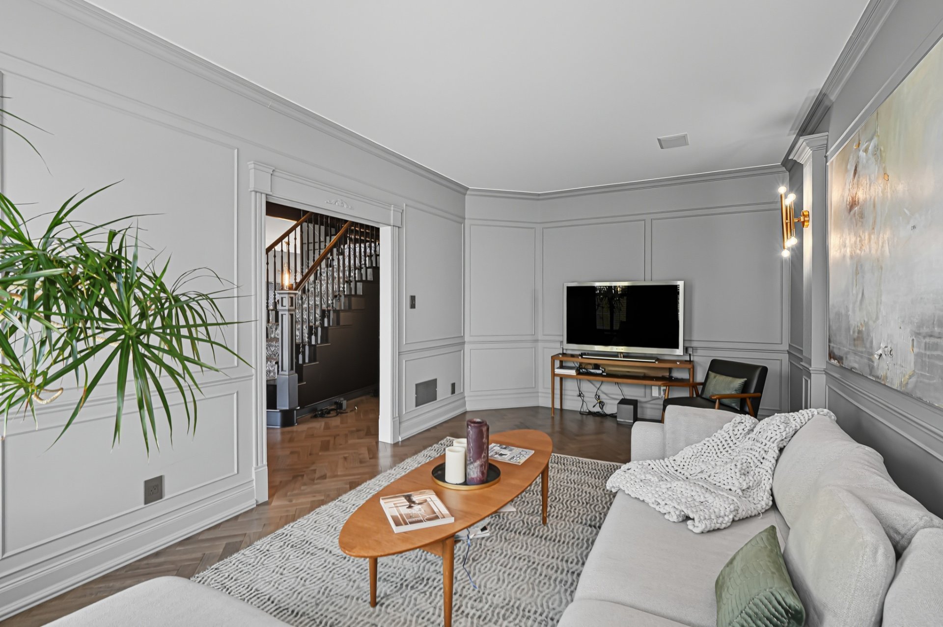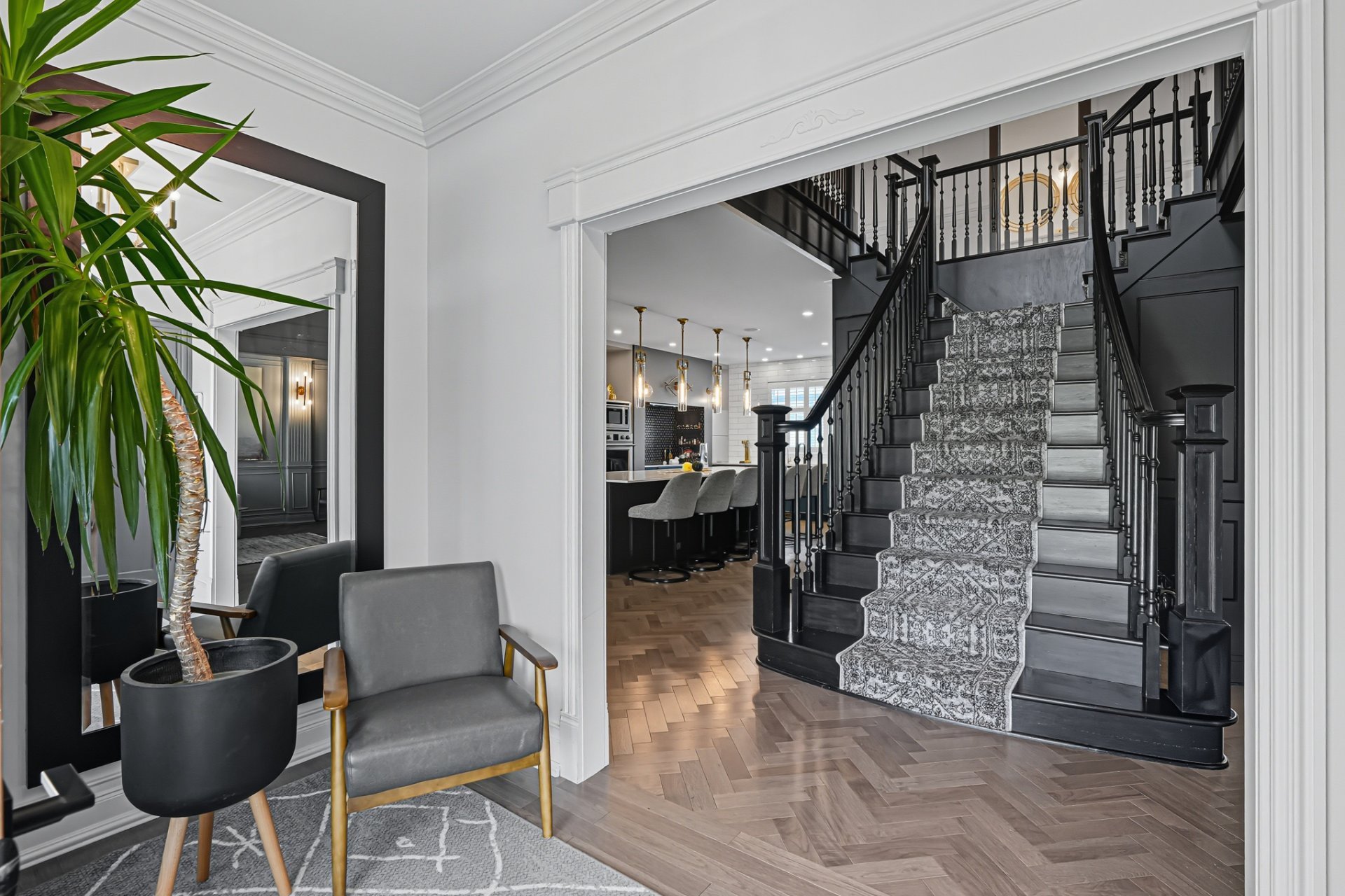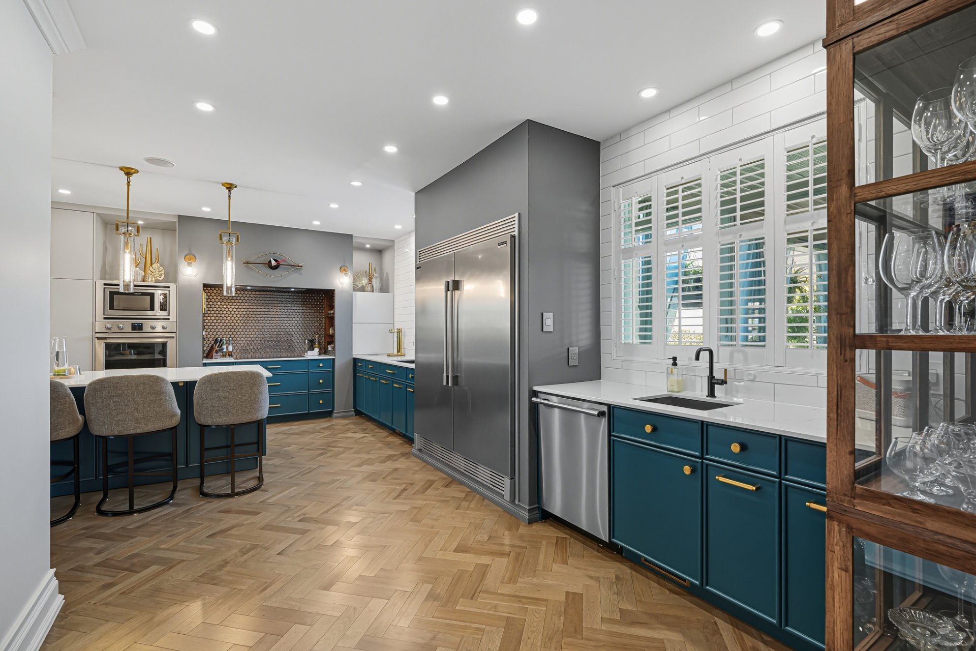 The main living area impresses with its brightness, generous proportions, and seamless flow between rooms. The kitchen, truly the heart of the home, stands out with its massive central island, deep blue cabinetry accented with gold, and integrated high-end appliances. Both functional and striking, it is the perfect space for entertaining or family gatherings. Adjacent to it, the elegant dining room and inviting living room each offer their own atmosphere--ideal for relaxation and social moments. High ceilings, detailed wall mouldings, and noble materials emphasize the home's luxurious character.