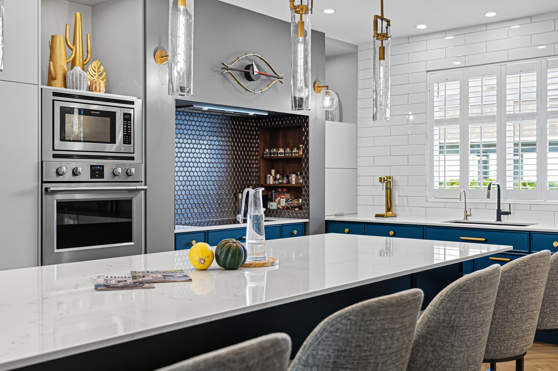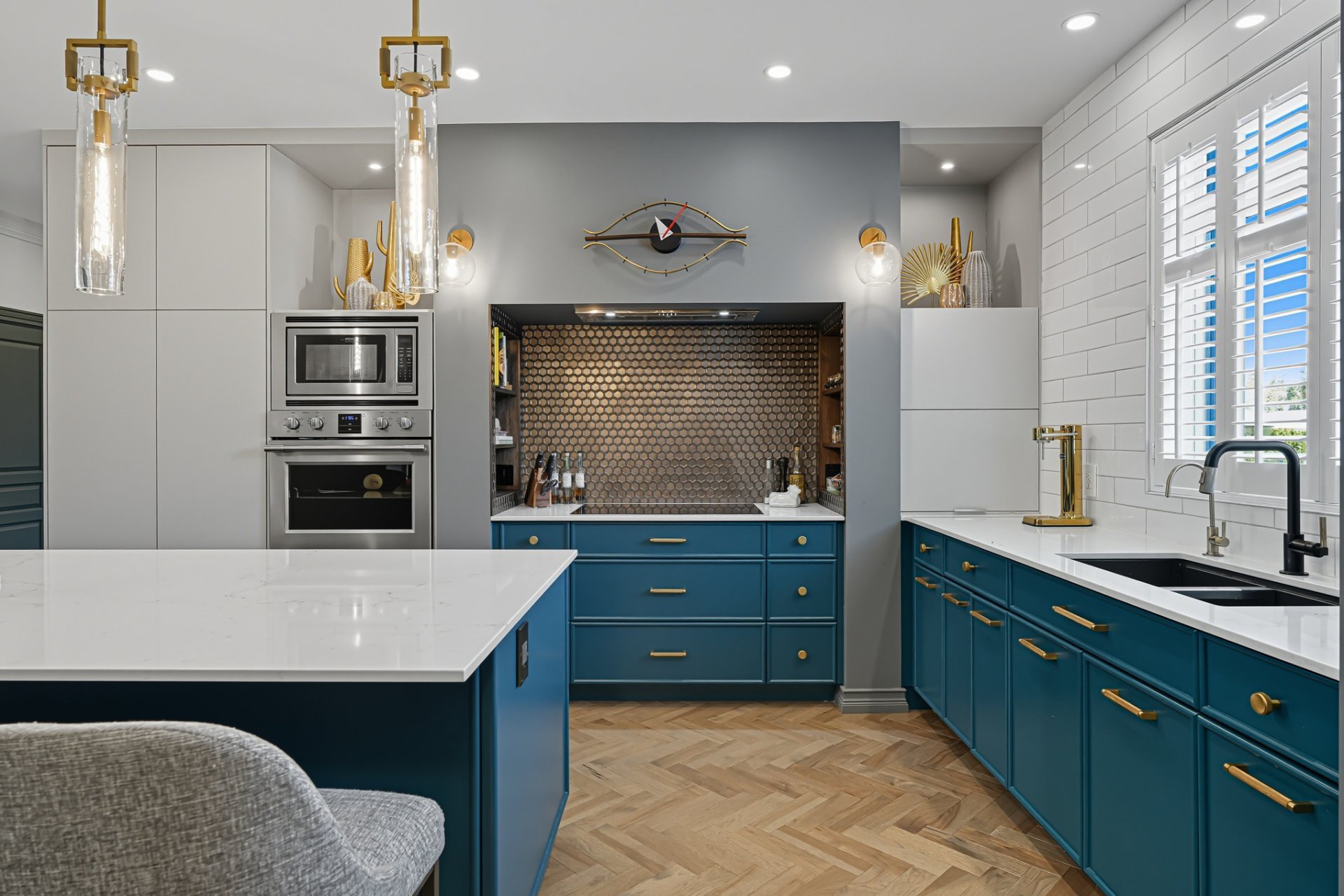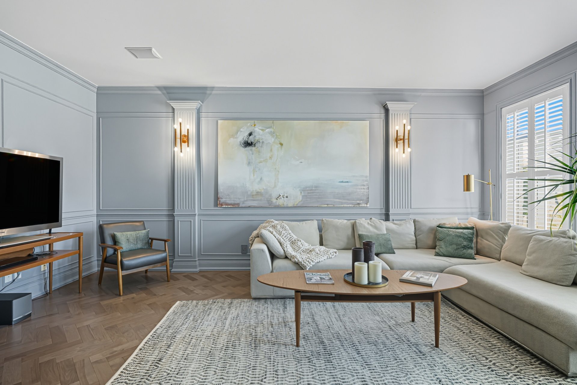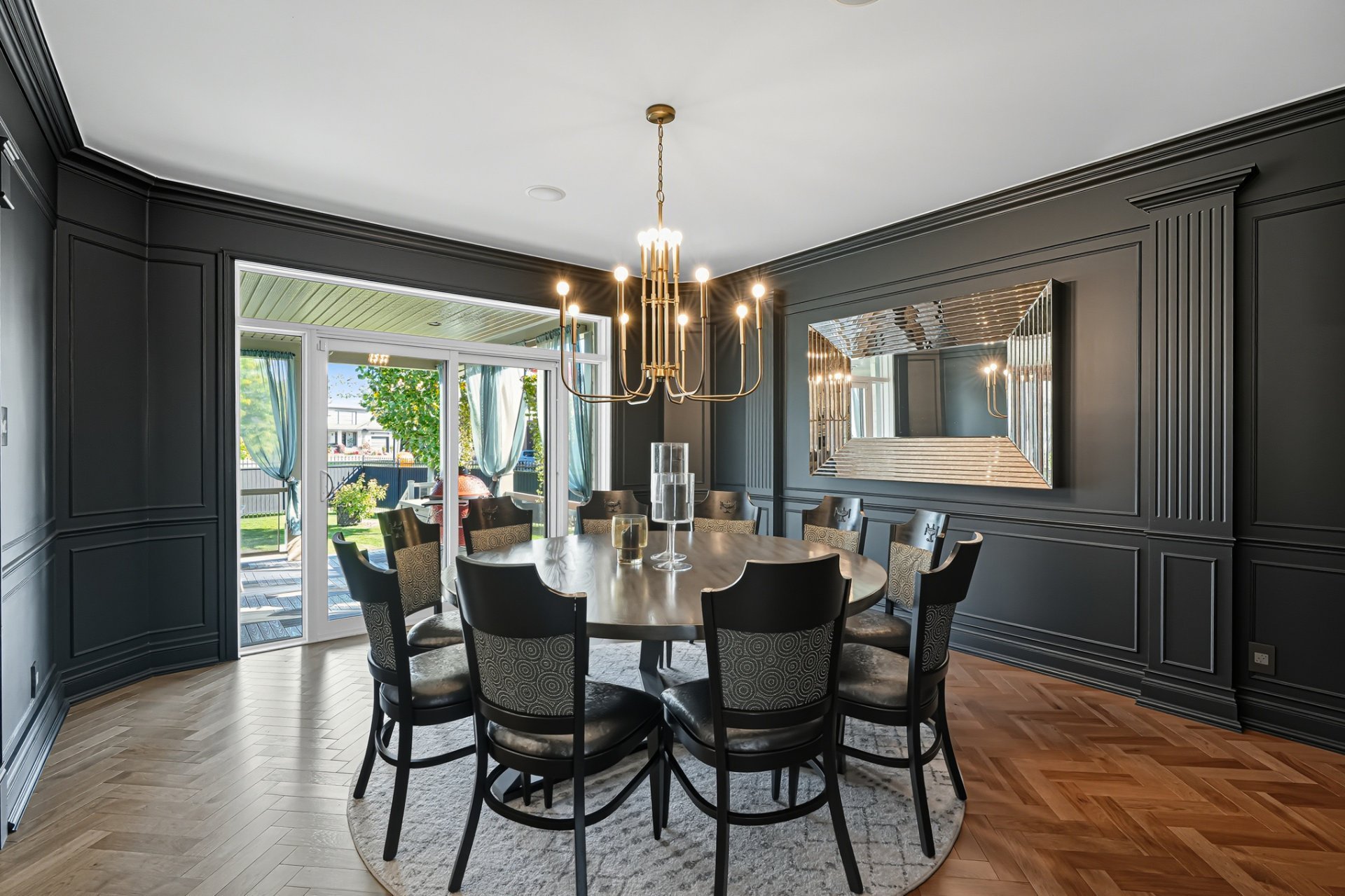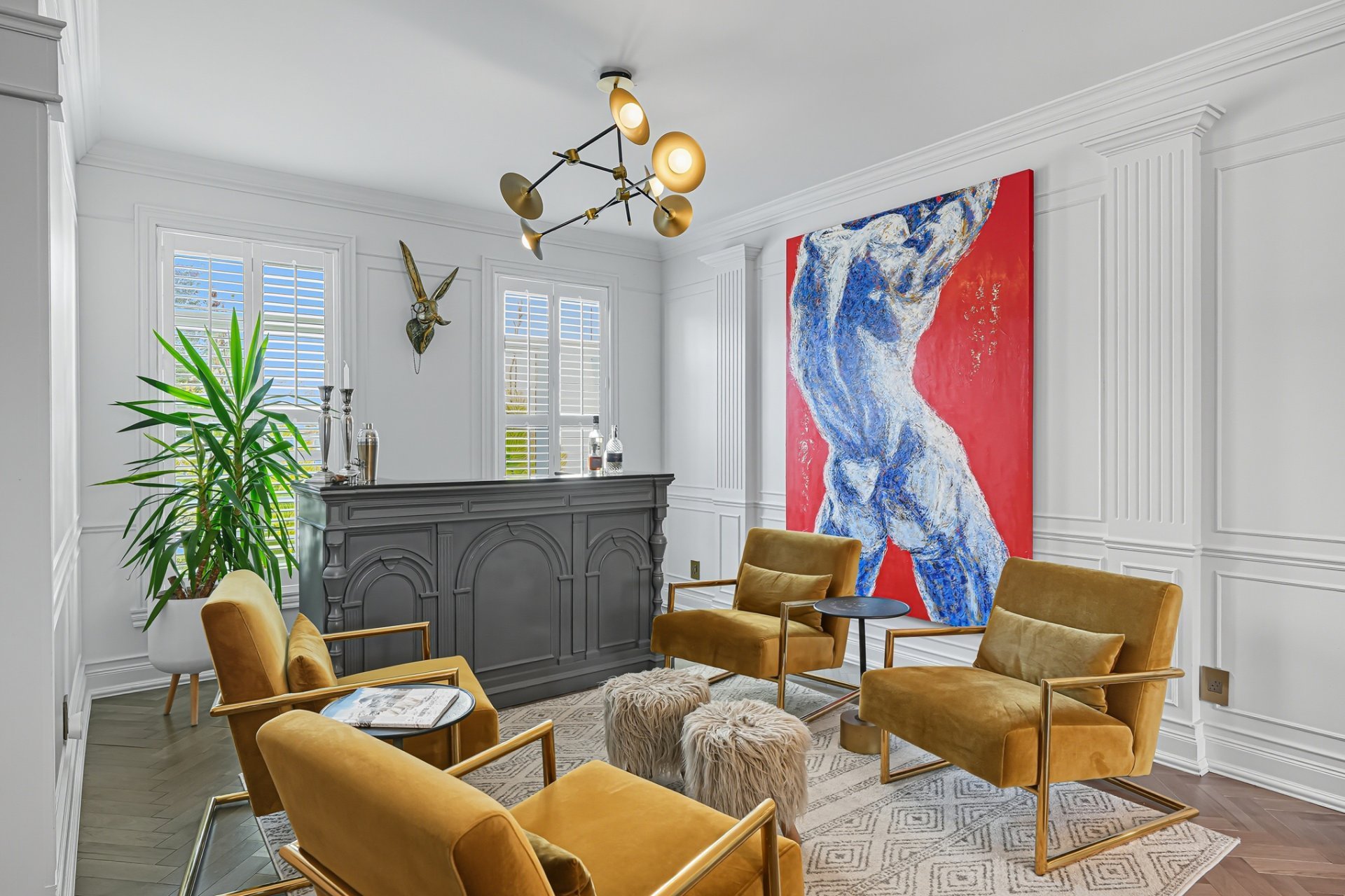 The main living area impresses with its brightness, generous proportions, and seamless flow between rooms. The kitchen, truly the heart of the home, stands out with its massive central island, deep blue cabinetry accented with gold, and integrated high-end appliances. Both functional and striking, it is the perfect space for entertaining or family gatherings. Adjacent to it, the elegant dining room and inviting living room each offer their own atmosphere--ideal for relaxation and social moments. High ceilings, detailed wall mouldings, and noble materials emphasize the home's luxurious character.