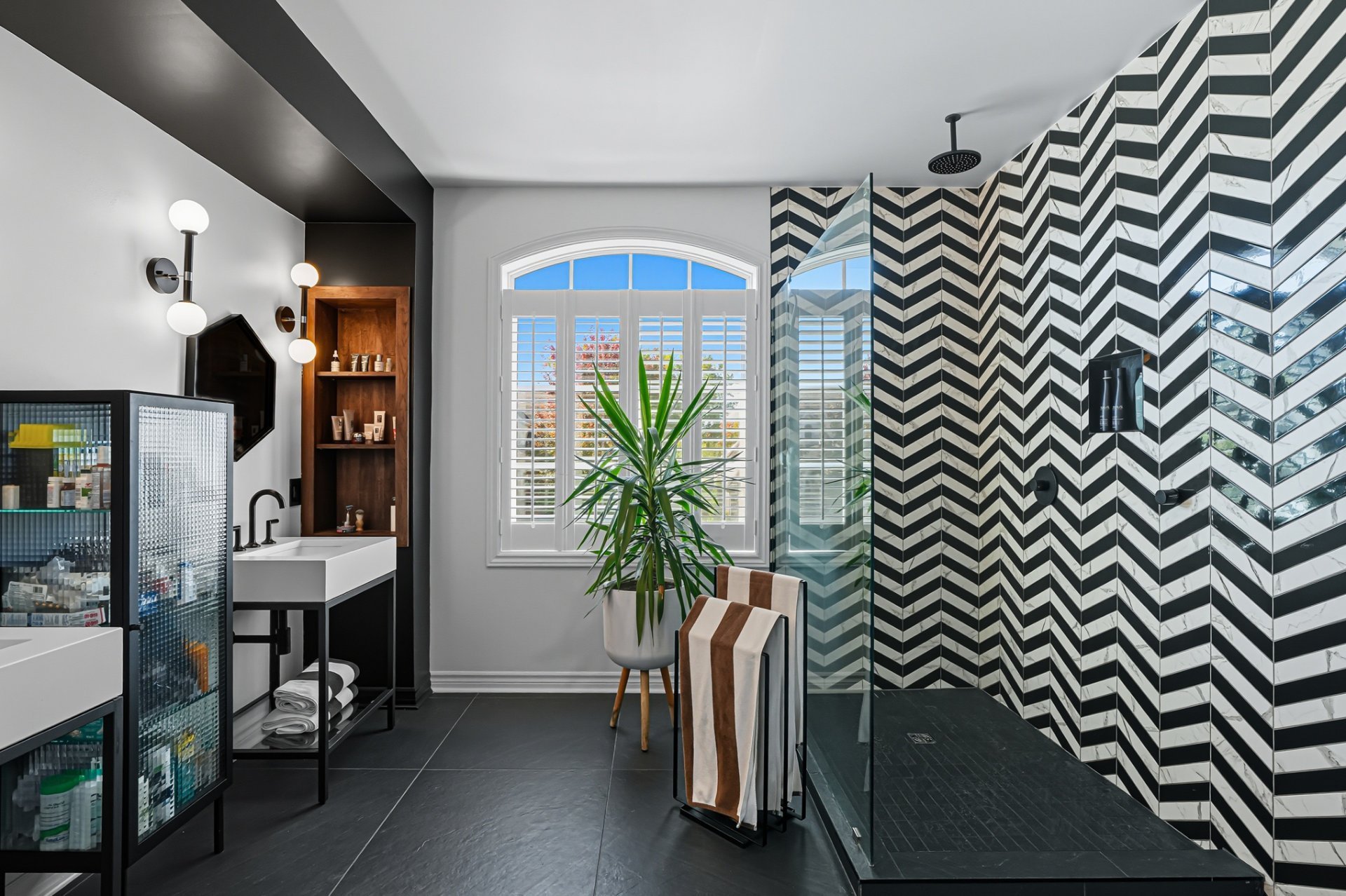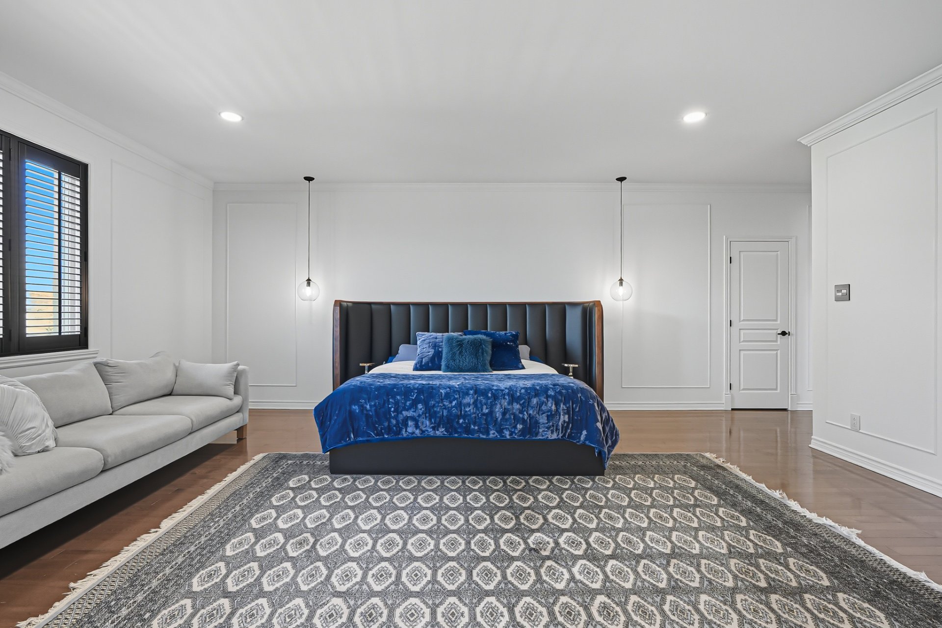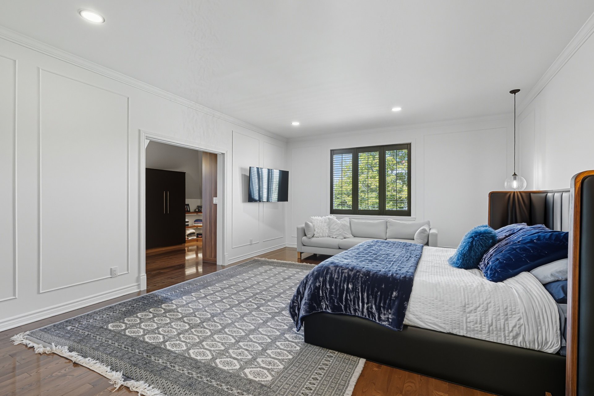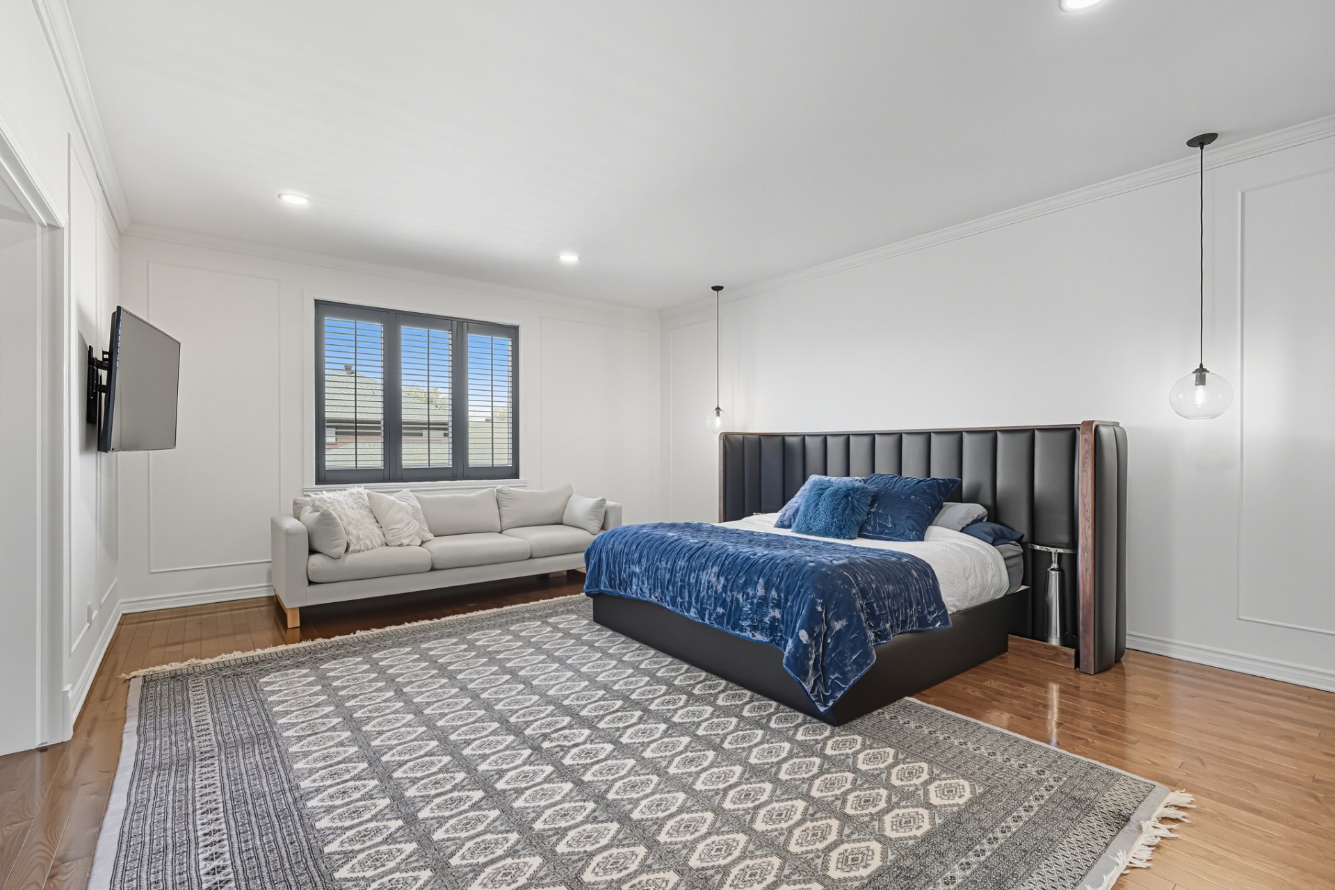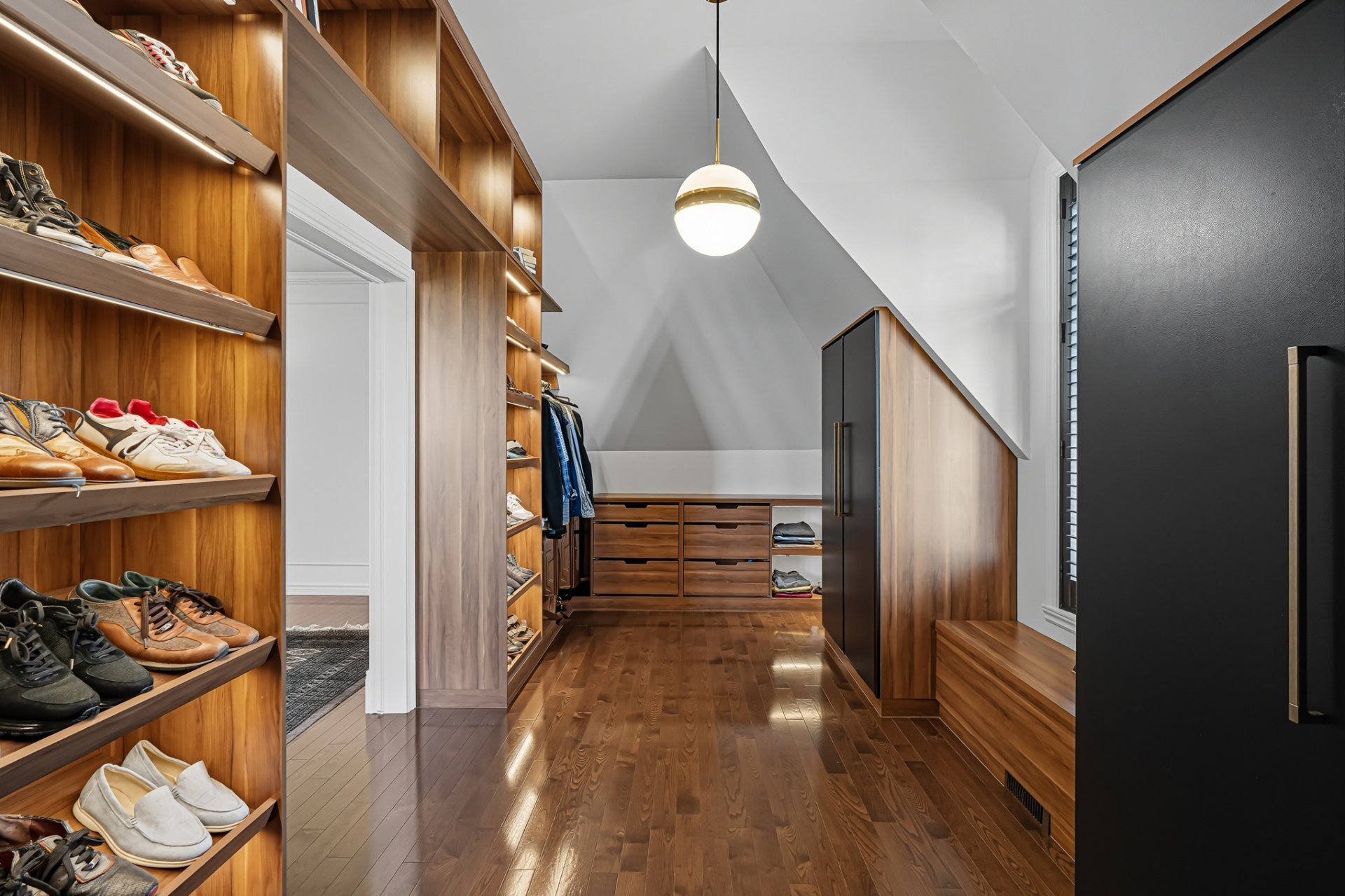 Upstairs, five spacious bedrooms provide each family member with a bright and comfortable private retreat. The primary suite, worthy of a five-star hotel, includes a cozy sitting area, an impressive custom walk-in closet with natural wood finishes, and a spectacular ensuite bathroom. The latter combines bold design and ultimate relaxation, featuring a graphic-tiled Italian shower, contemporary double vanity, and thoughtfully designed lighting for a soothing ambiance.