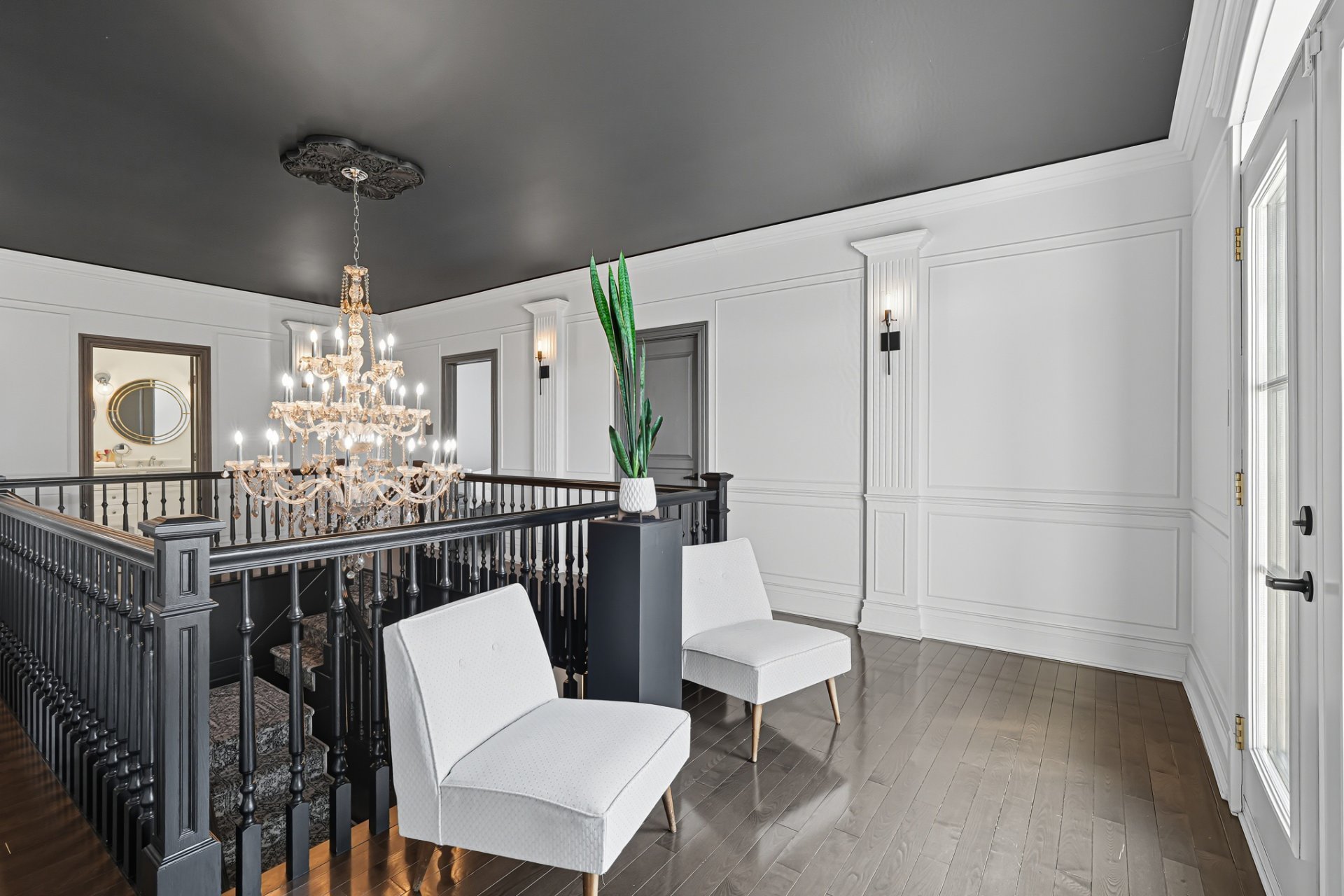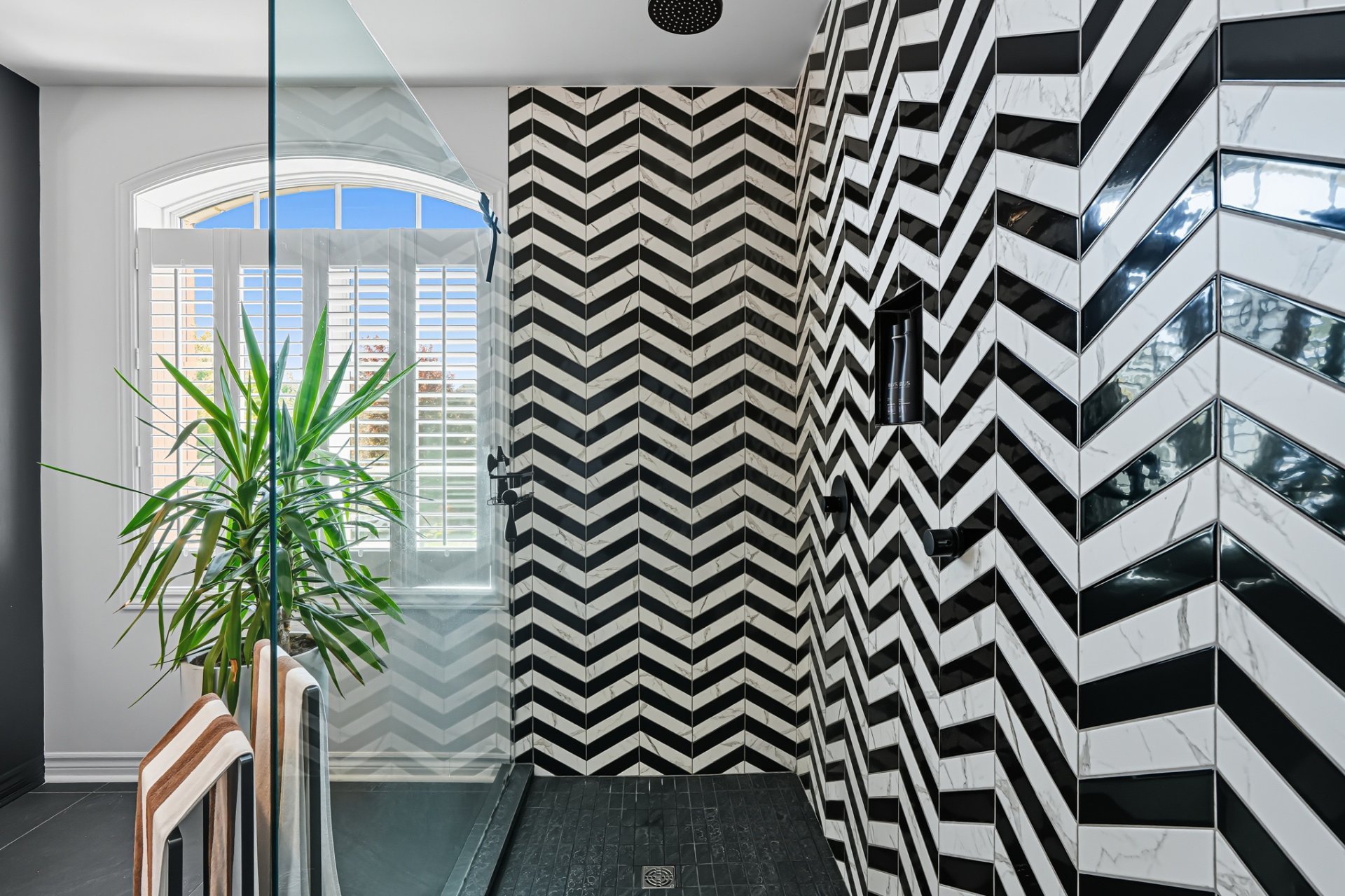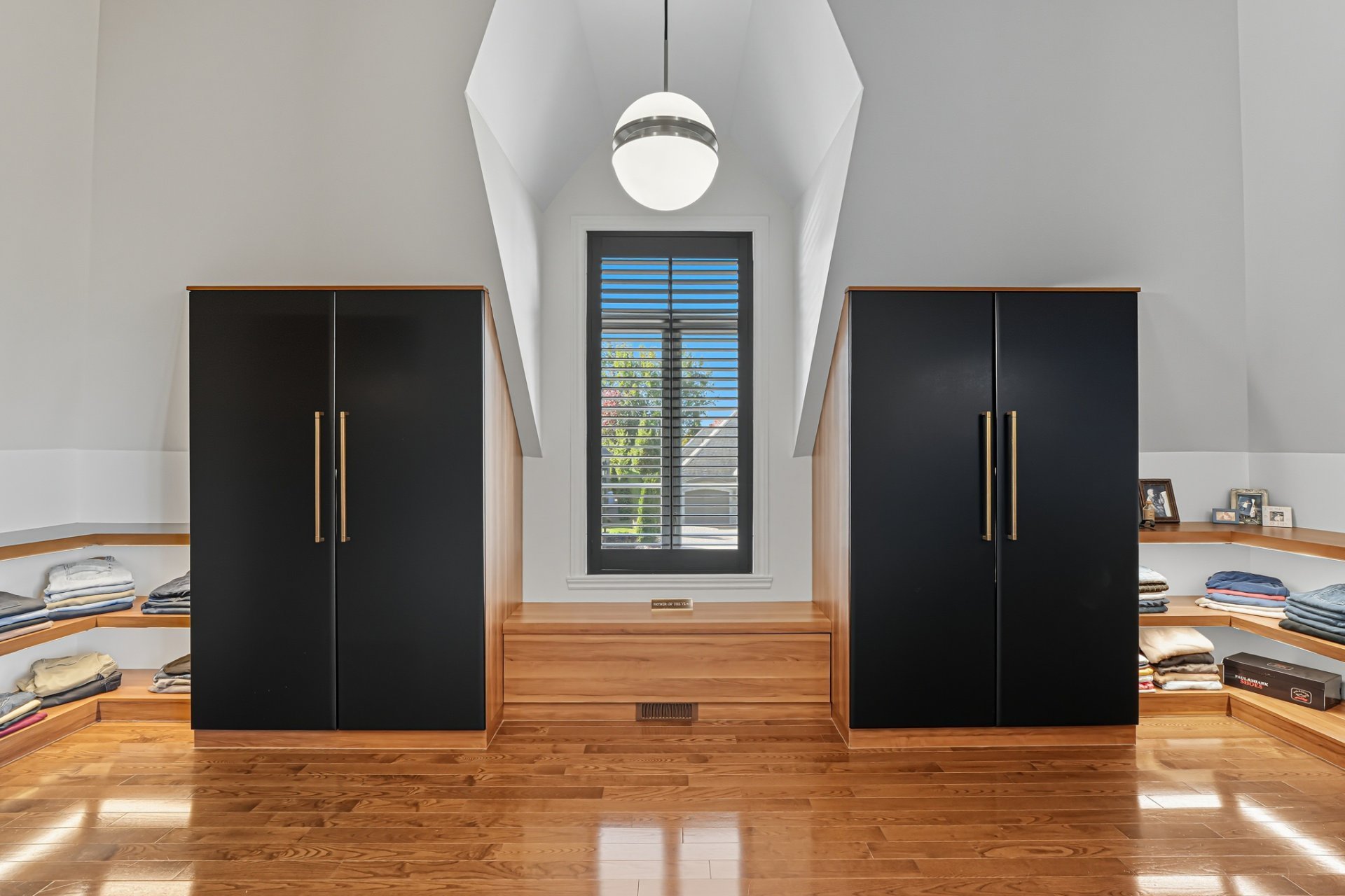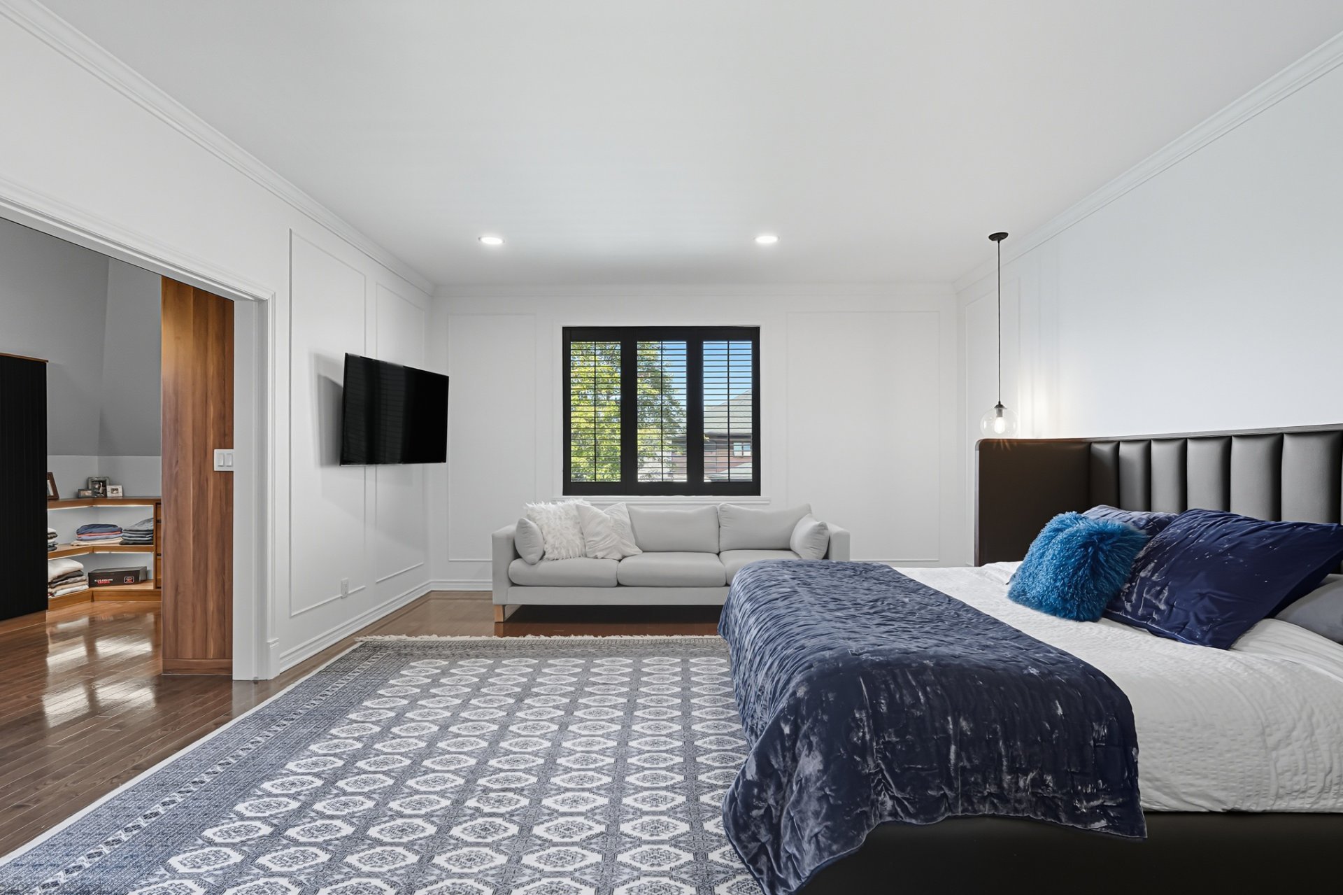 Upstairs, five spacious bedrooms provide each family member with a bright and comfortable private retreat. The primary suite, worthy of a five-star hotel, includes a cozy sitting area, an impressive custom walk-in closet with natural wood finishes, and a spectacular ensuite bathroom. The latter combines bold design and ultimate relaxation, featuring a graphic-tiled Italian shower, contemporary double vanity, and thoughtfully designed lighting for a soothing ambiance.