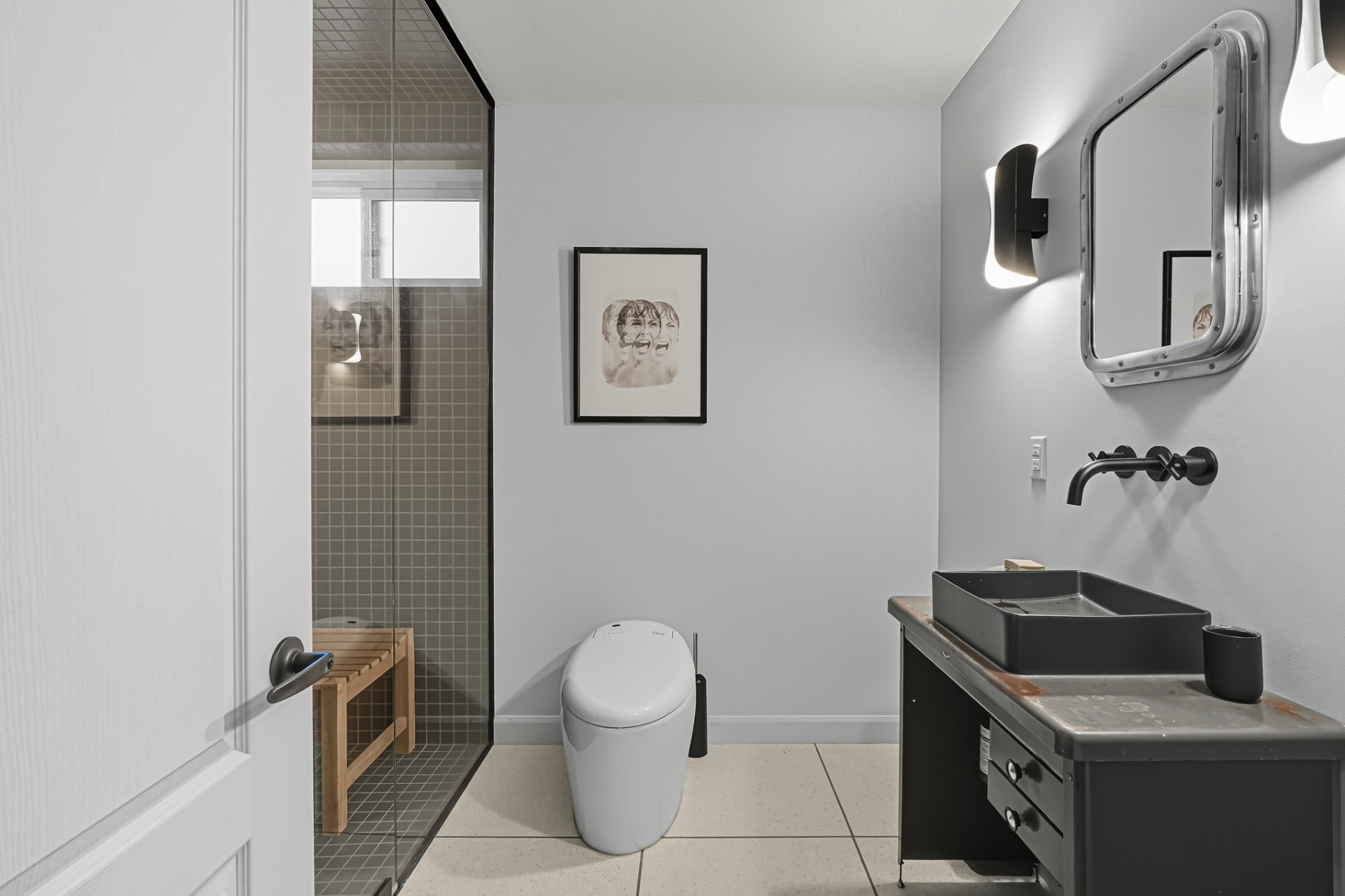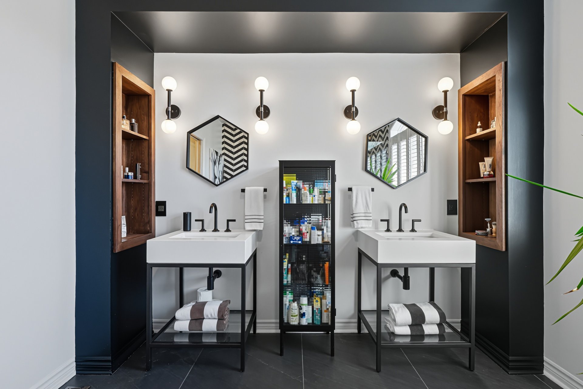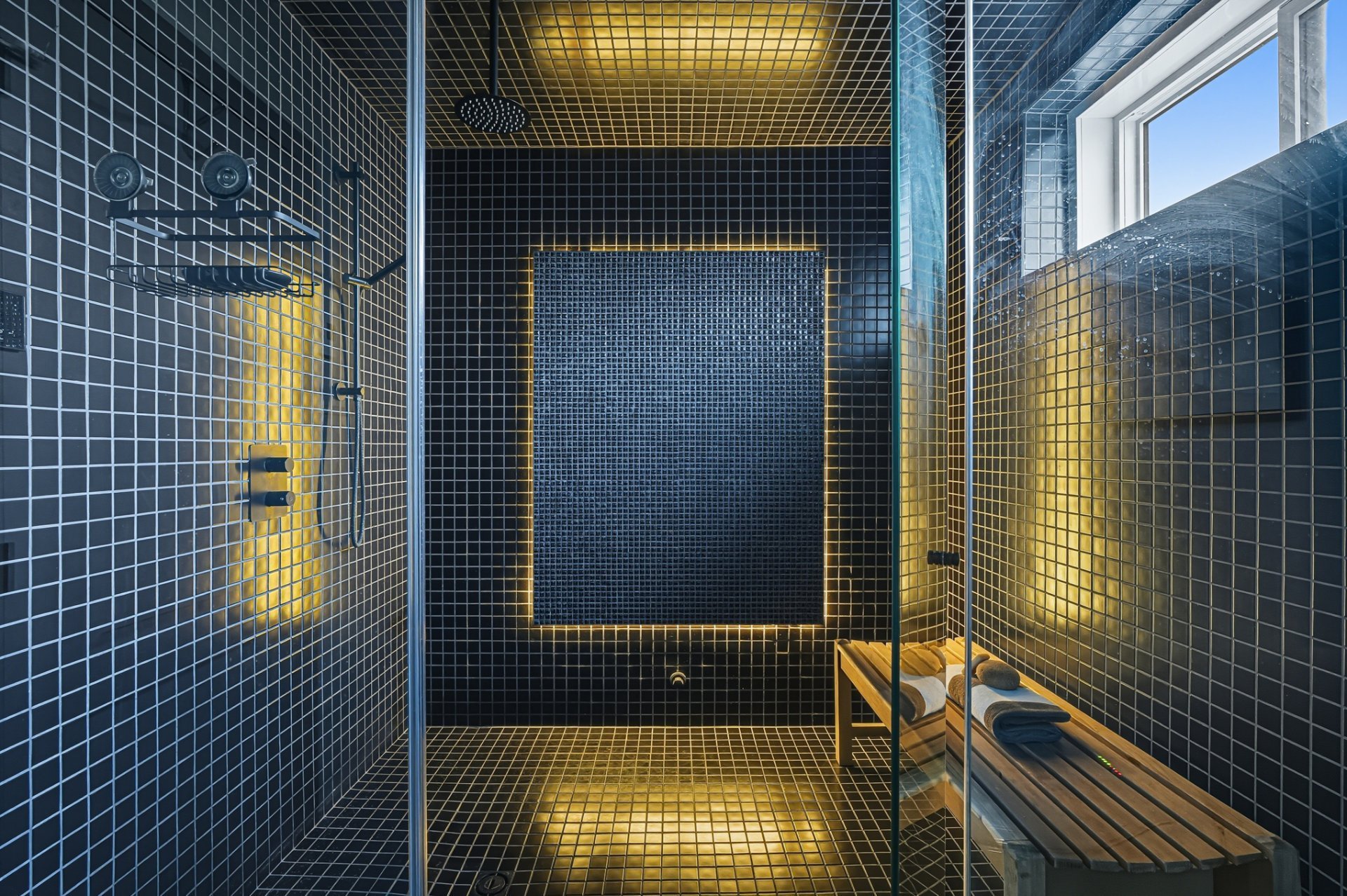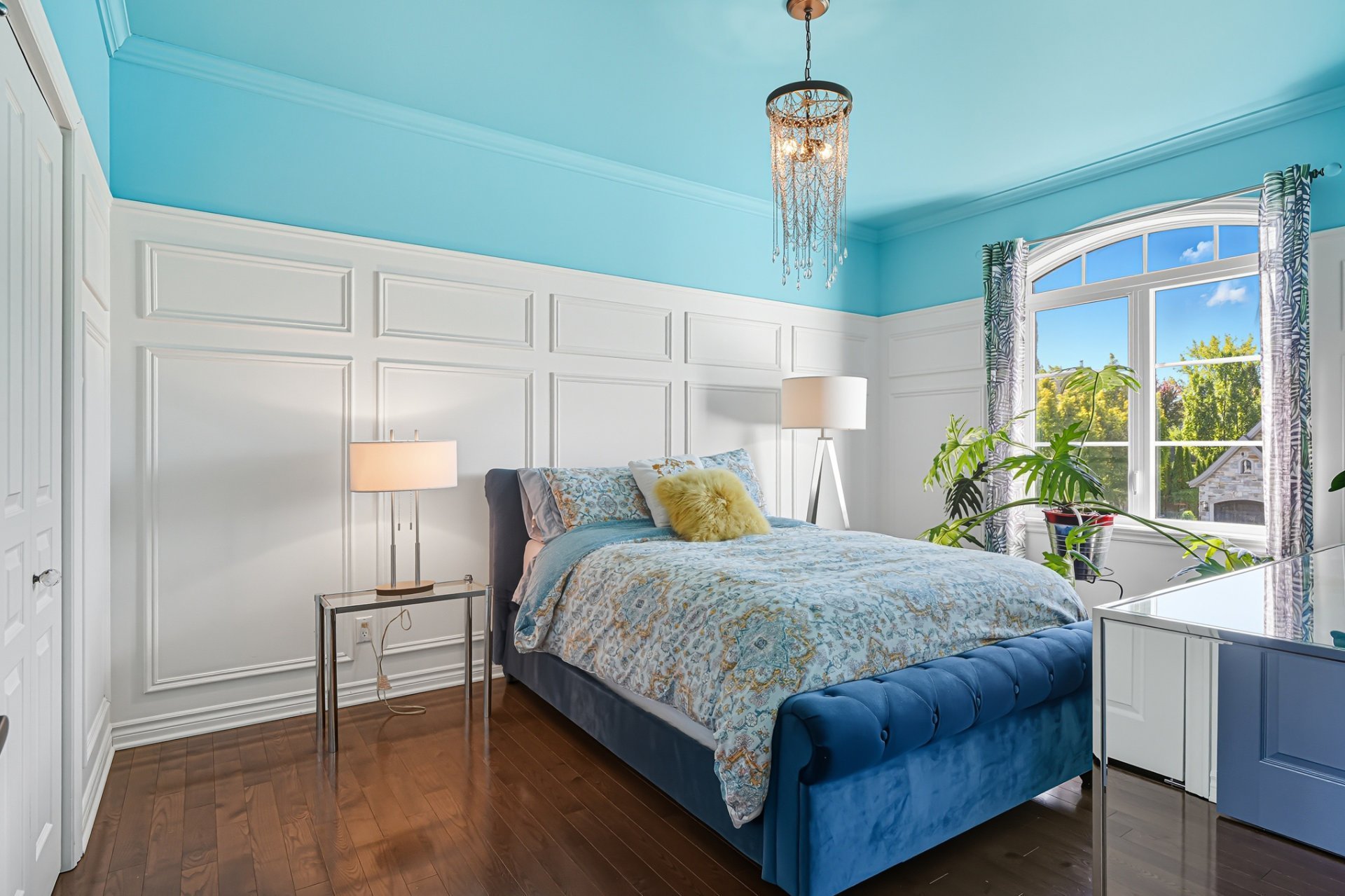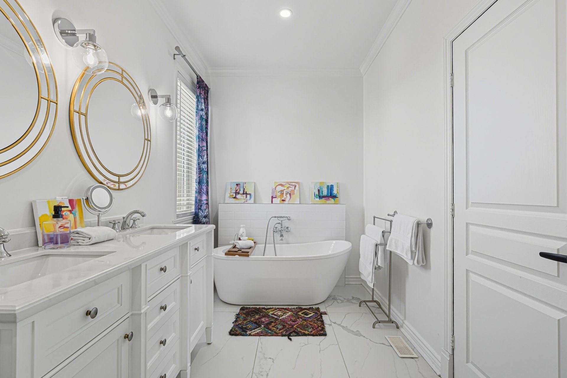 Upstairs, five spacious bedrooms provide each family member with a bright and comfortable private retreat. The primary suite, worthy of a five-star hotel, includes a cozy sitting area, an impressive custom walk-in closet with natural wood finishes, and a spectacular ensuite bathroom. The latter combines bold design and ultimate relaxation, featuring a graphic-tiled Italian shower, contemporary double vanity, and thoughtfully designed lighting for a soothing ambiance.