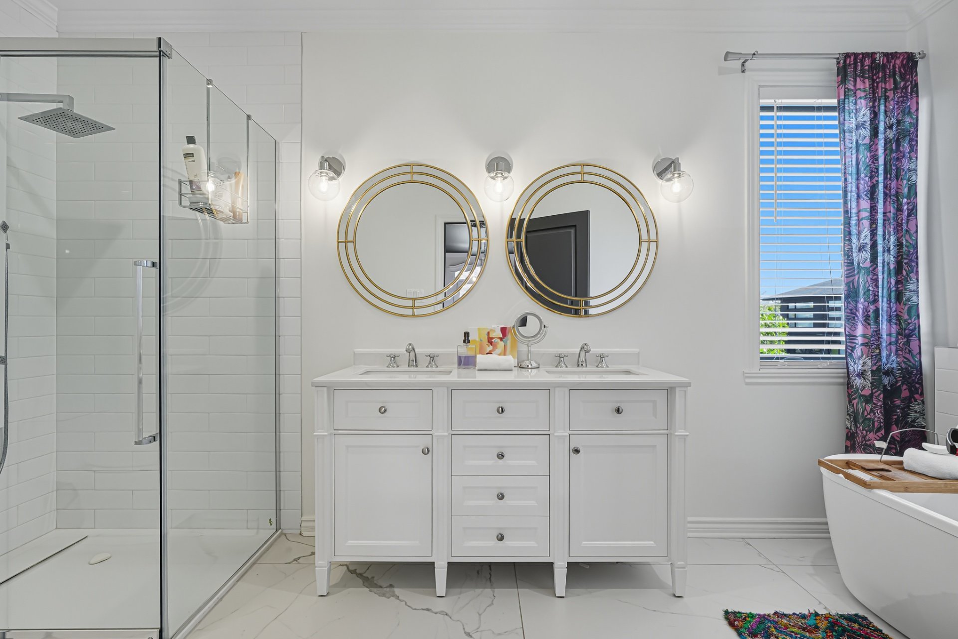 The three additional bathrooms, strategically located throughout the home, combine beauty and practicality, showcasing impeccable finishes and top-quality materials.
