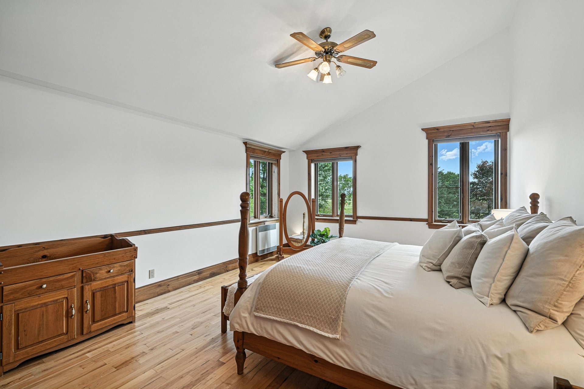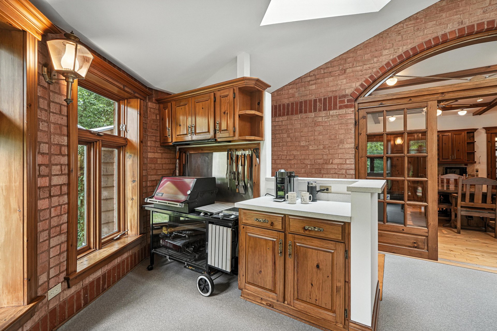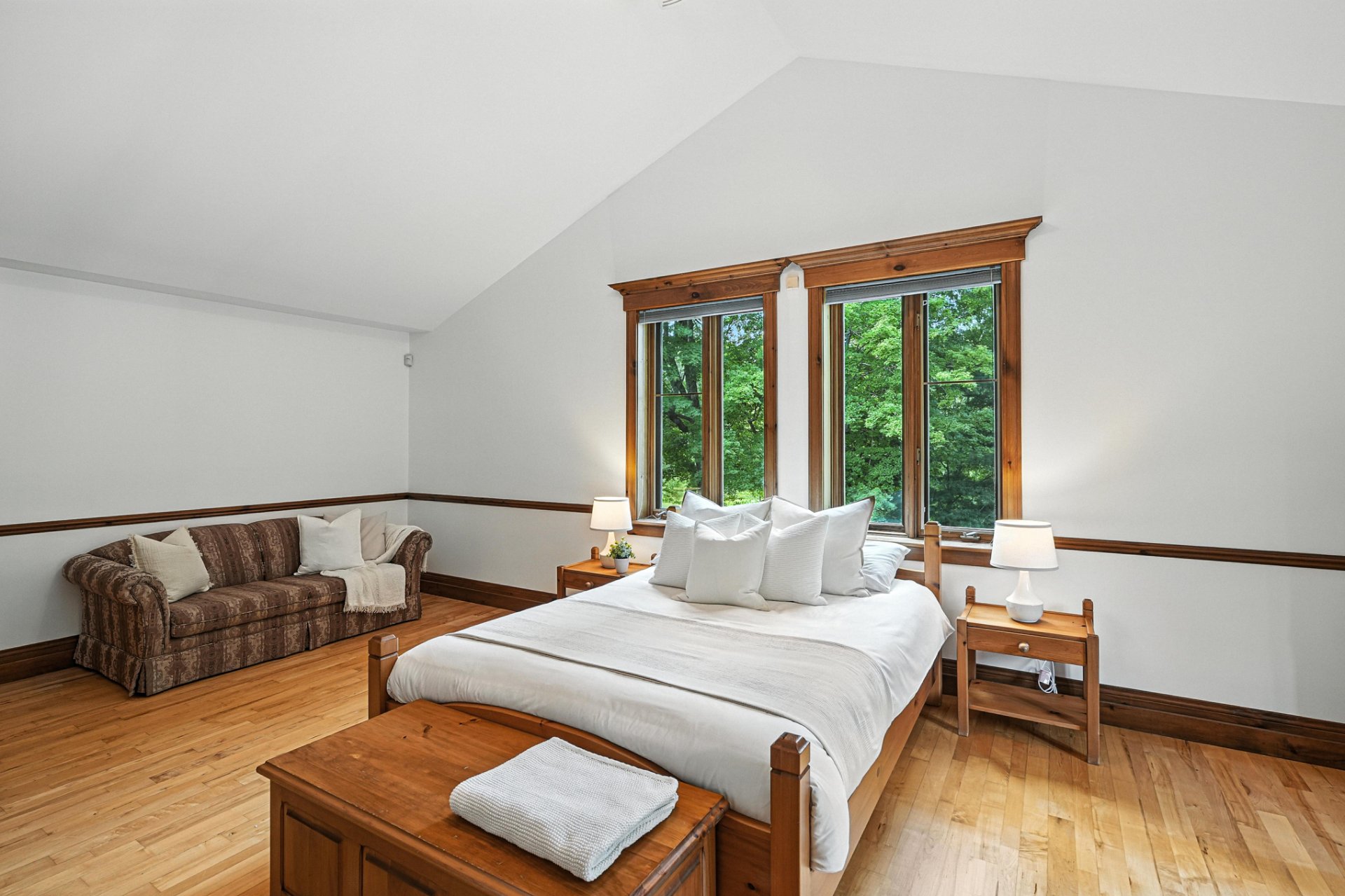The open concept floor plan features a large living room with a central wood-burning Masonry fireplace, a spacious dining room perfect for entertaining, and a chef's kitchen with solid wood cabinetry, ample work space and a large double-sided stove. The sumptuous master suite is also on this floor, with a luxurious en suite bathroom, walk-in closet and refined finishes. The house is crowned by a remarkable solarium on the top floor; a serene, light-filled retreat ideal for reading, relaxing or enjoying panoramic views of treetops and golden sunsets.