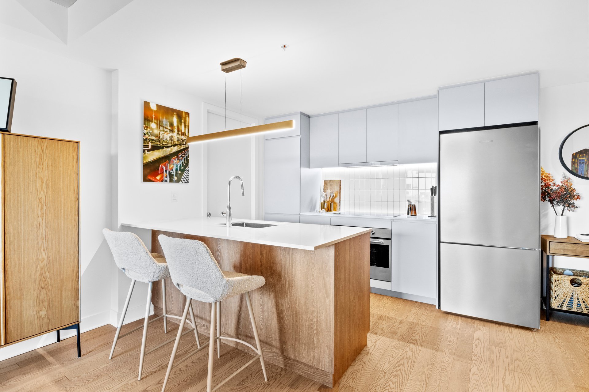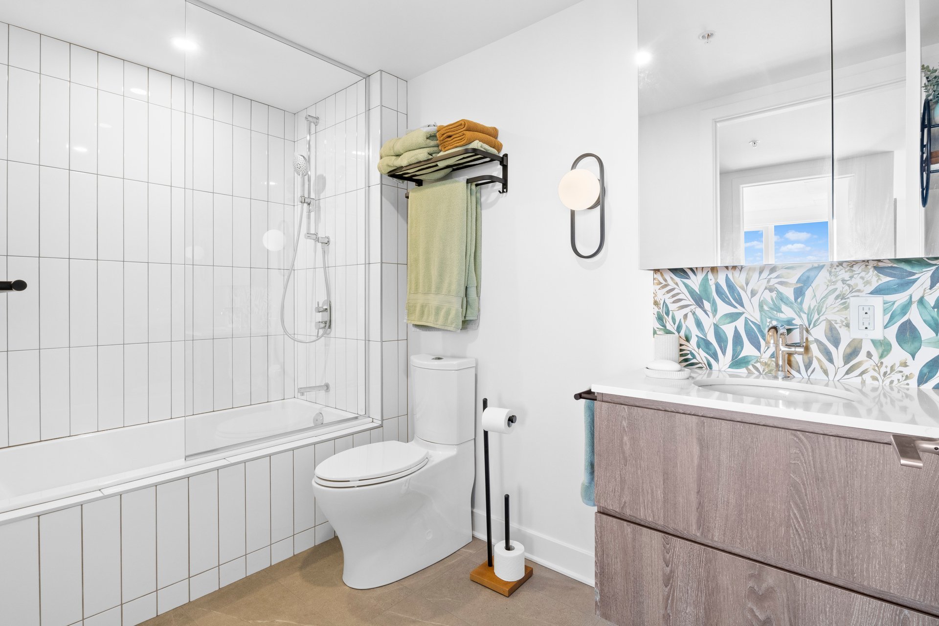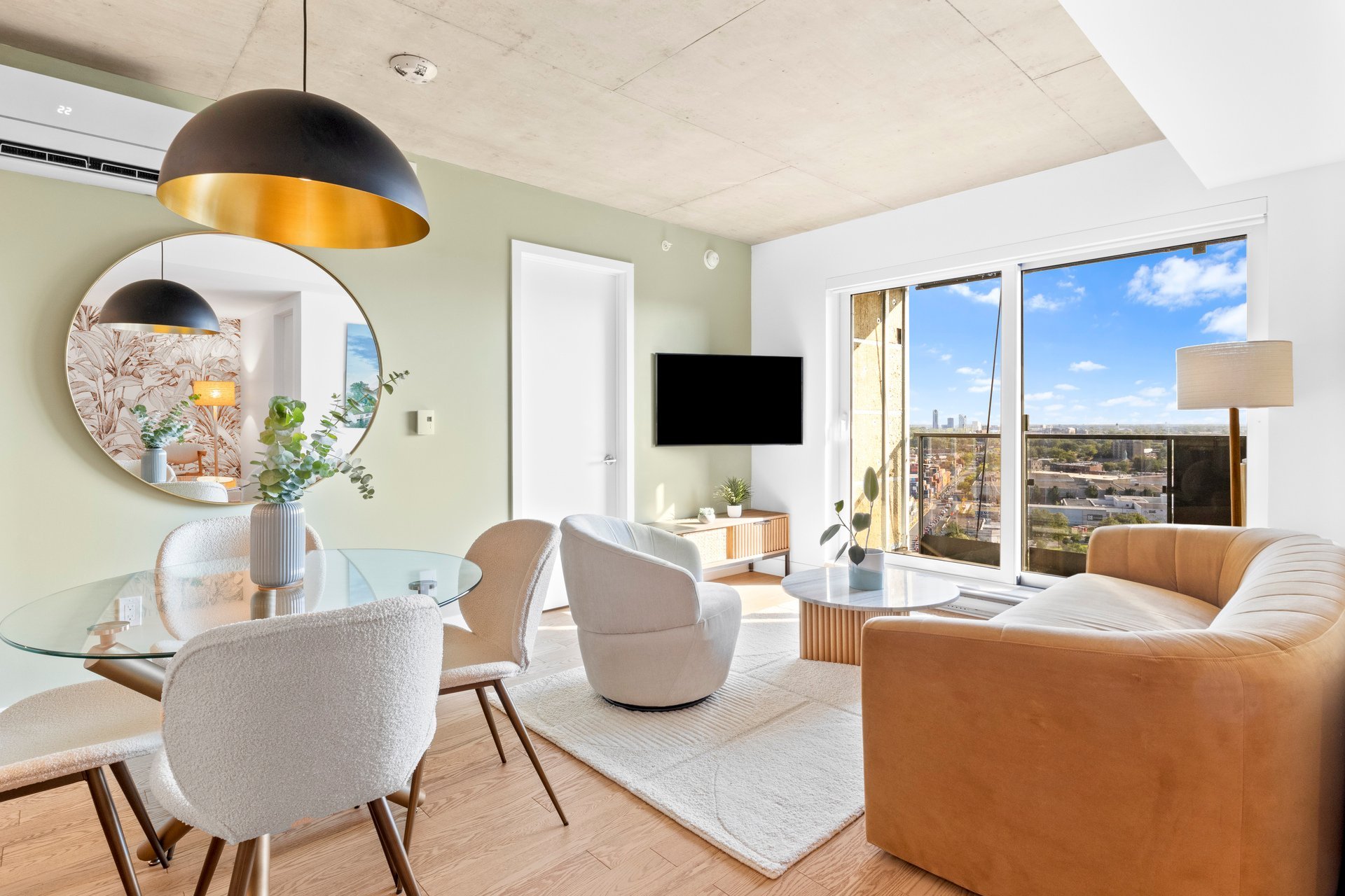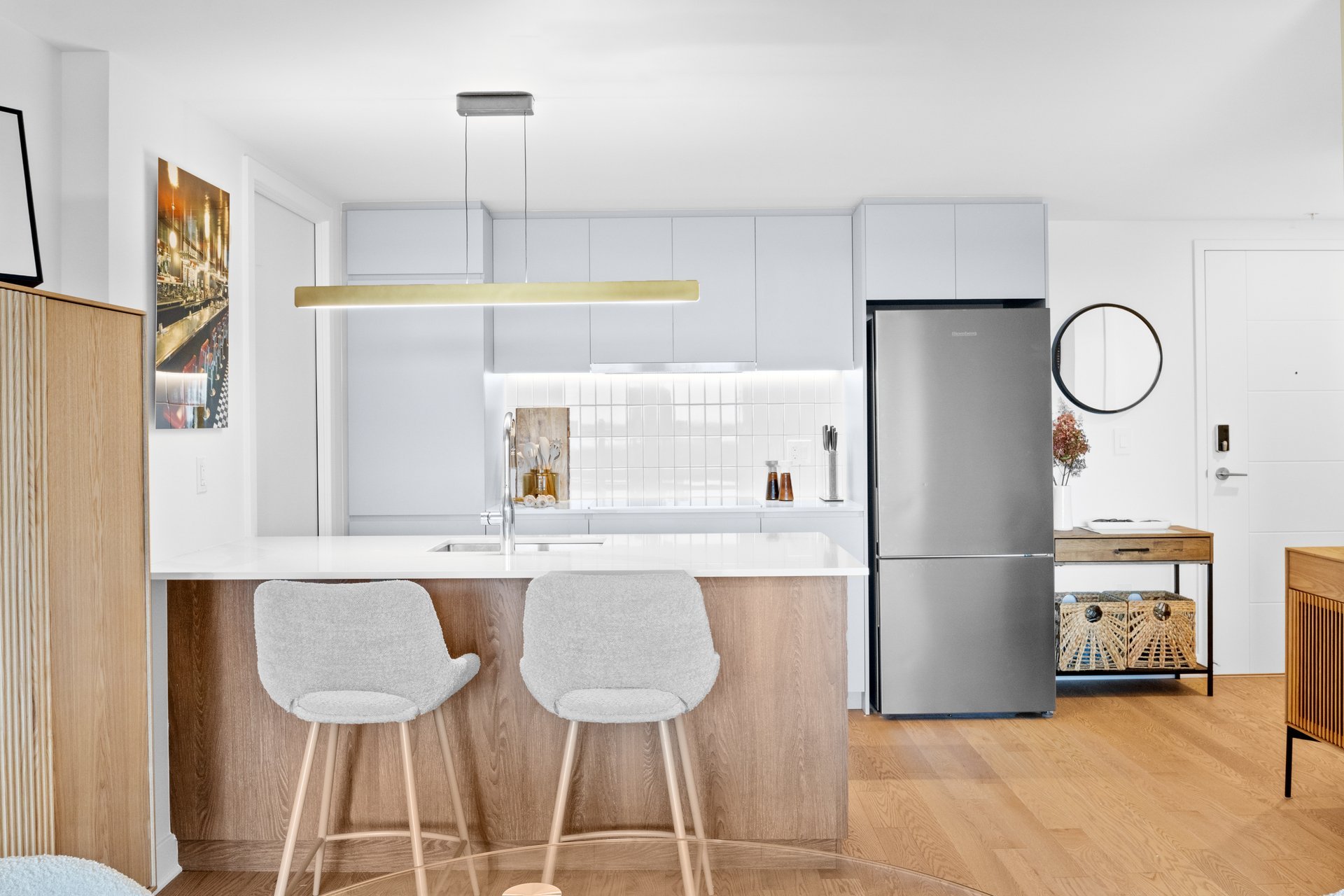 Perfect for temporary accomodations! Stunning two bedroom and two bathroom gem on the 19th floor, overlooking the water. Fully furnished and equipped with high end pieces, meticulously selected. Come in with your suitcase whether you're here visiting or need temporary housing while you're renovating.