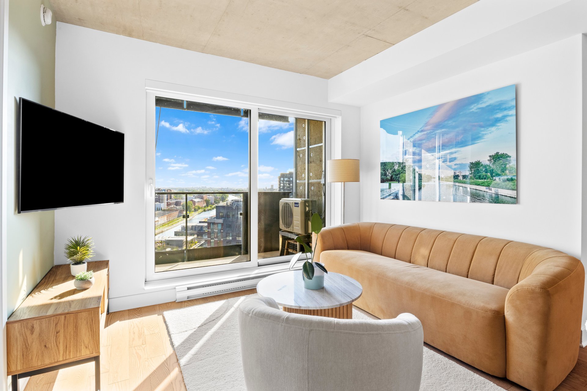 Take advantage of all the perks of being on the water with bike paths and on the other side, Peel street with all its restaurants, shops, grocery stores and services.