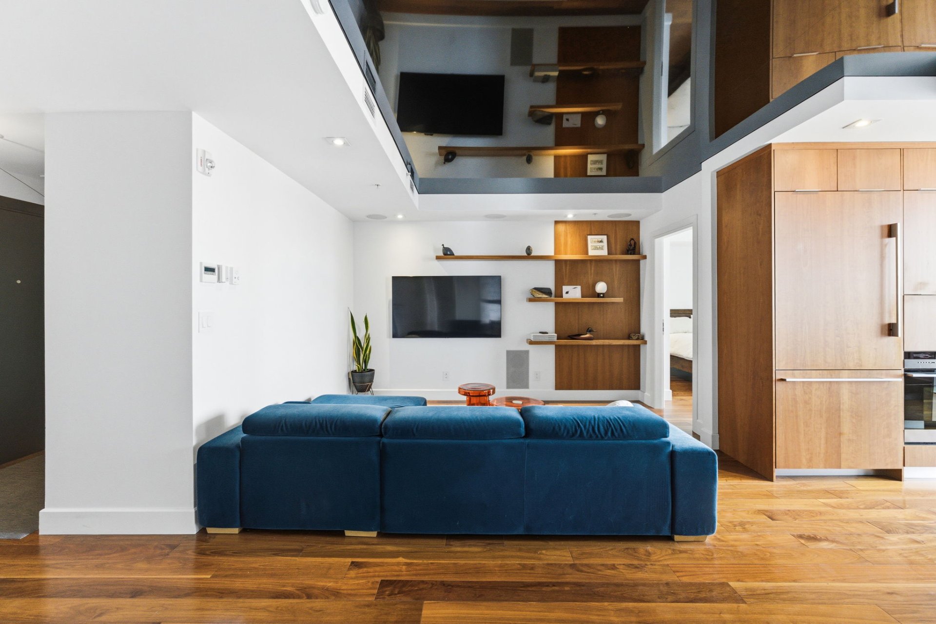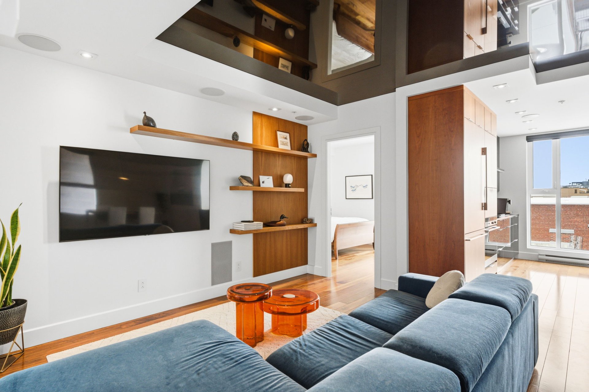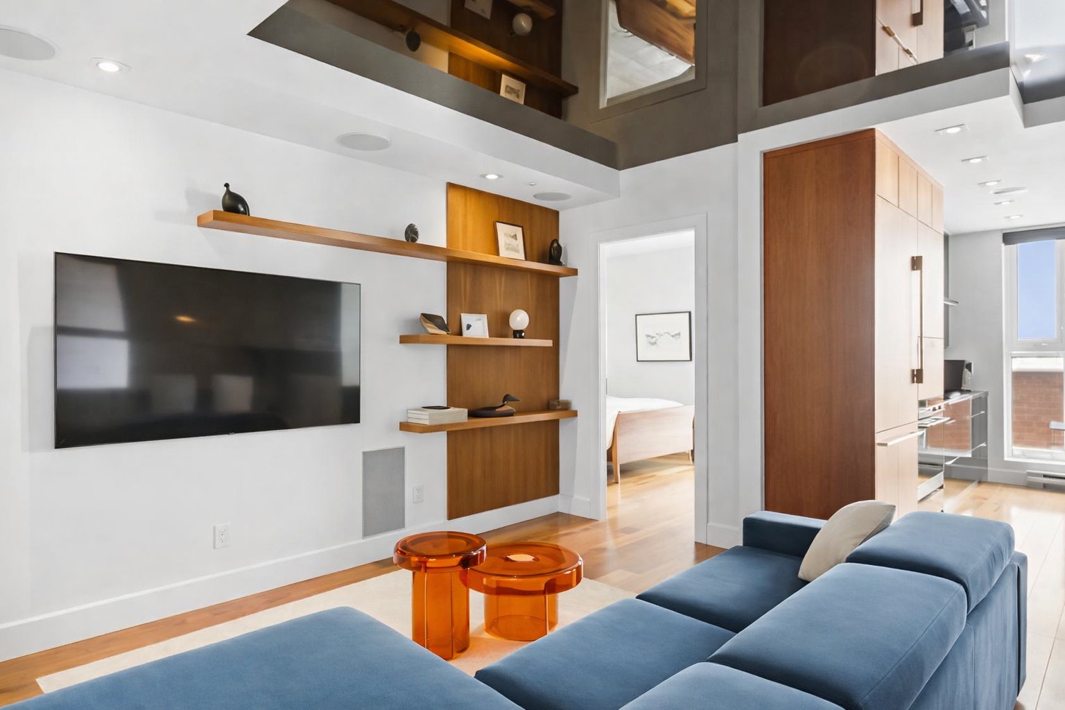 - Light fixtures, washer, dryer, alarm system, cooktop, refrigerator, two dishwashers, electric vehicle charging station in the garage, metal shelving system in the walk-in closet, window coverings, two electric garage door openers, two wall-mounted televisions (bedroom and living room), sound system components, wine cellar (non-functional refrigerator).