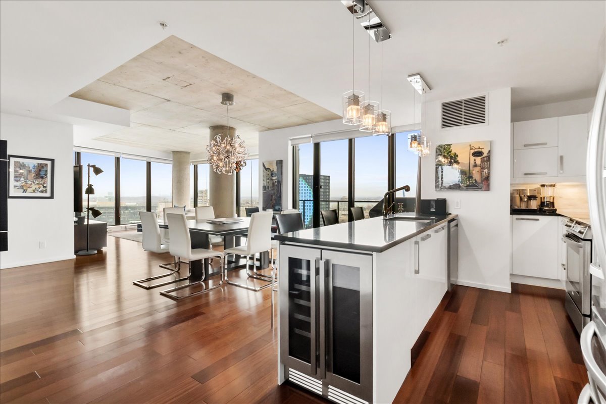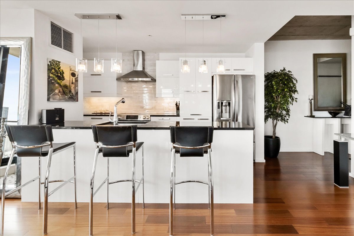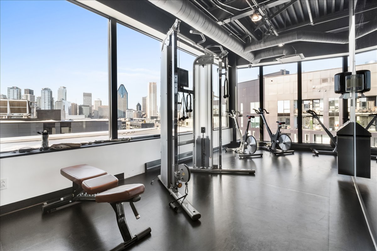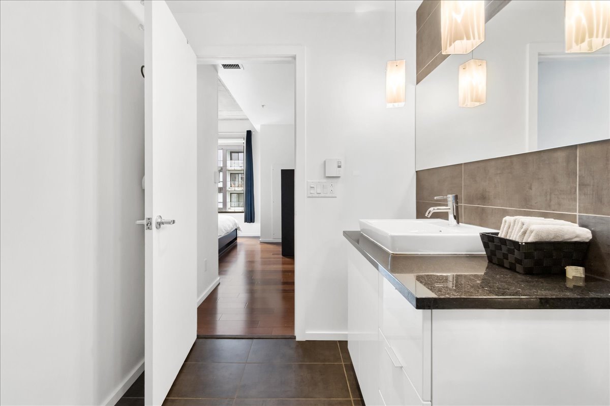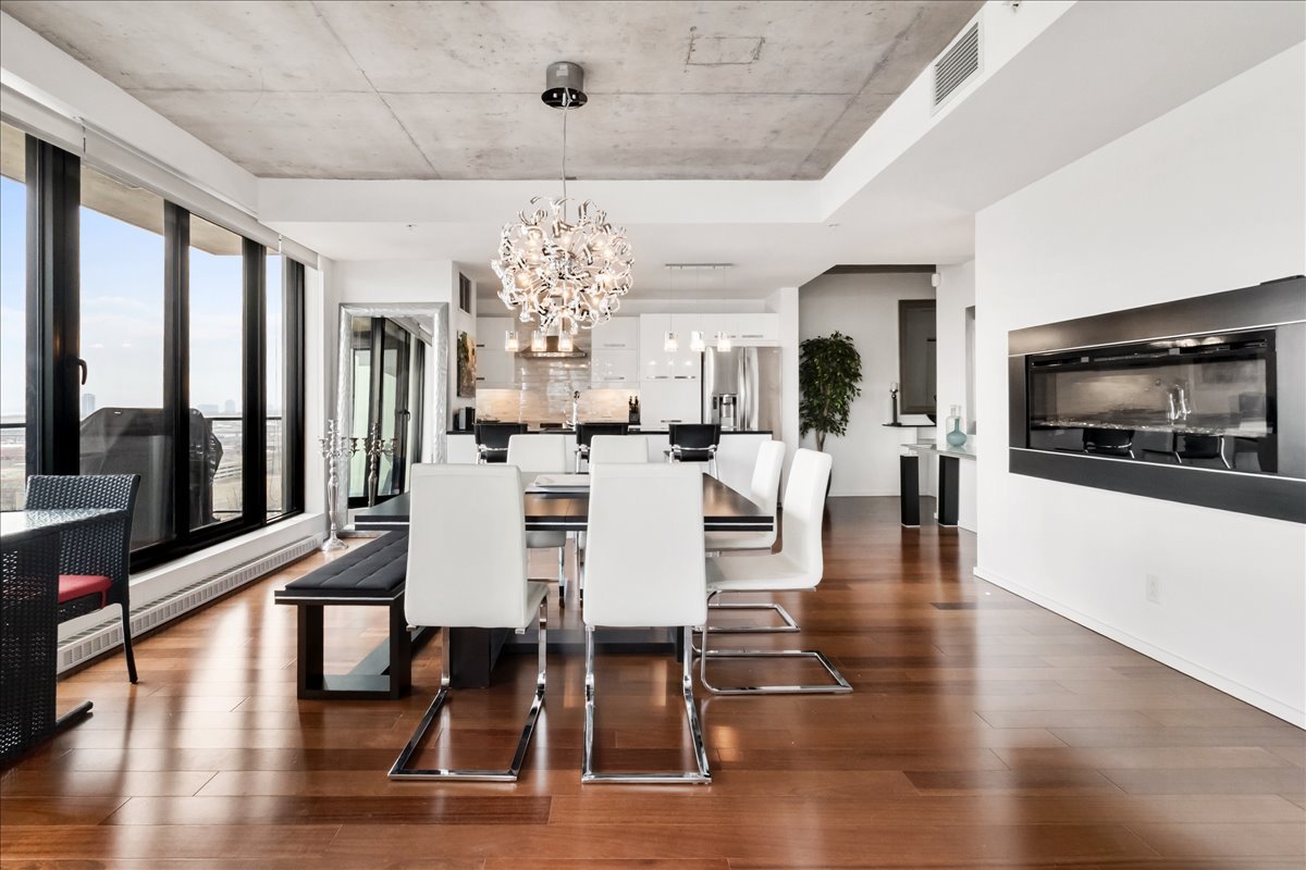 This corner unit stands out with its abundant natural light, expansive windows and unobstructed views. It offers remarkable views of the Old Port, the bridges, the Farine Five Roses sign, Peel Basin and Peel Street, while overlooking the bike path and the Lachine Canal. The open-concept living area seamlessly connects the living room, dining room and kitchen. The unit features two bedrooms and two bathrooms, including an ensuite to the primary bedroom.