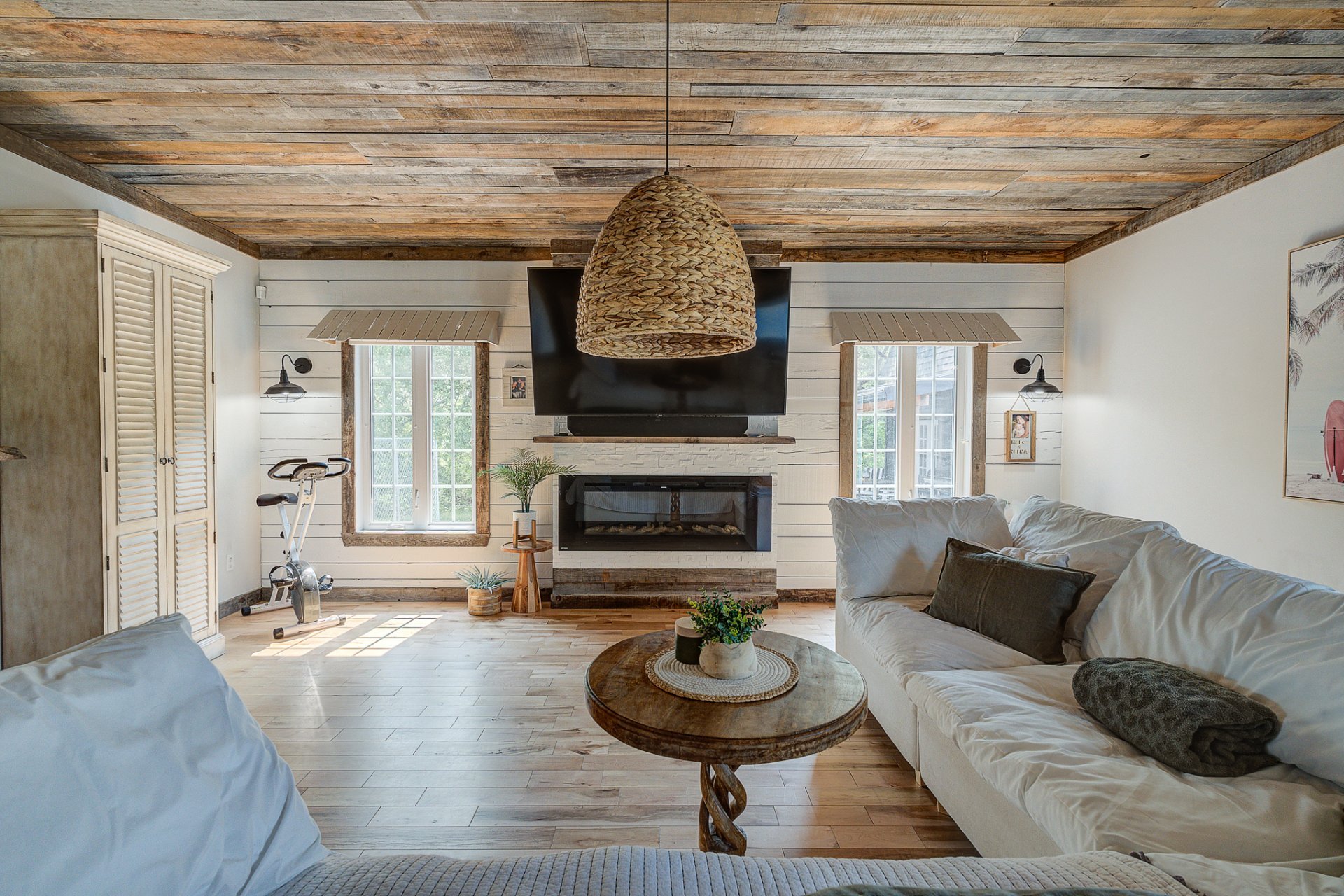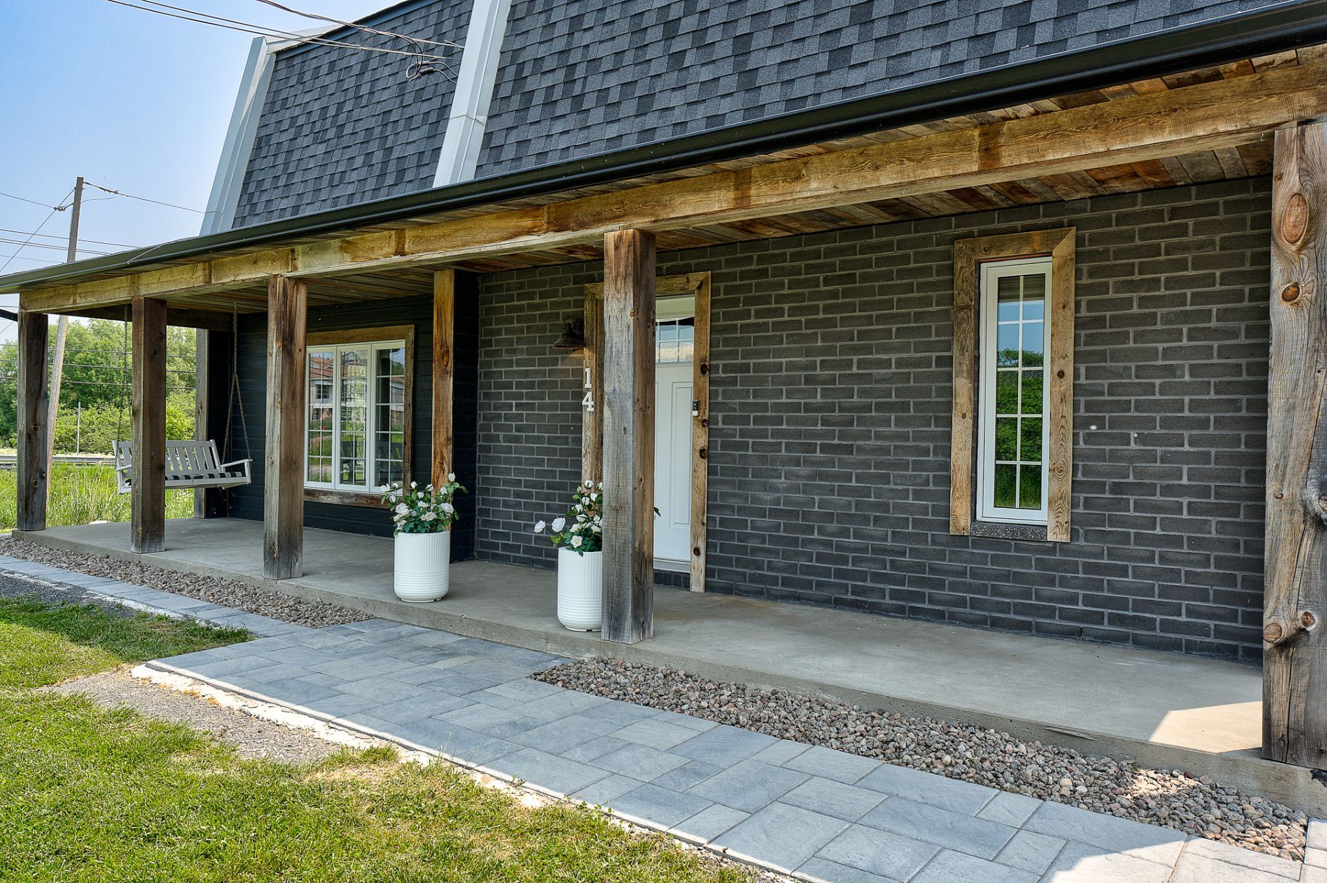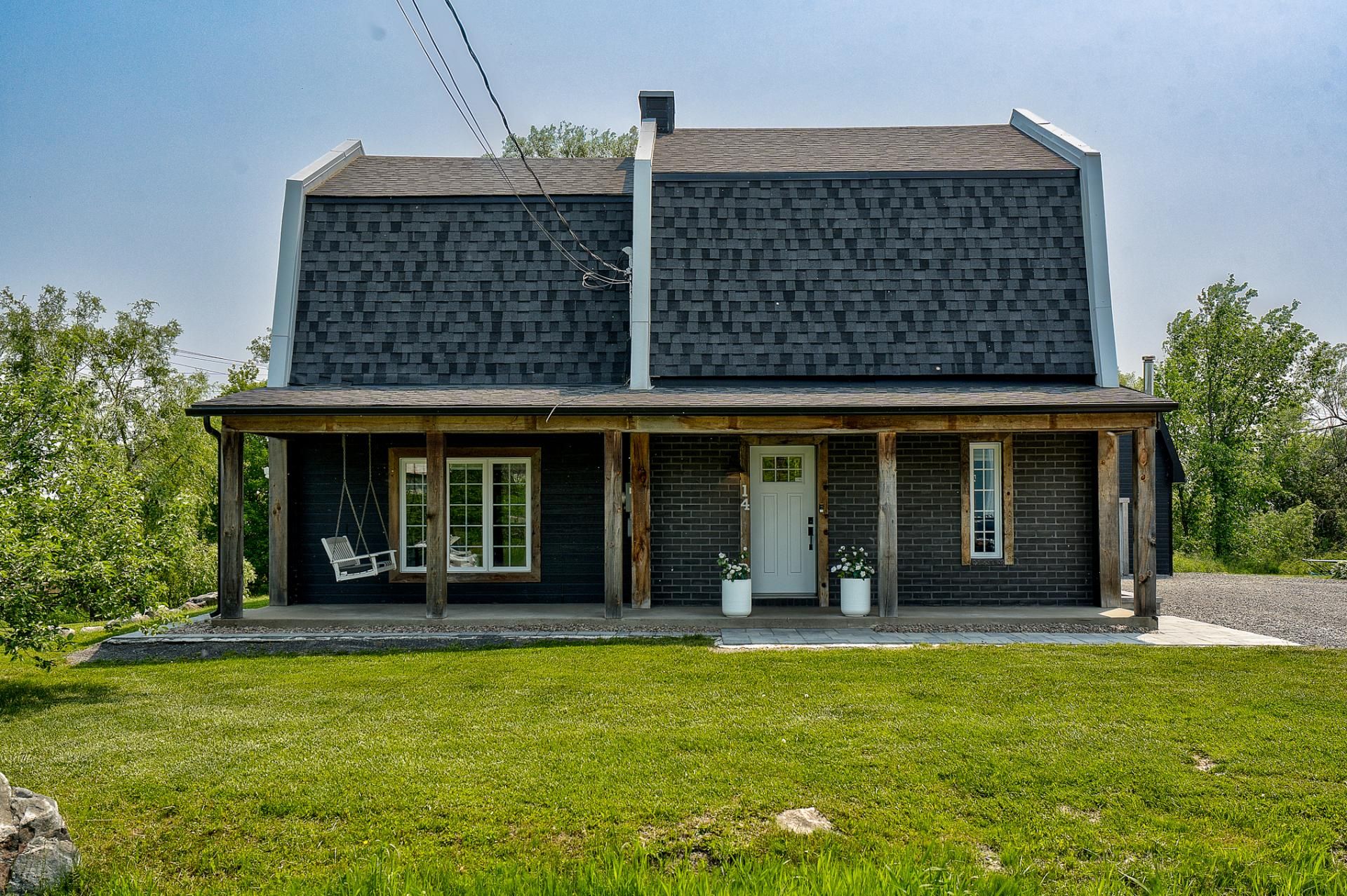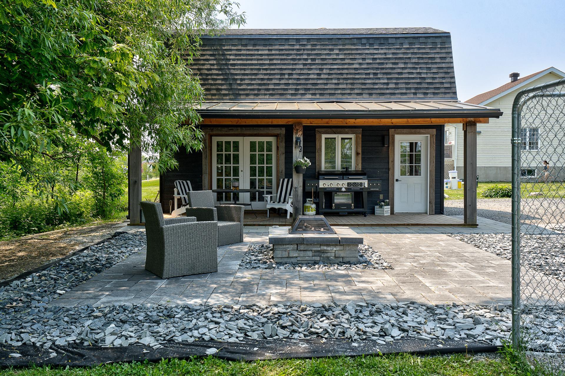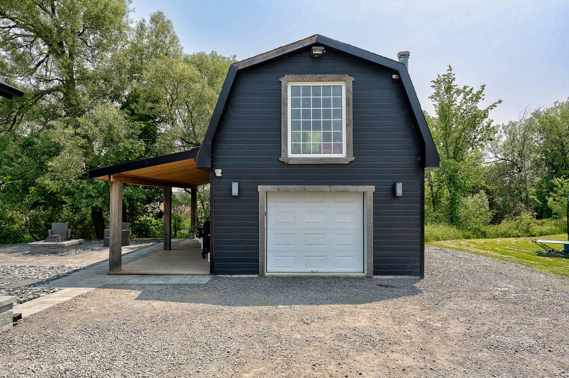 Set on a spacious, green lot, this renovated home perfectly balances charm and simplicity. The living room, flooded with light, reveals exposed beams and a soothing atmosphere. The kitchen, with its modern lines and elegant contrast, opens onto a dining room featuring a stone wall where time seems to stand still. A thoughtfully designed half-bath discreetly houses the laundry area, blending comfort and functionality without disturbing the harmony of the space. Upstairs, two bright bedrooms and a sleek bathroom invite rest -- with room reserved to imagine a third bedroom. The detached garage, topped with an upper level, offers great potential: a guest suite, workshop, creative retreat... Outside, a paved fire pit area extends evenings under the stars in a warm and peaceful ambiance.