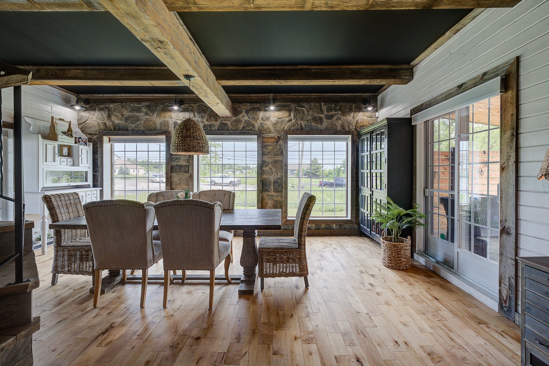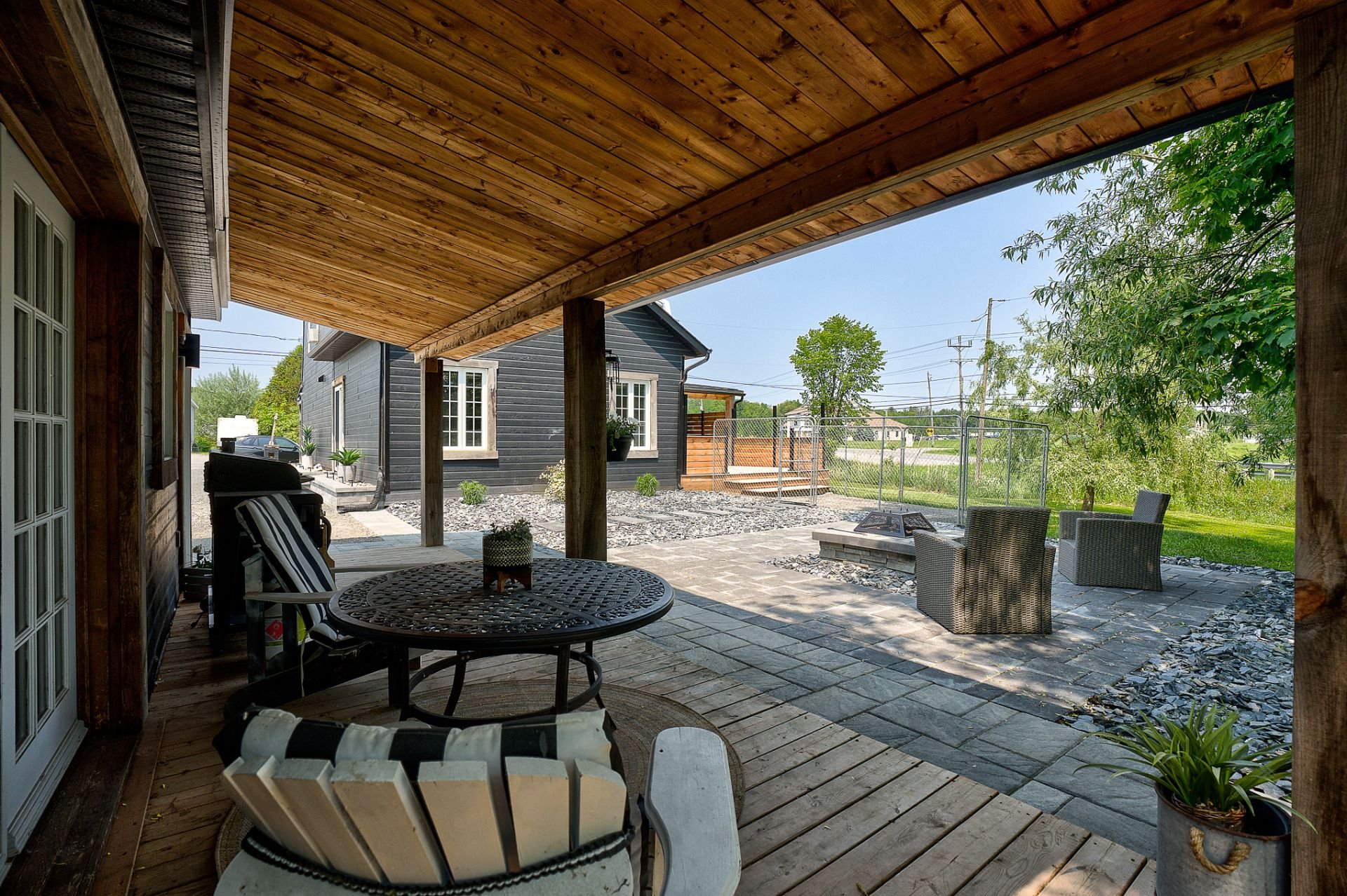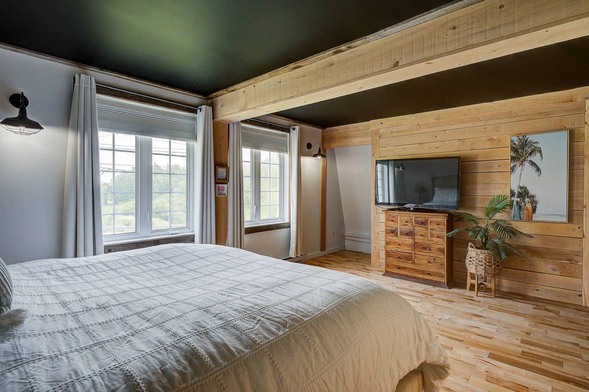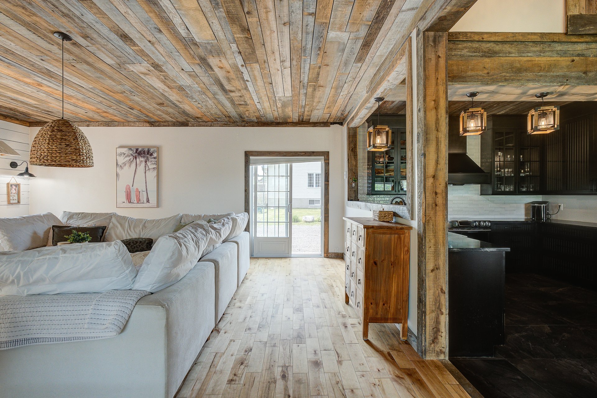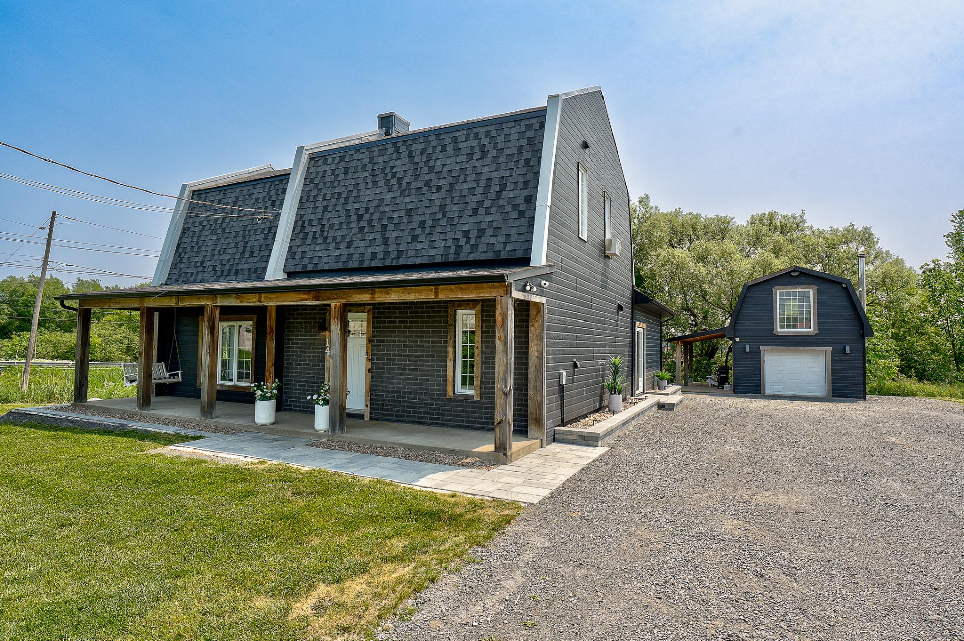 Set on a spacious, green lot, this renovated home perfectly balances charm and simplicity. The living room, flooded with light, reveals exposed beams and a soothing atmosphere. The kitchen, with its modern lines and elegant contrast, opens onto a dining room featuring a stone wall where time seems to stand still. A thoughtfully designed half-bath discreetly houses the laundry area, blending comfort and functionality without disturbing the harmony of the space. Upstairs, two bright bedrooms and a sleek bathroom invite rest -- with room reserved to imagine a third bedroom. The detached garage, topped with an upper level, offers great potential: a guest suite, workshop, creative retreat... Outside, a paved fire pit area extends evenings under the stars in a warm and peaceful ambiance.