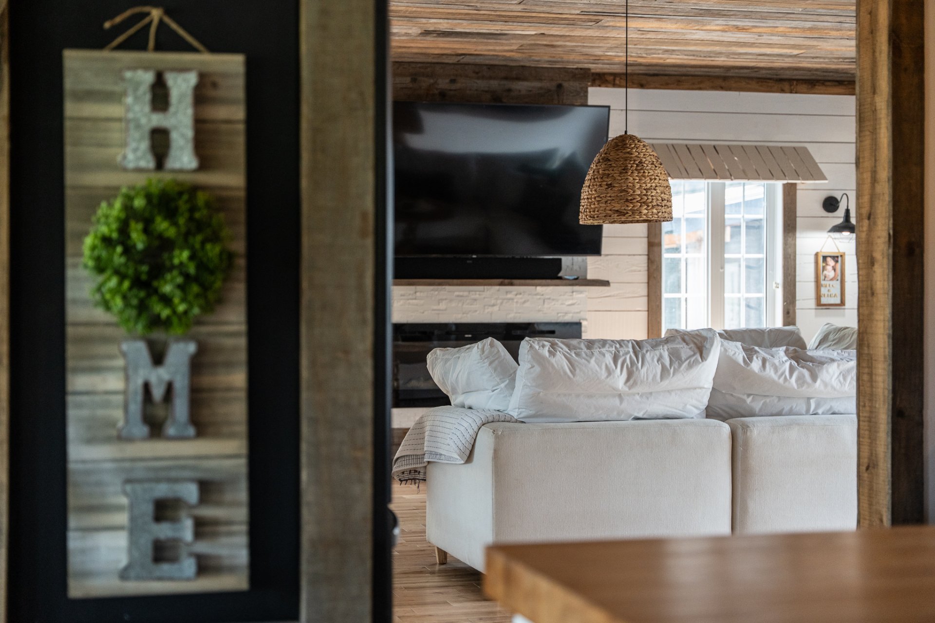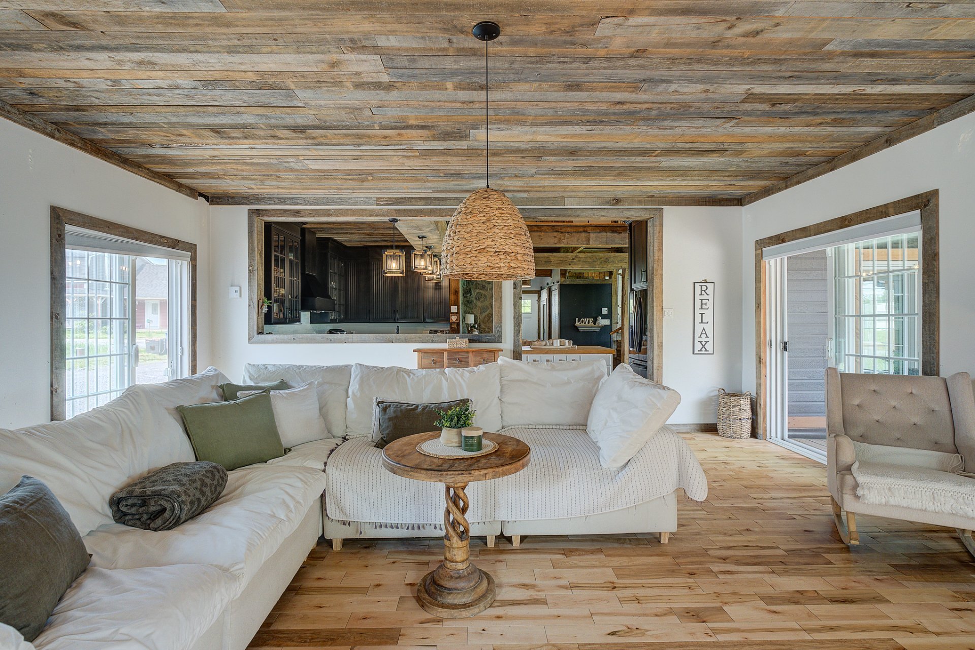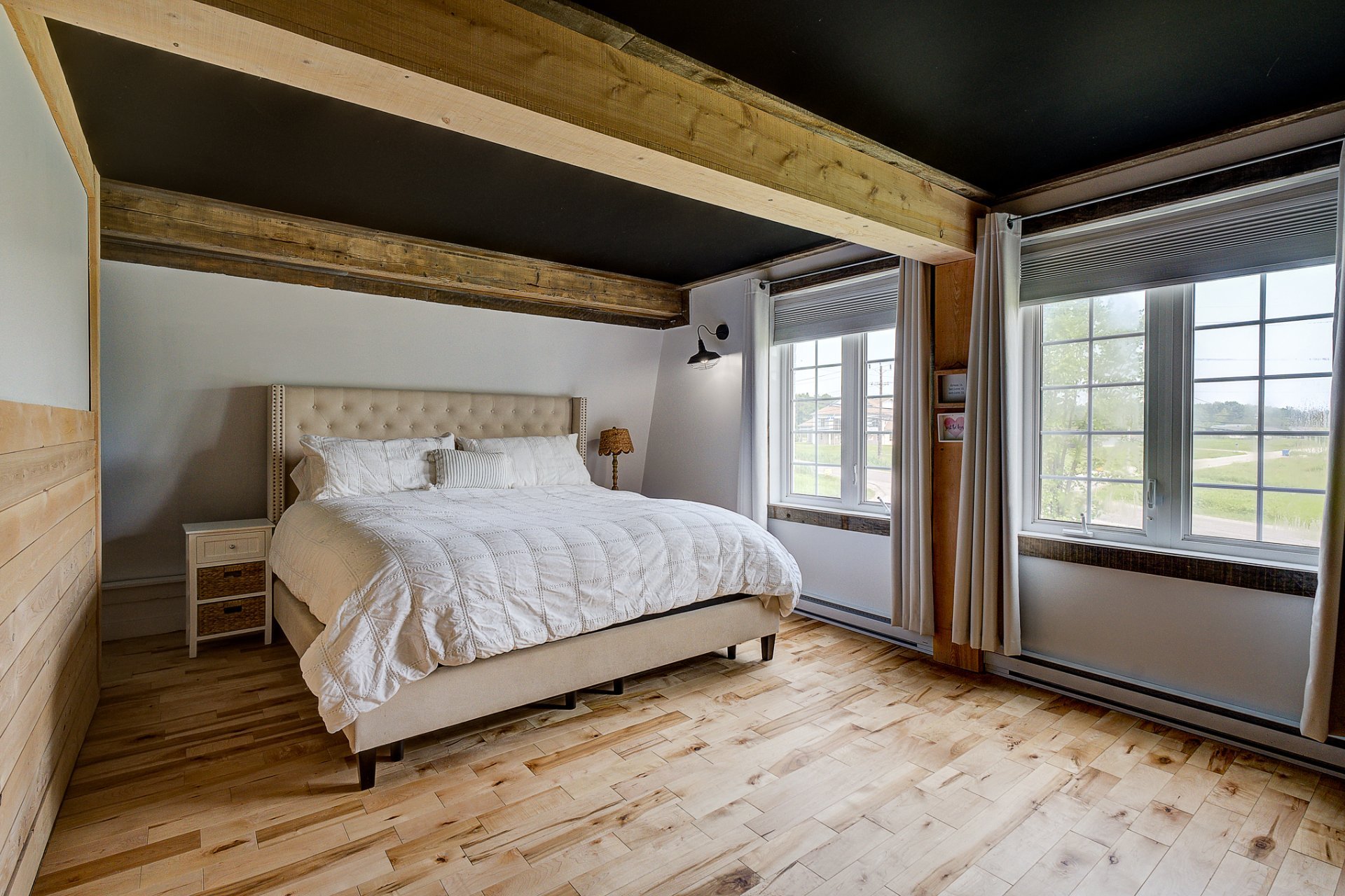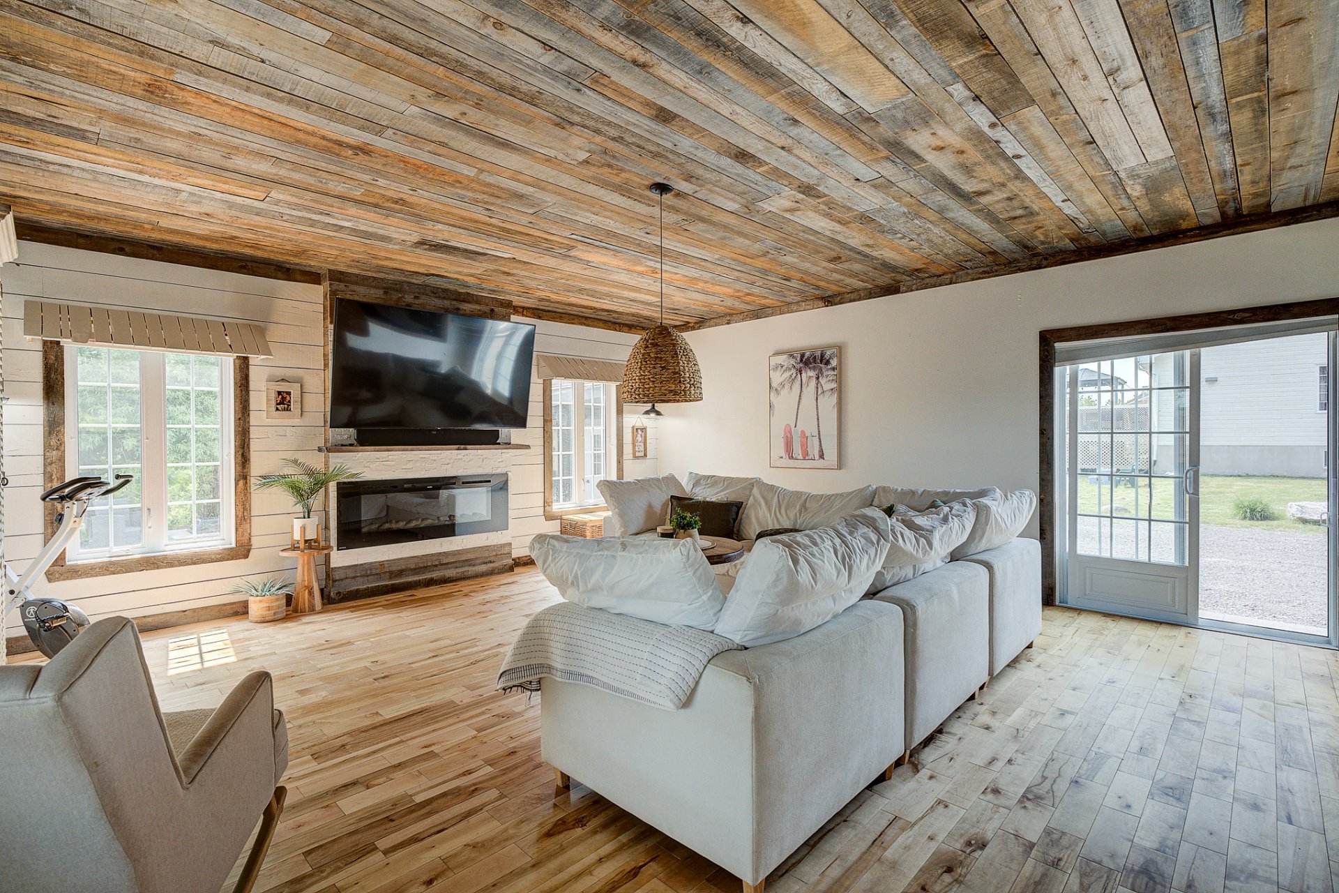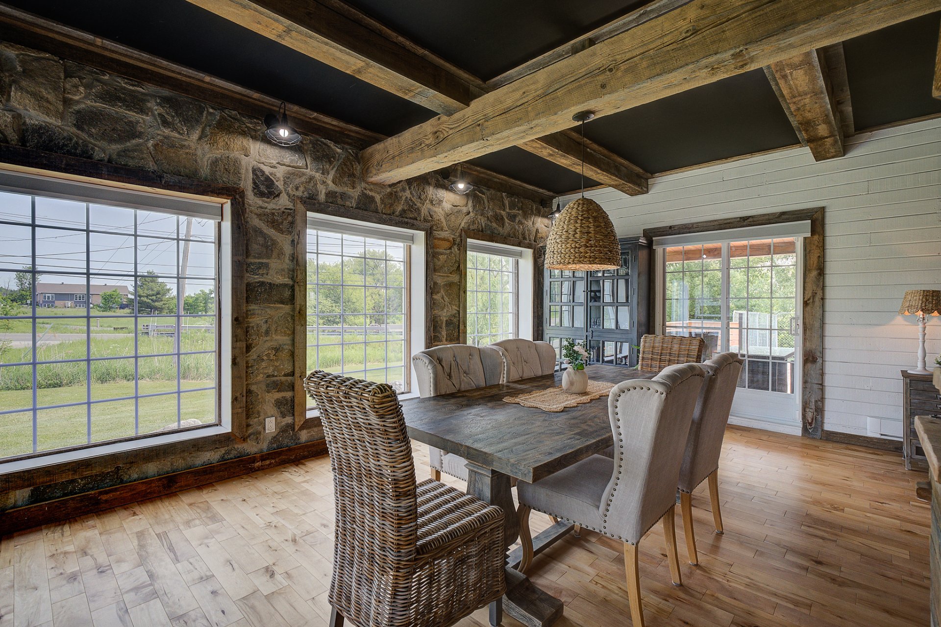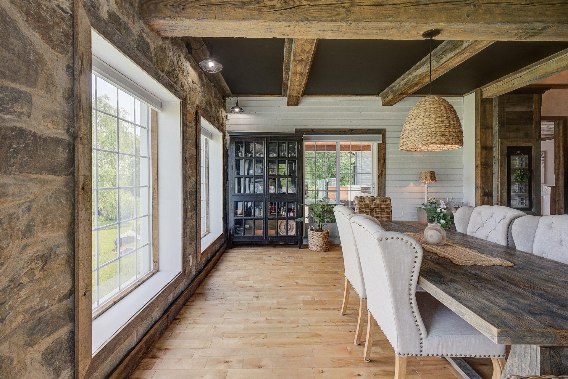 Set on a spacious, green lot, this renovated home perfectly balances charm and simplicity. The living room, flooded with light, reveals exposed beams and a soothing atmosphere. The kitchen, with its modern lines and elegant contrast, opens onto a dining room featuring a stone wall where time seems to stand still. A thoughtfully designed half-bath discreetly houses the laundry area, blending comfort and functionality without disturbing the harmony of the space. Upstairs, two bright bedrooms and a sleek bathroom invite rest -- with room reserved to imagine a third bedroom. The detached garage, topped with an upper level, offers great potential: a guest suite, workshop, creative retreat... Outside, a paved fire pit area extends evenings under the stars in a warm and peaceful ambiance.