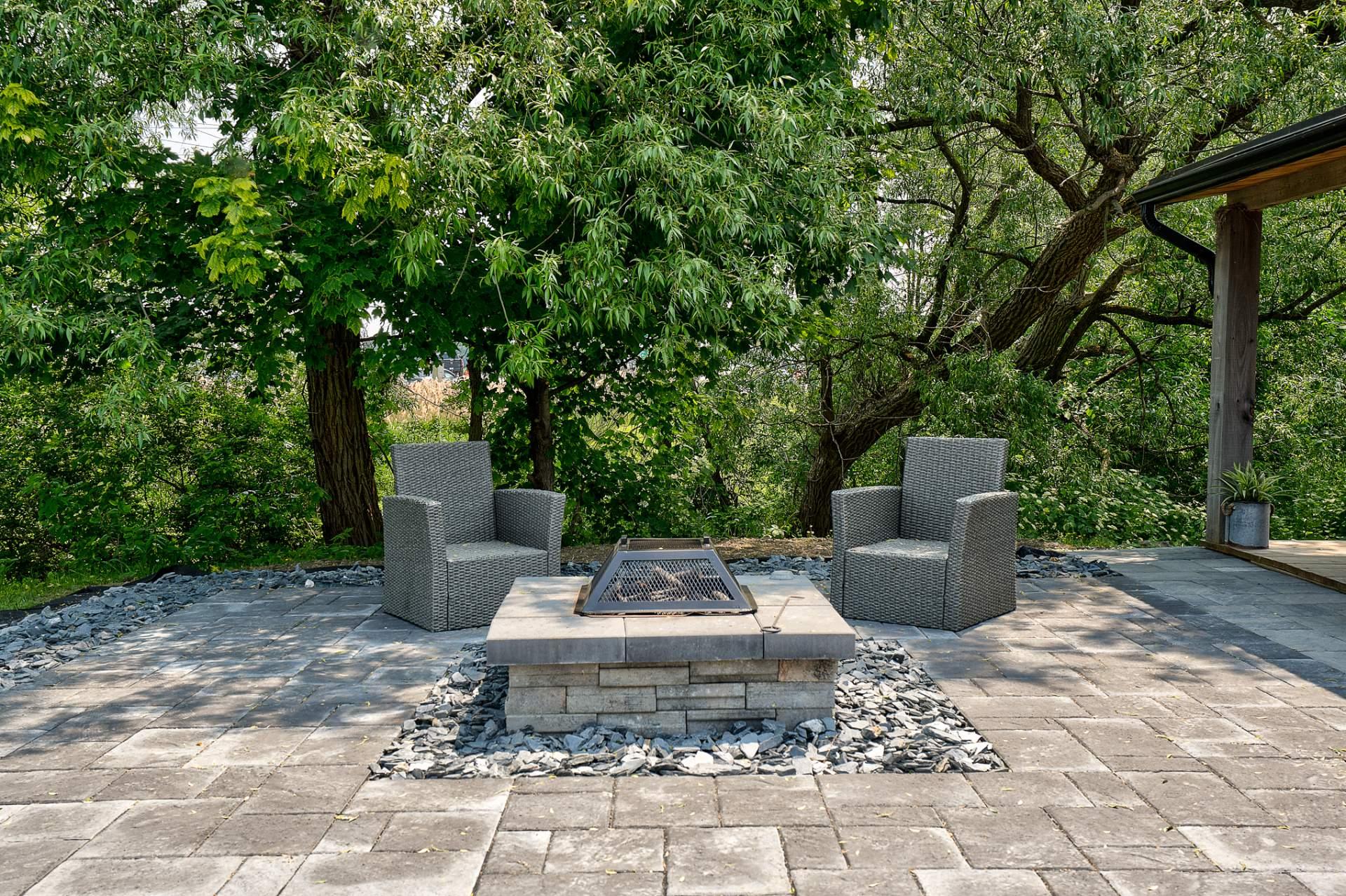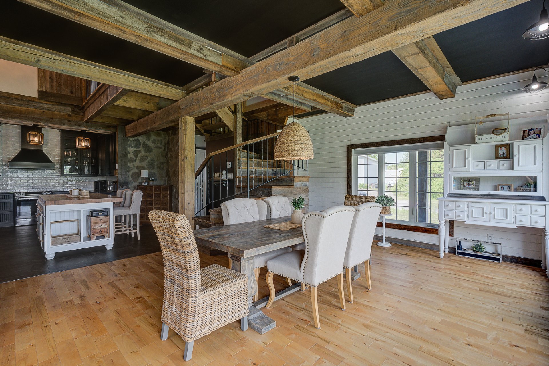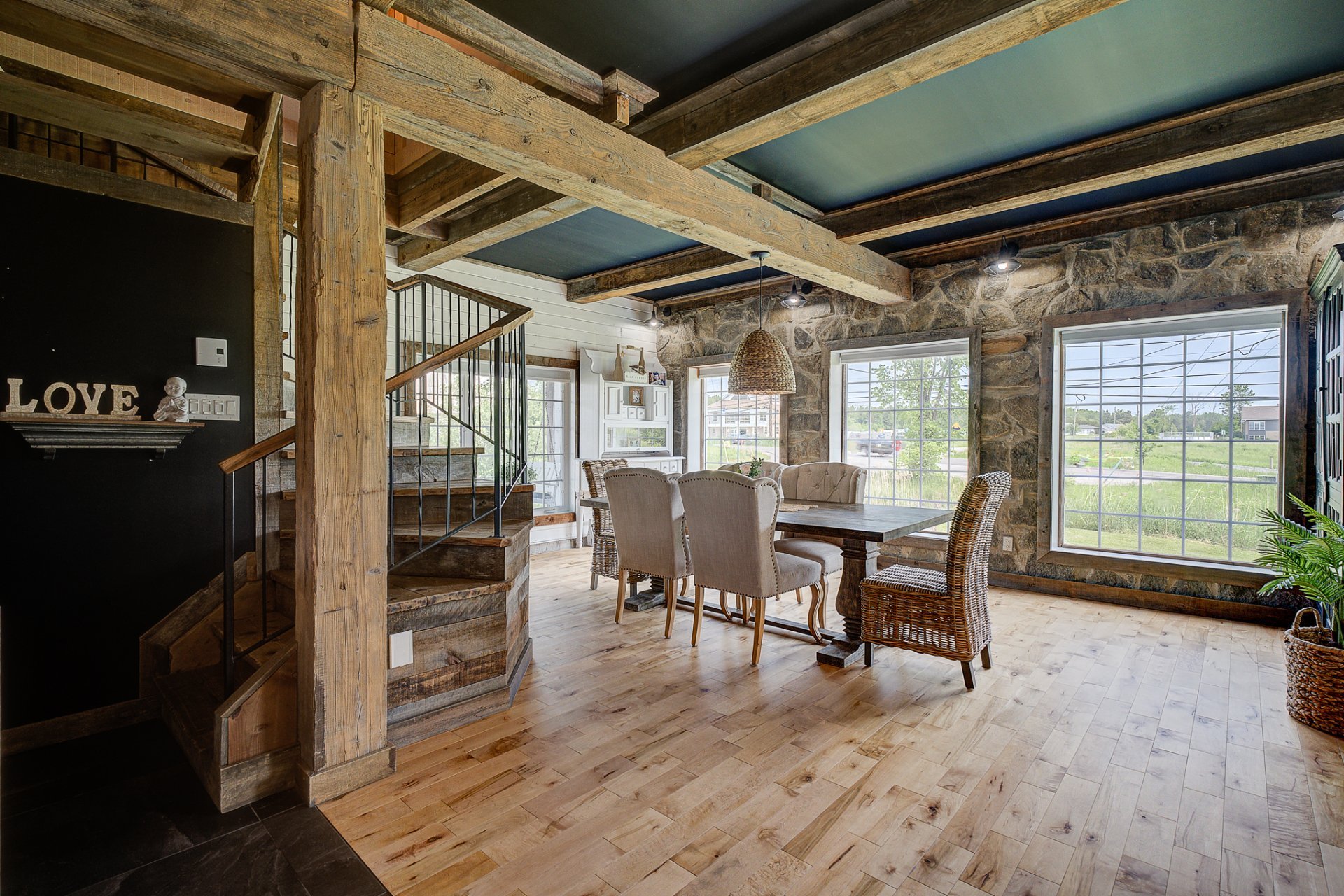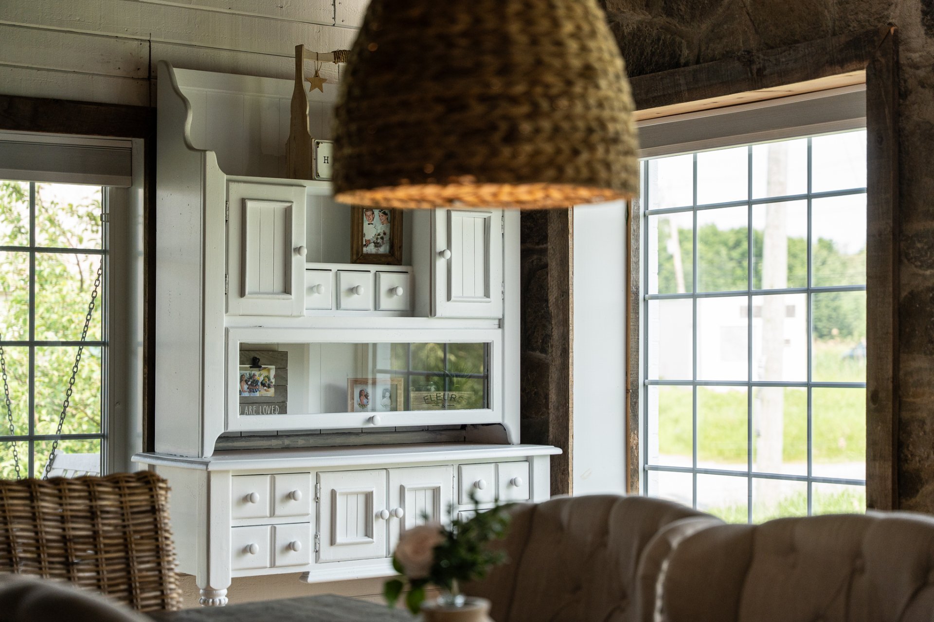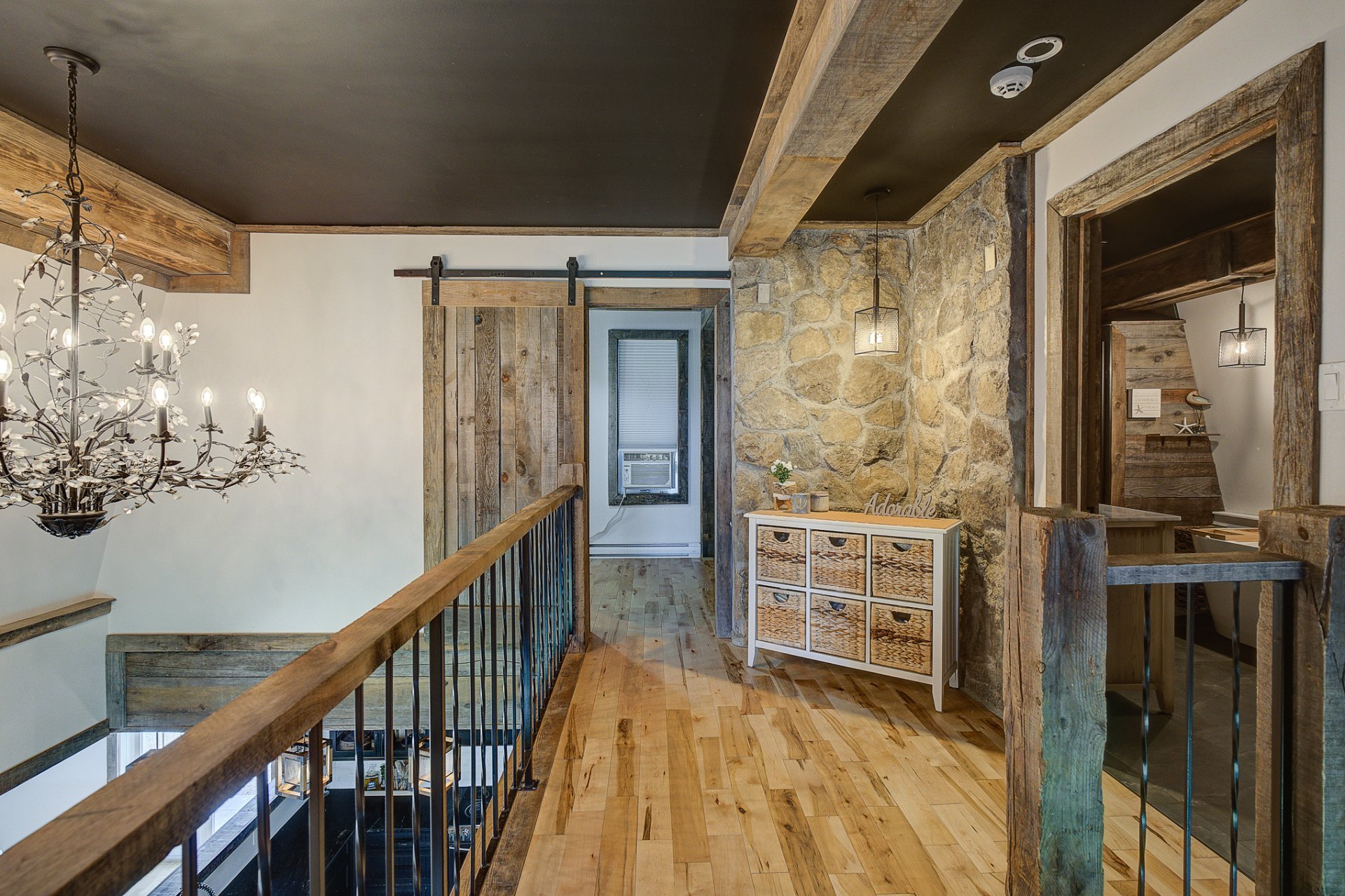 Set on a spacious, green lot, this renovated home perfectly balances charm and simplicity. The living room, flooded with light, reveals exposed beams and a soothing atmosphere. The kitchen, with its modern lines and elegant contrast, opens onto a dining room featuring a stone wall where time seems to stand still. A thoughtfully designed half-bath discreetly houses the laundry area, blending comfort and functionality without disturbing the harmony of the space. Upstairs, two bright bedrooms and a sleek bathroom invite rest -- with room reserved to imagine a third bedroom. The detached garage, topped with an upper level, offers great potential: a guest suite, workshop, creative retreat... Outside, a paved fire pit area extends evenings under the stars in a warm and peaceful ambiance.