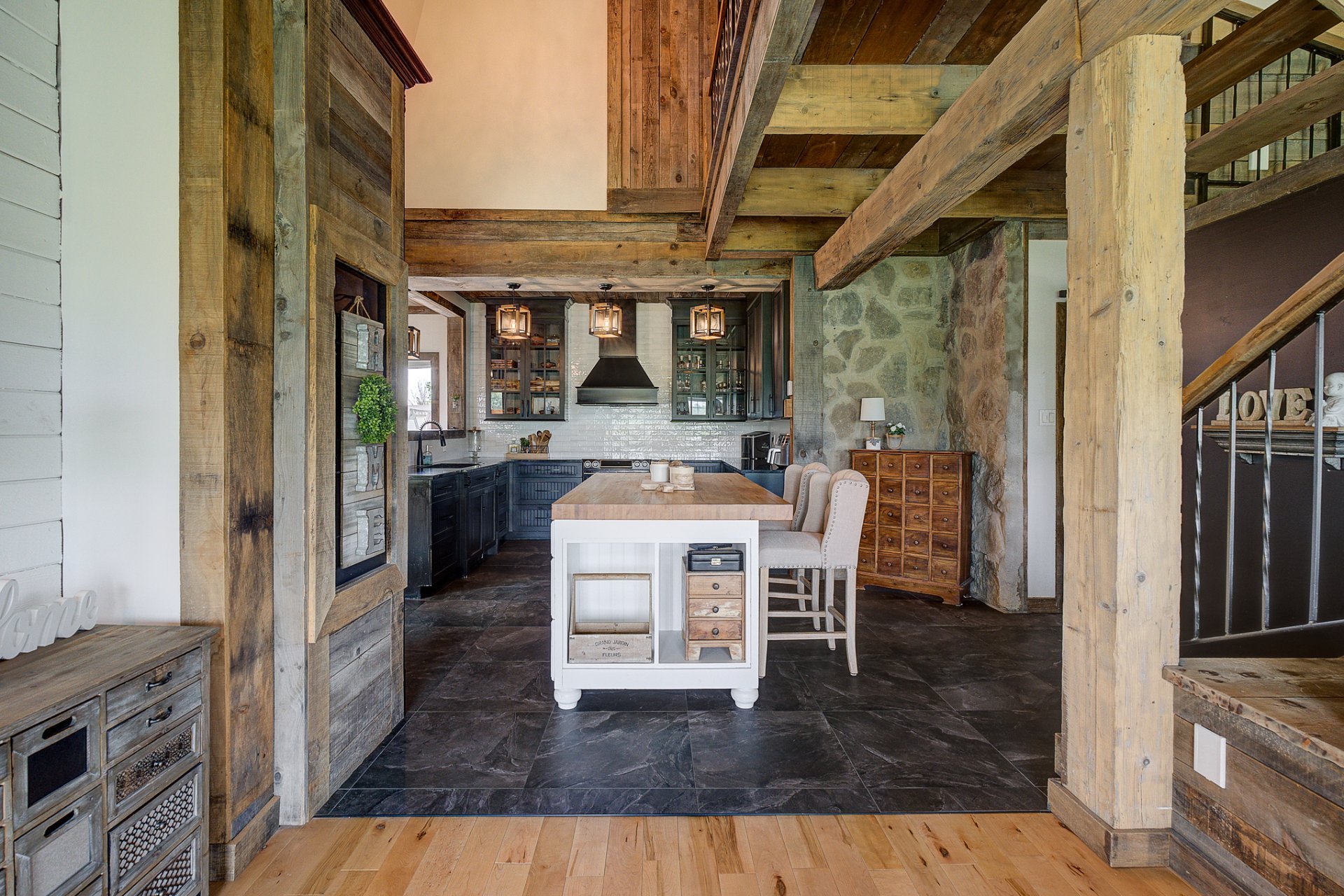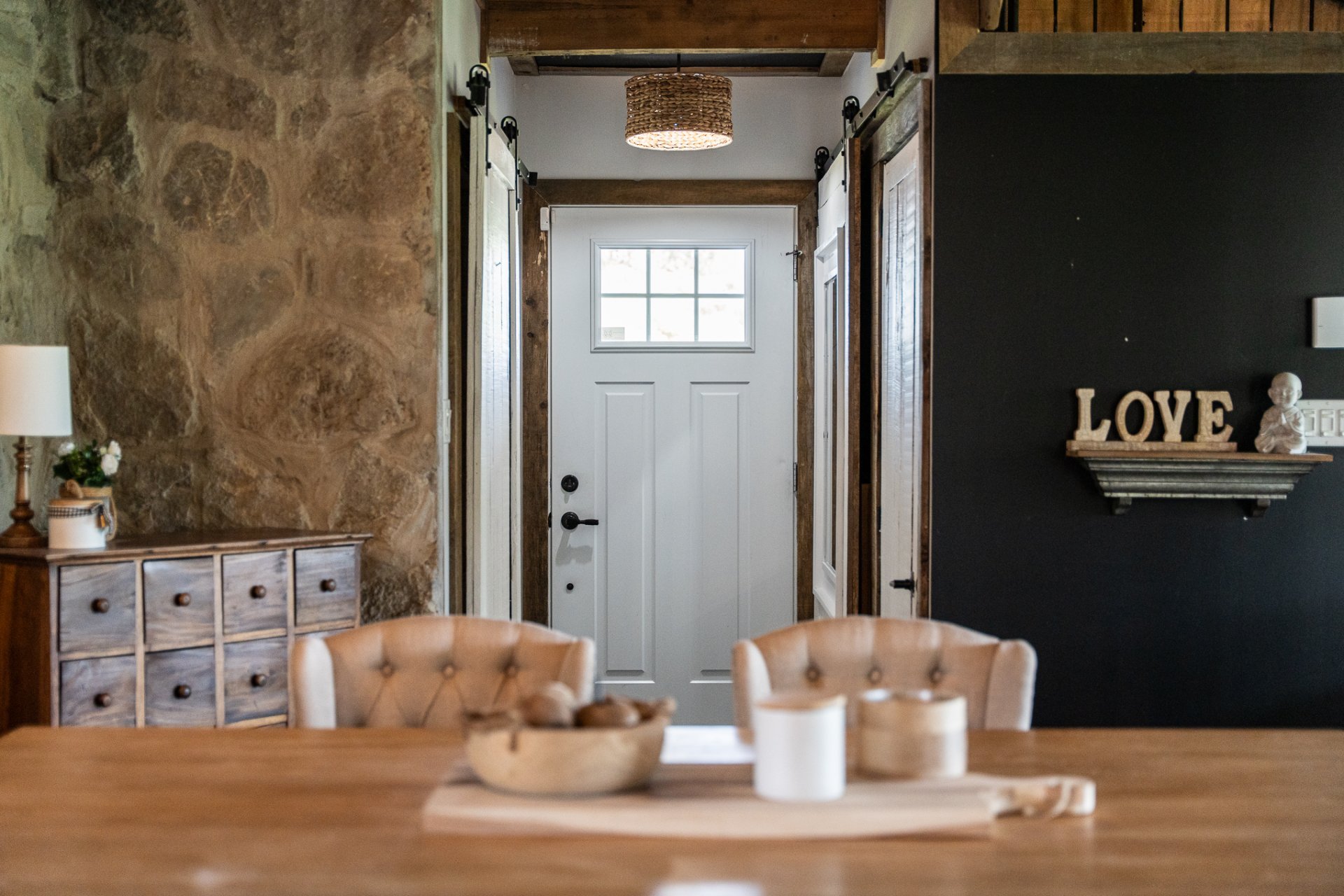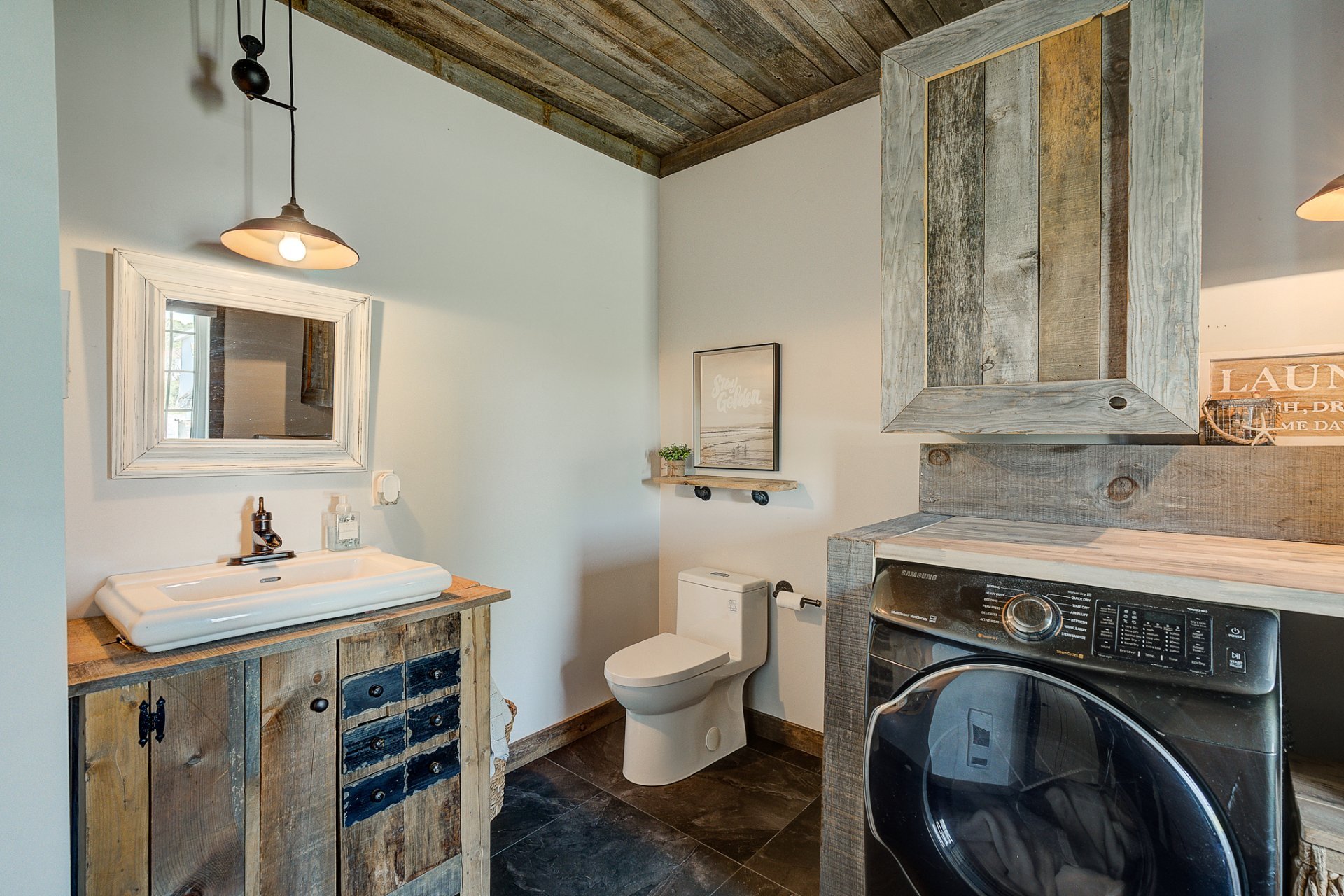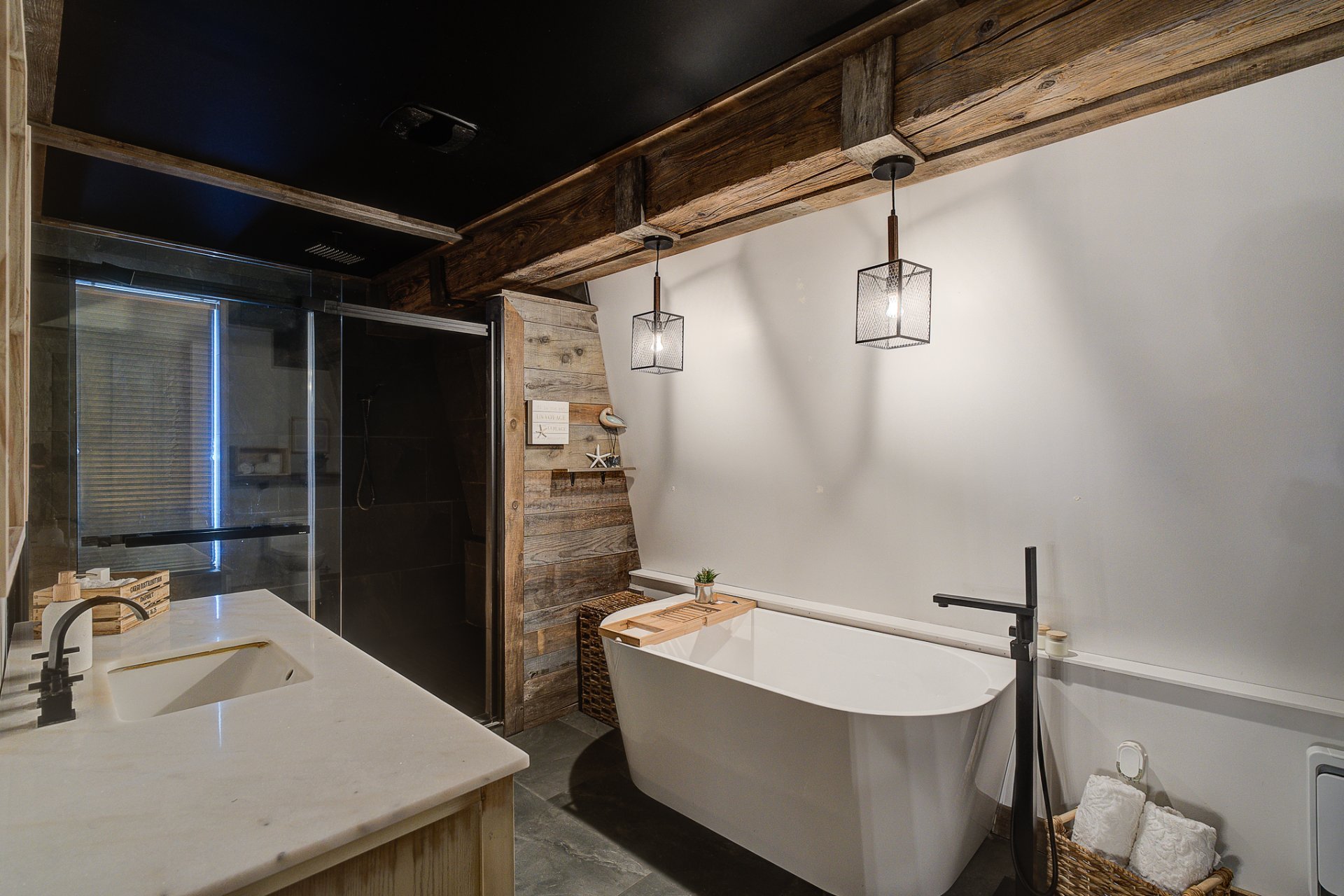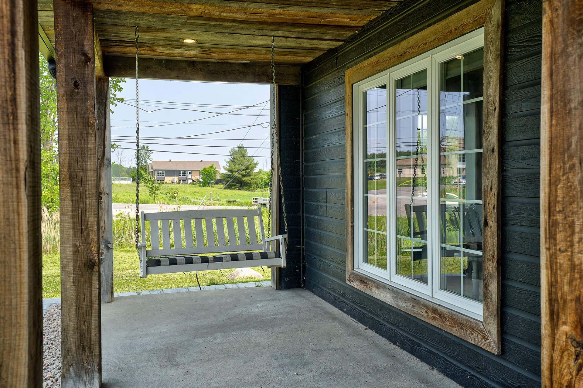 Set on a spacious, green lot, this renovated home perfectly balances charm and simplicity. The living room, flooded with light, reveals exposed beams and a soothing atmosphere. The kitchen, with its modern lines and elegant contrast, opens onto a dining room featuring a stone wall where time seems to stand still. A thoughtfully designed half-bath discreetly houses the laundry area, blending comfort and functionality without disturbing the harmony of the space. Upstairs, two bright bedrooms and a sleek bathroom invite rest -- with room reserved to imagine a third bedroom. The detached garage, topped with an upper level, offers great potential: a guest suite, workshop, creative retreat... Outside, a paved fire pit area extends evenings under the stars in a warm and peaceful ambiance.
