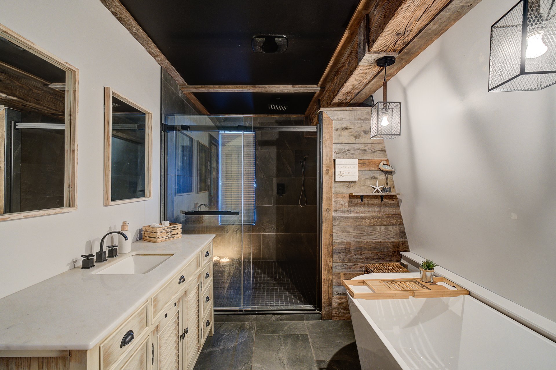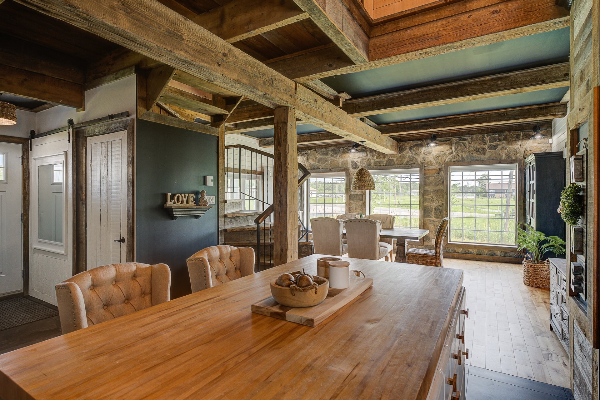 This renovated home is set on a large, peaceful lot filled with natural beauty. It charms with a bright living room featuring exposed beams, a modern kitchen with center island, and a dining area accented by a natural stone wall. The discreet powder room includes a laundry nook. Upstairs, two sunlit bedrooms, a stylish bathroom, and space to add a third bedroom await. The detached garage offers an upper level ready to be transformed. Outside, a paved firepit area invites you to unwind under the stars.