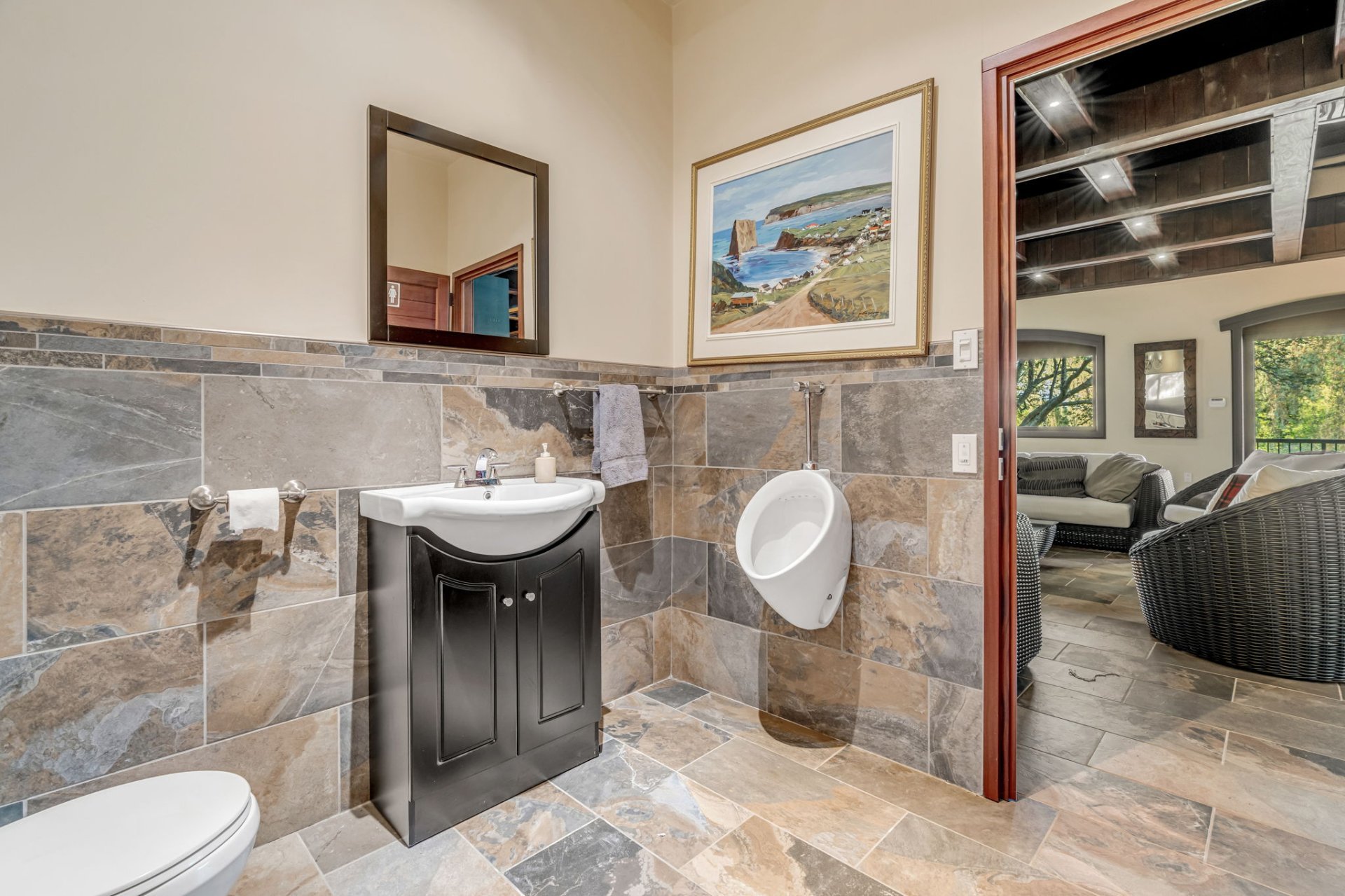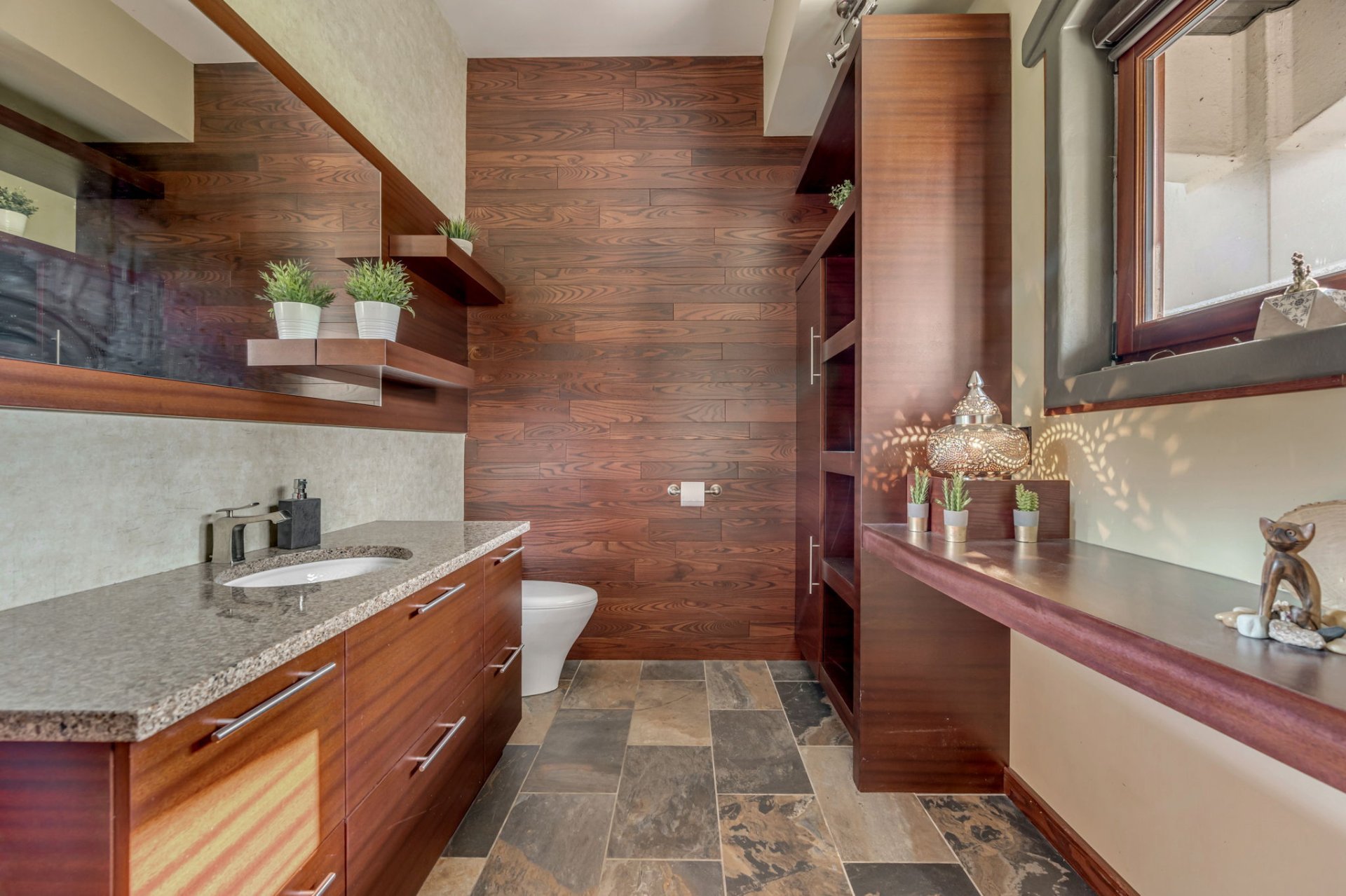 - Luxurious powder room with mahogany walls and an Italian sink matching the staircase.