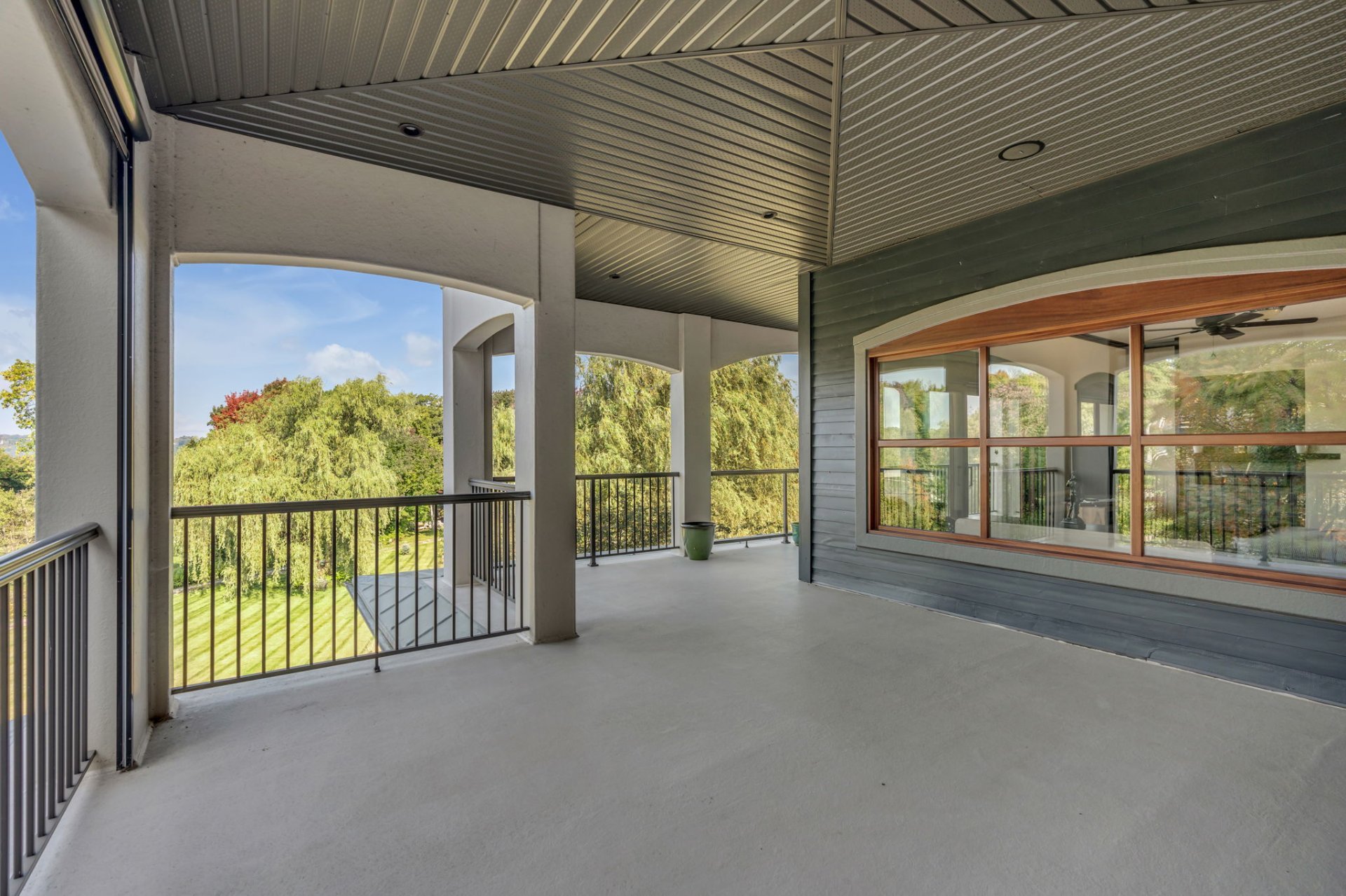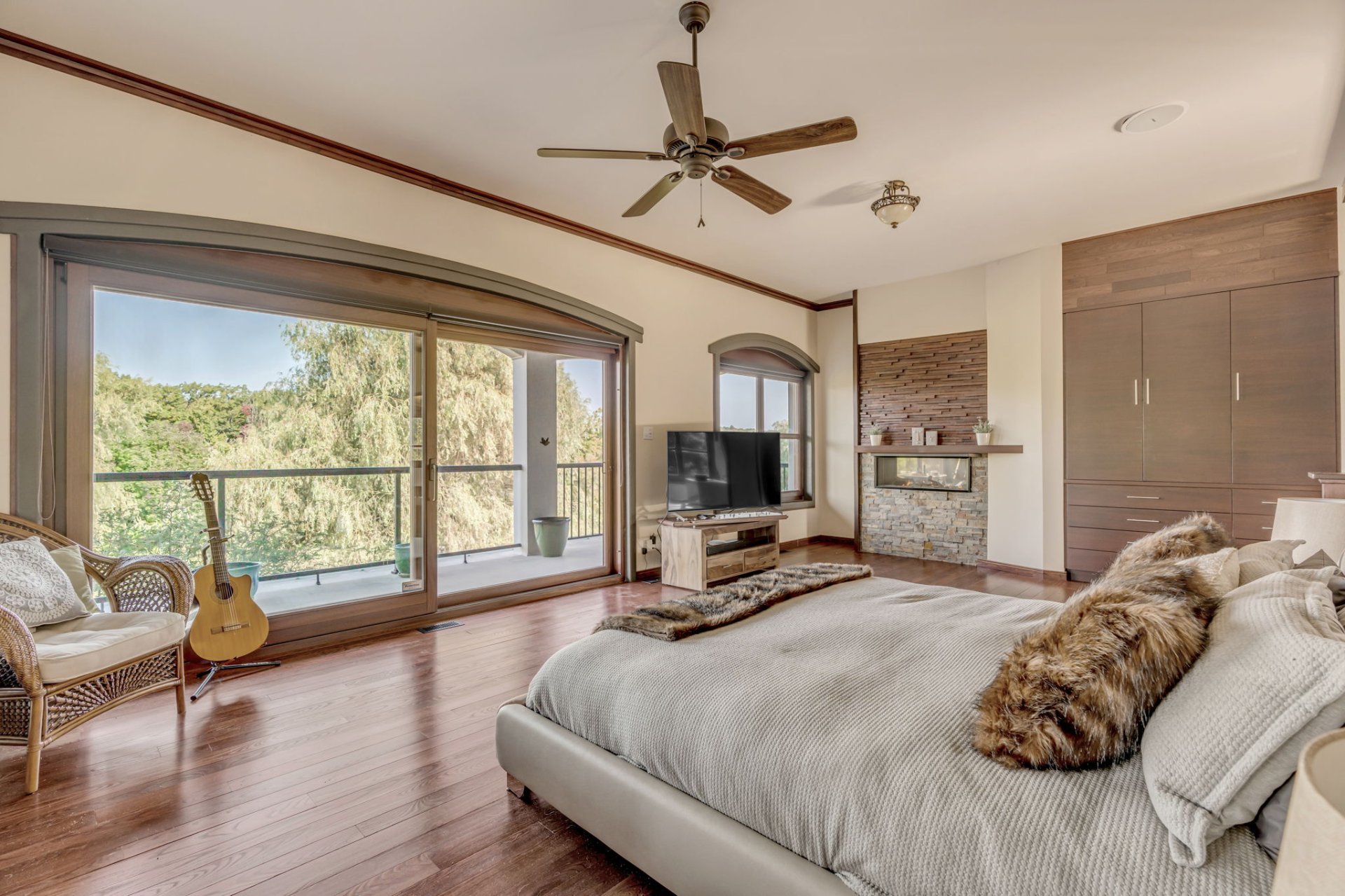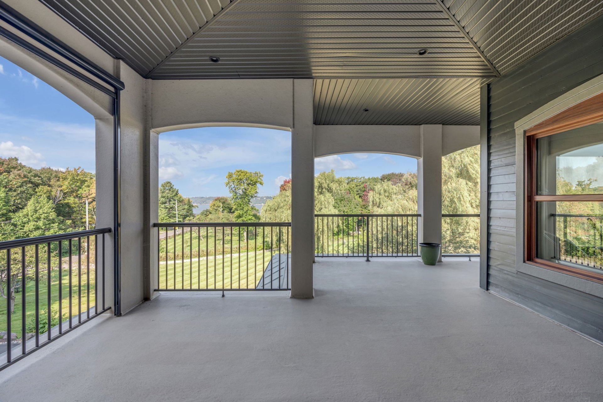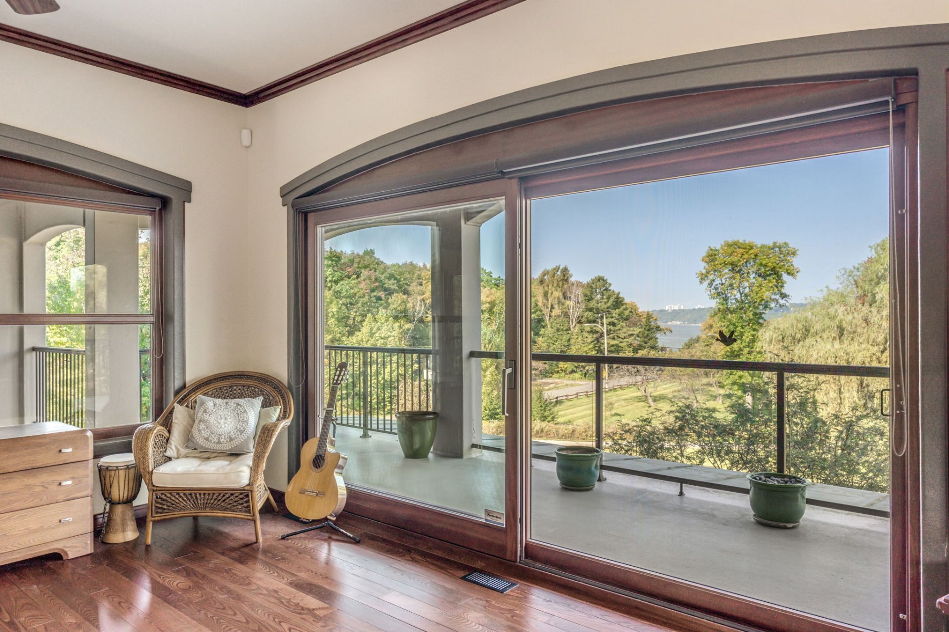 - Master bedroom with a private terrace, panoramic view of the St. Lawrence River, and built-in furniture.